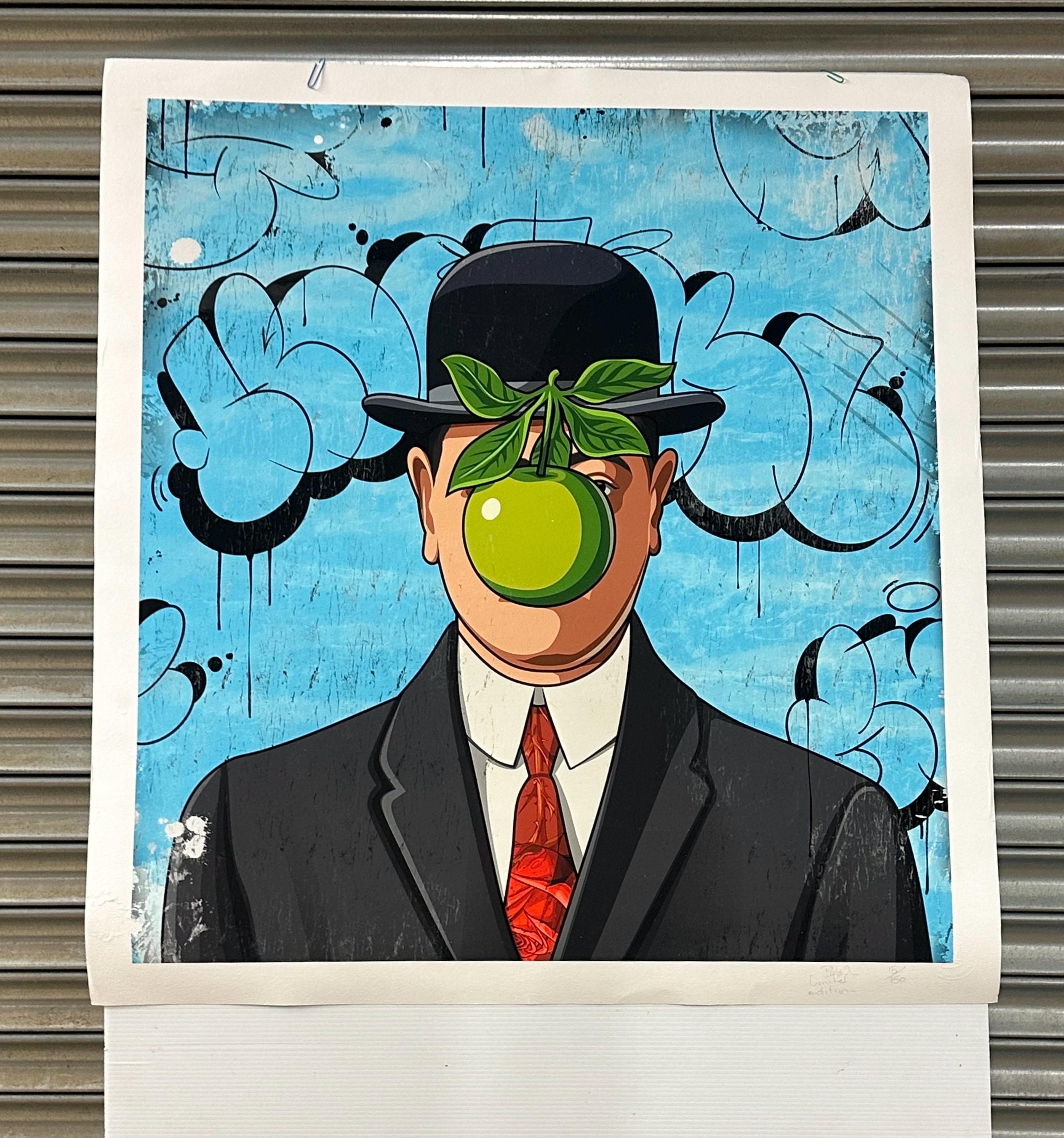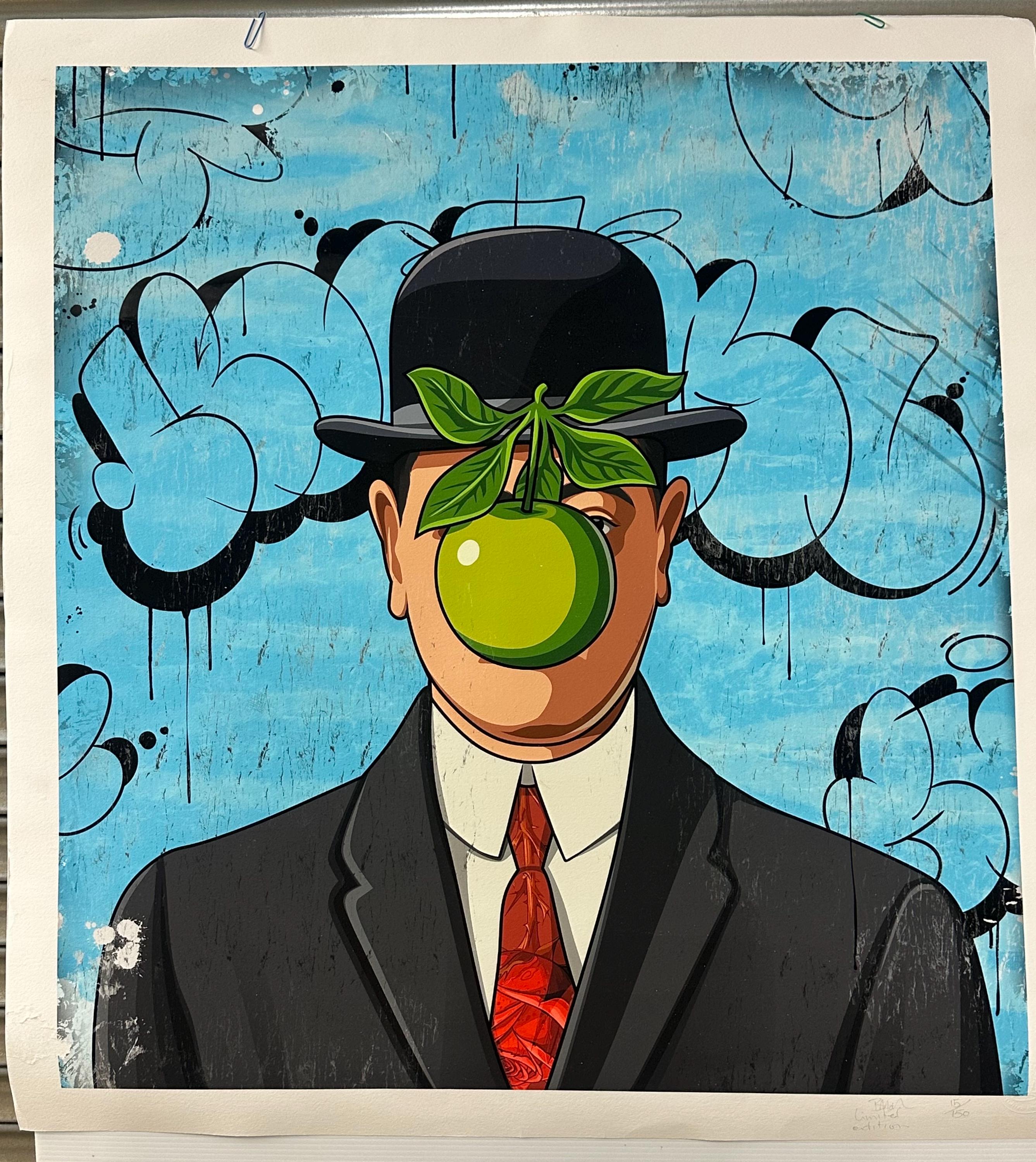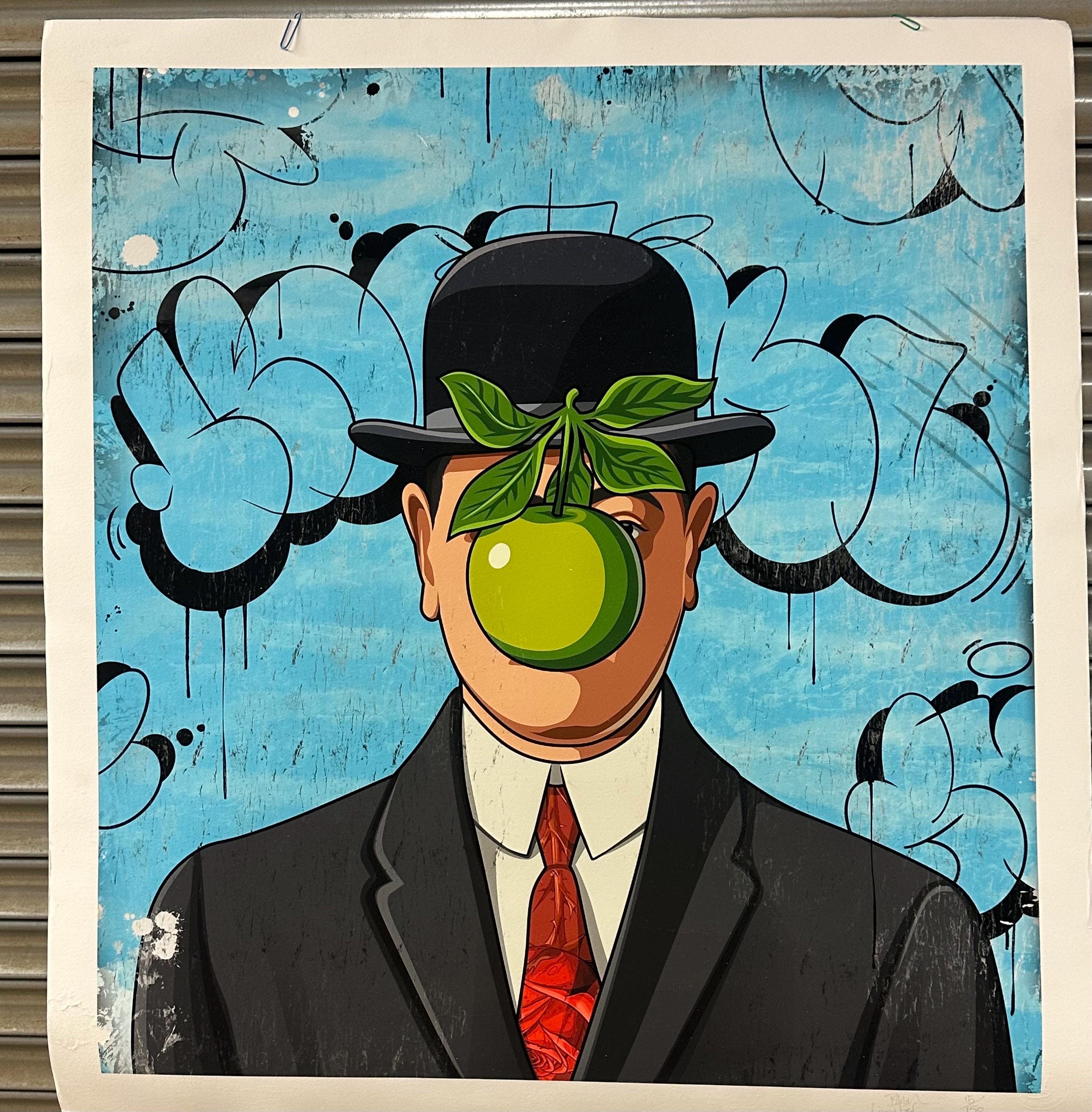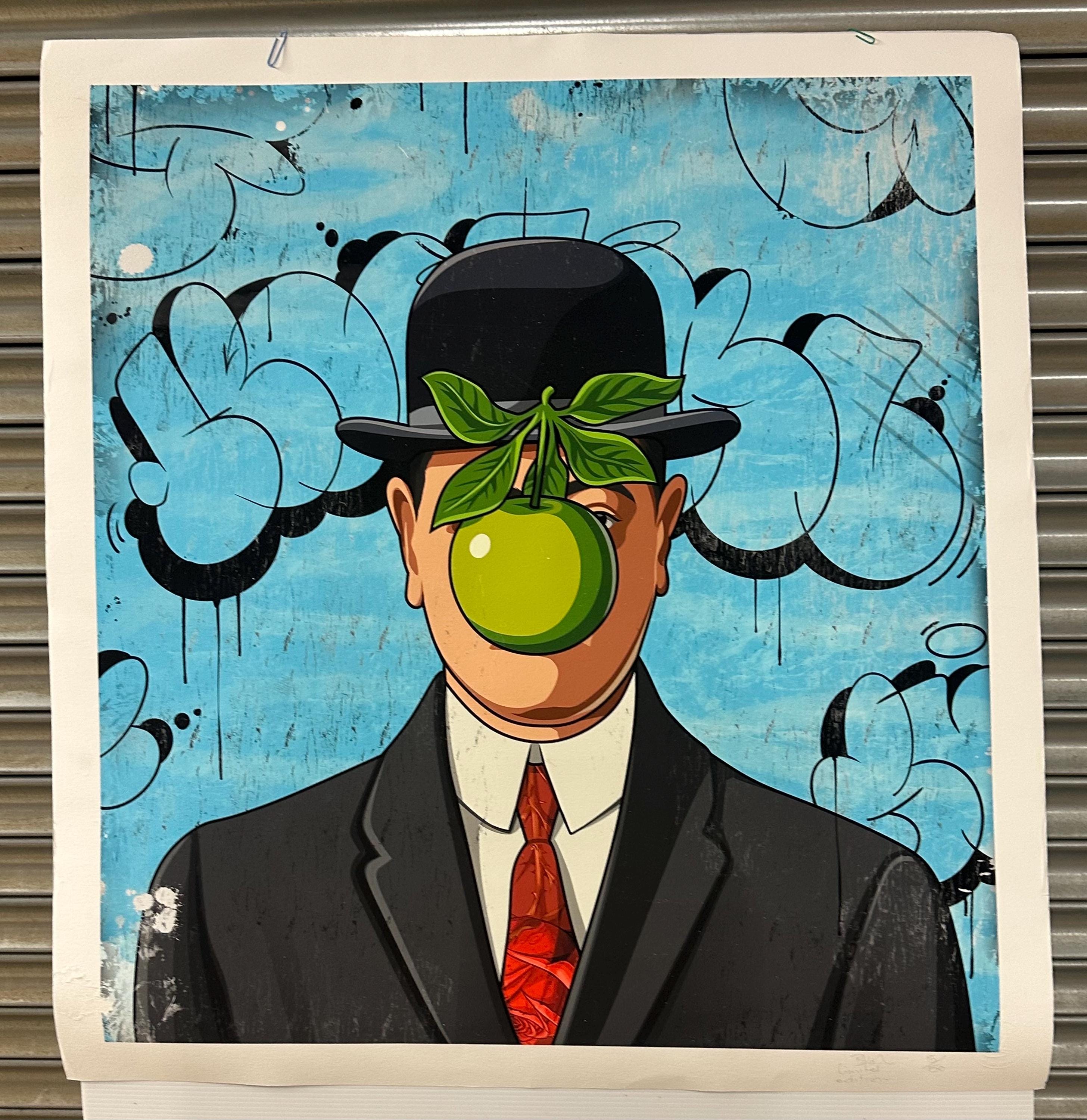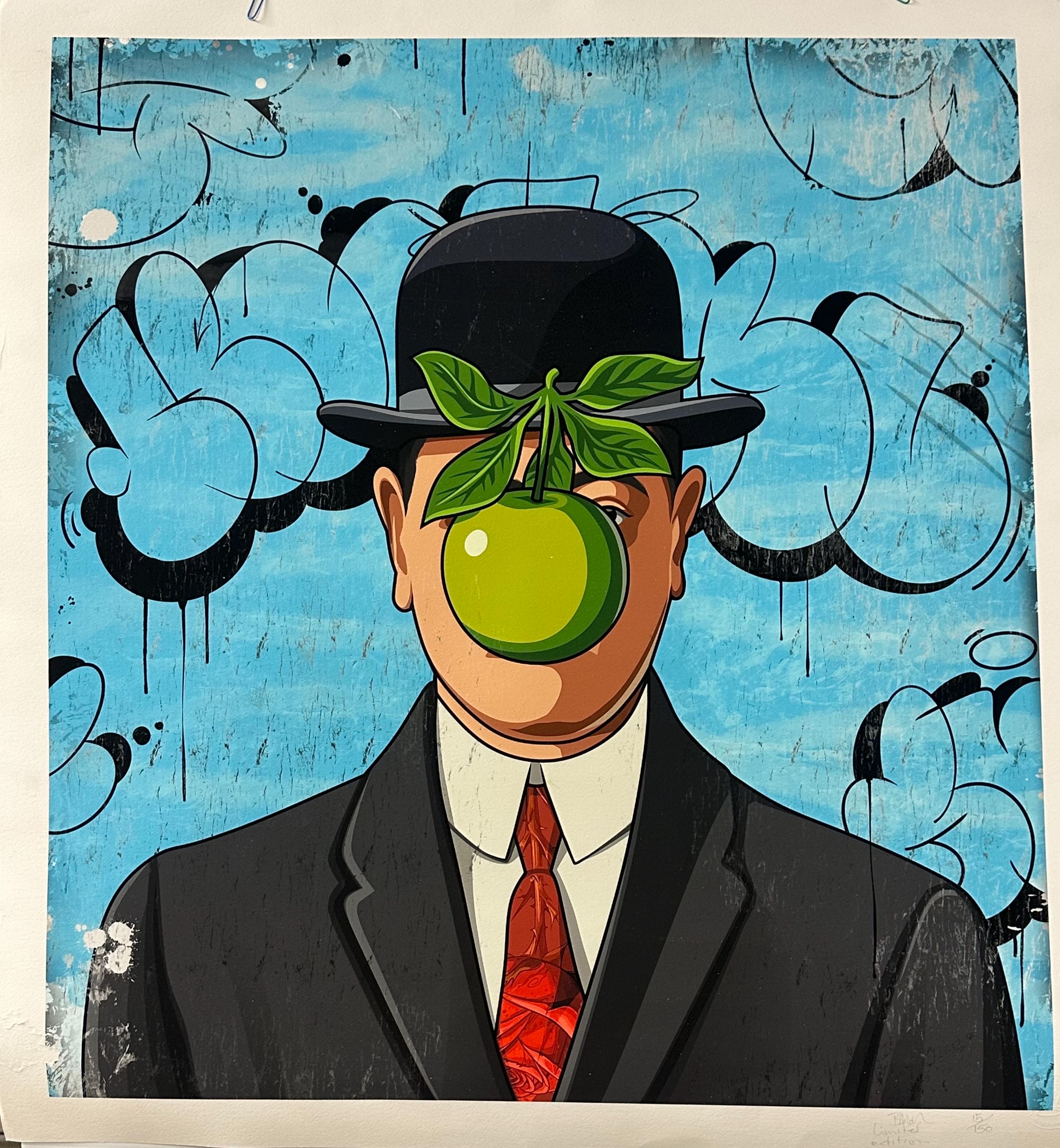 This striking composition features a suited gentleman in bowler hat, his face obscured by a vibrant green apple — a clever and humorous visual twist that nods to classic surrealism while being reimagined in Moli’s unmistakable graphic, urban style. The vivid blue background with expressive black linework adds depth and energy, giving the piece a modern street-art feel while maintaining strong traditional portrait structure.