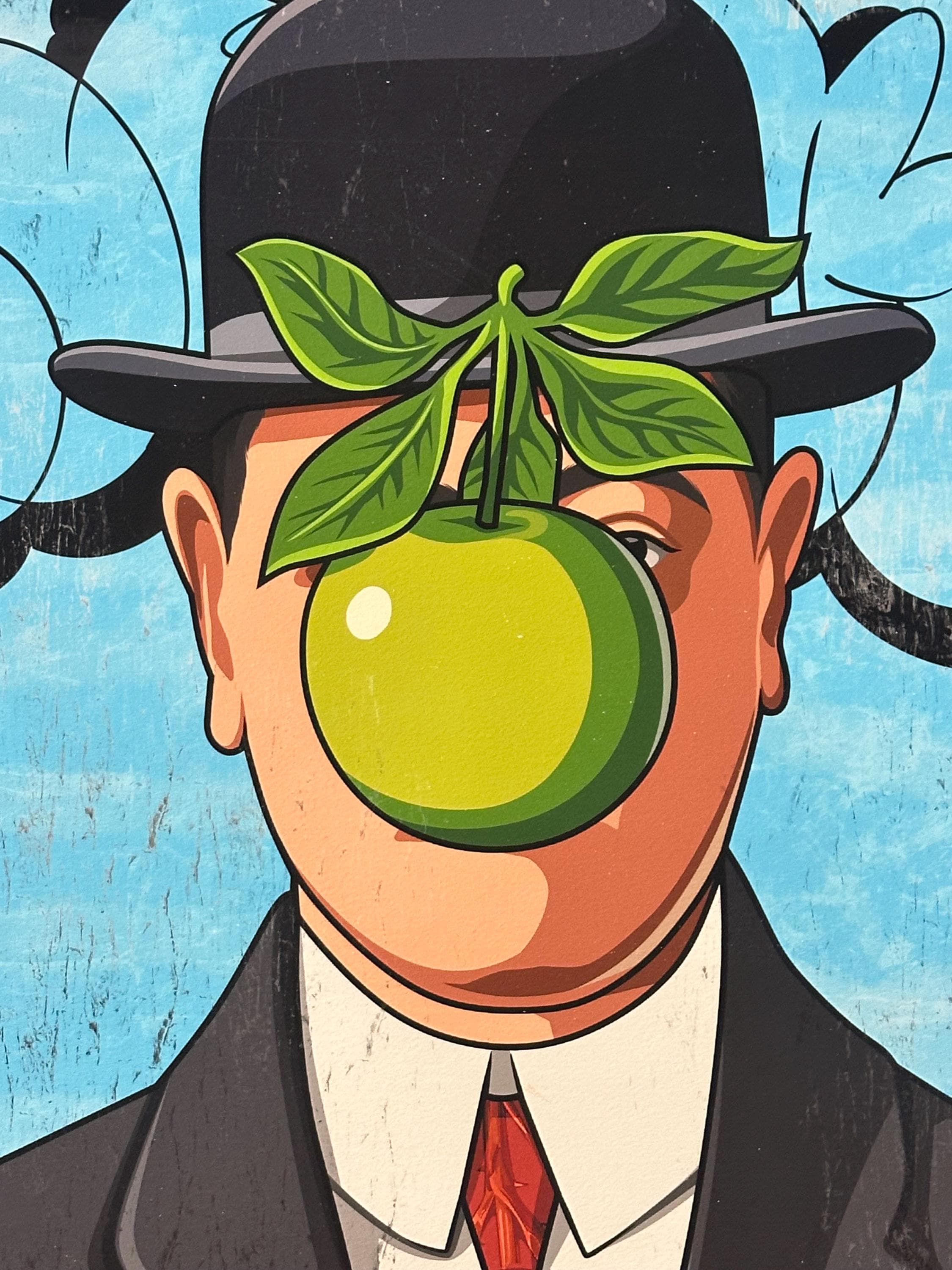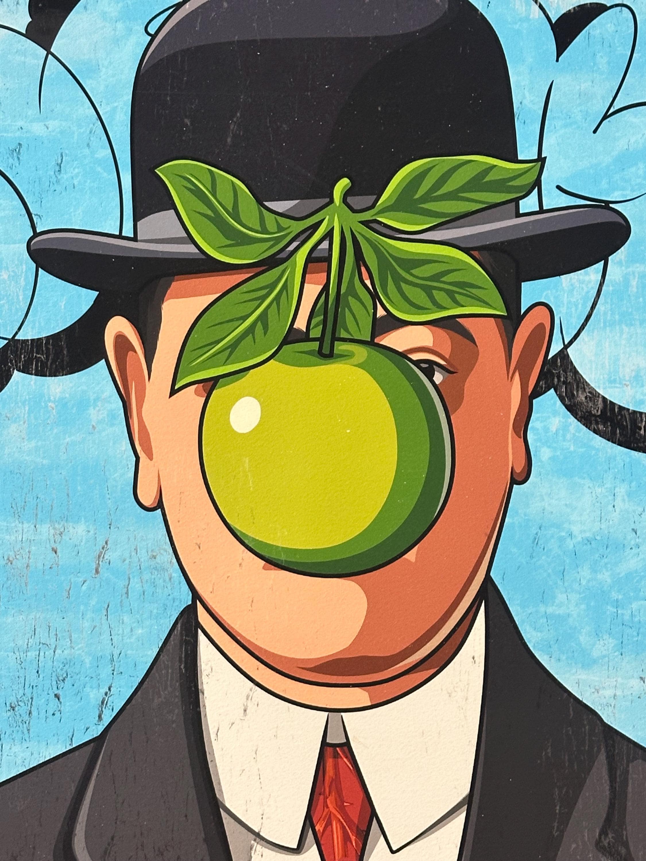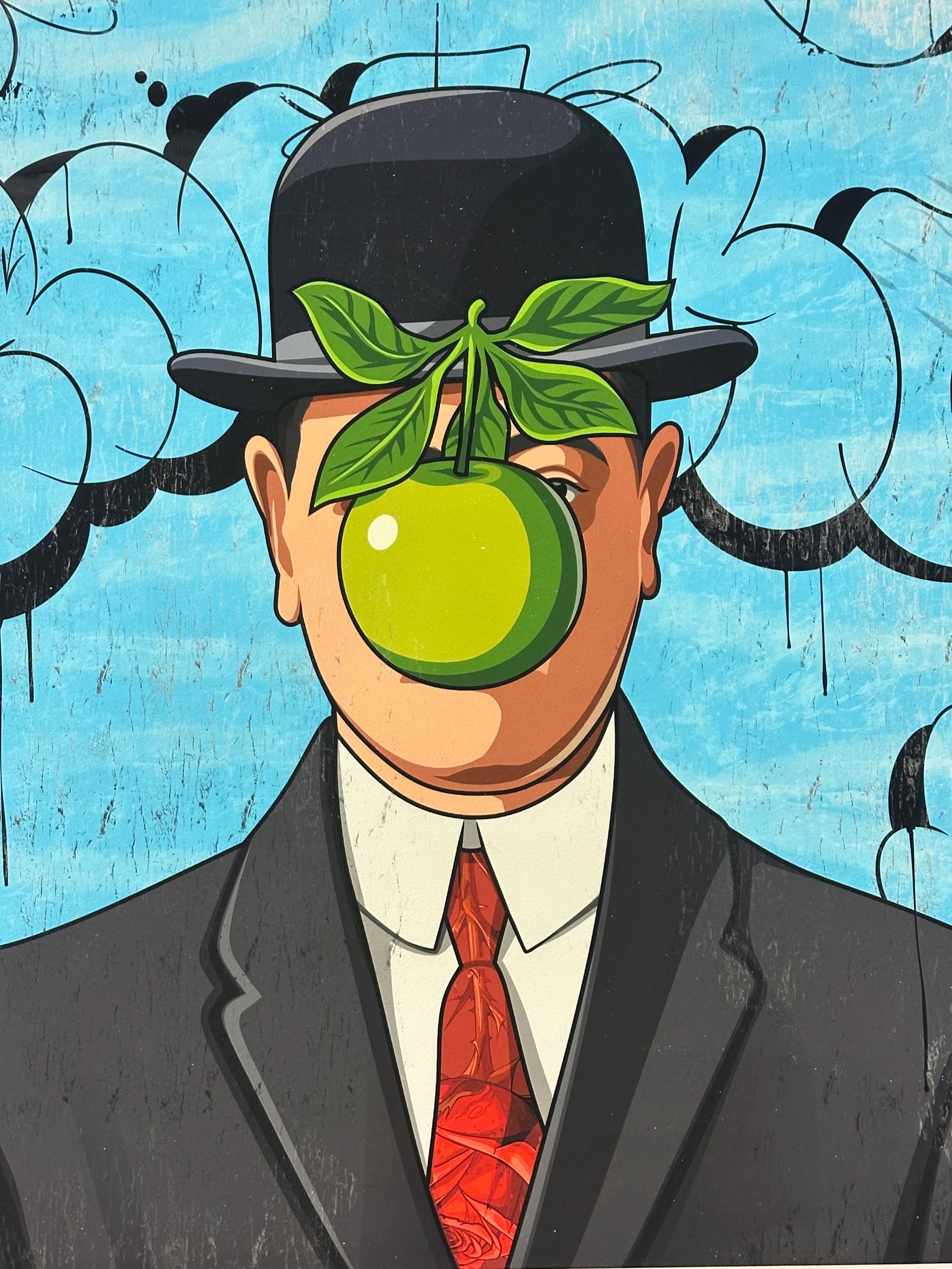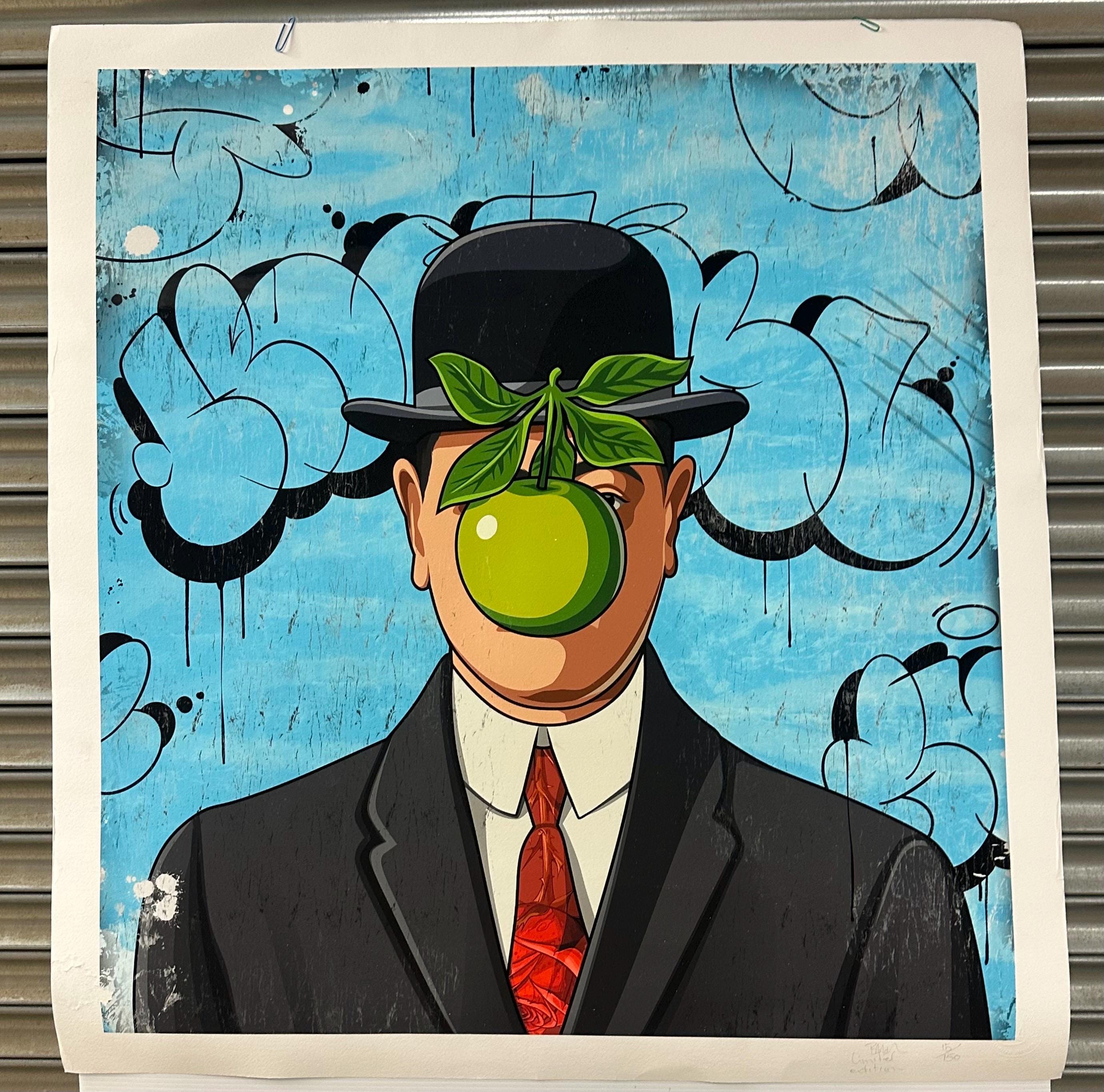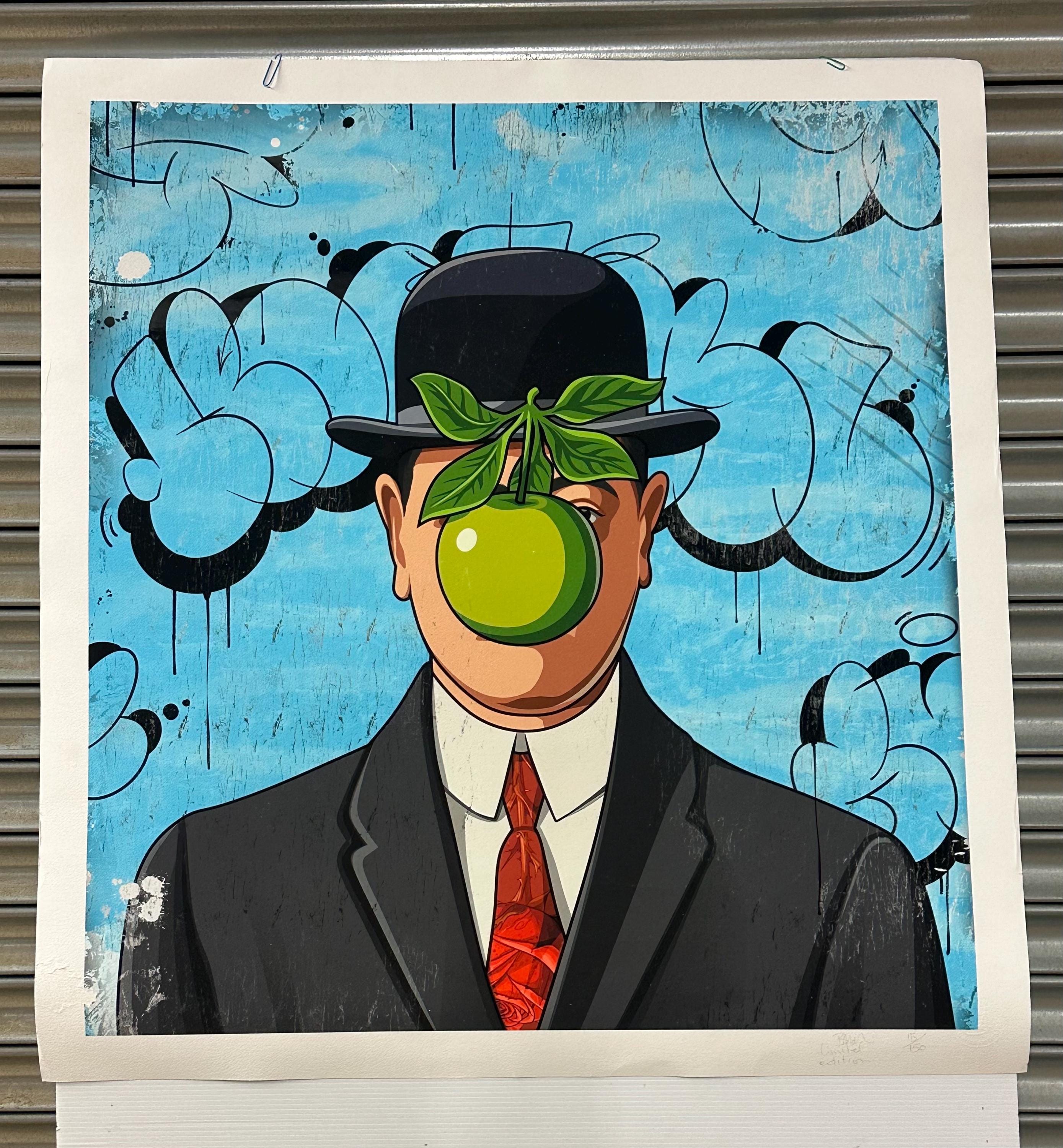This striking composition features a suited gentleman in bowler hat, his face obscured by a vibrant green apple — a clever and humorous visual twist that nods to classic surrealism while being reimagined in Moli’s unmistakable graphic, urban style. The vivid blue background with expressive black linework adds depth and energy, giving the piece a modern street-art feel while maintaining strong traditional portrait structure.