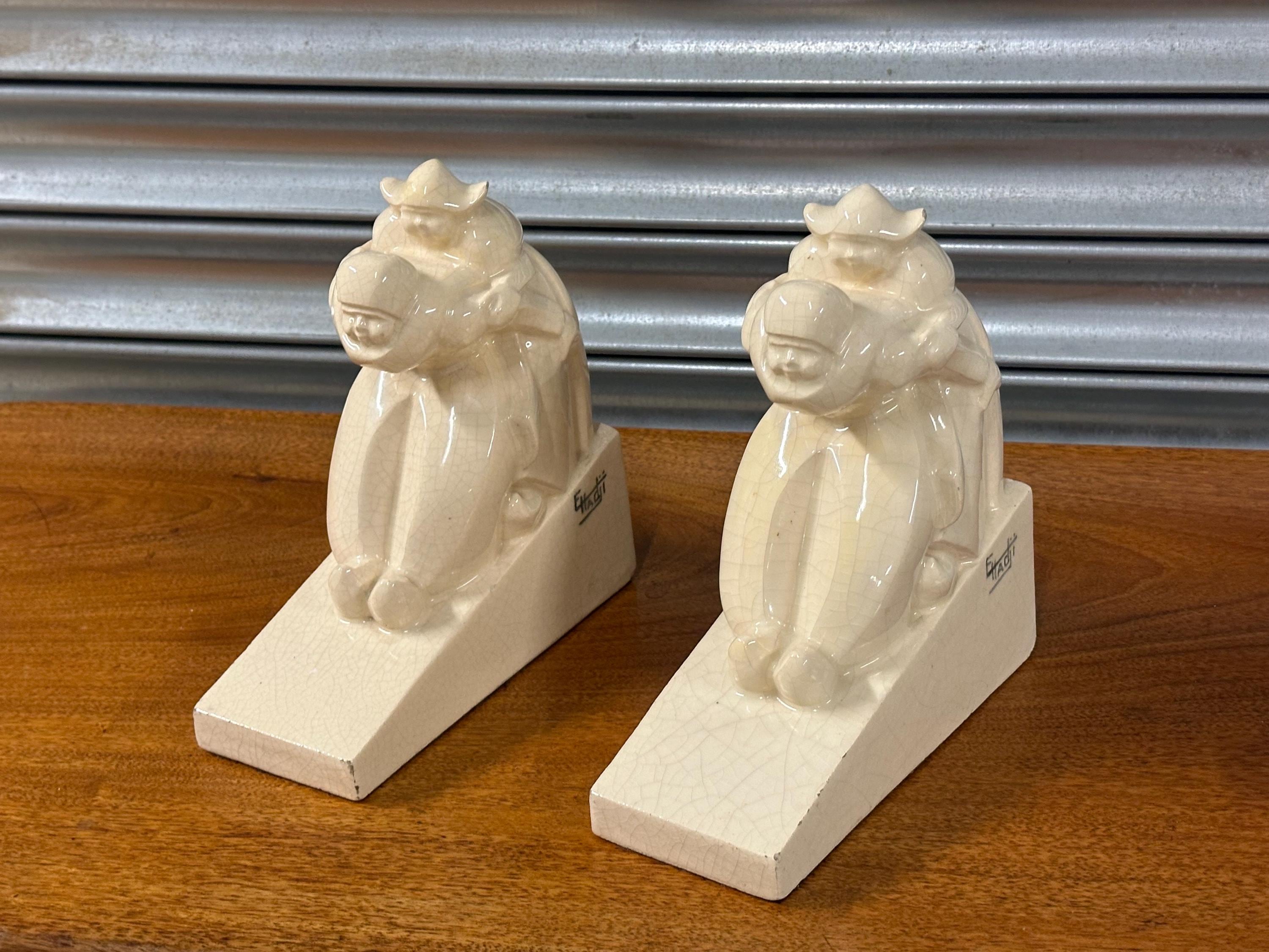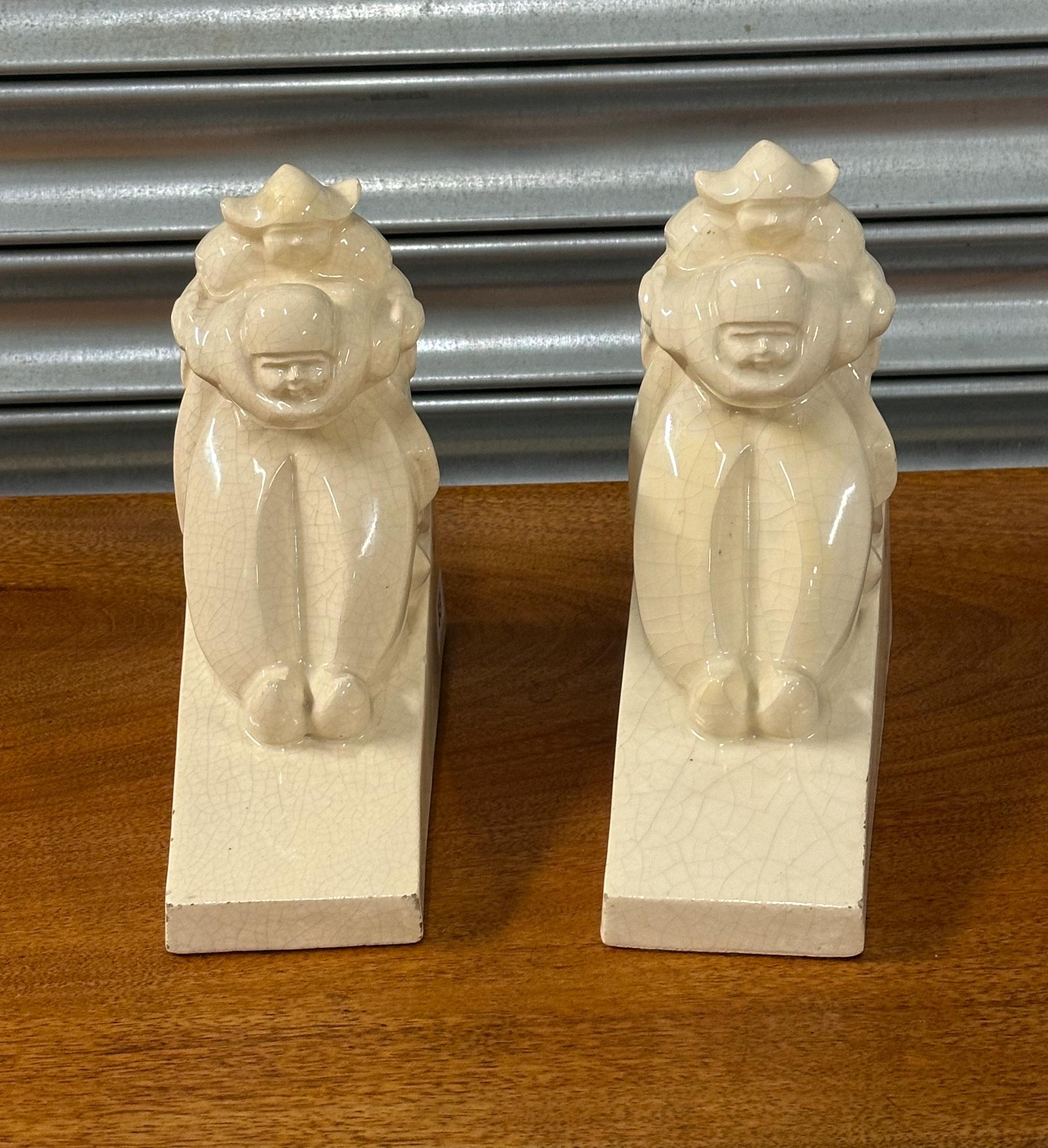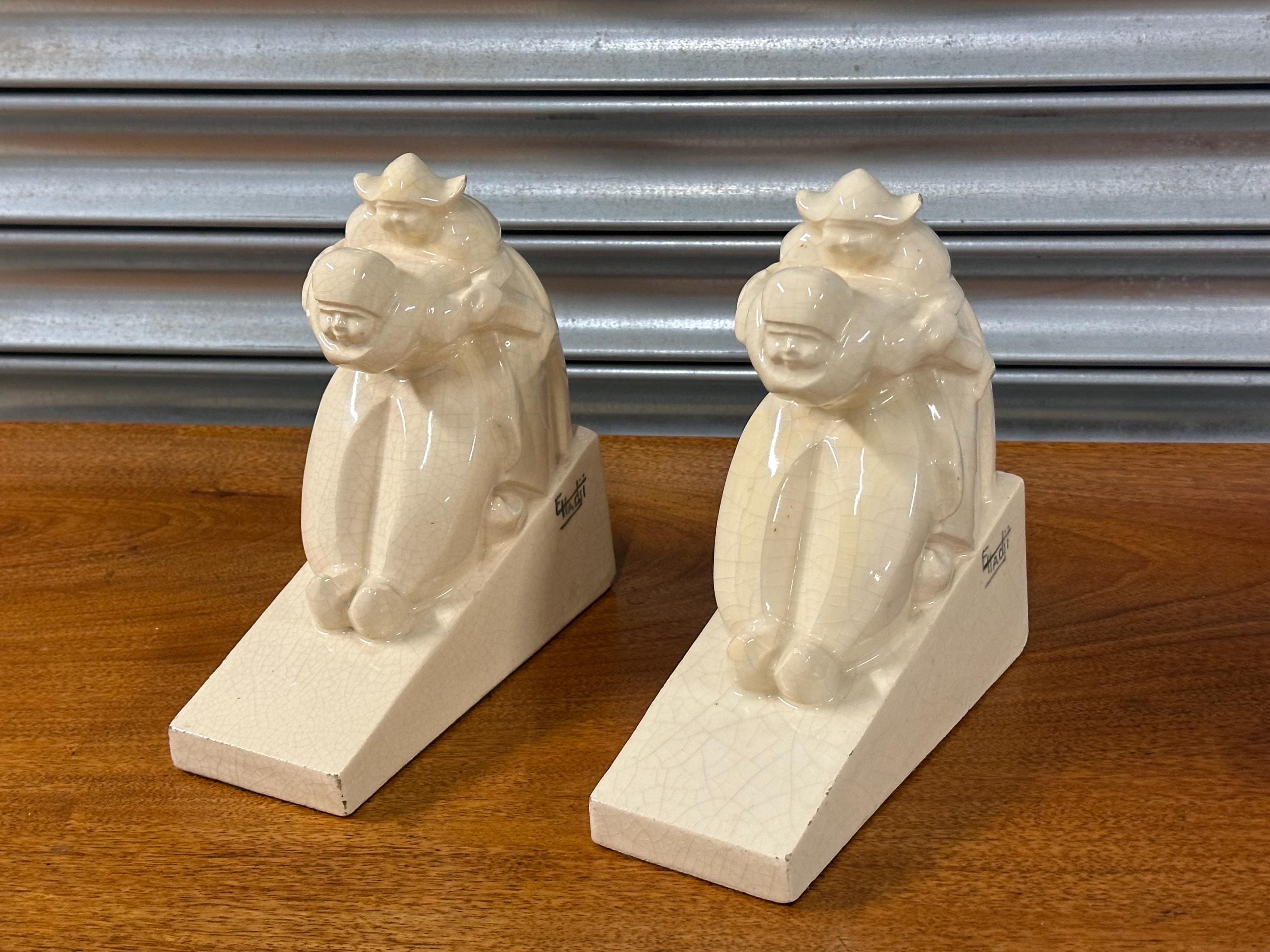 Authentic Art Deco figural bookends by sought-after French designers are becoming increasingly hard to find — especially as a matching pair. Ideal for collectors of Art Deco ceramics, ski memorabilia, or period interior styling.