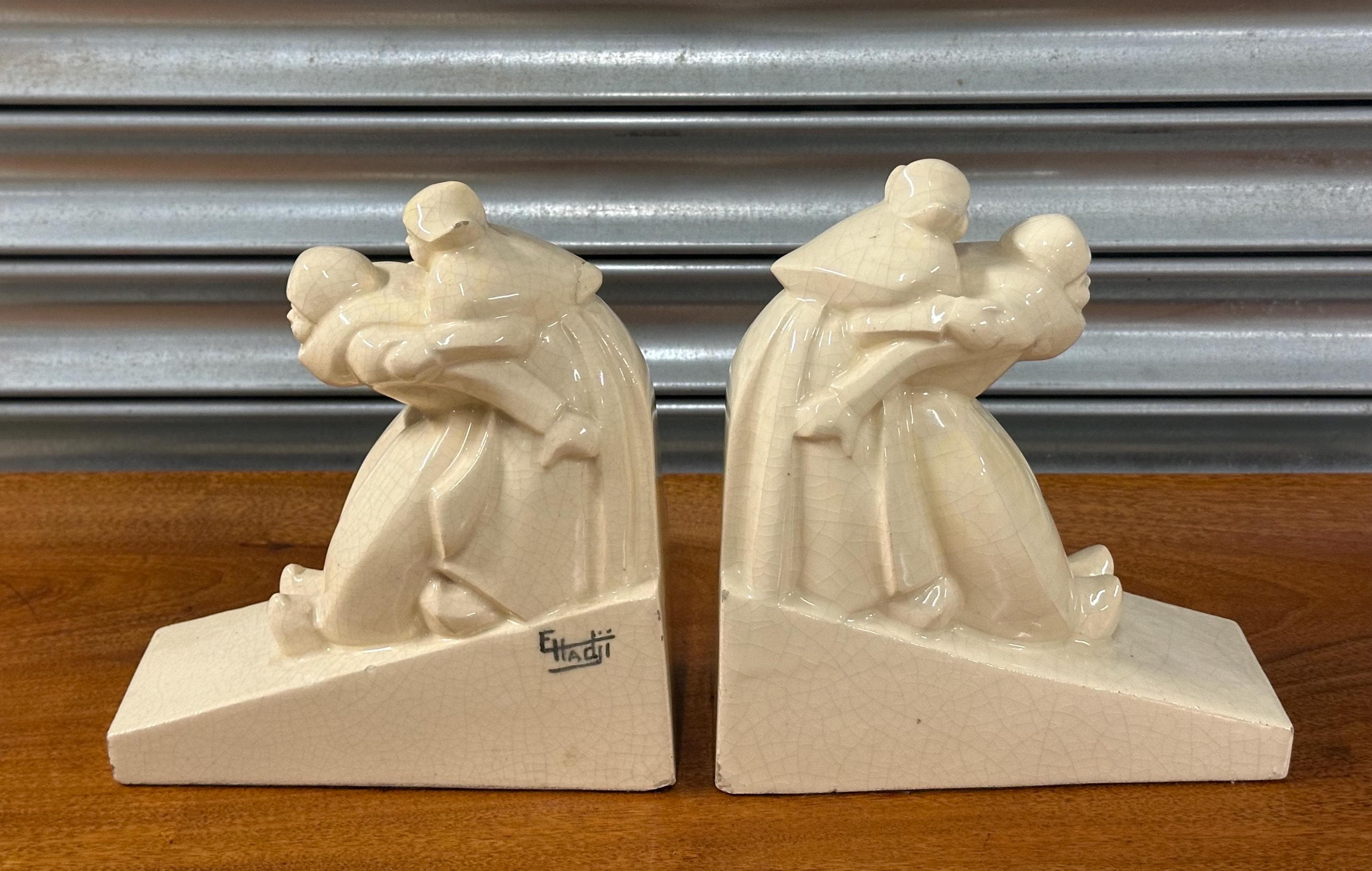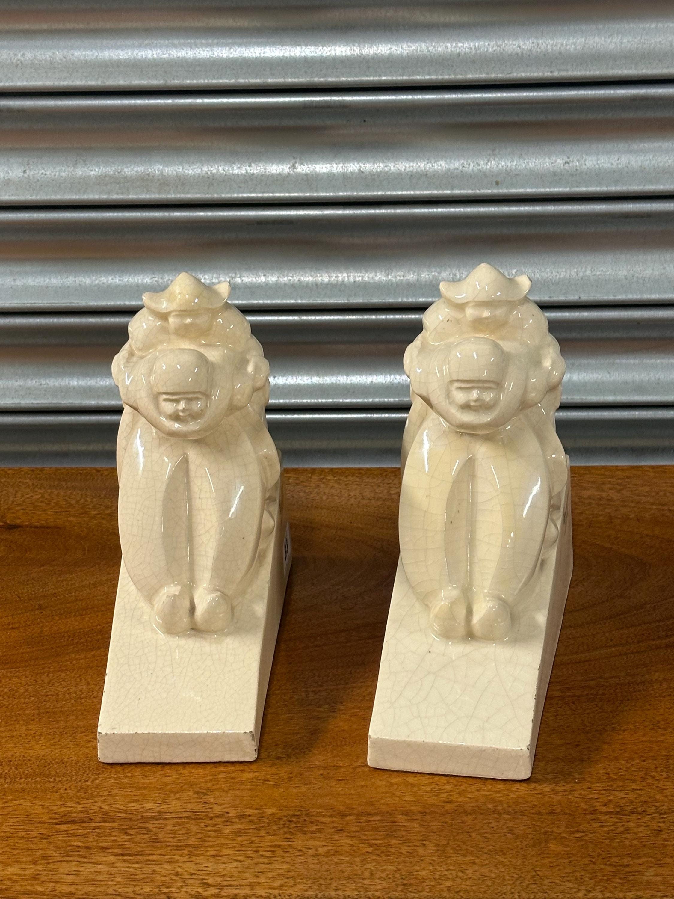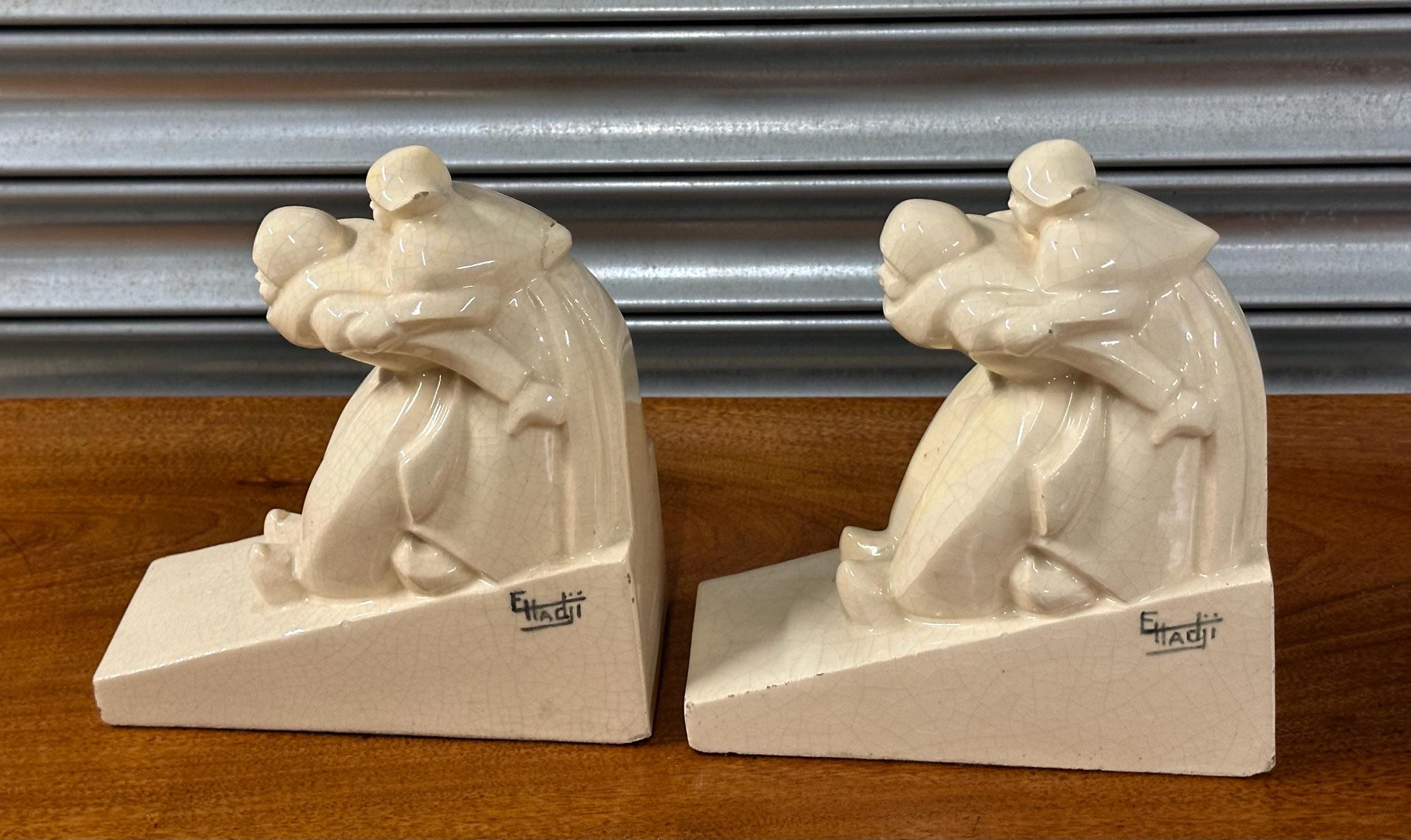 Authentic Art Deco figural bookends by sought-after French designers are becoming increasingly hard to find — especially as a matching pair. Ideal for collectors of Art Deco ceramics, ski memorabilia, or period interior styling.