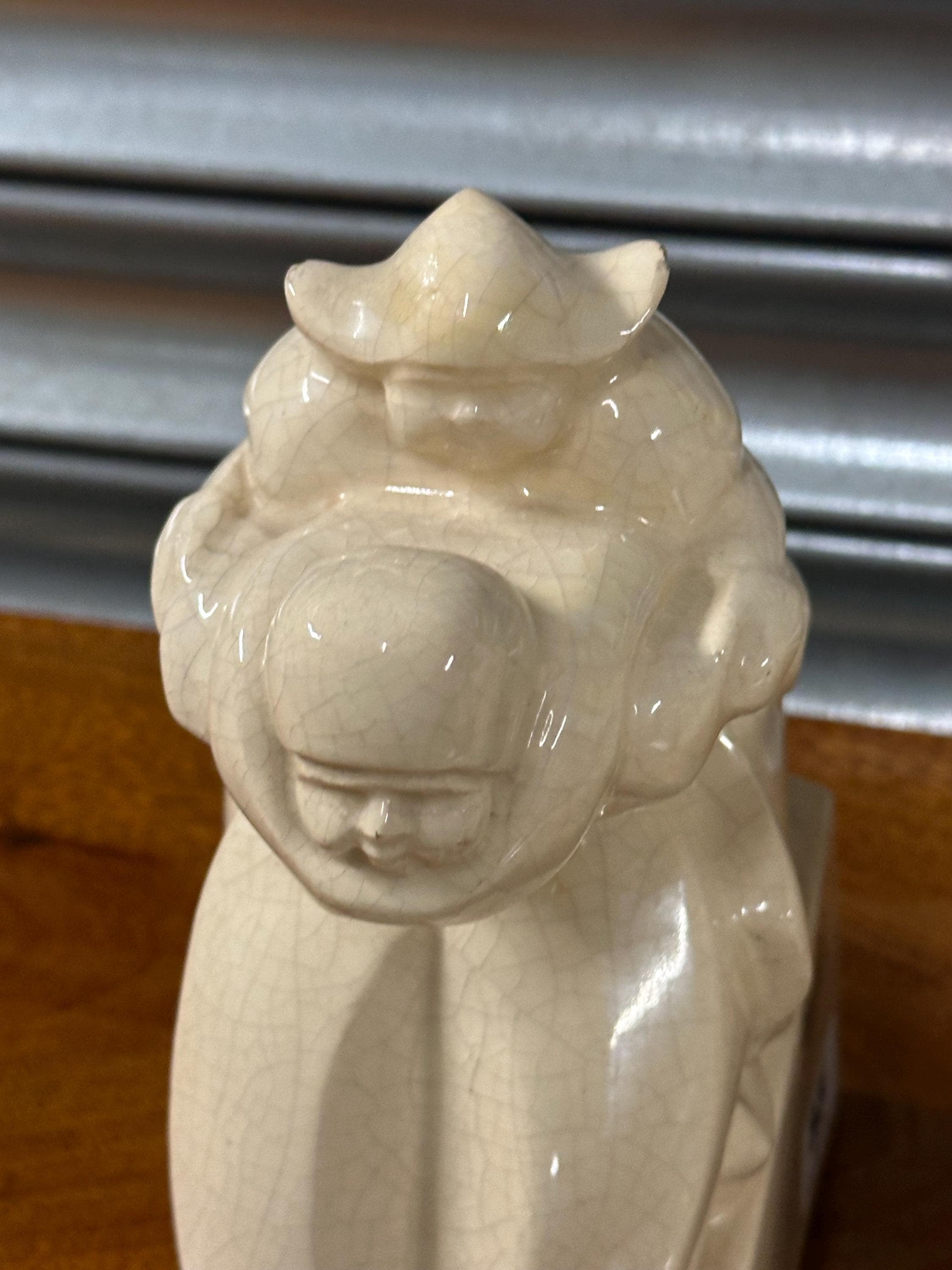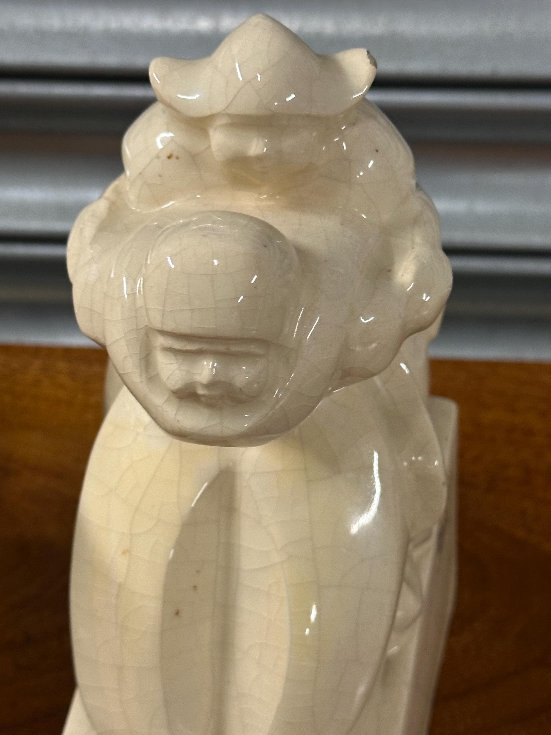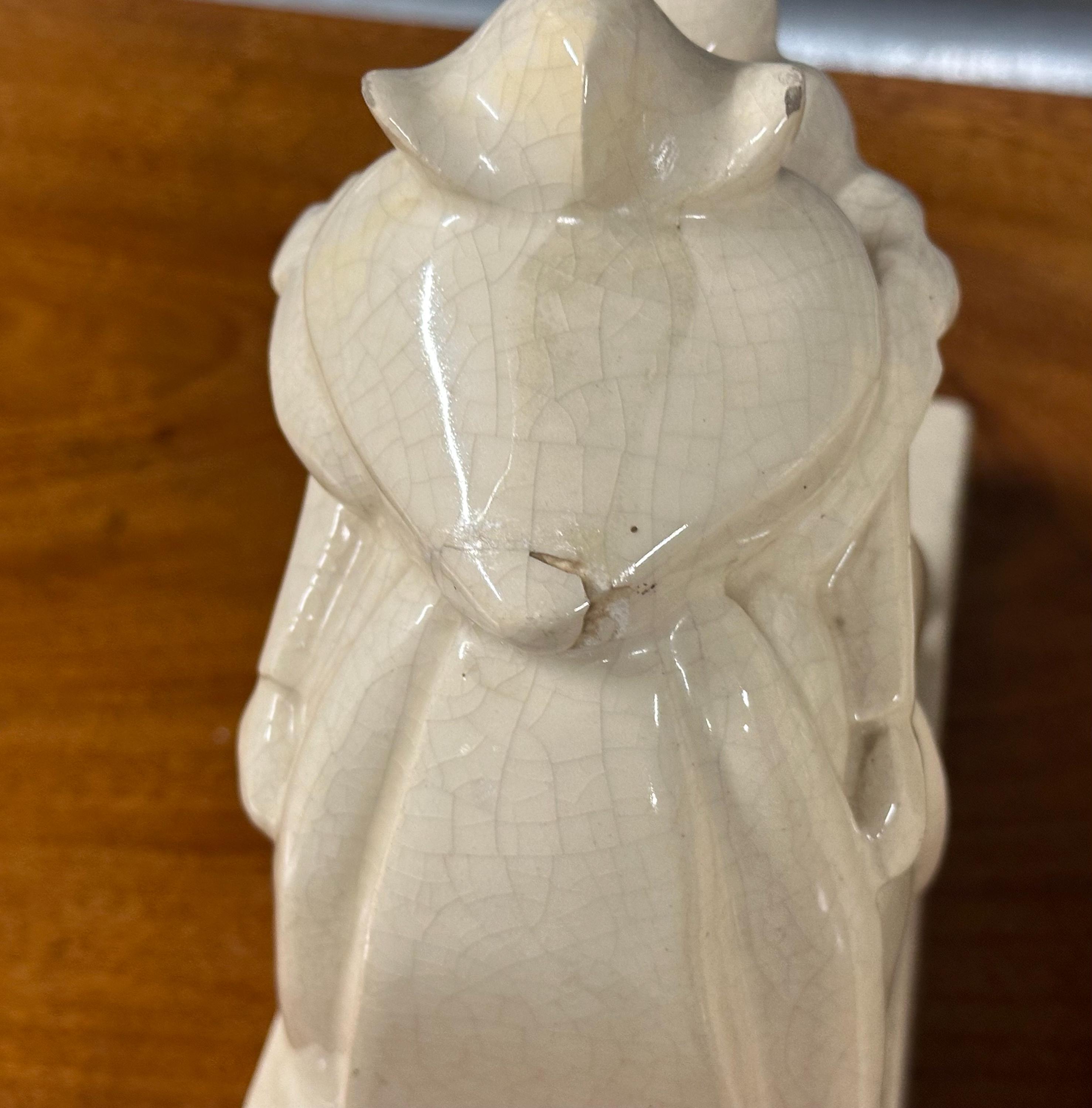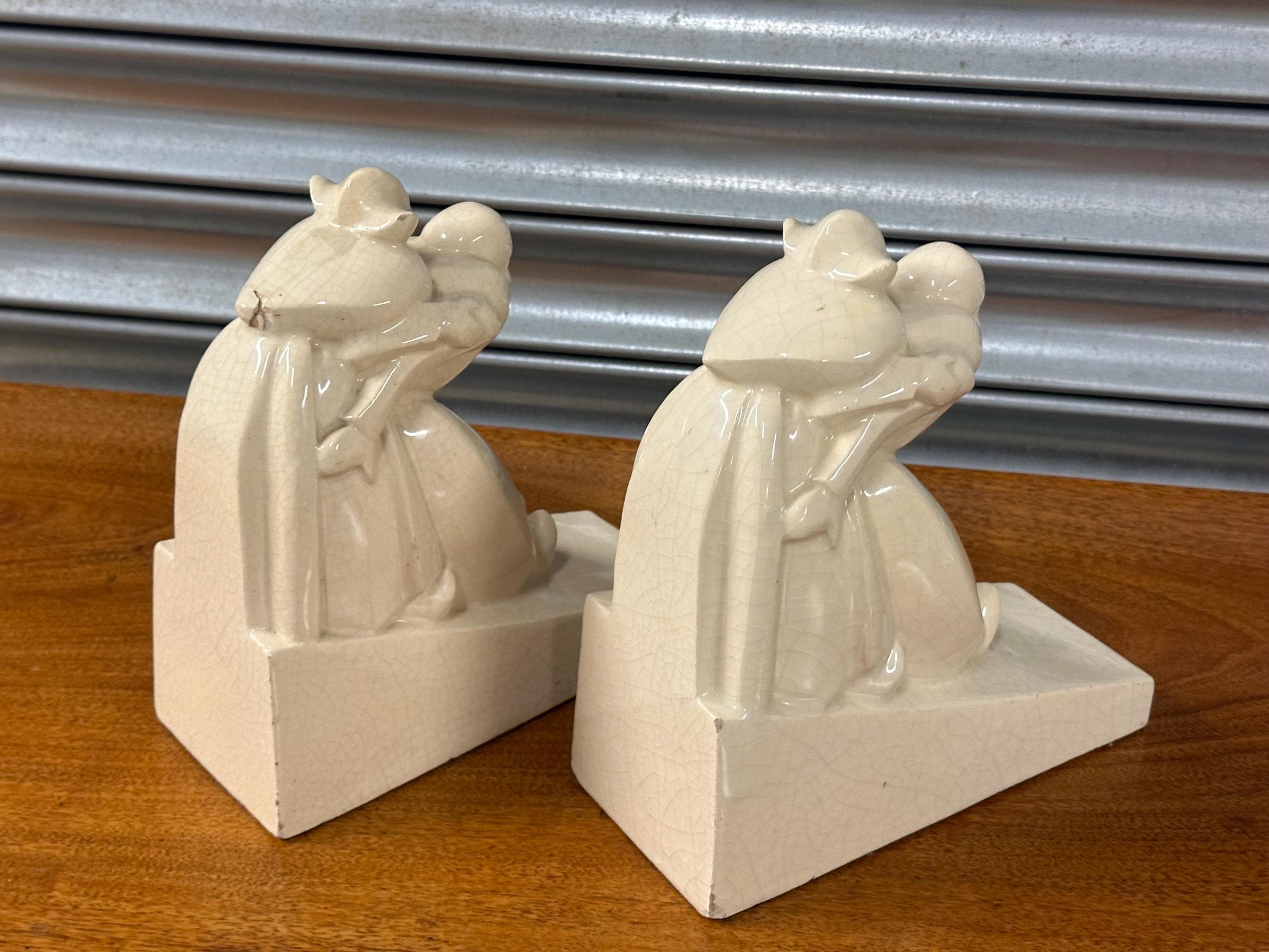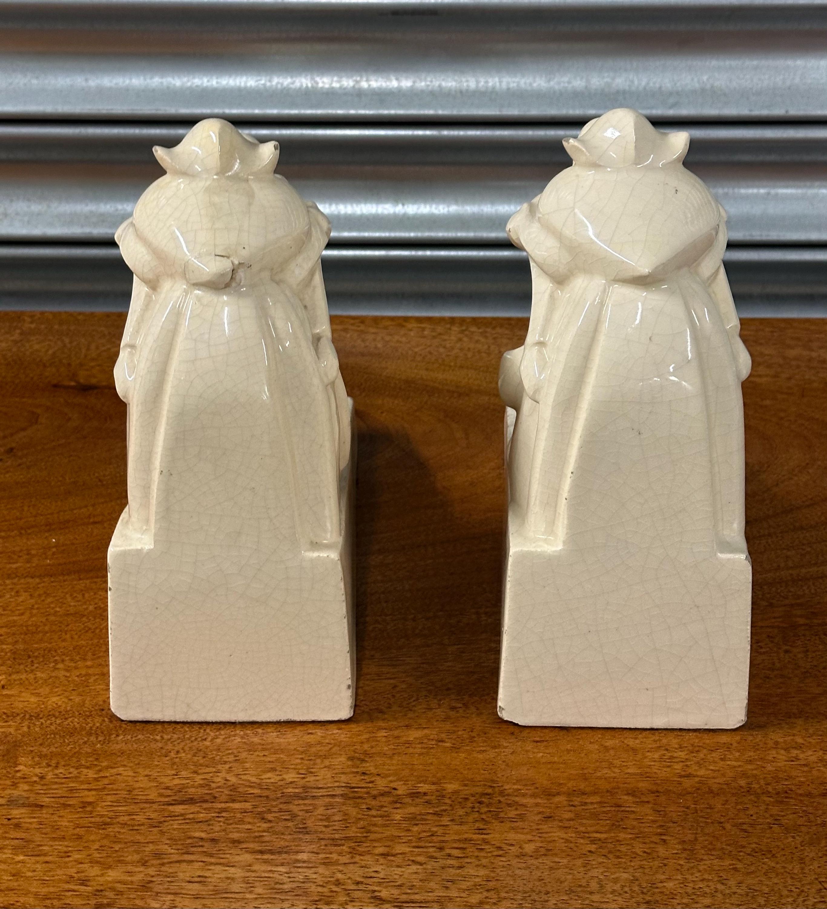 Beautifully sculpted with flowing robes and dynamic posture, these figures capture the spirit of early alpine sport and continental Art Deco design. Crazing to the glaze, they make an eye-catching display whether used as bookends or as standalone decorative sculptures.