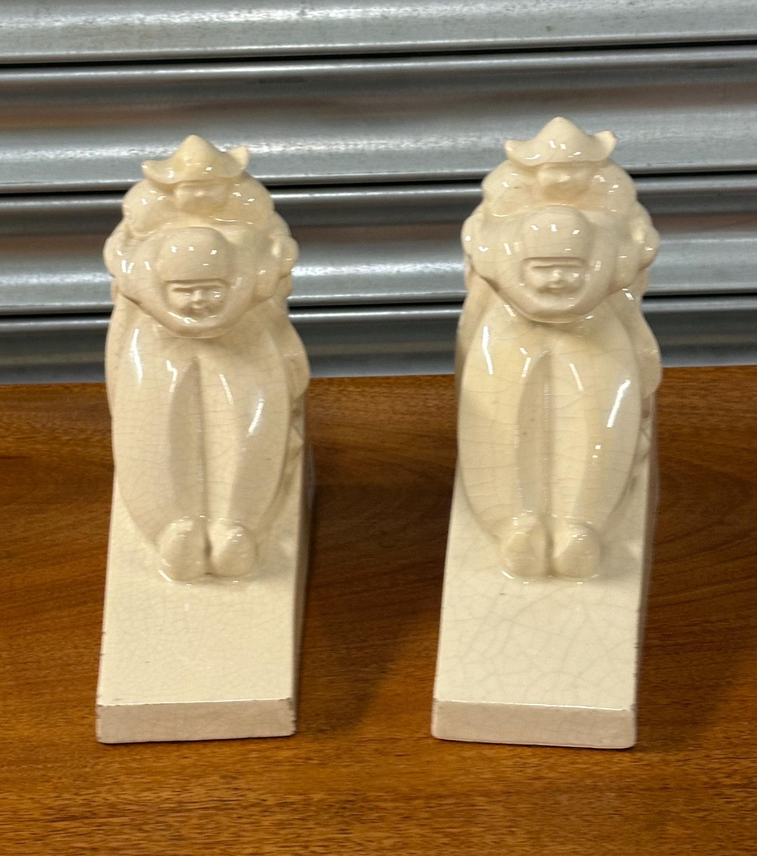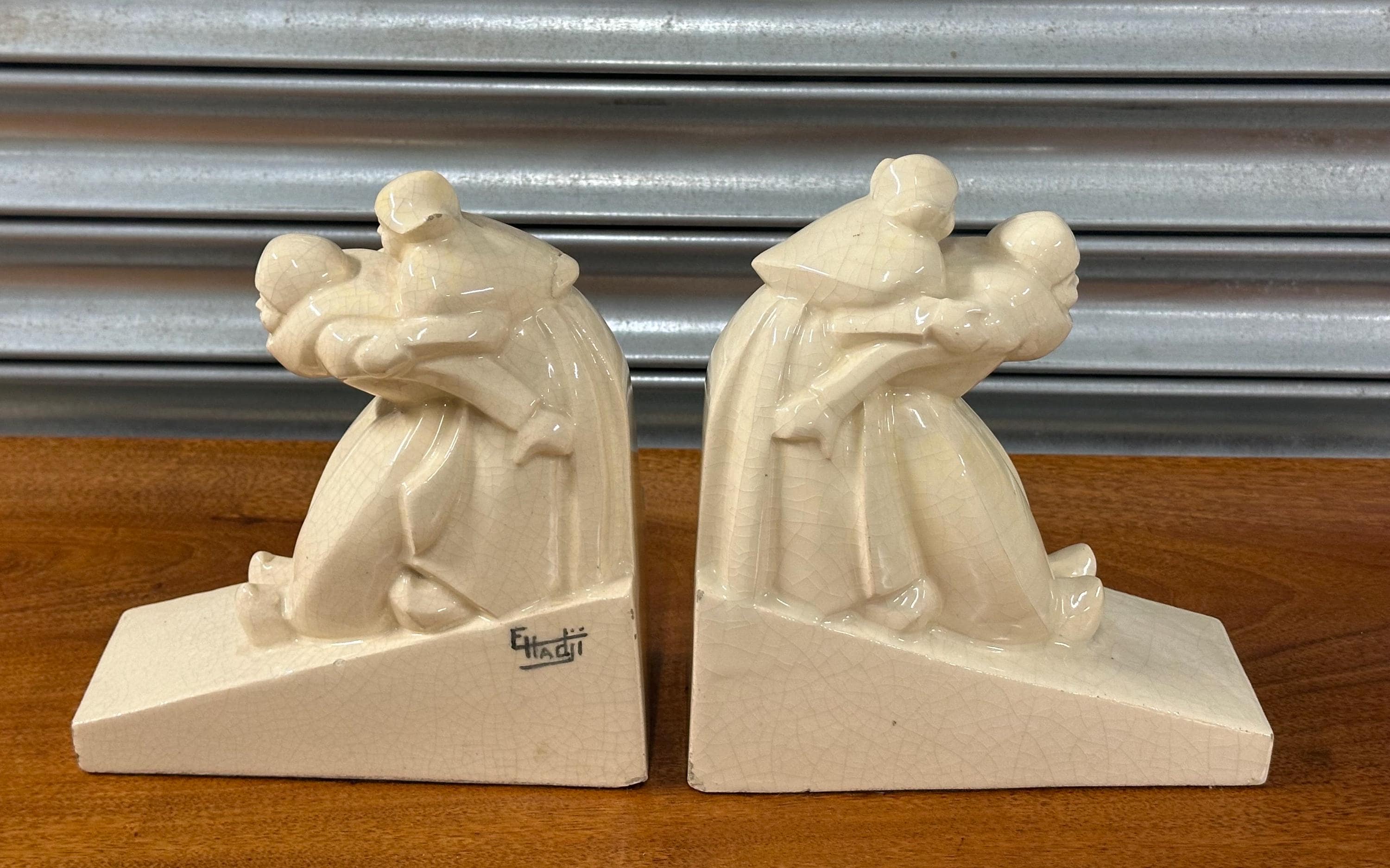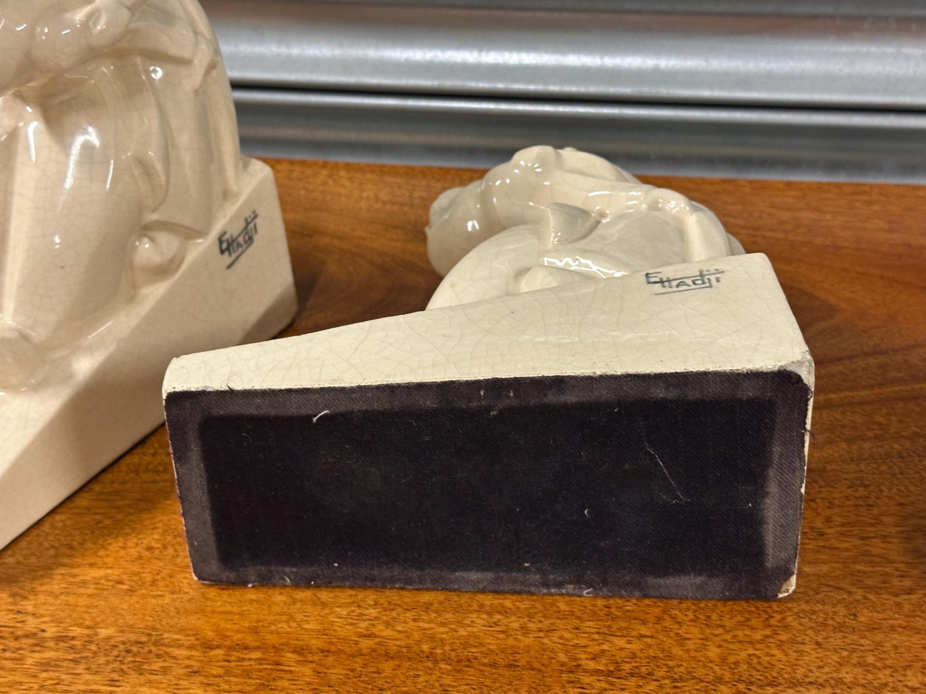 Rare Pair Of E Hadji & Marcel Renson Ceramic Figures Skiing Bookends (A/F)