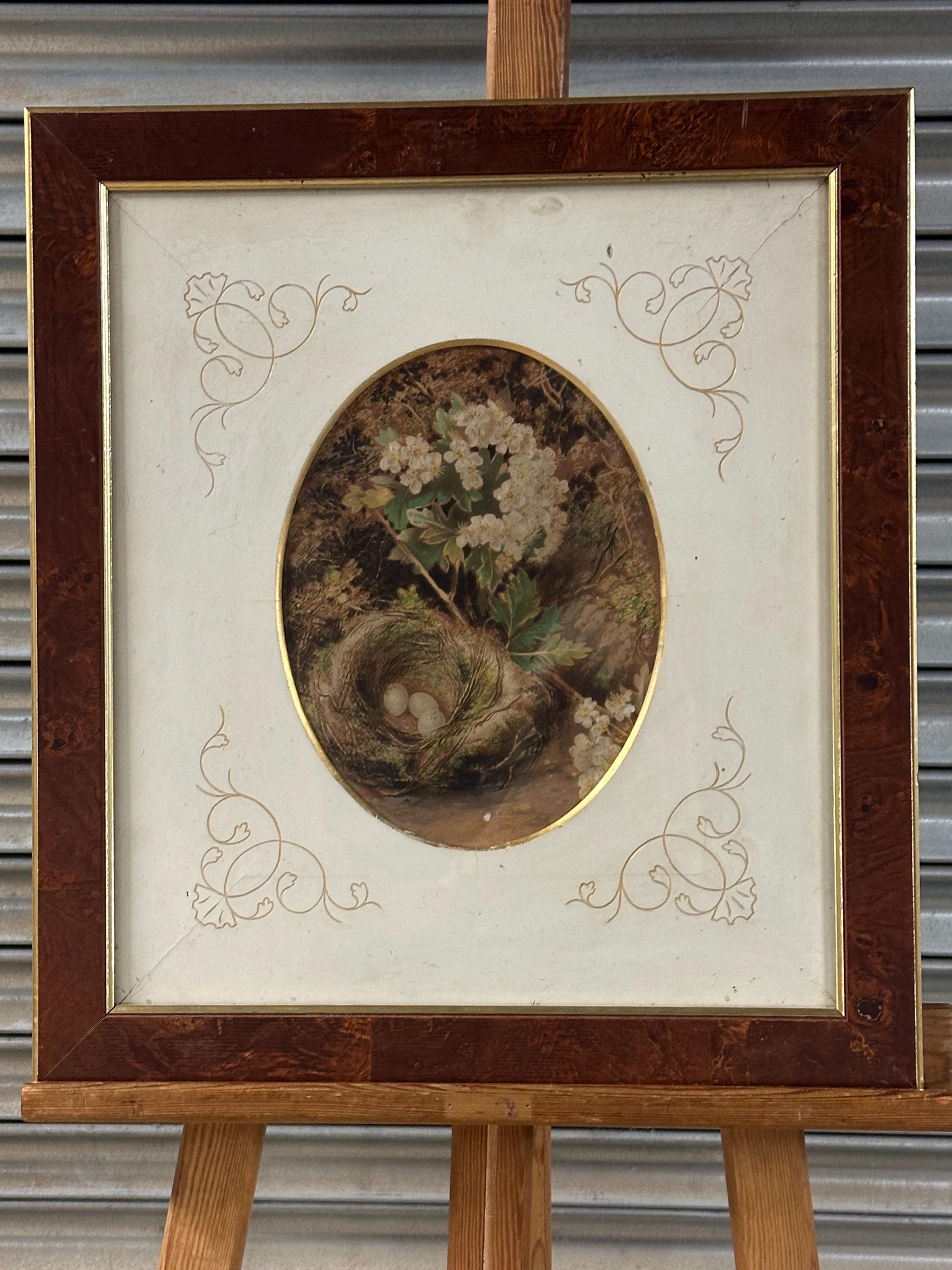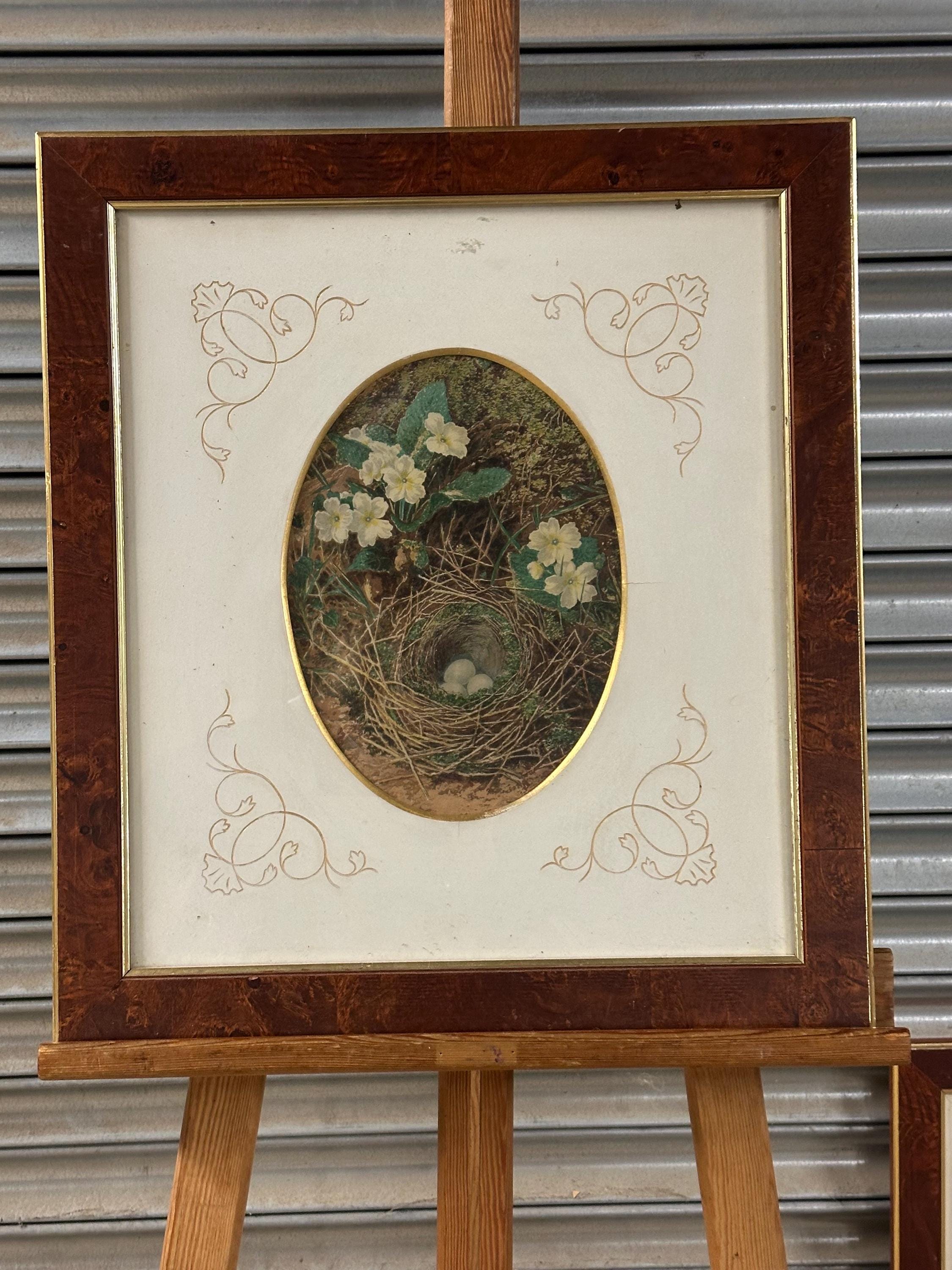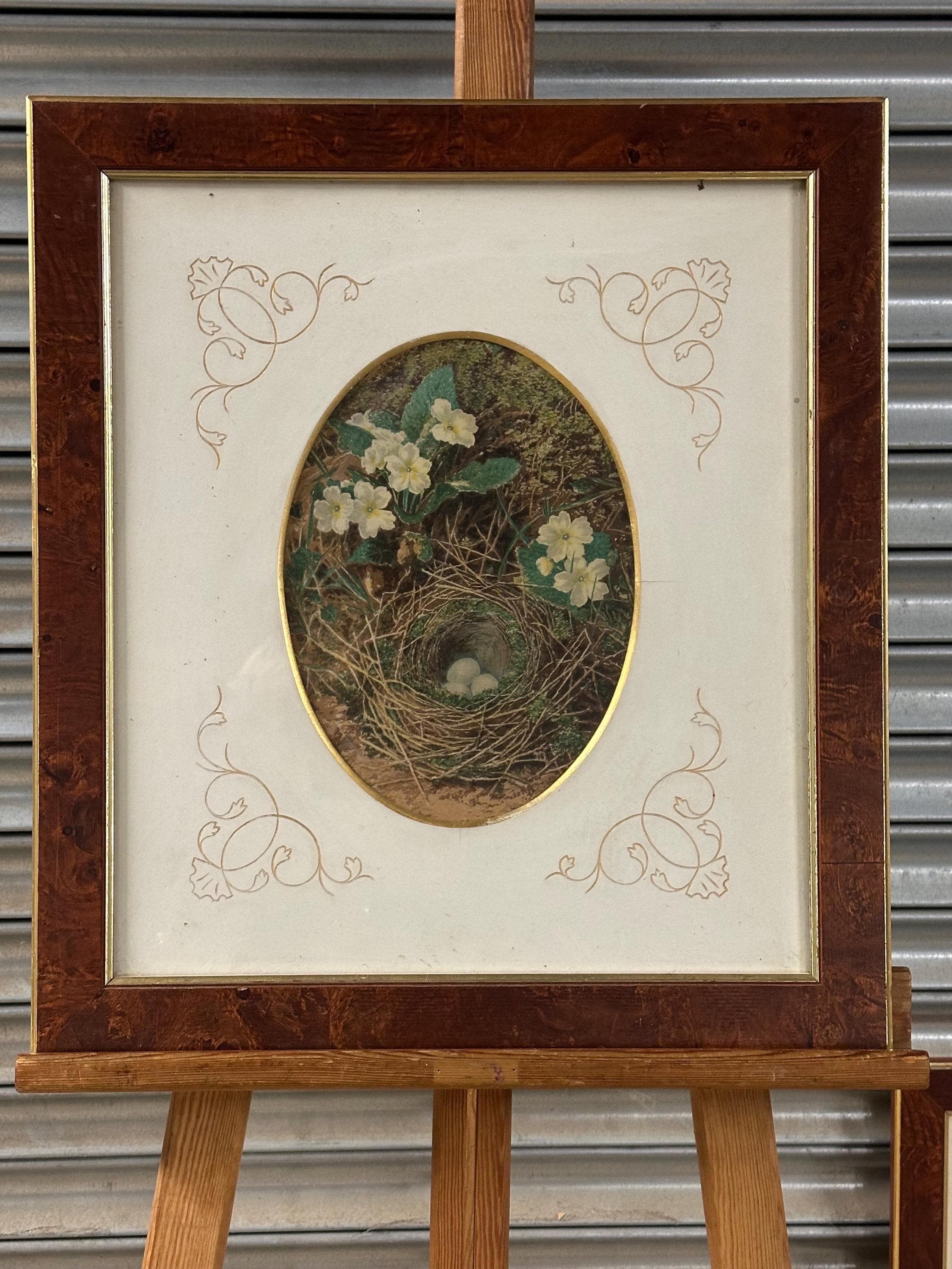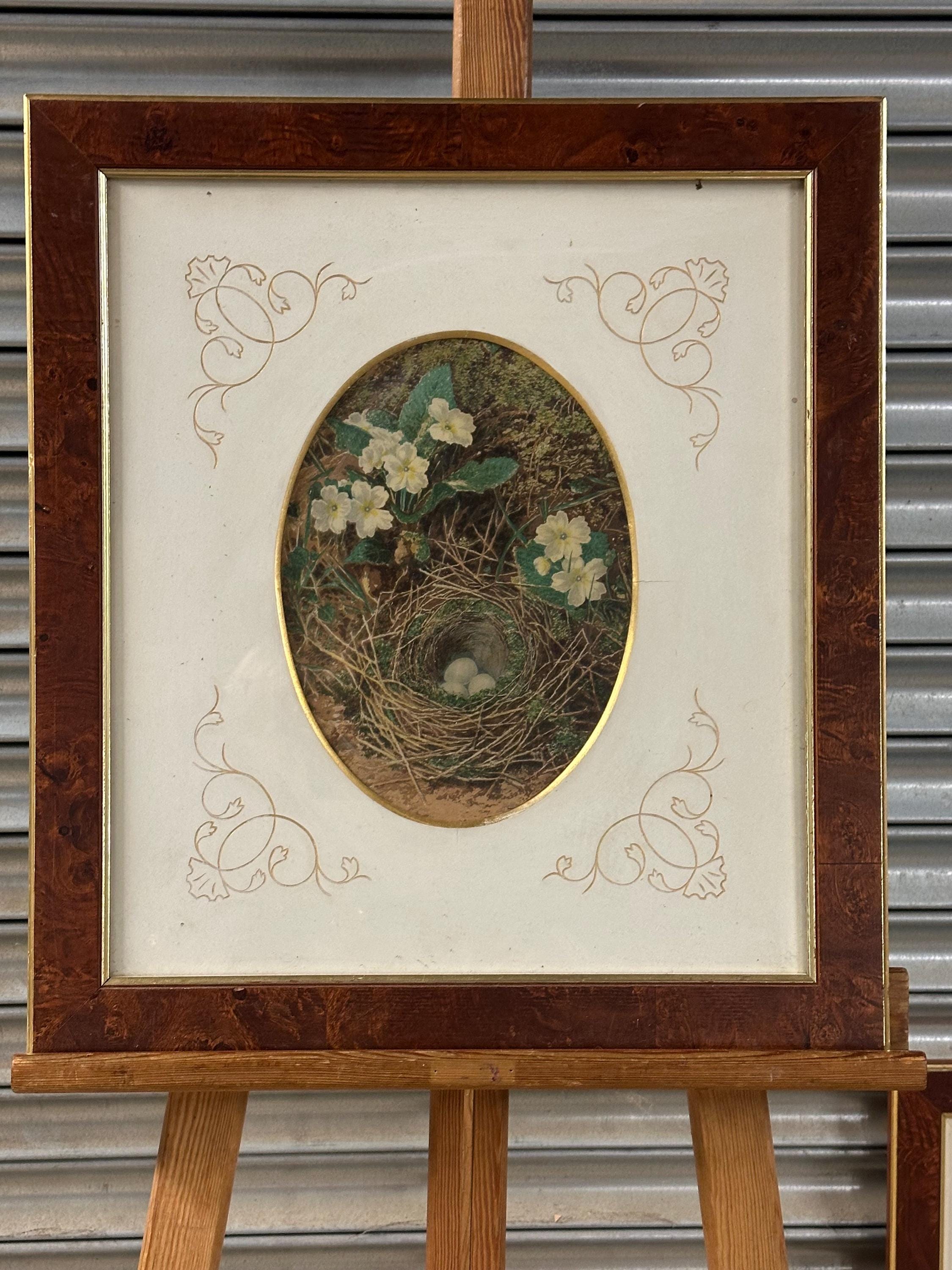Pair of Antique c1900 Oval Floral & Bird’s Nest Prints in Burr Walnut Frames