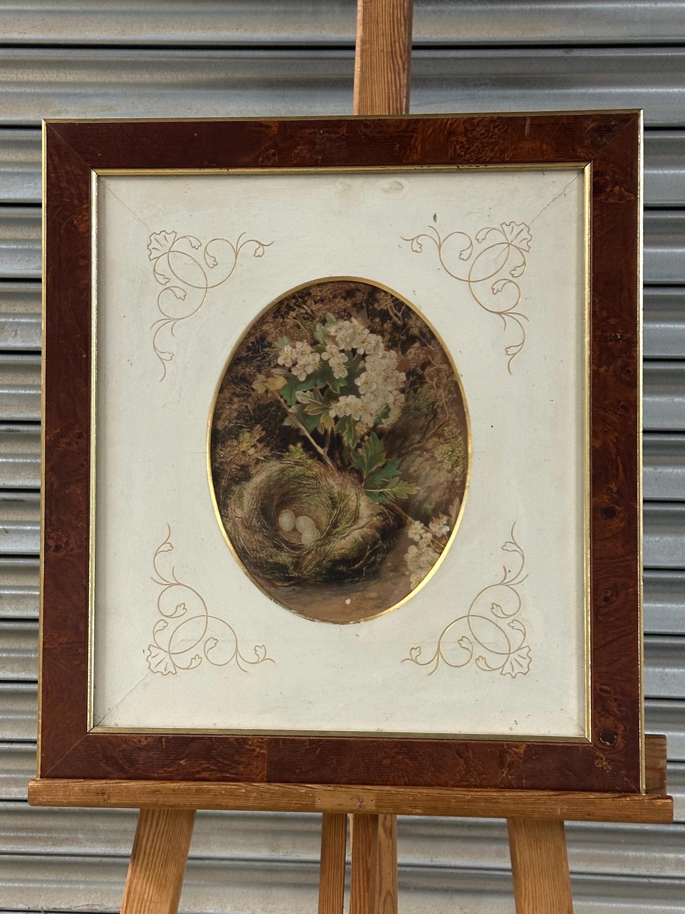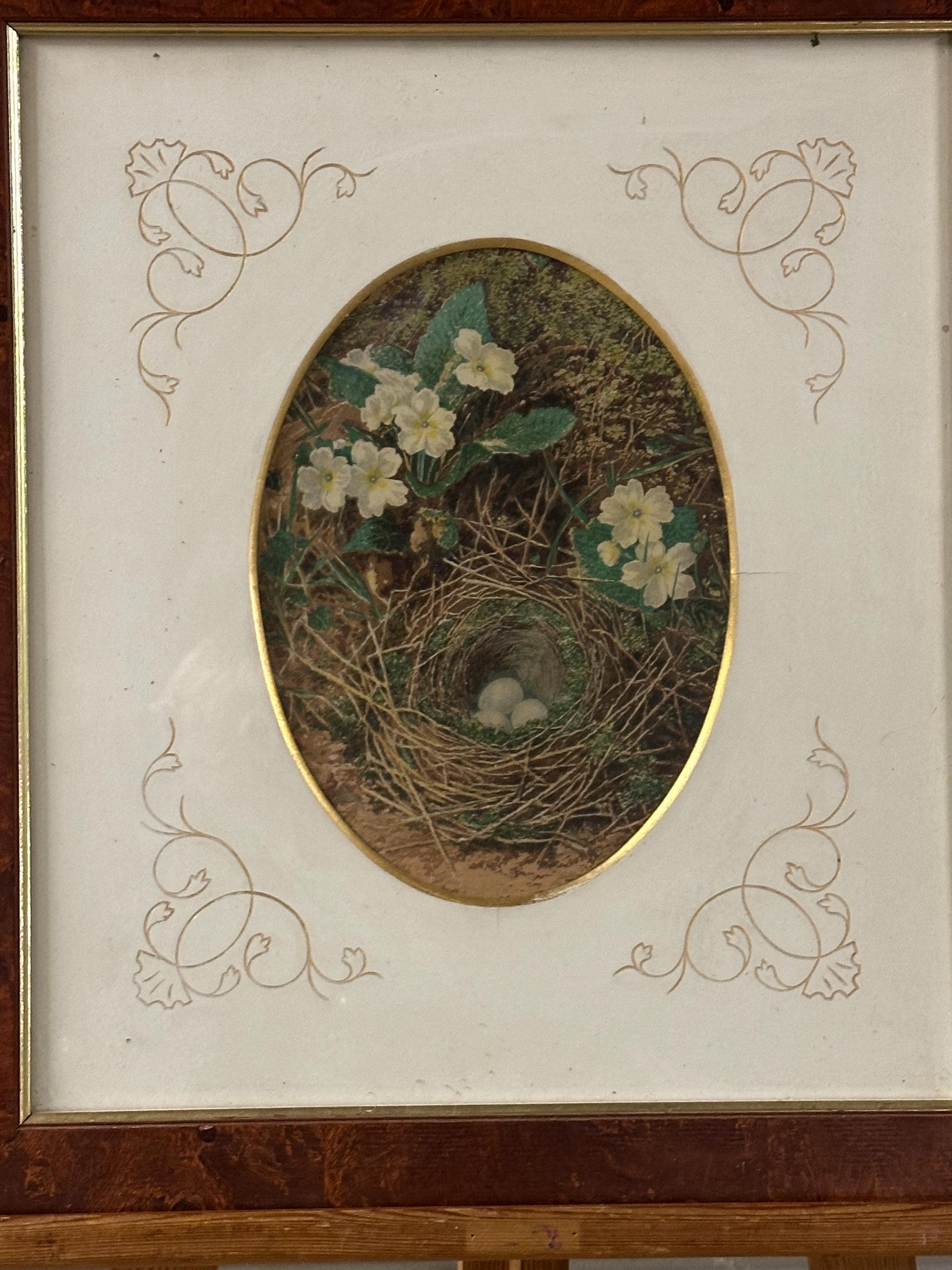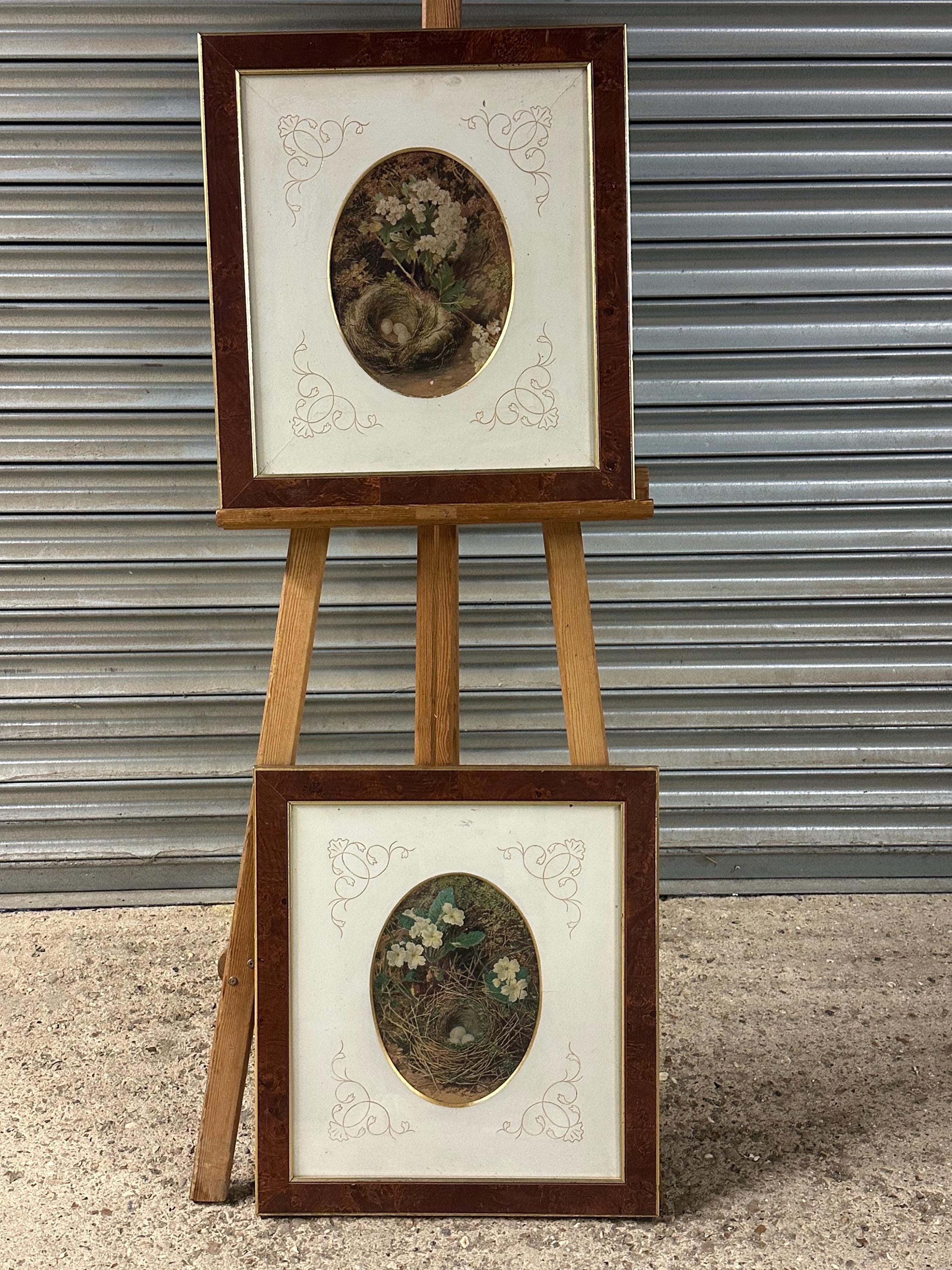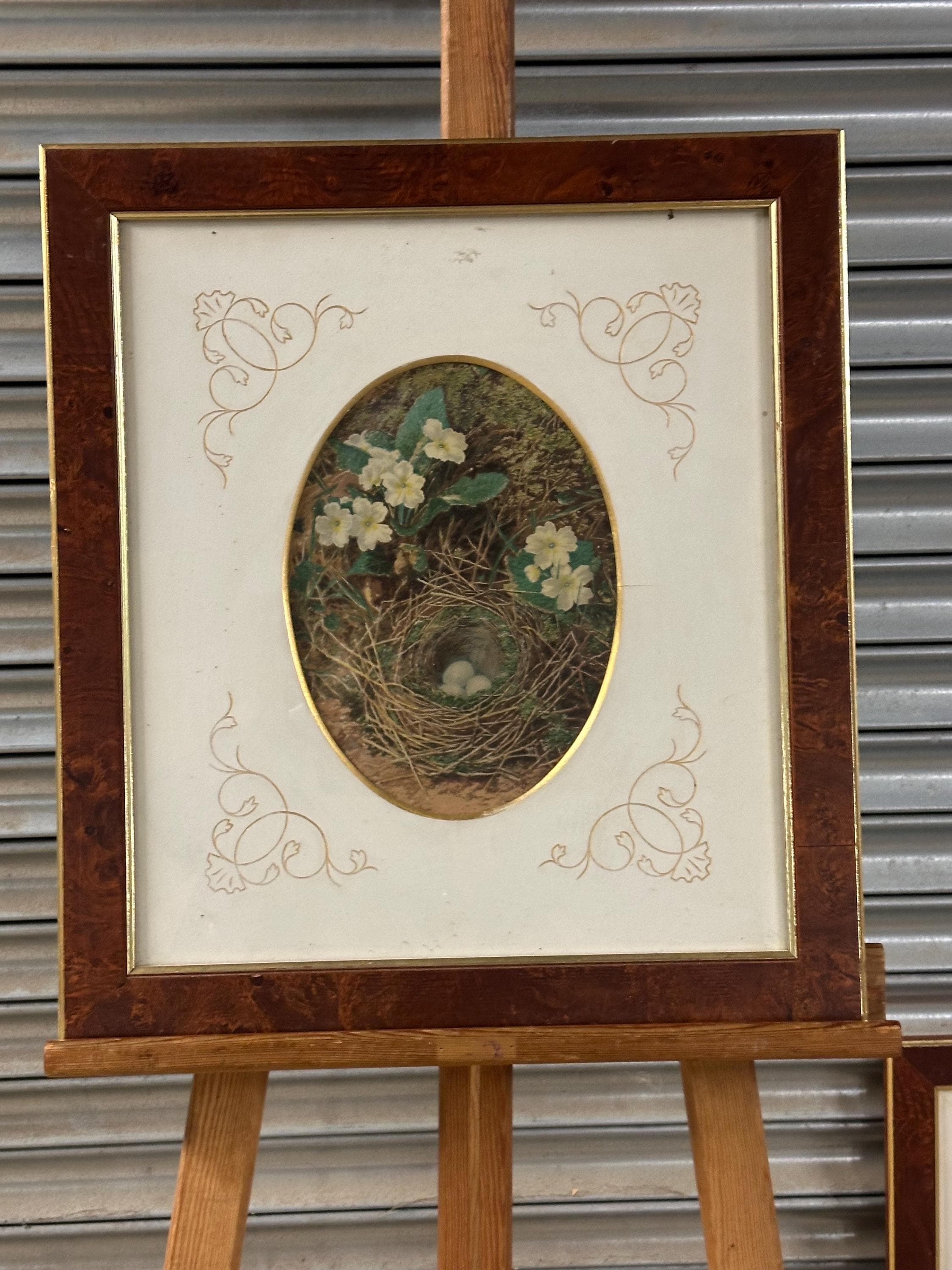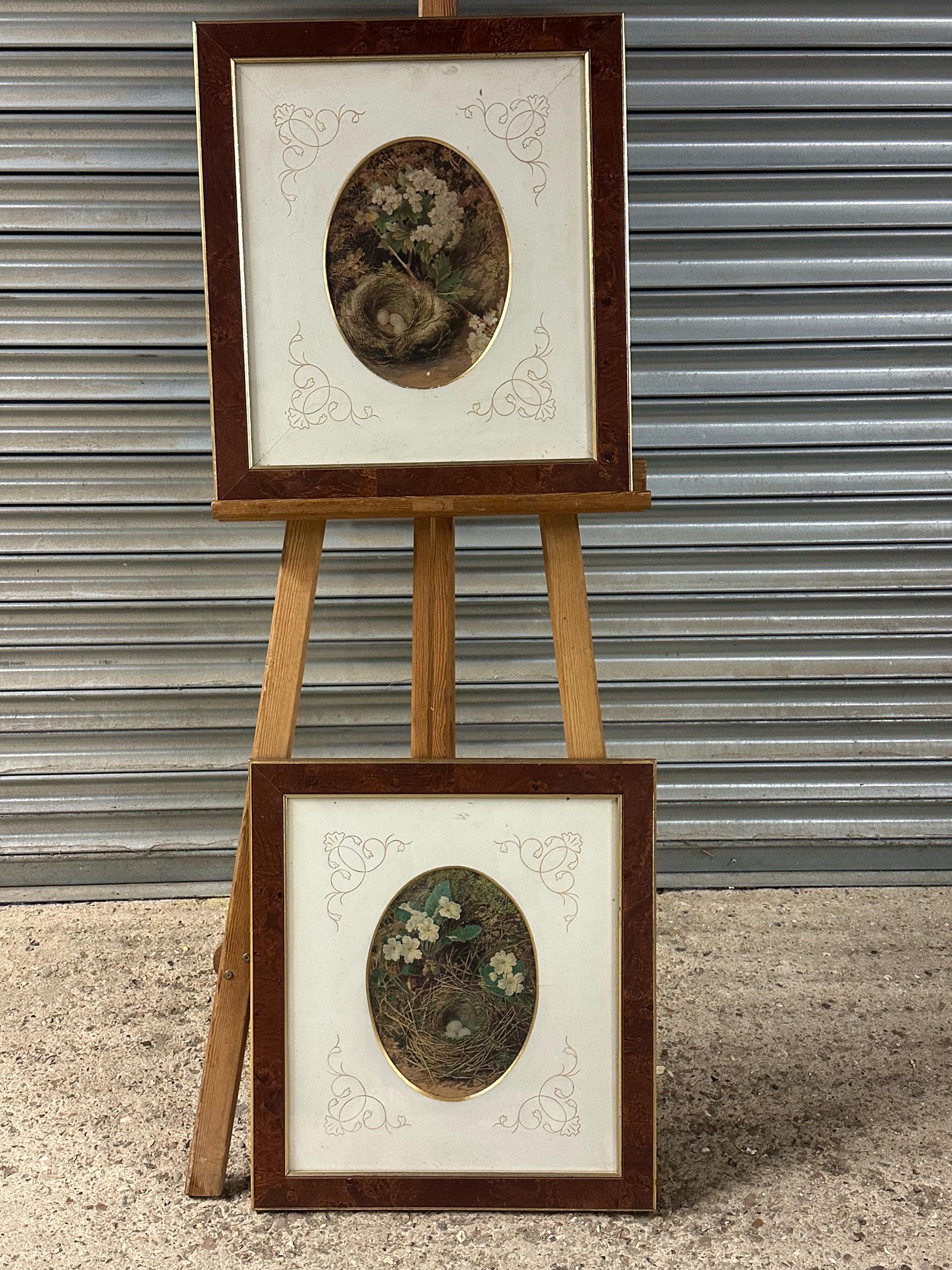 Pair of Antique c1900 Oval Floral & Bird’s Nest Prints in Burr Walnut Frames