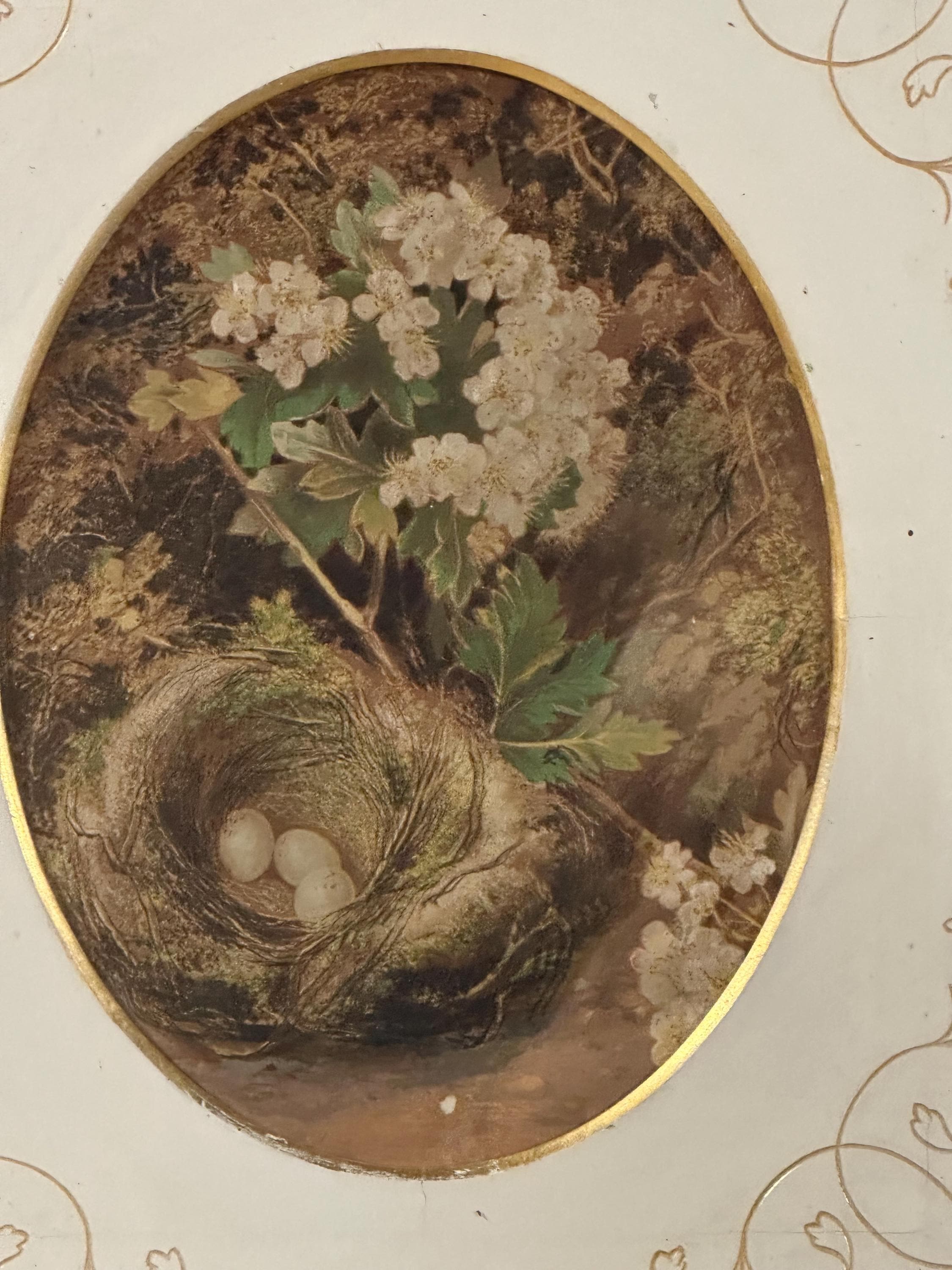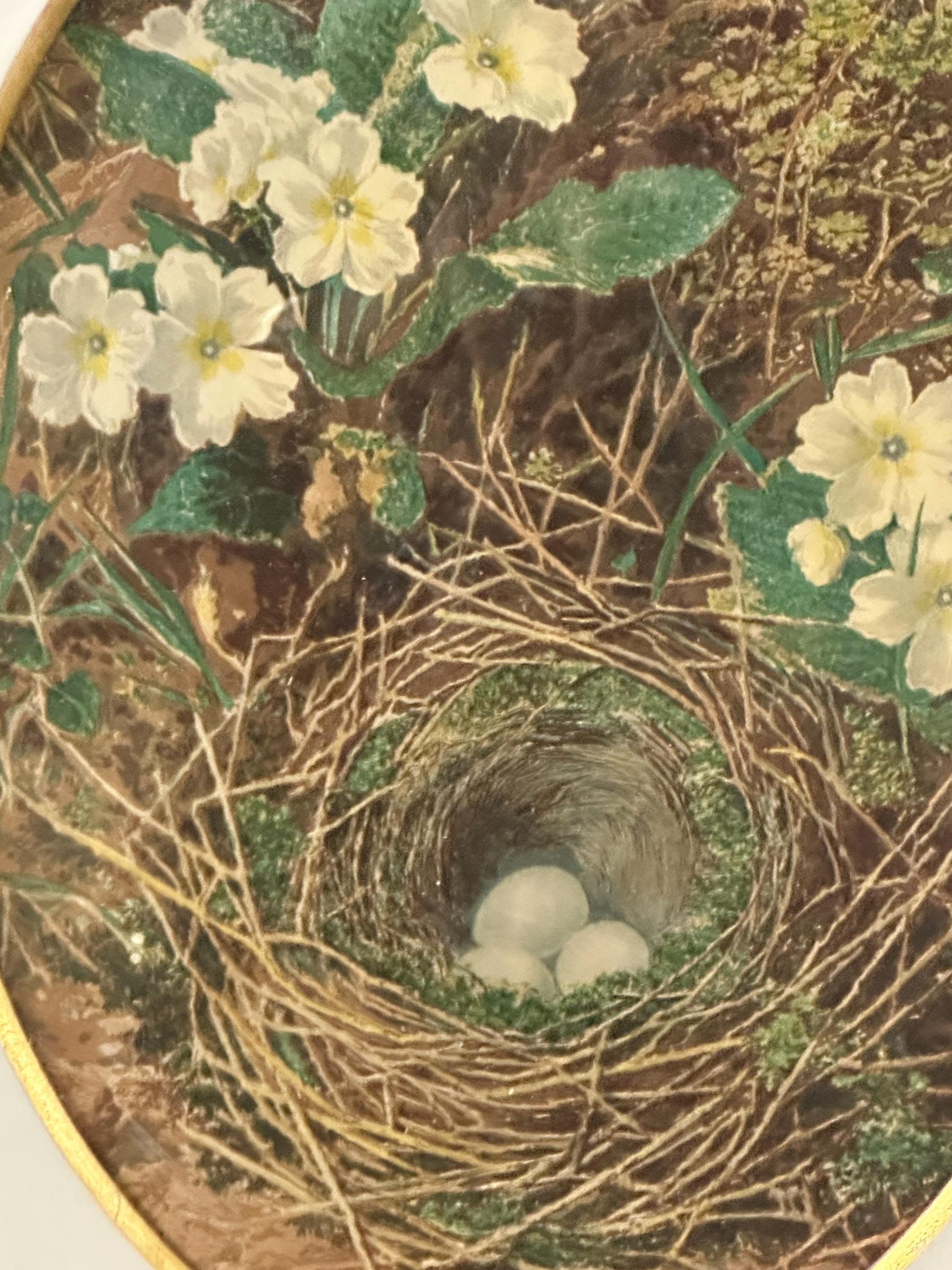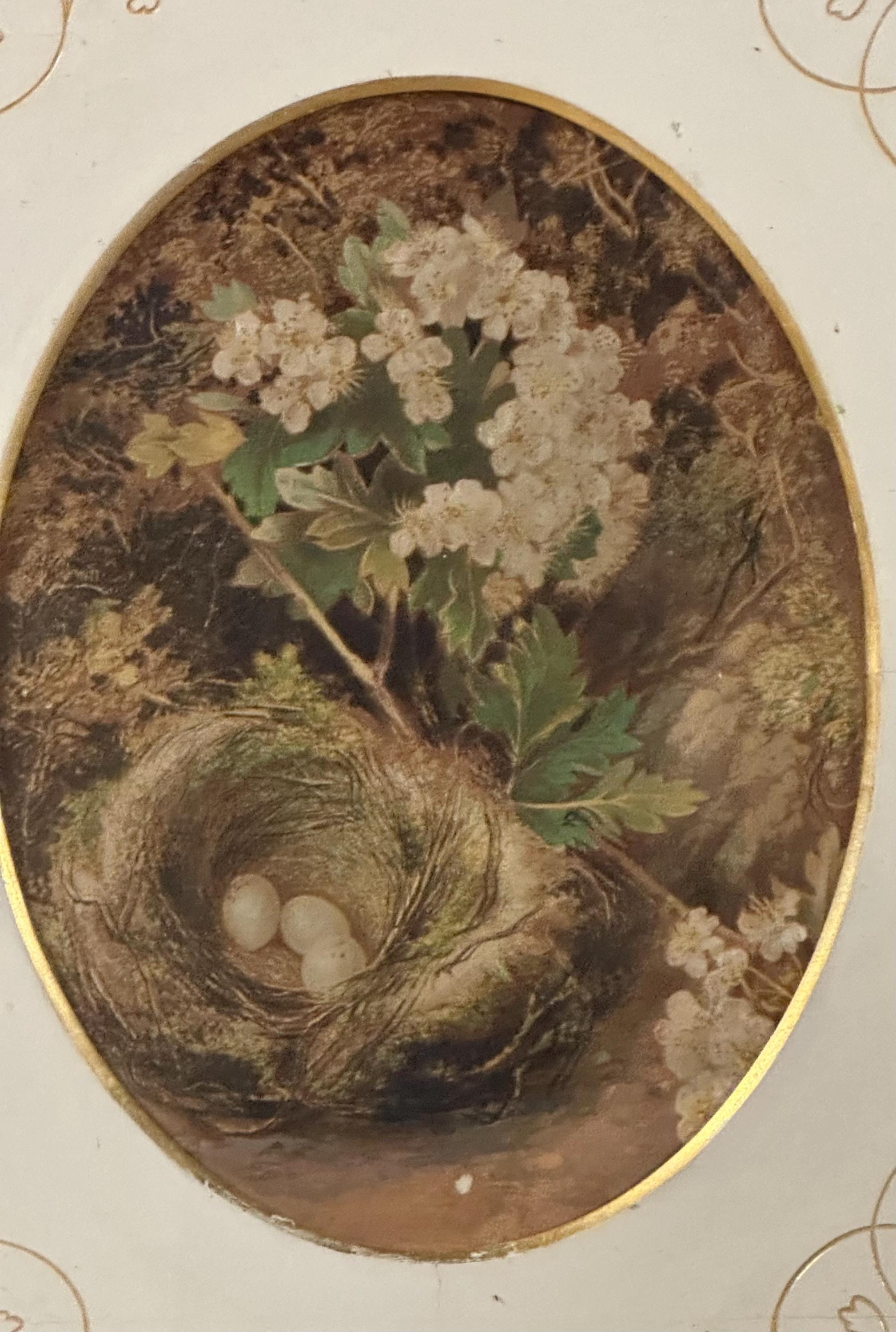 Each piece features a delicate oval study depicting a naturalistic scene of wild flowers and a bird’s nest with eggs, rendered in soft, muted tones typical of late Victorian / Edwardian decorative art. The prints are mounted within cream card mounts adorned with elegant gilt foliate corner detailing, enhancing their refined, country-house appeal.