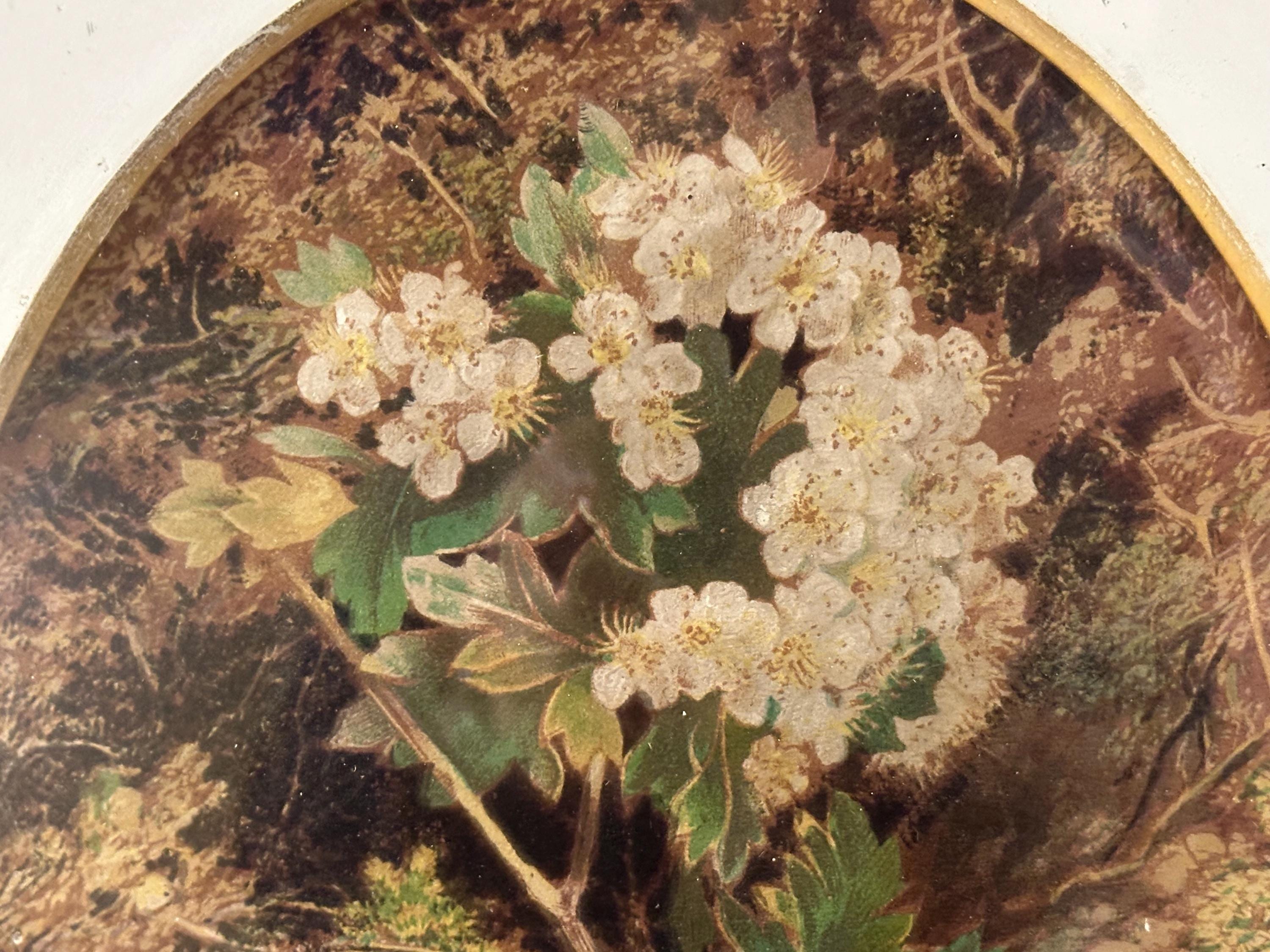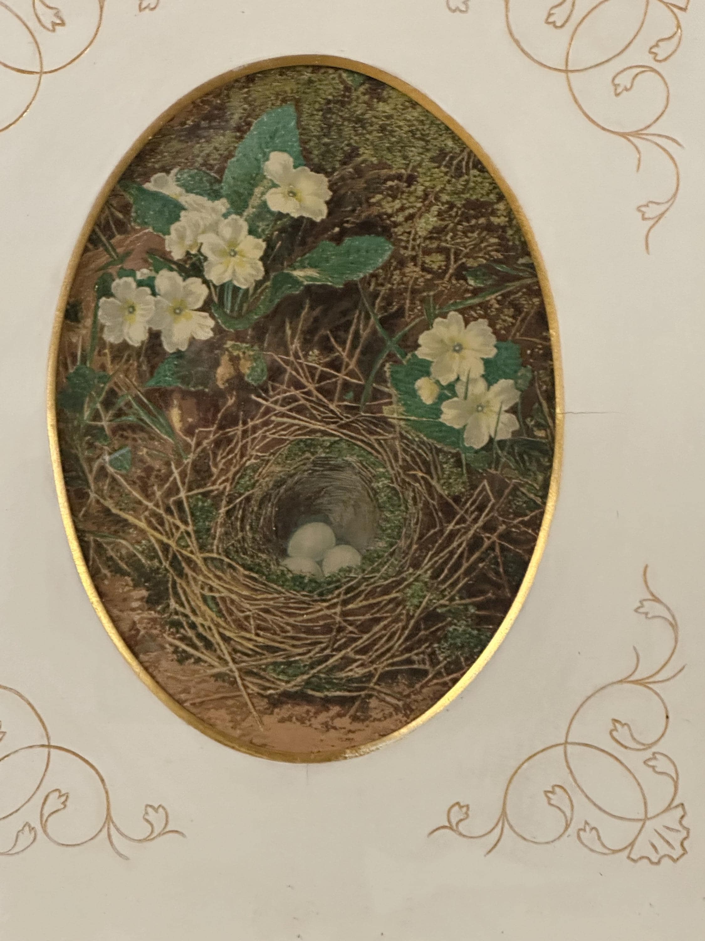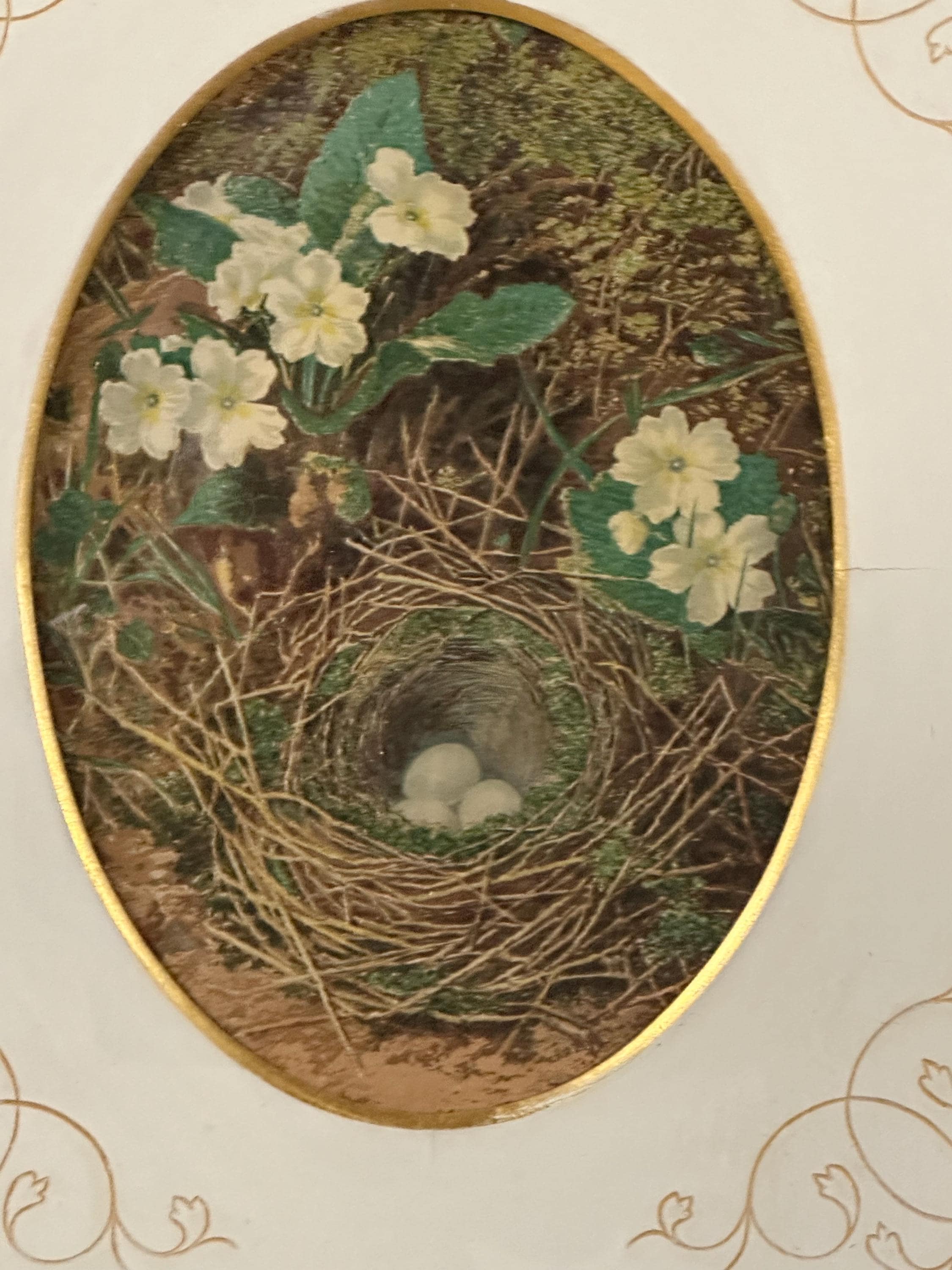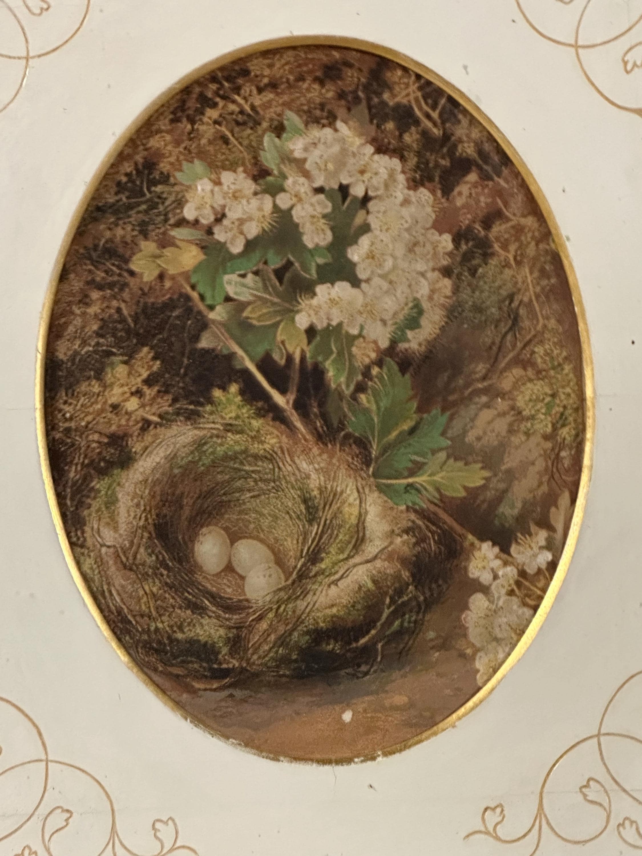 Each piece features a delicate oval study depicting a naturalistic scene of wild flowers and a bird’s nest with eggs, rendered in soft, muted tones typical of late Victorian / Edwardian decorative art. The prints are mounted within cream card mounts adorned with elegant gilt foliate corner detailing, enhancing their refined, country-house appeal.