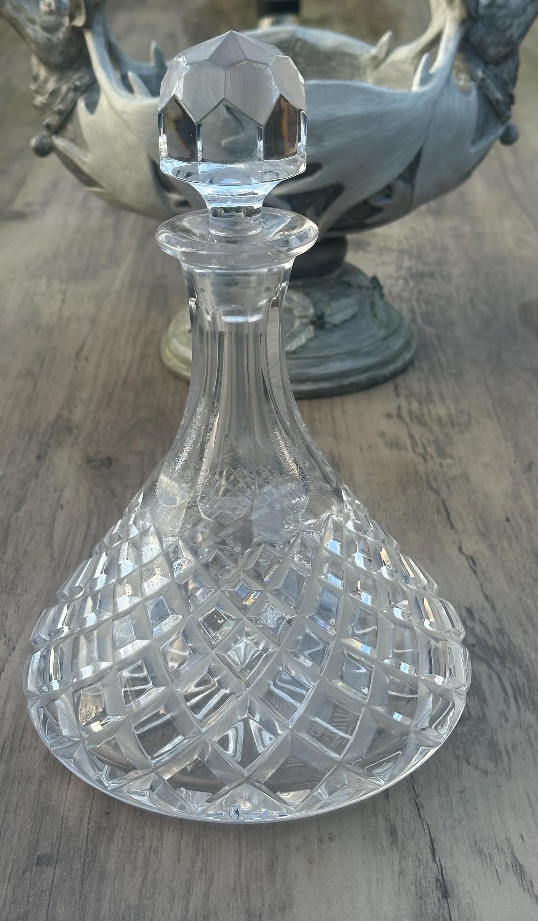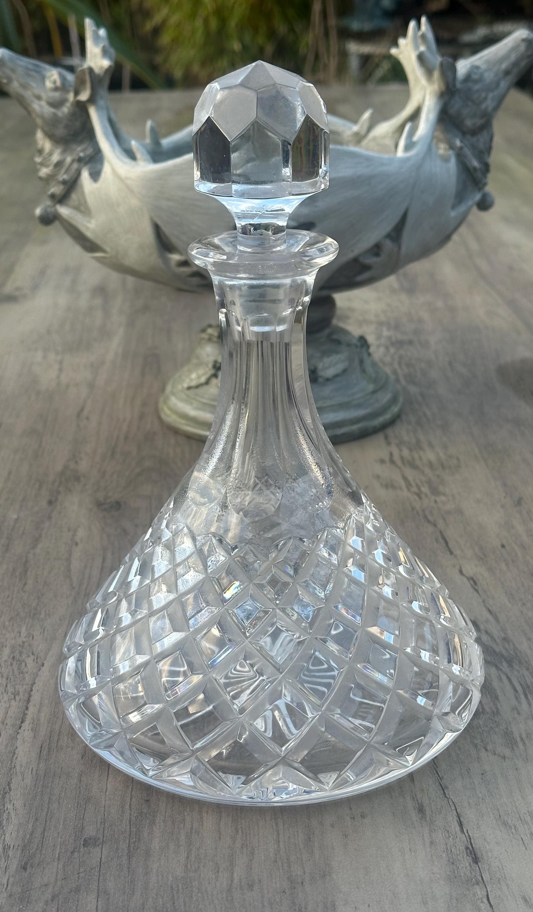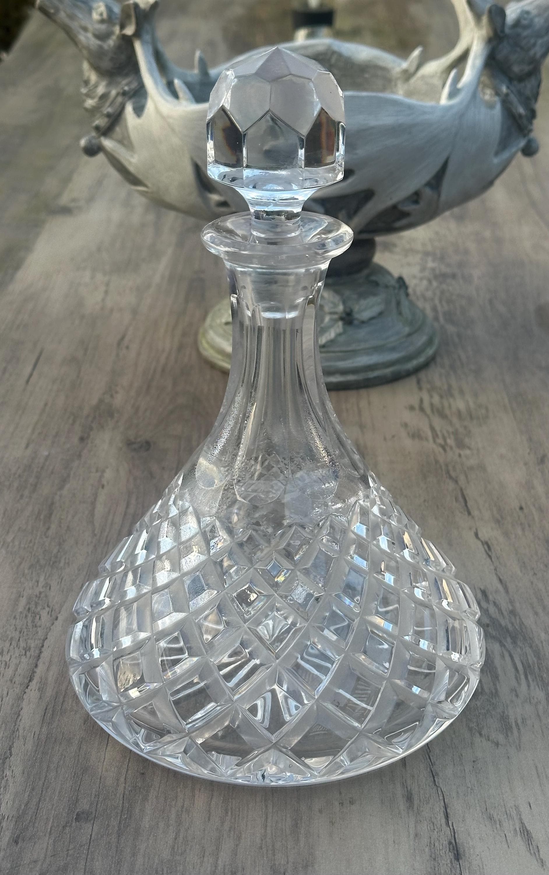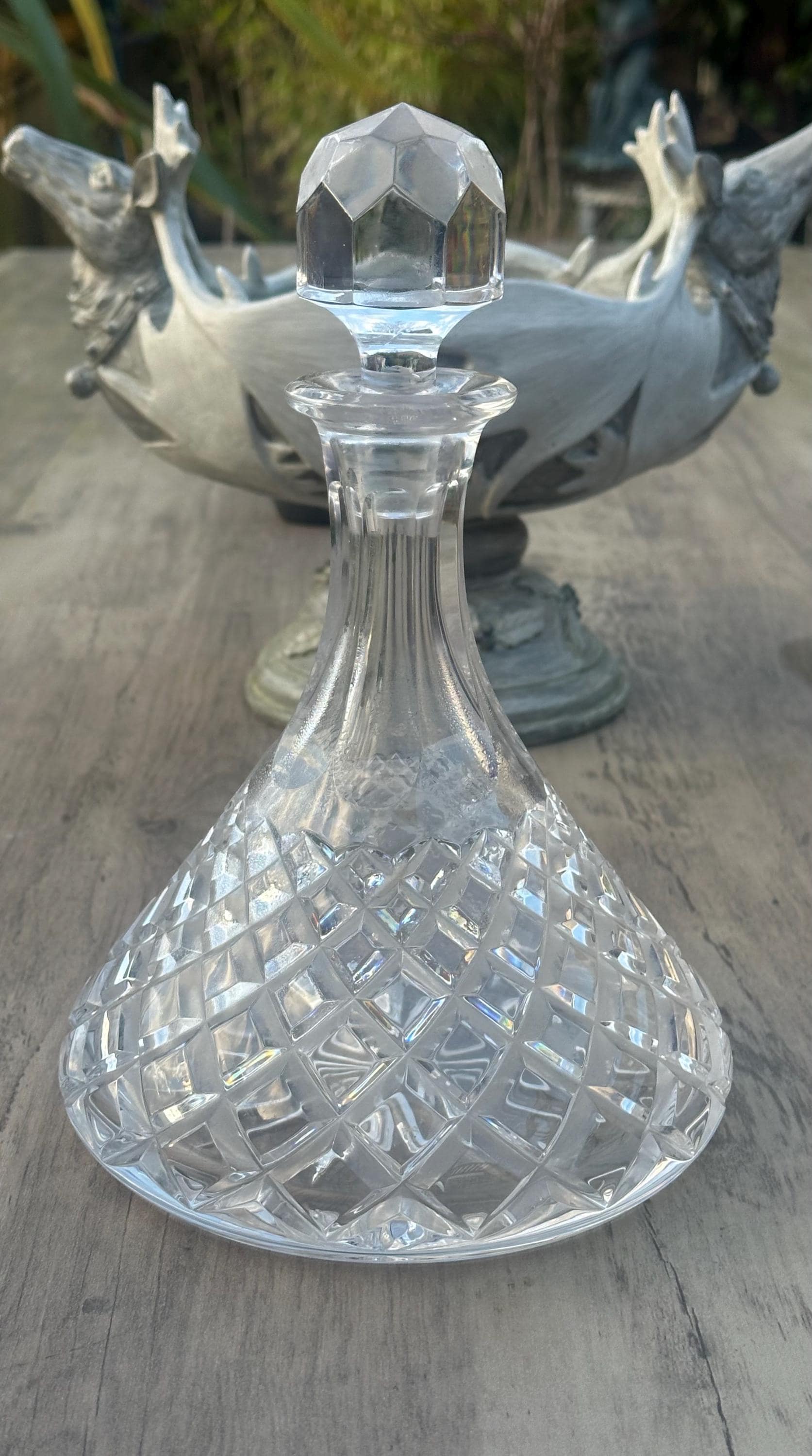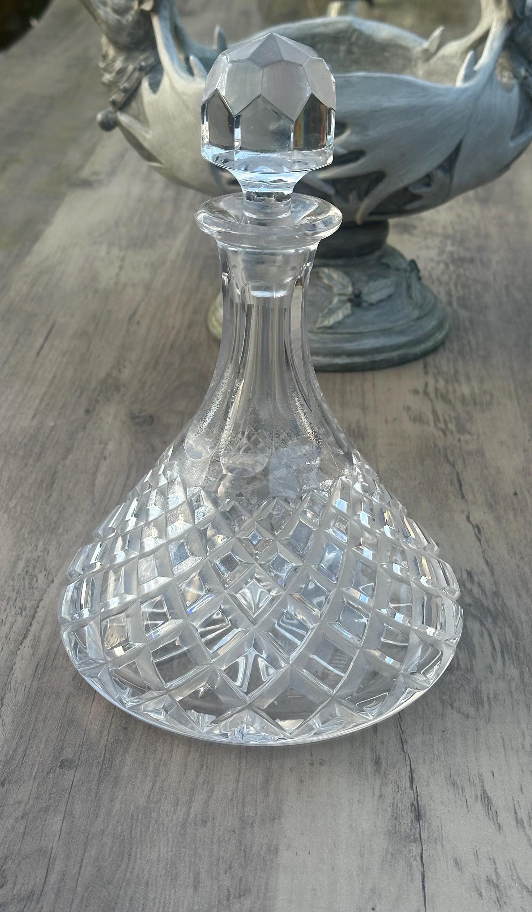 A classic cut crystal decanter in the traditional ship’s decanter form, featuring a broad, stable base designed to reduce tipping — originally intended for use aboard ships and naval vessels.