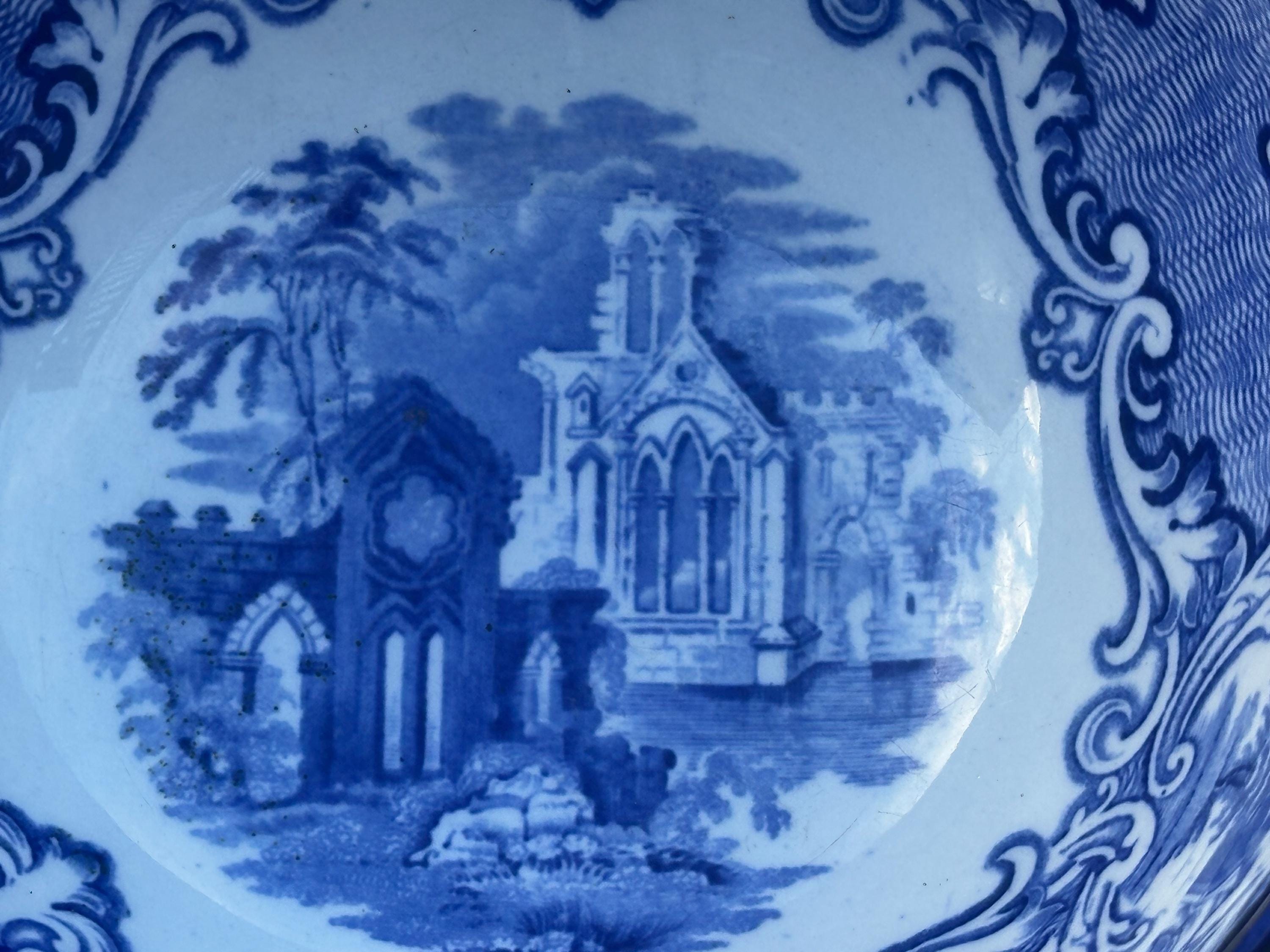 This striking piece features a rich cobalt blue transfer-printed design depicting romanticised abbey ruins within an ornate scrolling border. The centre scene shows gothic architectural elements and trees, framed by an elaborate rococo-style cartouche with finely detailed border work extending around the interior rim. The depth and clarity of the transfer print are excellent, with lovely tonal variation typical of quality early 20th-century English manufacture.