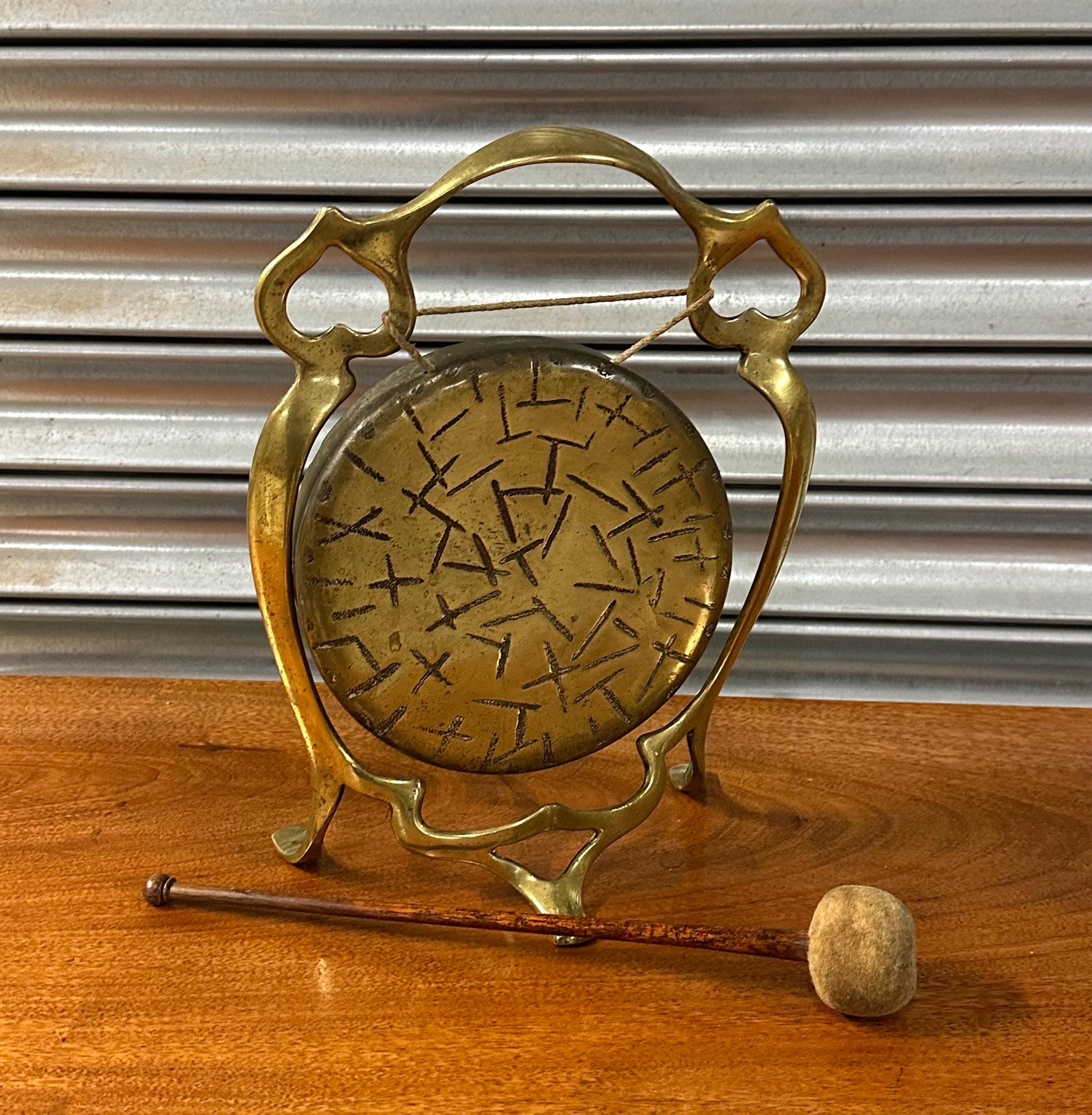 Charming vintage brass table gong, complete with its original decorative brass stand and wooden mallet with felted head. The gong features an attractive etched abstract pattern, suspended within an elegant pierced frame with flowing Arts & Crafts–inspired lines.