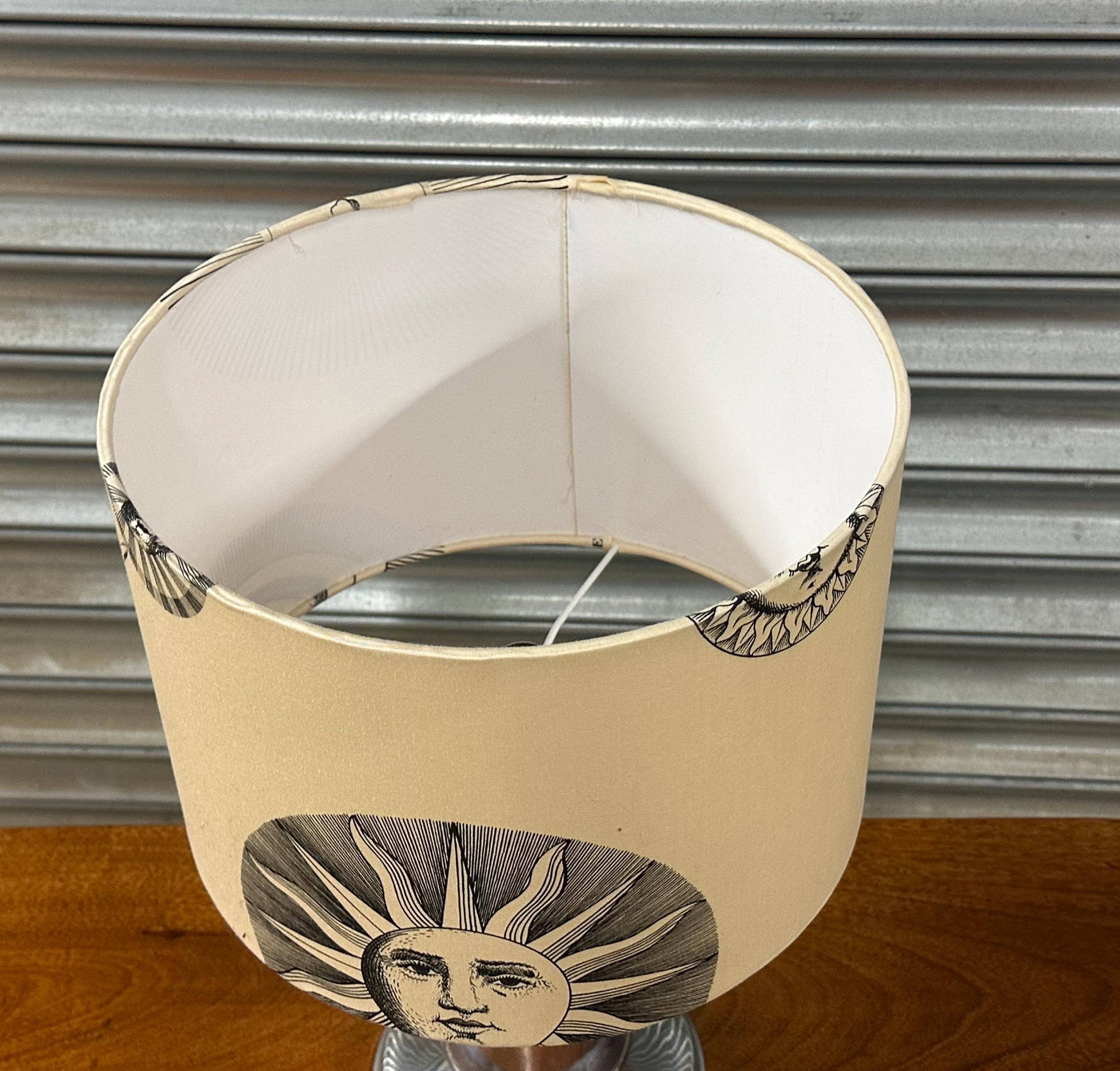 A striking and highly decorative contemporary table lamp featuring the iconic “Soli e Lune” fabric design by the legendary Italian designer Piero Fornasetti, produced in collaboration with Luciano Marcato.