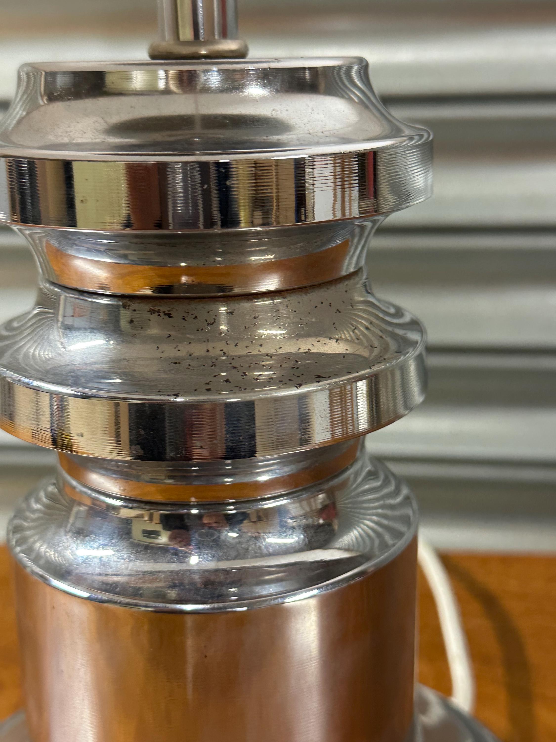 The lamp sits on a metal base (silver tone finish), offering a sleek contemporary contrast to the detailed shade design.