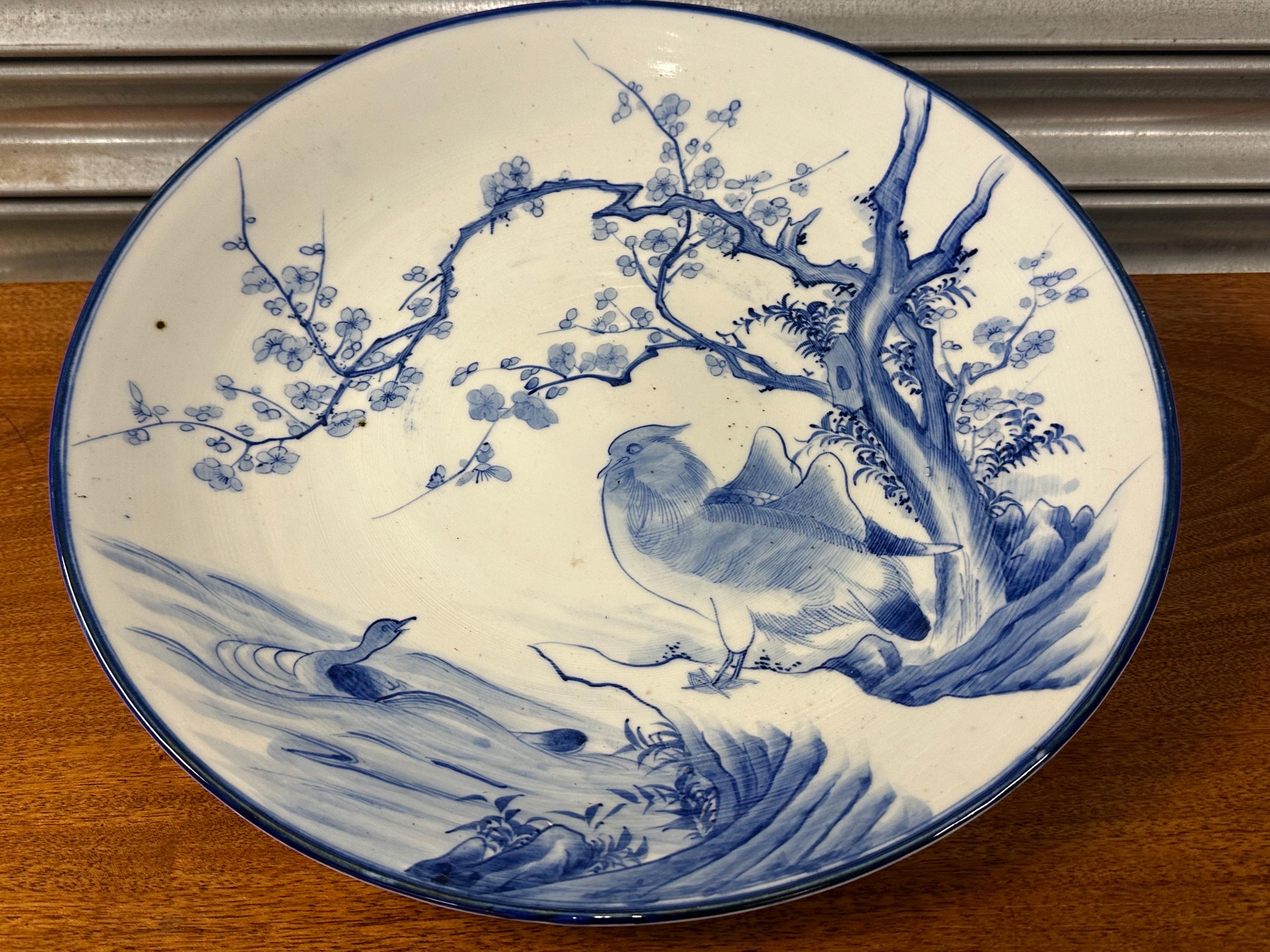 This elegant large plate features a tranquil landscape scene with a crested bird perched beneath blossoming branches, overlooking flowing water with a swimming waterfowl below. The composition is finely executed in varying tones of cobalt blue, creating depth and movement against the soft ivory ground. The rim is finished with a classic deep blue edge.