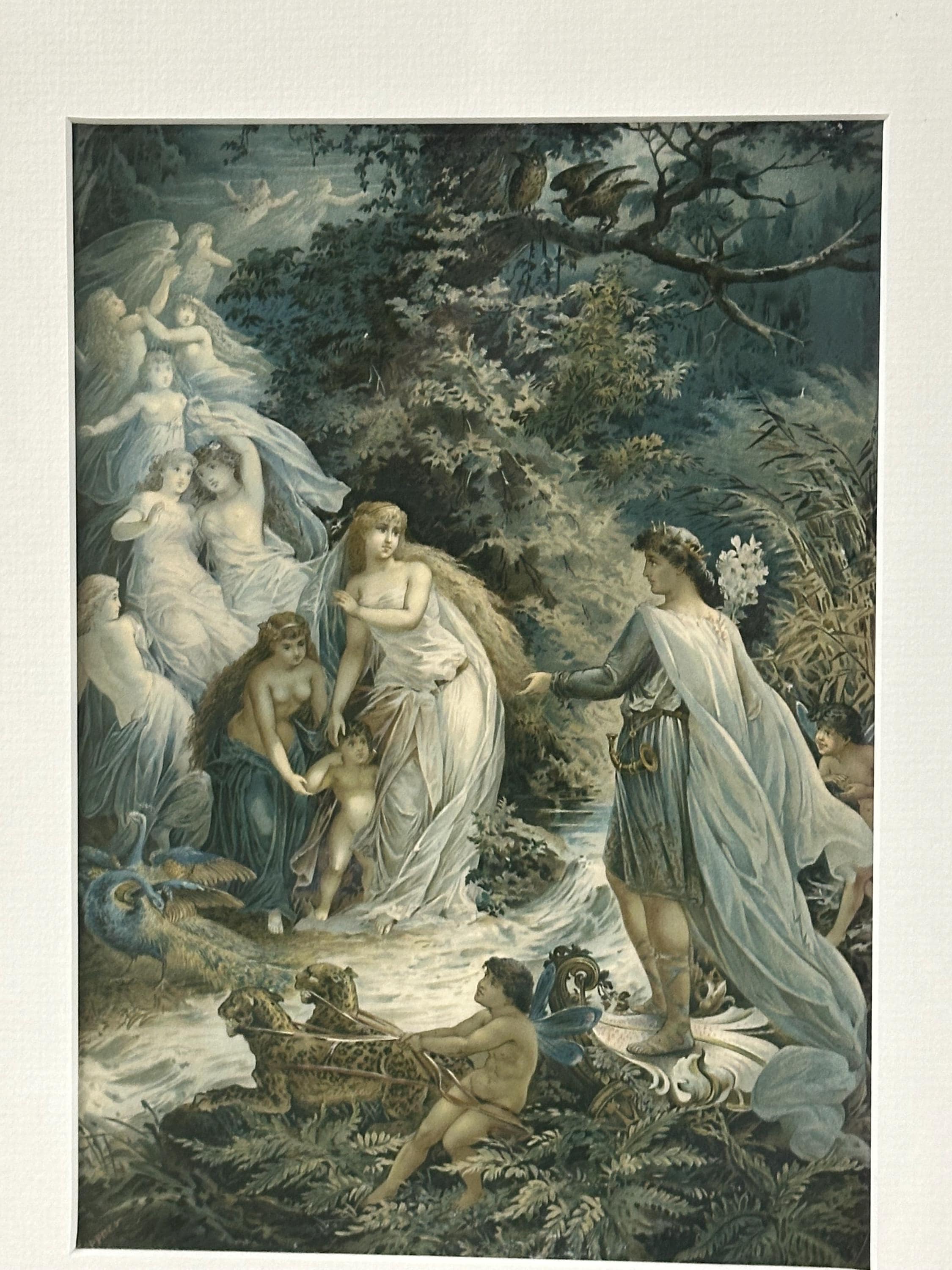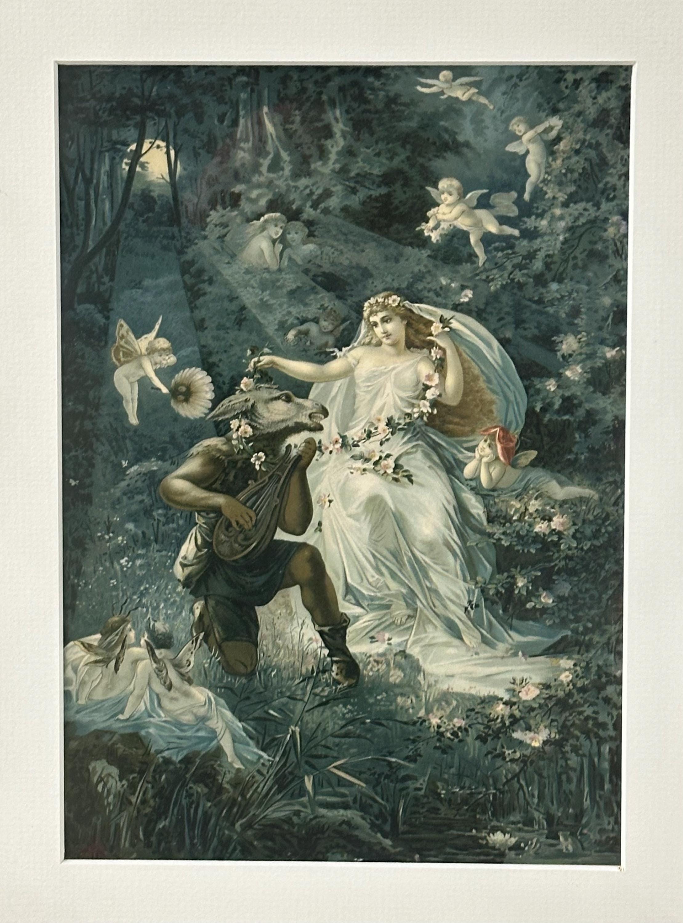 These charming Victorian prints capture the magical world of Shakespeare’s famous comedy, featuring romantic and mythical scenes with fairies, woodland spirits, lovers, and classical figures set within enchanting forest landscapes. The artwork reflects the late Victorian fascination with romantic literature and fairy imagery.
