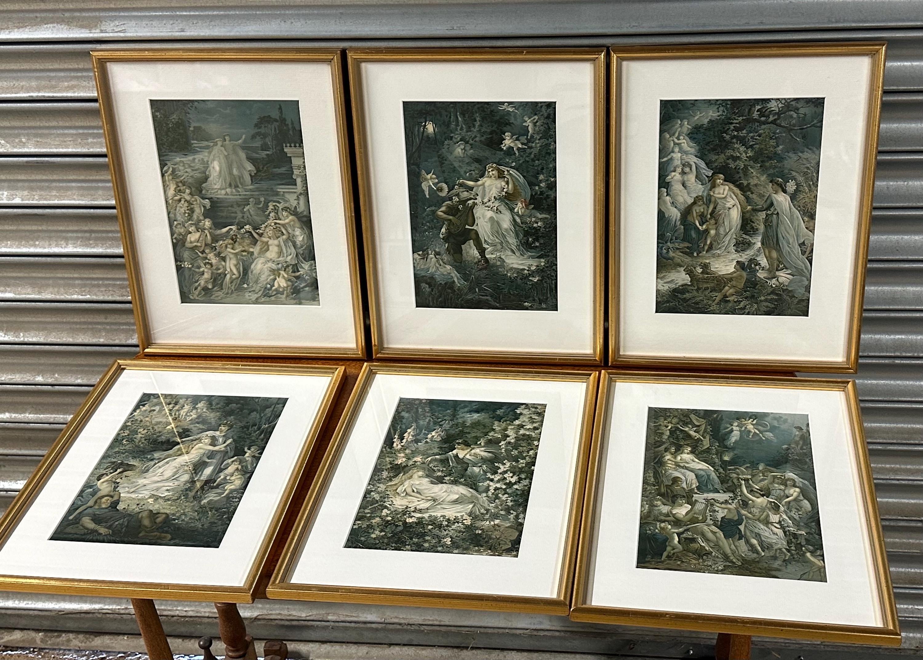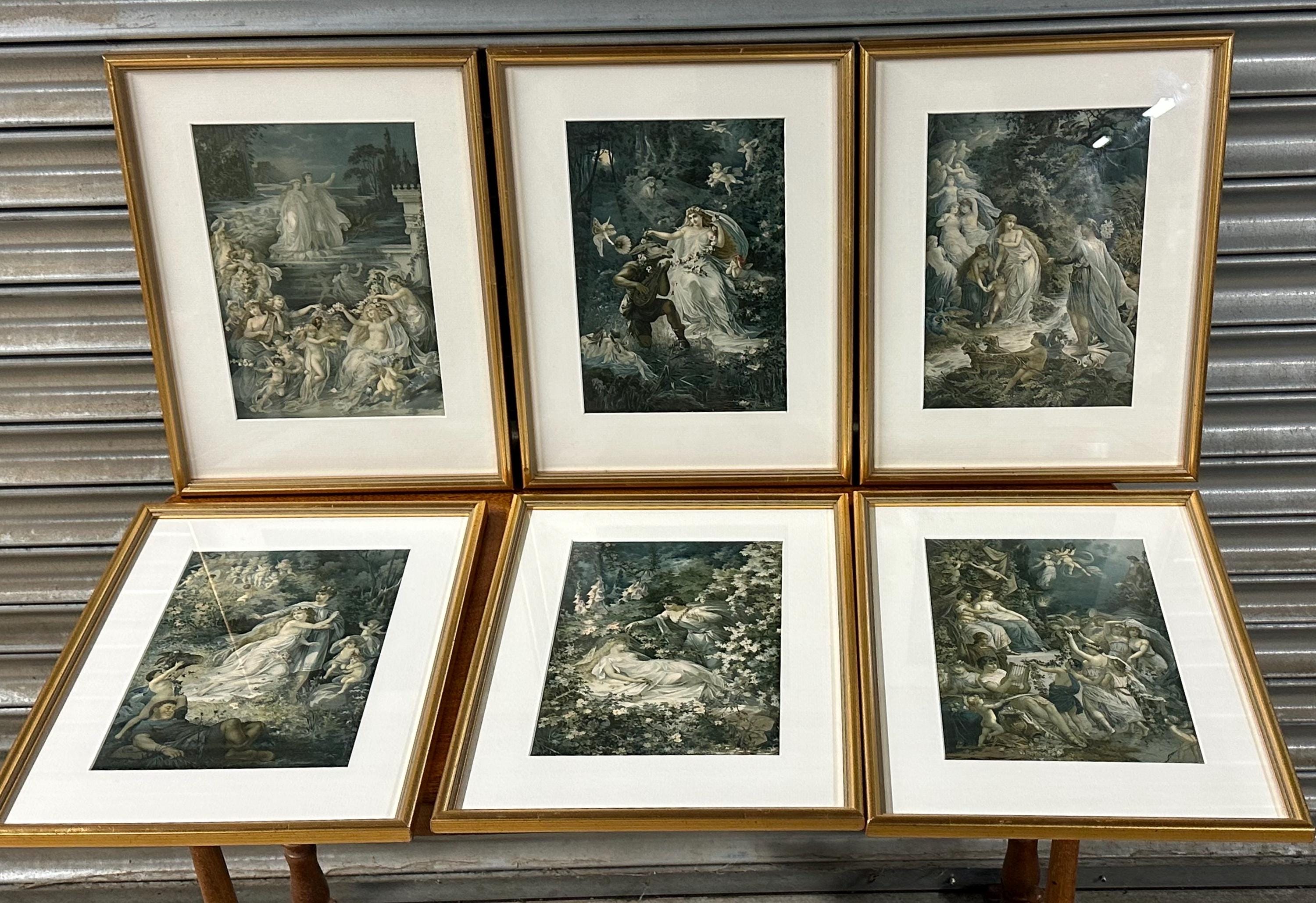 A beautiful and decorative set of six antique chromolithograph prints depicting scenes from William Shakespeare’s A Midsummer Night’s Dream, dating to around the 1890s.