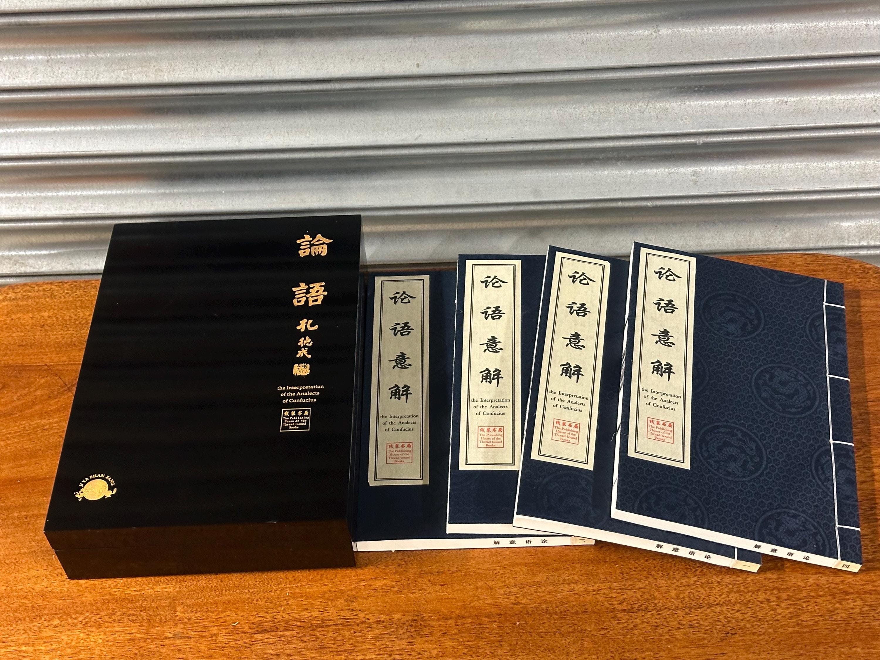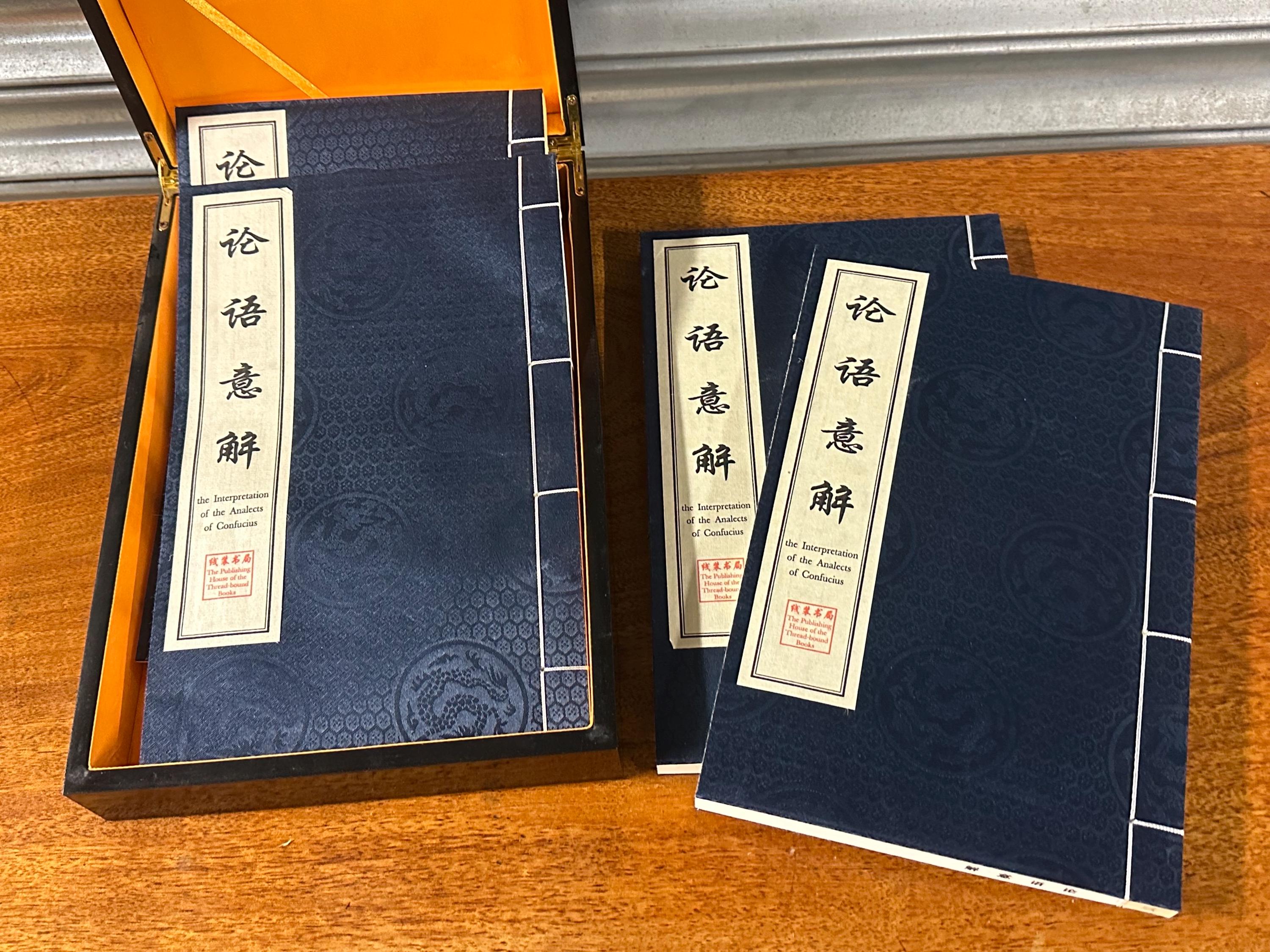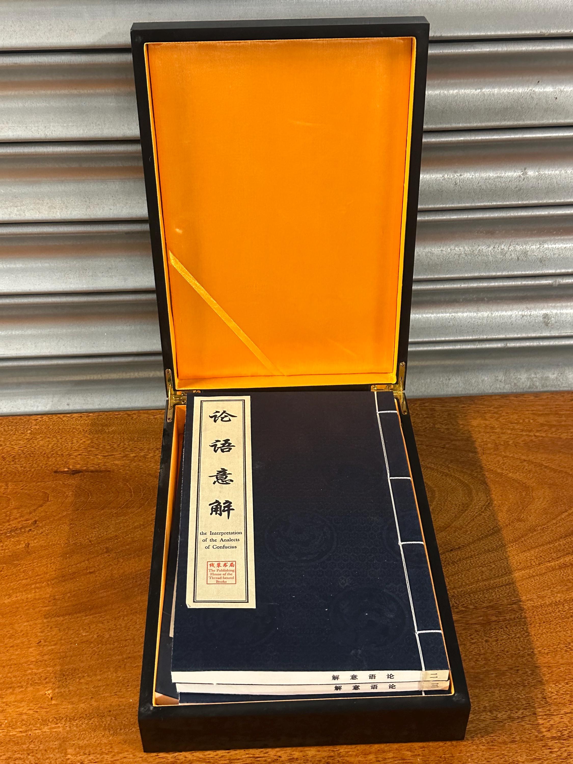 A beautiful modern Chinese thread-bound edition of The Interpretation of the Analects of Confucius, presented in an elegant black slipcase with gilt Chinese calligraphy.