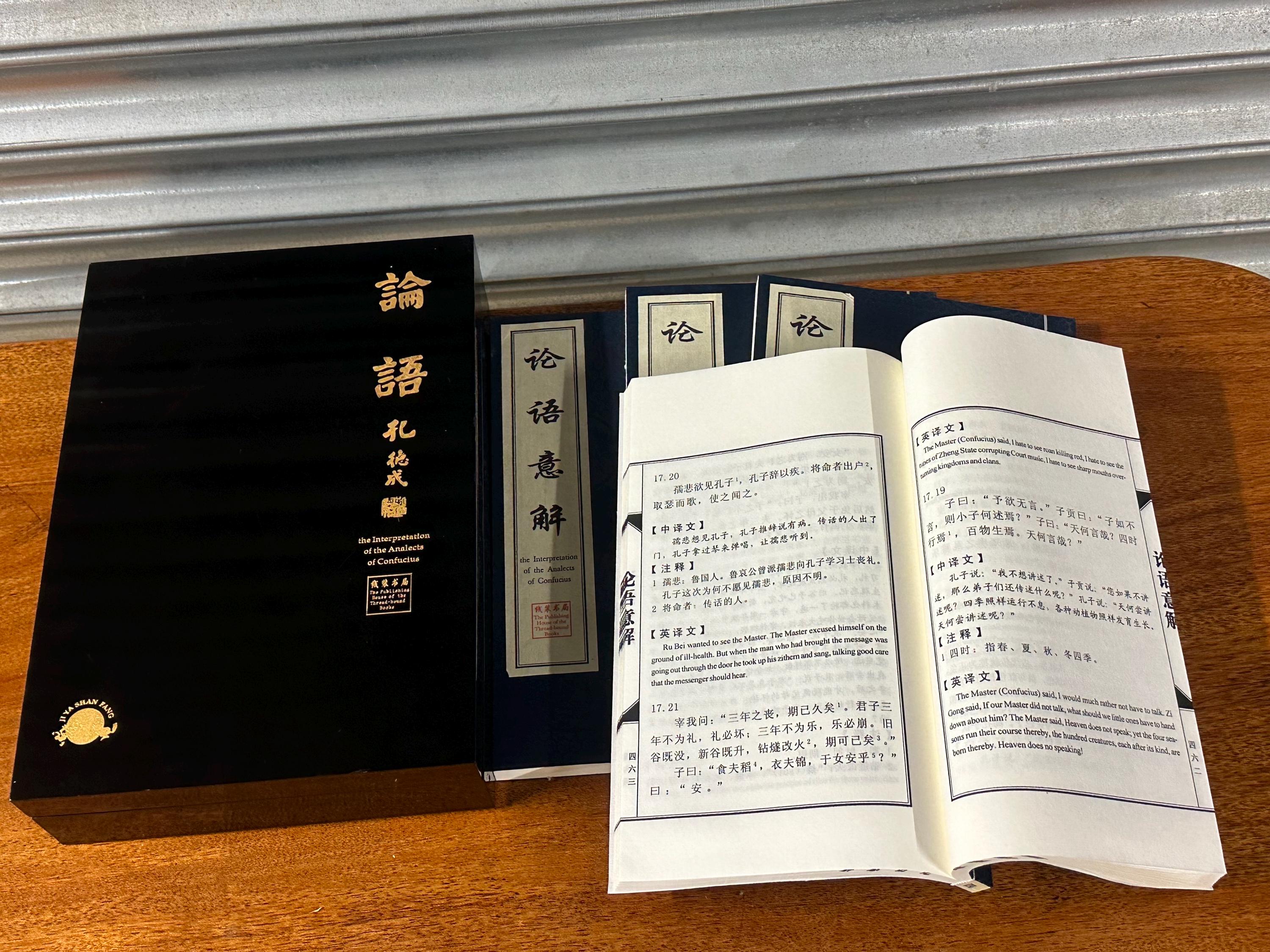 The set comprises multiple traditionally bound volumes, combining original Classical Chinese text with modern Chinese interpretation and English translation, making it both a scholarly reference and an attractive collector’s piece.