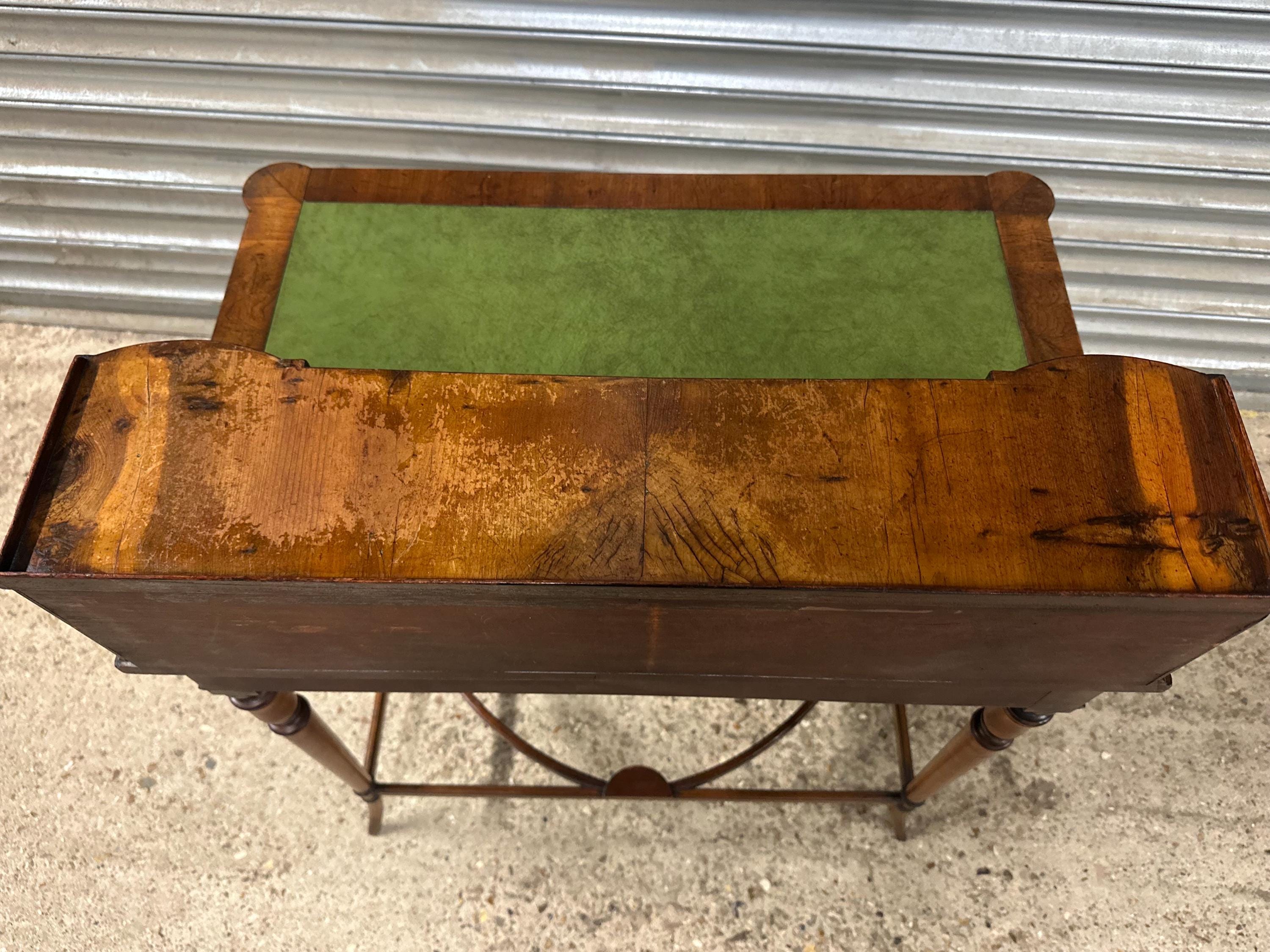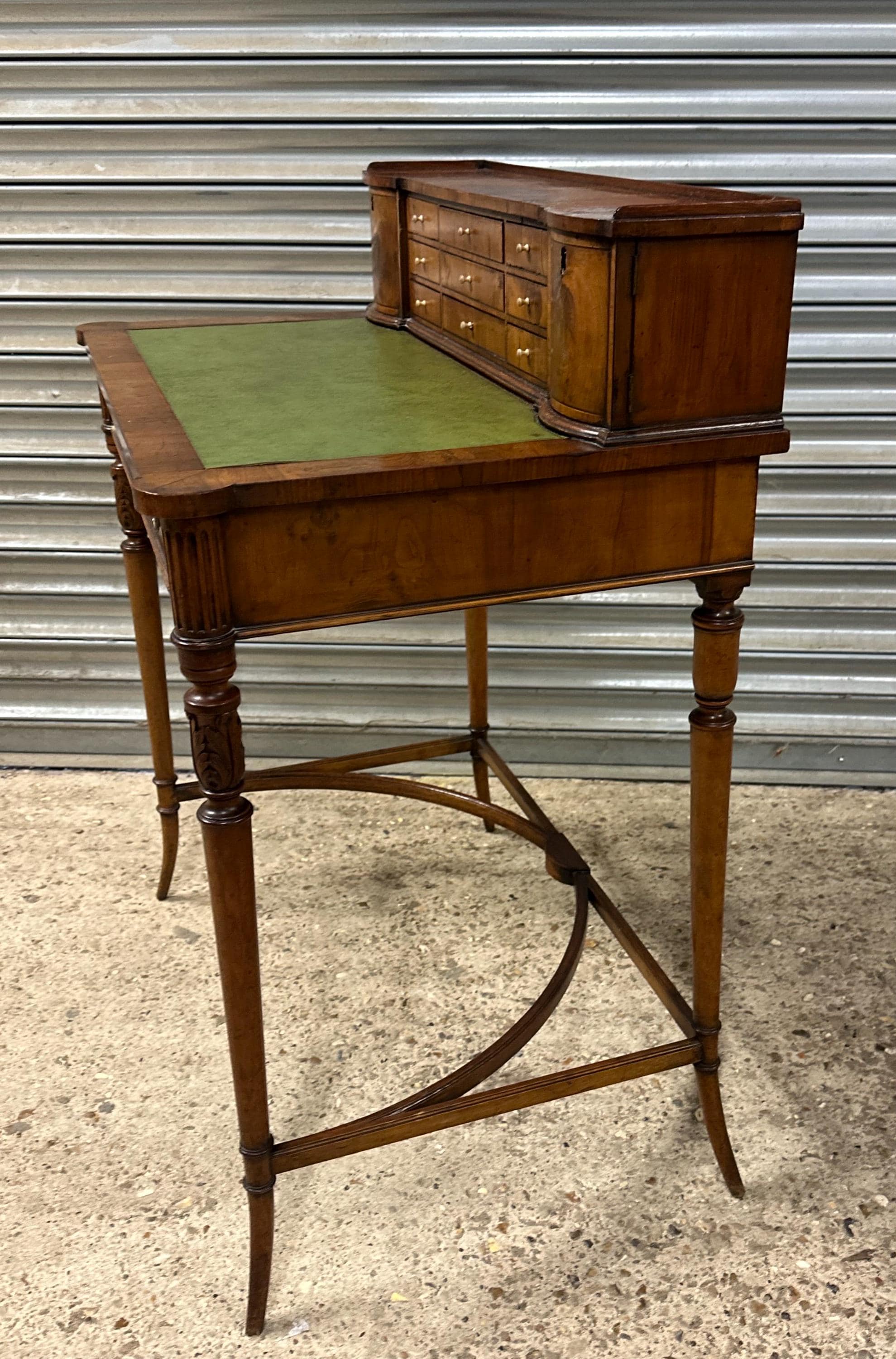 Below the writing surface is a full-width central drawer fitted with original brass ring handles and a central key escutcheon. The desk stands on slender turned legs with carved capitals, terminating in elegant tapered feet, and is united by a graceful arched stretcher, providing both stability and a light, decorative profile.