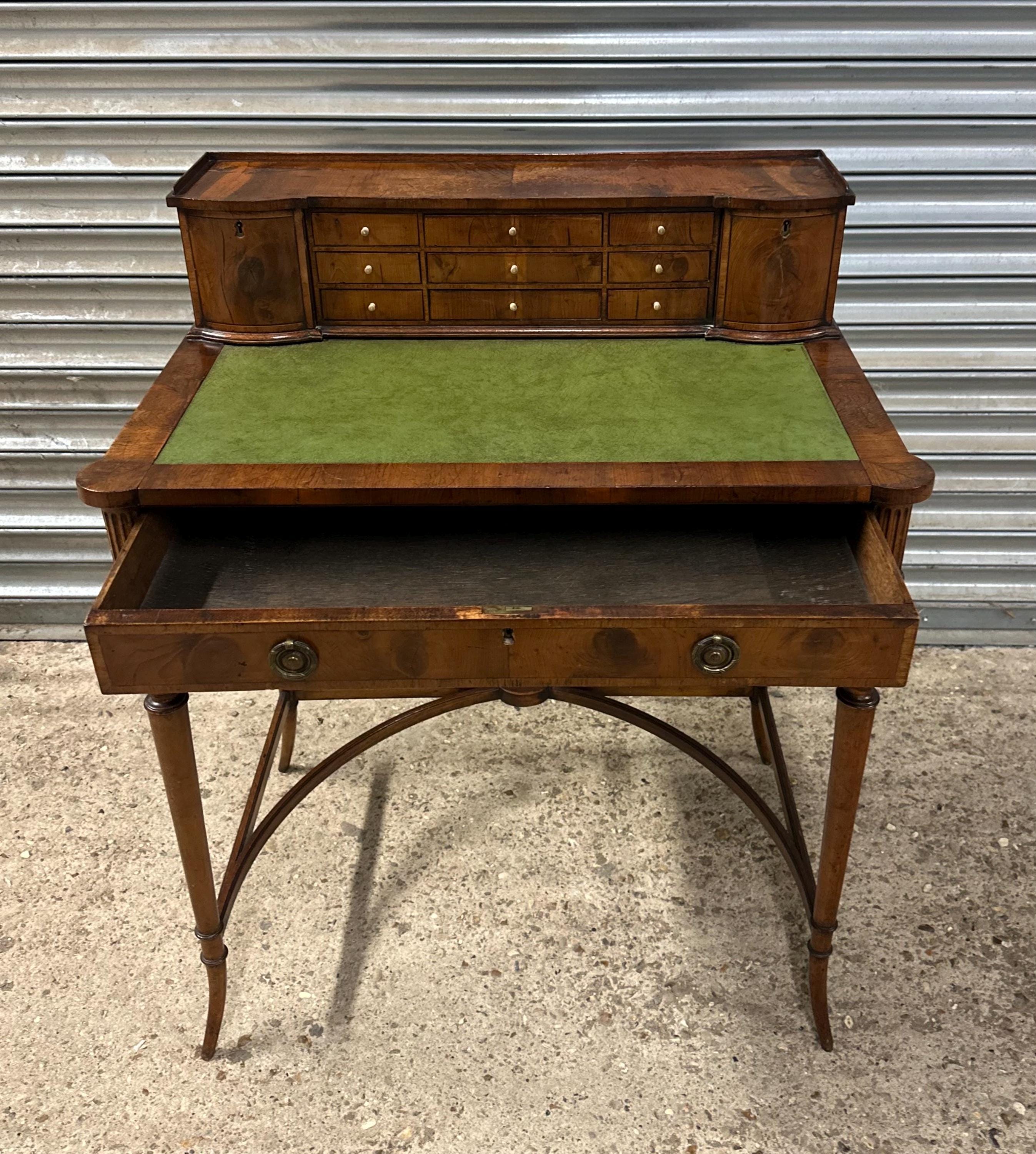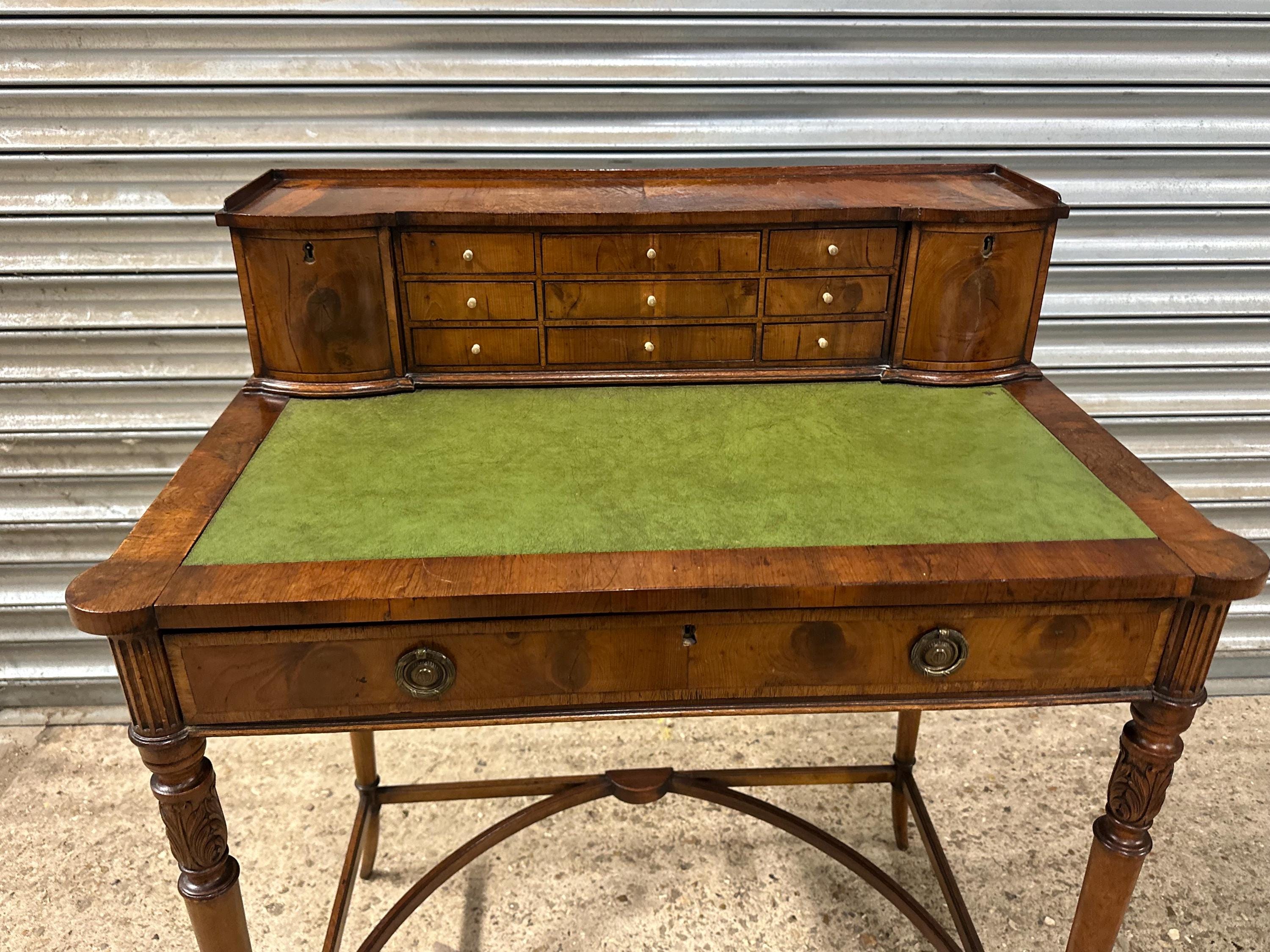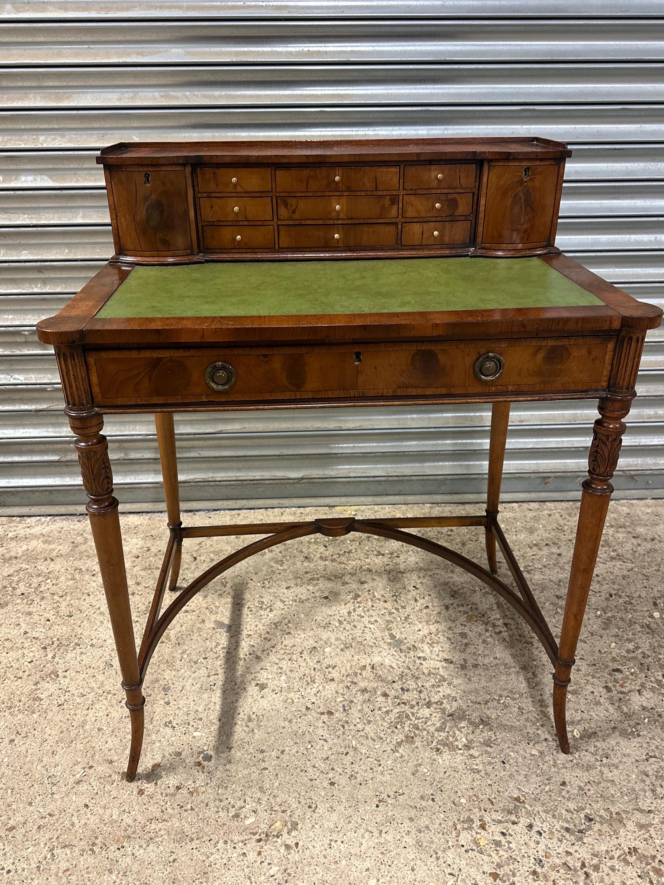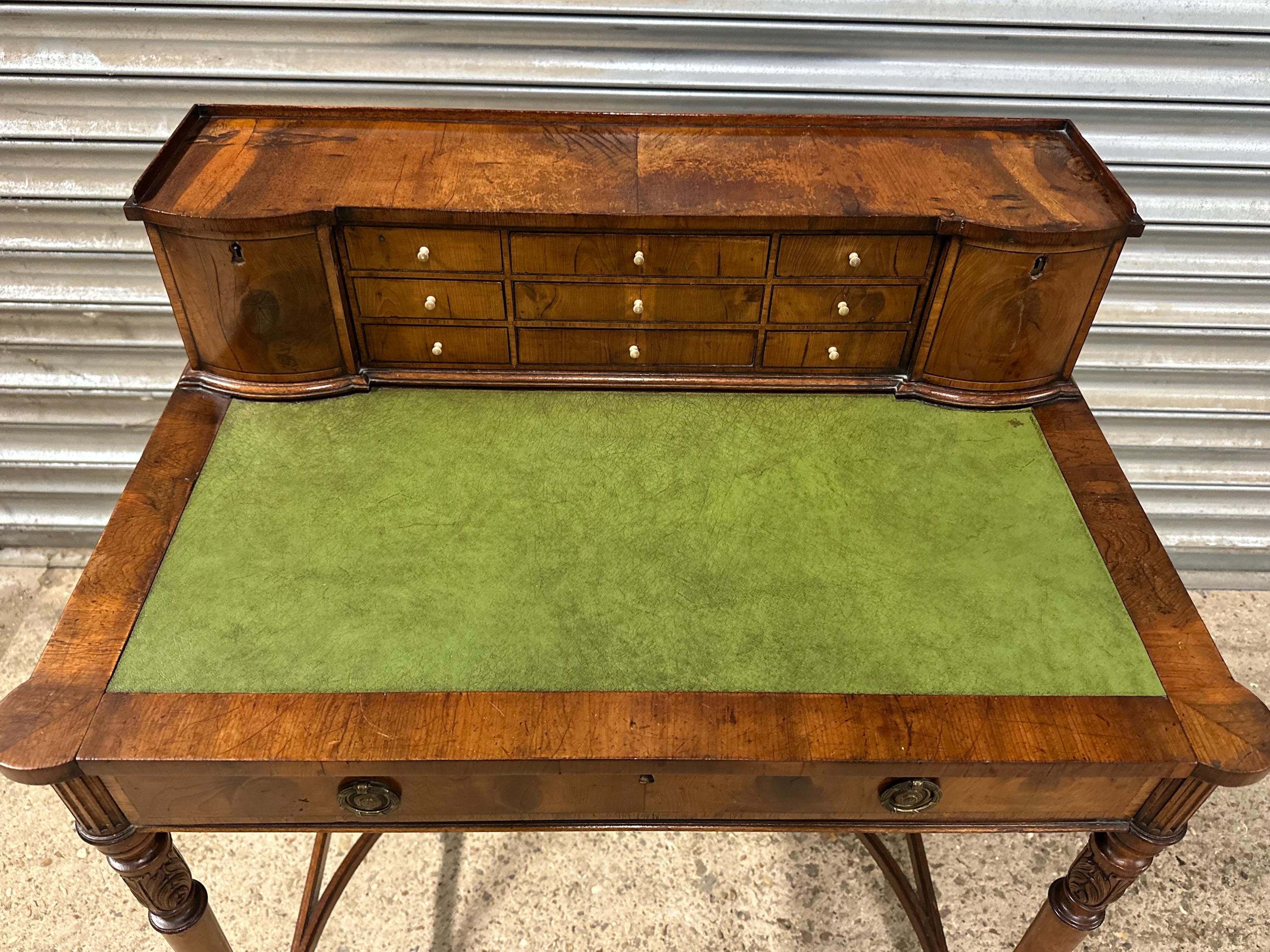 Above the writing surface sits a charming raised superstructure, designed with a shallow gallery and a series of small drawers and cupboards arranged symmetrically around a central bank of drawers. This configuration is typical of refined early 19th-century English desk design, offering both elegance and practical storage.