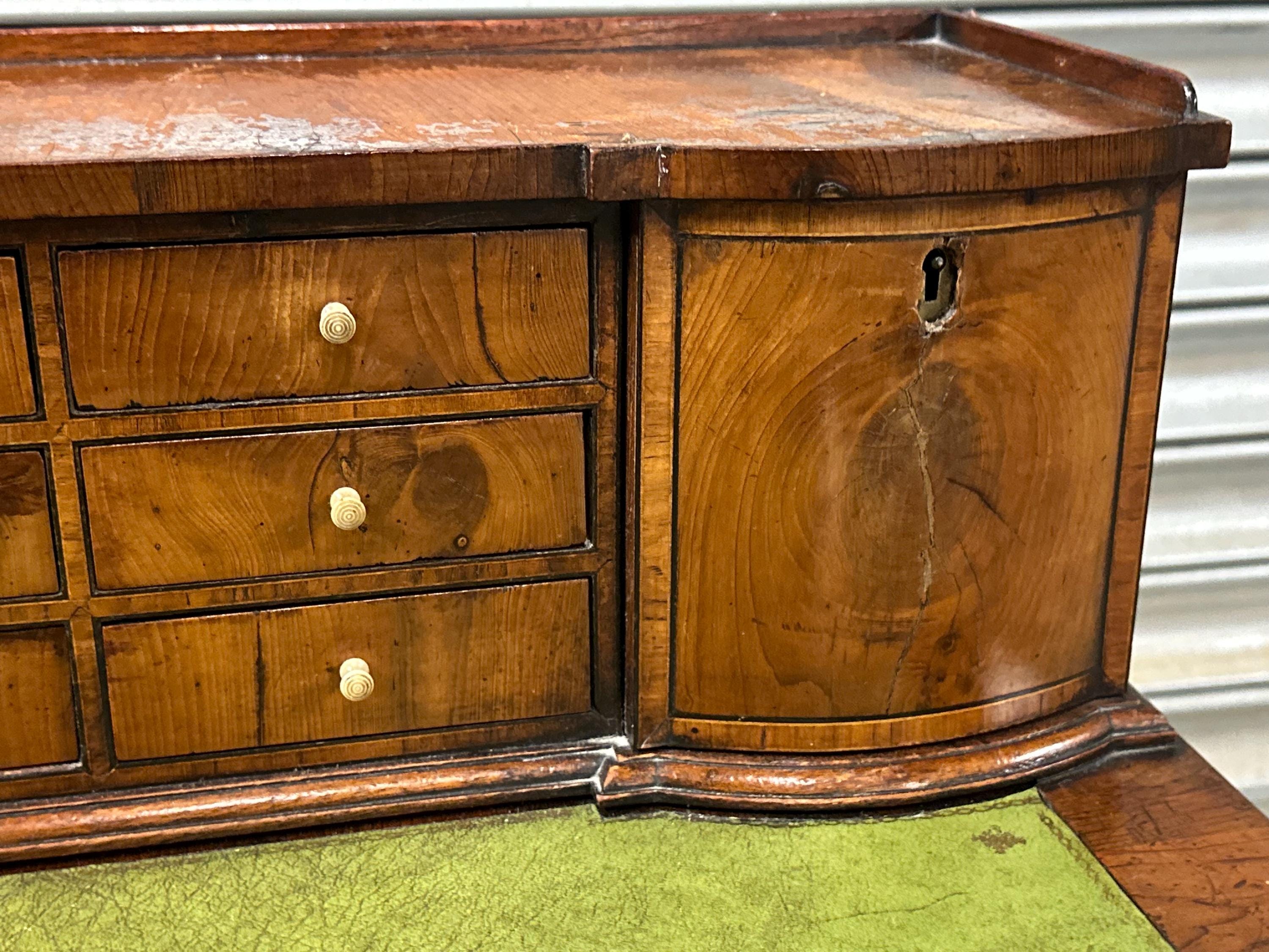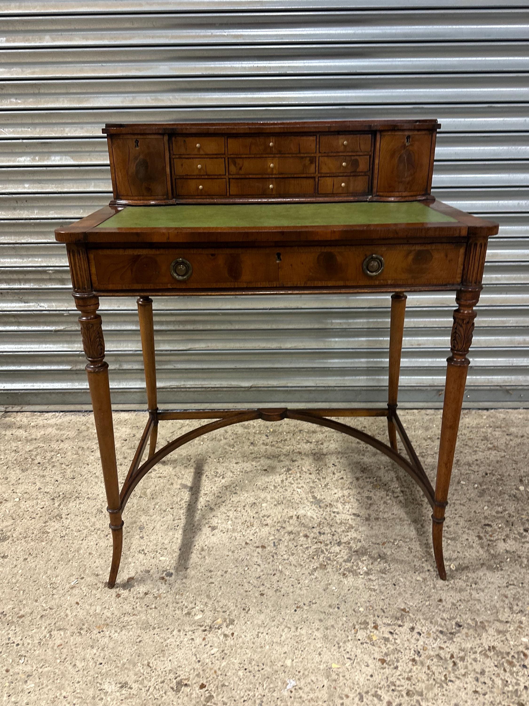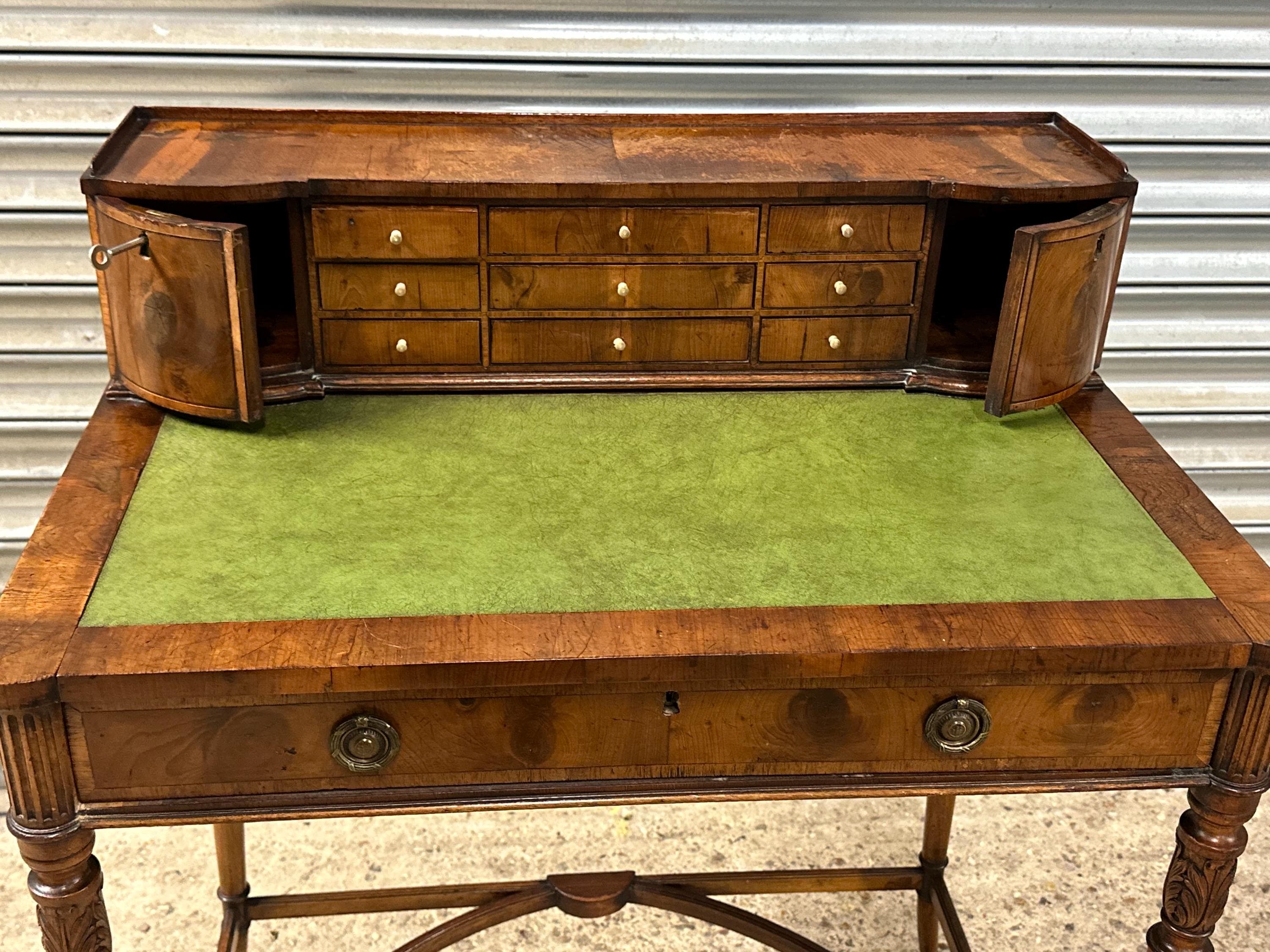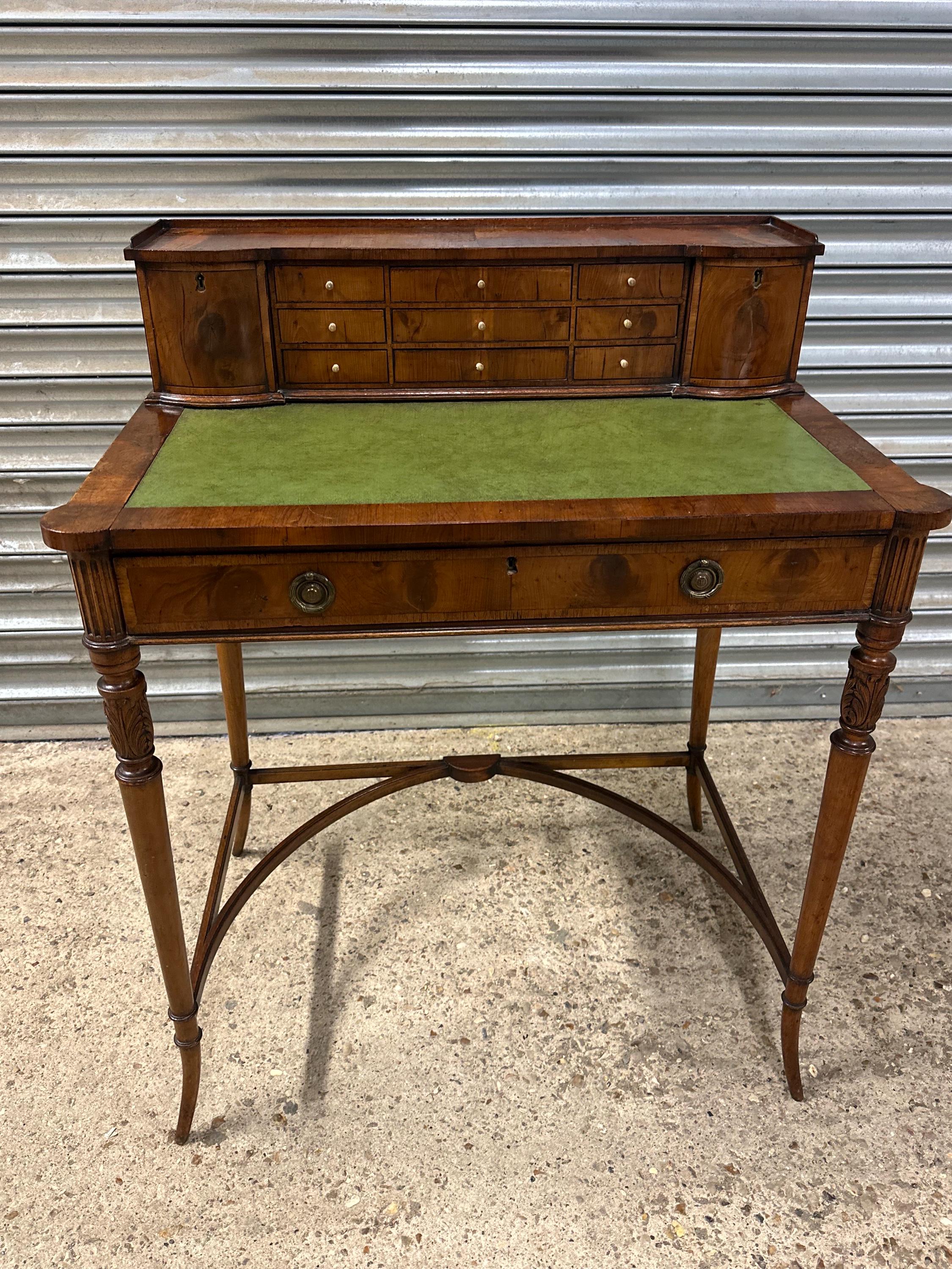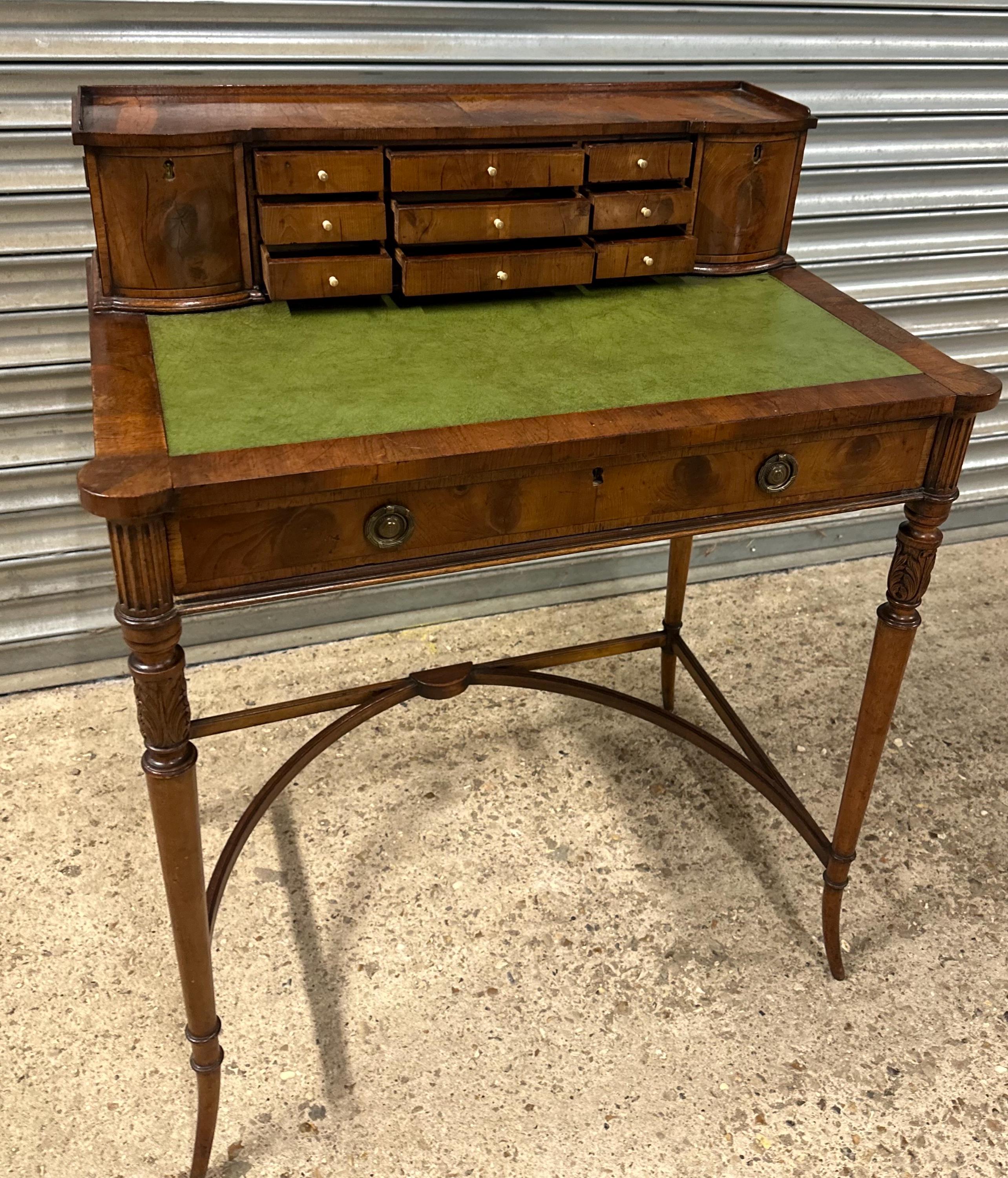 Above the writing surface sits a charming raised superstructure, designed with a shallow gallery and a series of small drawers and cupboards arranged symmetrically around a central bank of drawers. This configuration is typical of refined early 19th-century English desk design, offering both elegance and practical storage.