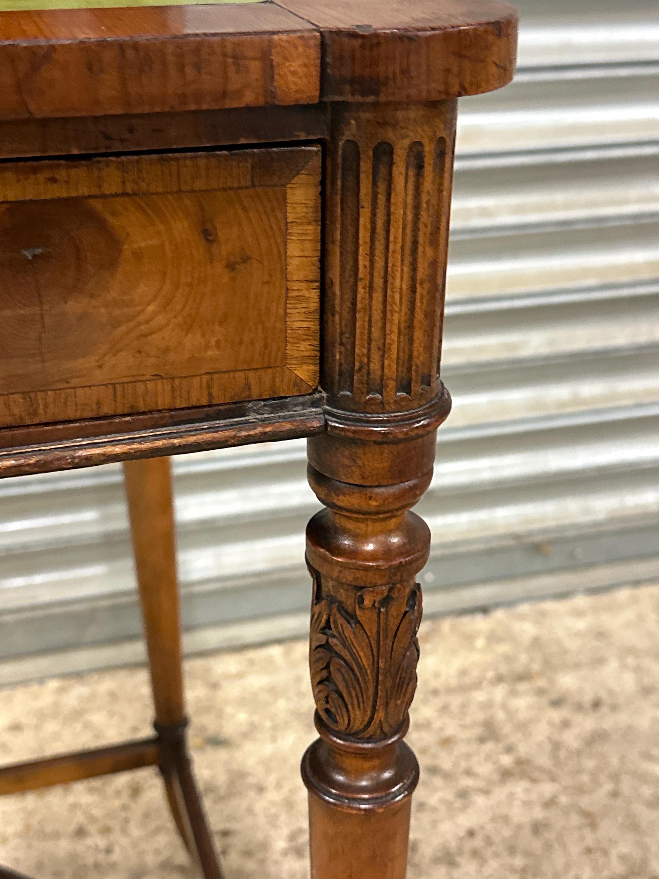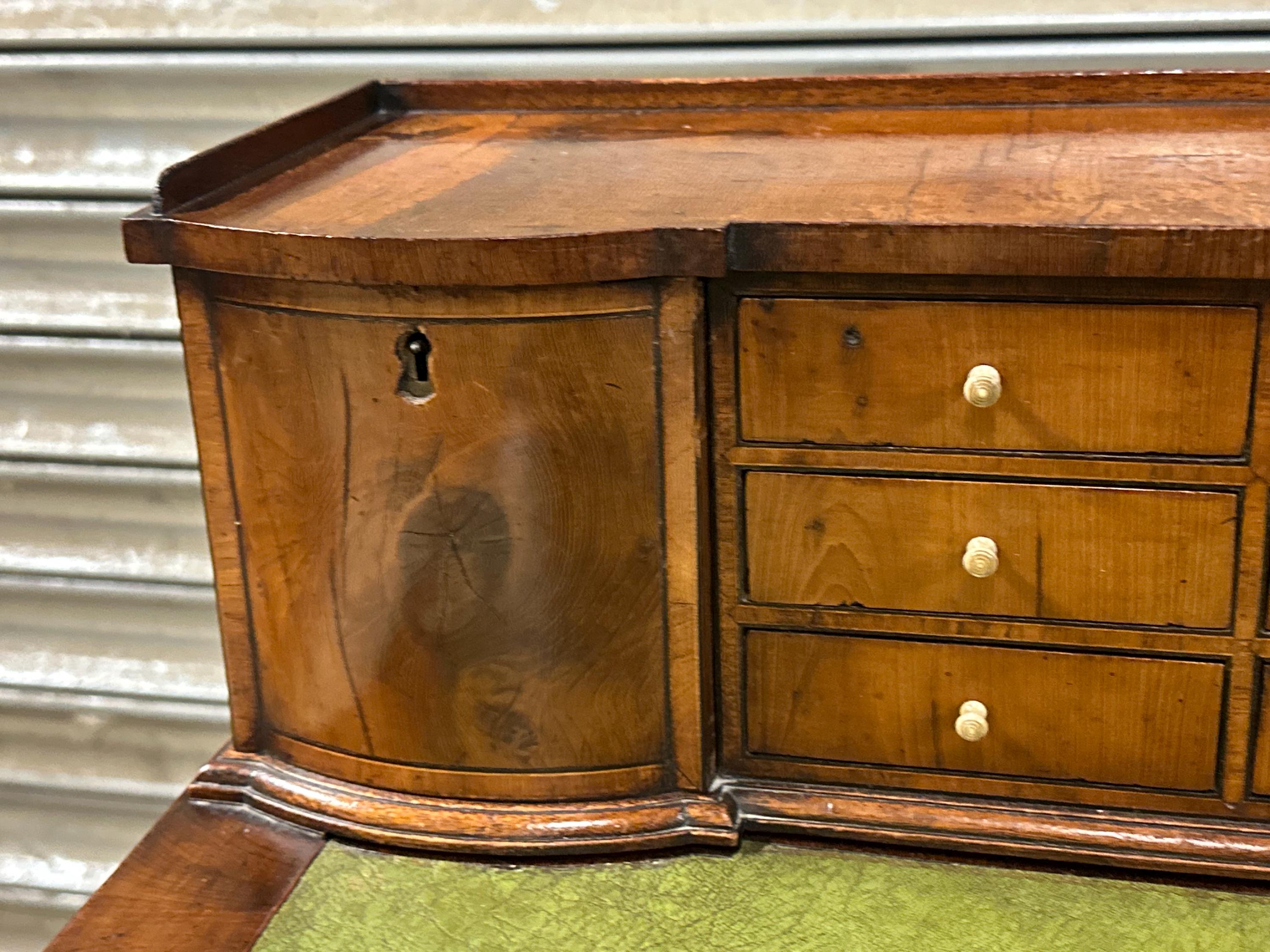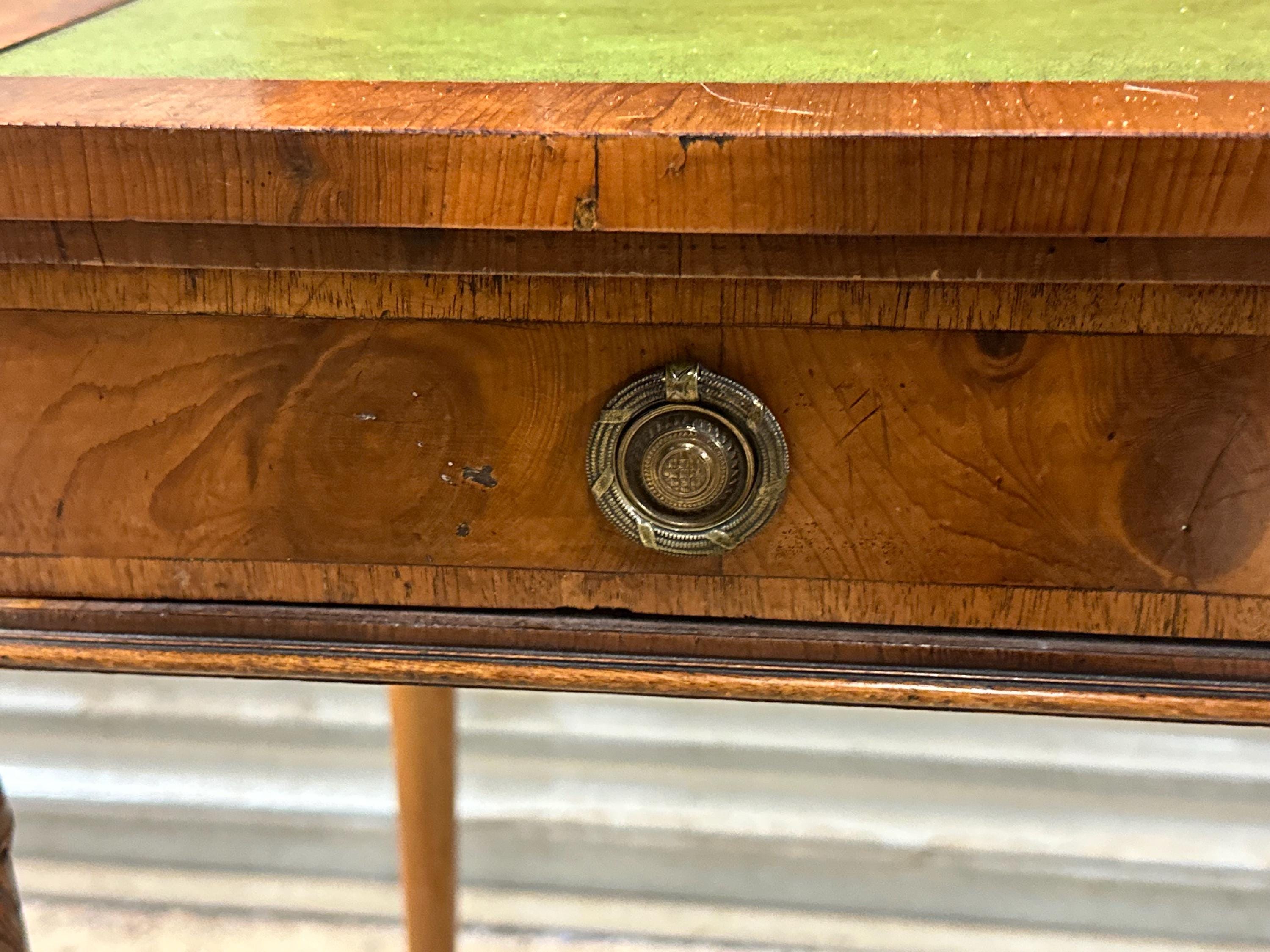 The rectangular top is inset with a green leather writing surface, now displaying a warm aged patina that adds character and authenticity. The top is framed with moulded edges and softly rounded corners, giving the desk a refined and balanced appearance.