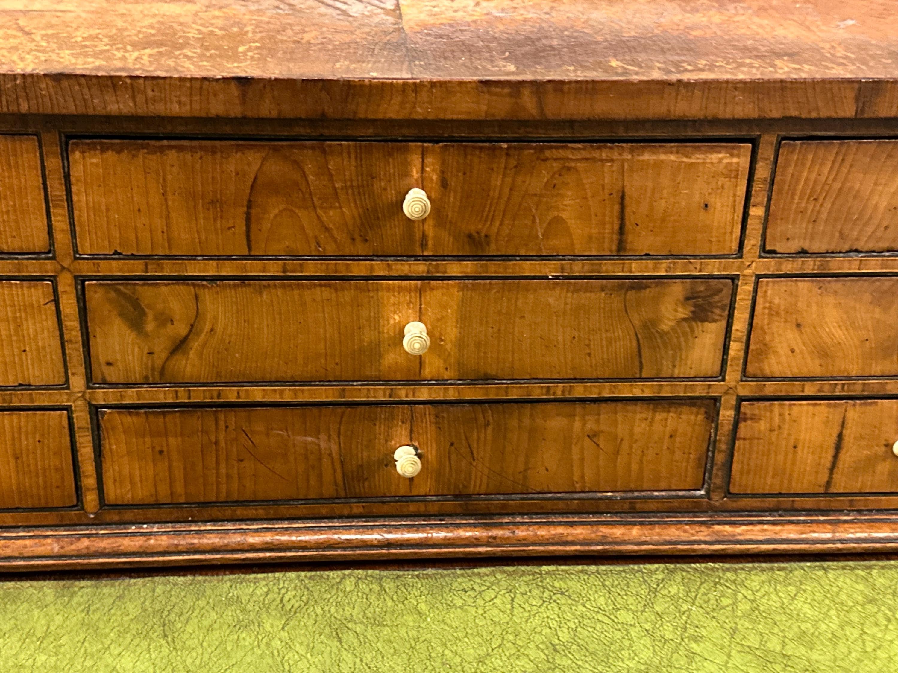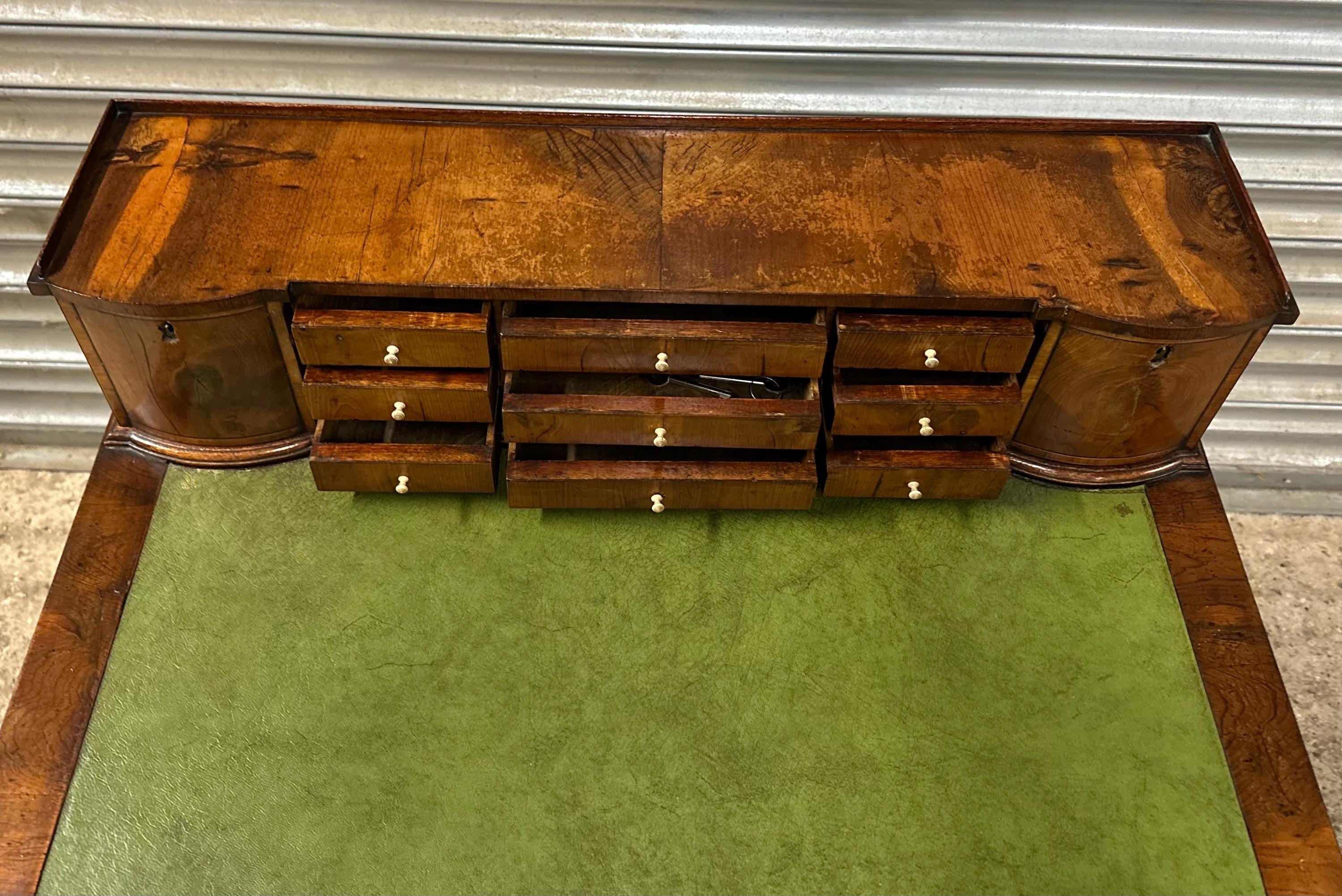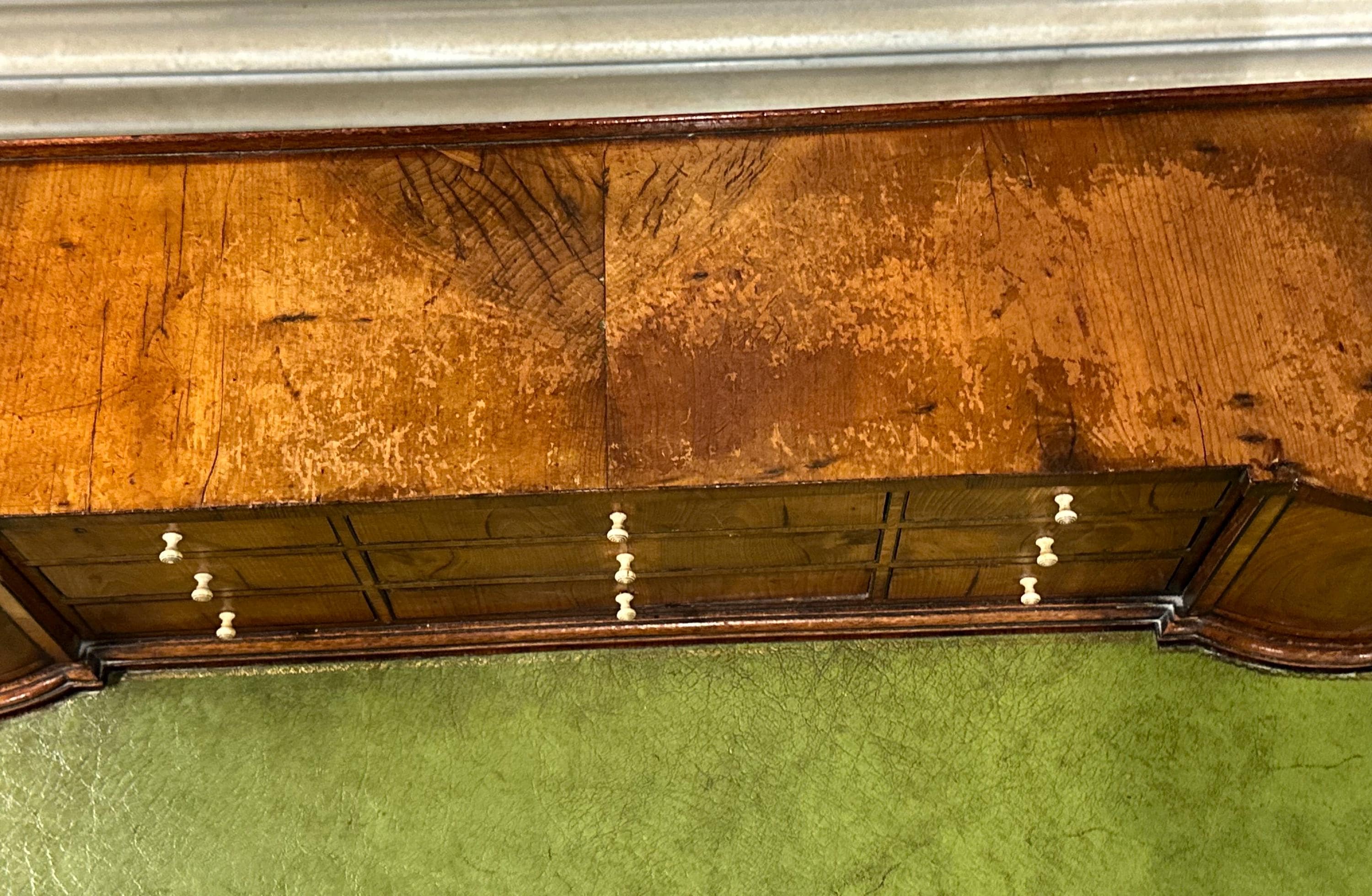 The rectangular top is inset with a green leather writing surface, now displaying a warm aged patina that adds character and authenticity. The top is framed with moulded edges and softly rounded corners, giving the desk a refined and balanced appearance.