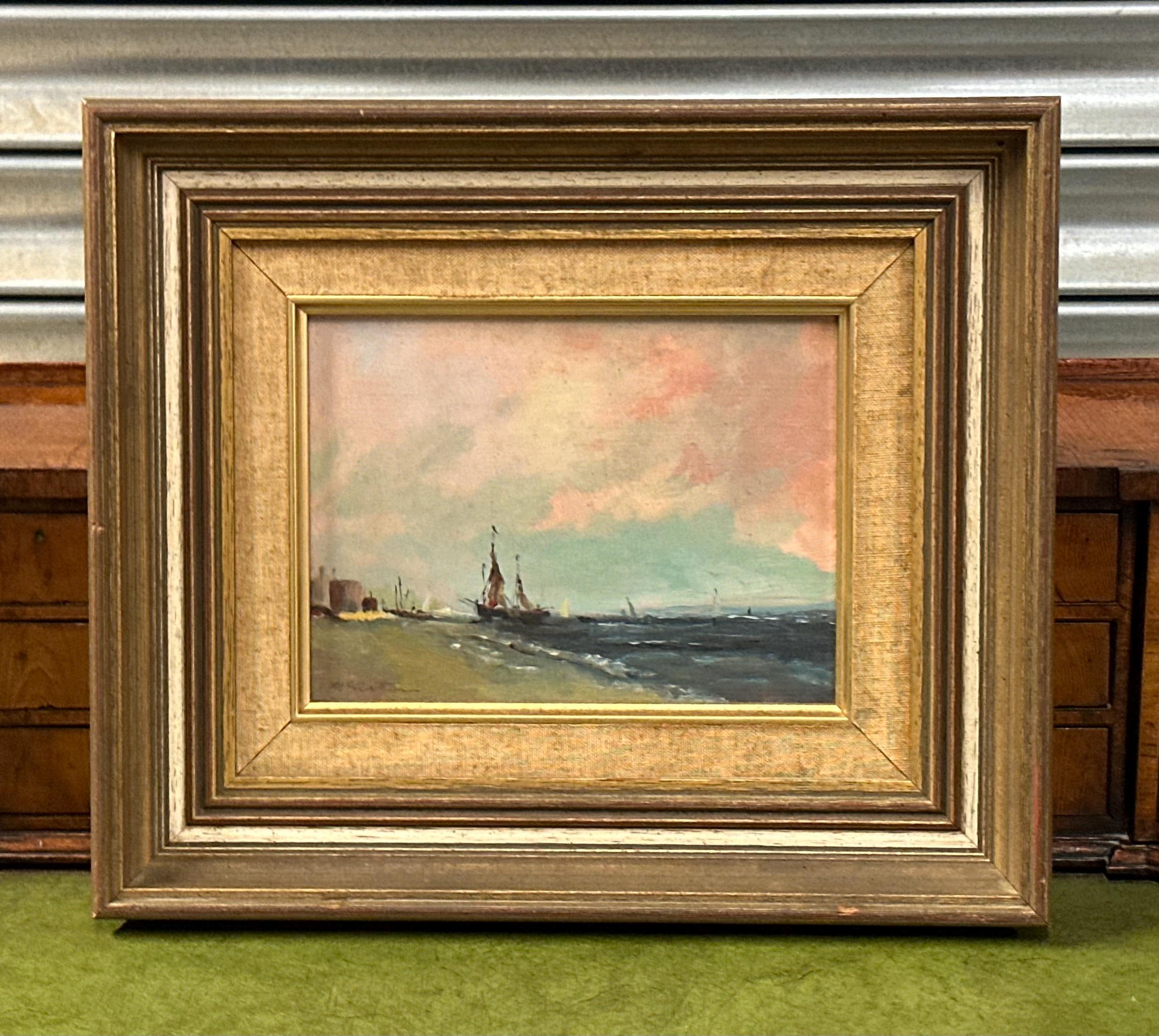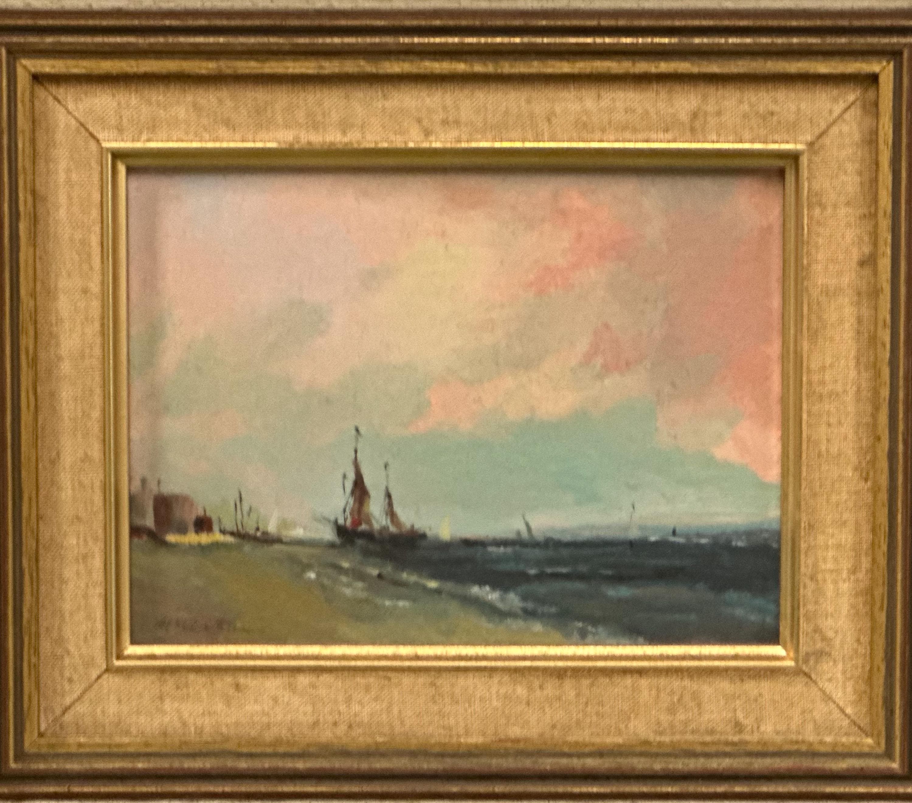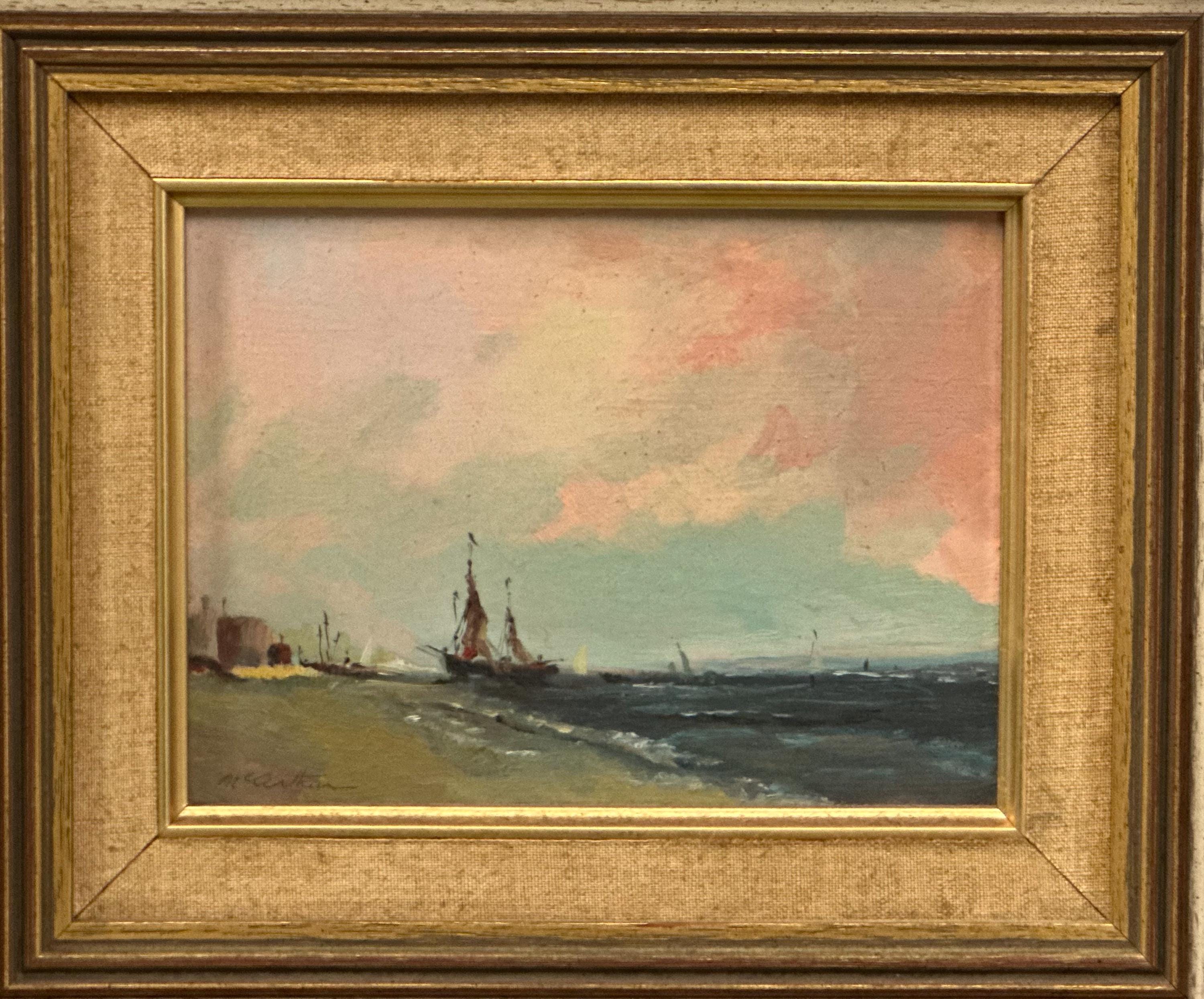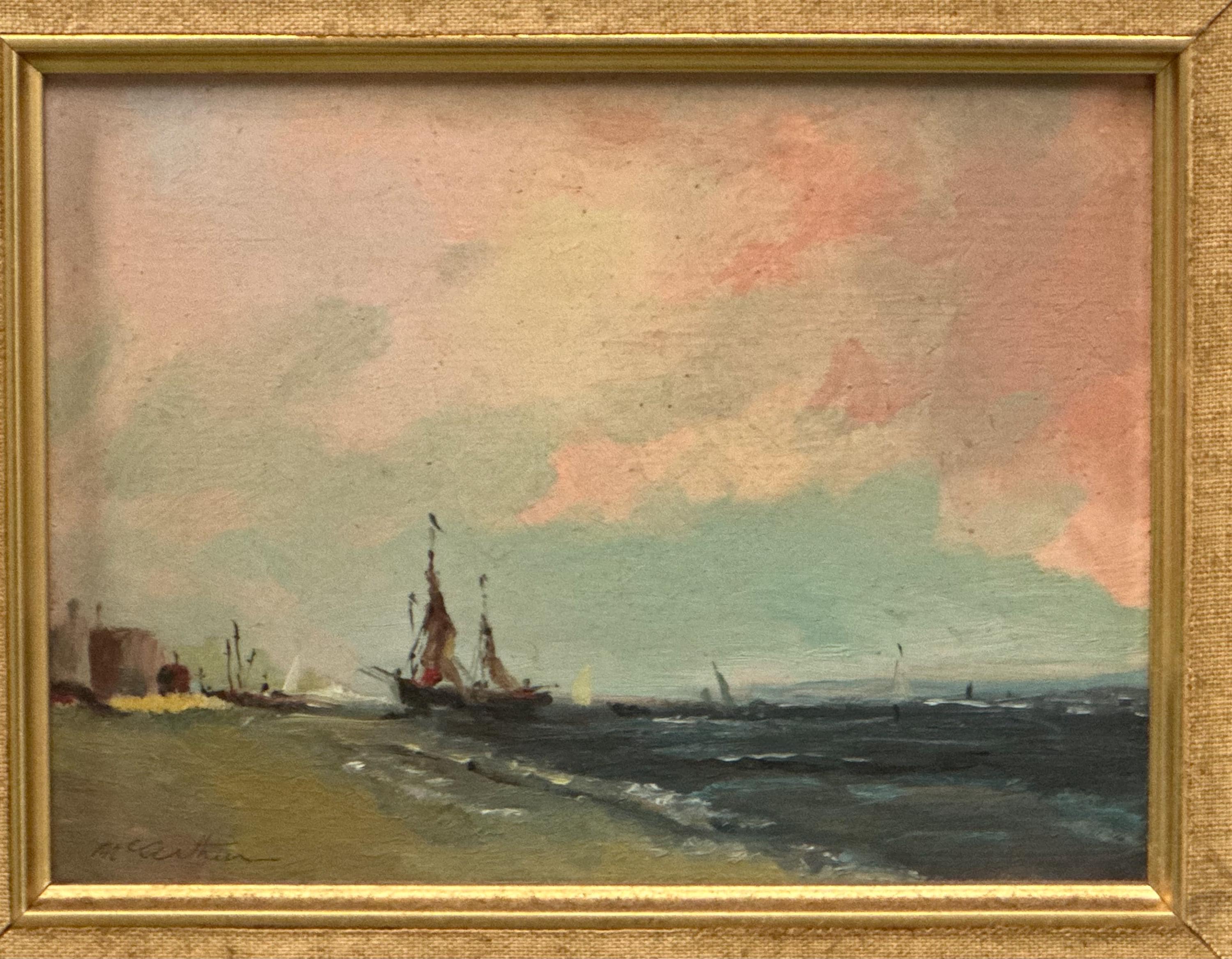 A charming original oil on board coastal seascape by the British artist Thomas McArthur (1915–1993). The painting captures a peaceful shoreline scene with fishing boats resting near the water’s edge, set beneath a soft pastel sky with subtle pink and blue tones. The gentle movement of the sea and the distant harbour structures give the work a wonderfully atmospheric and impressionistic quality.