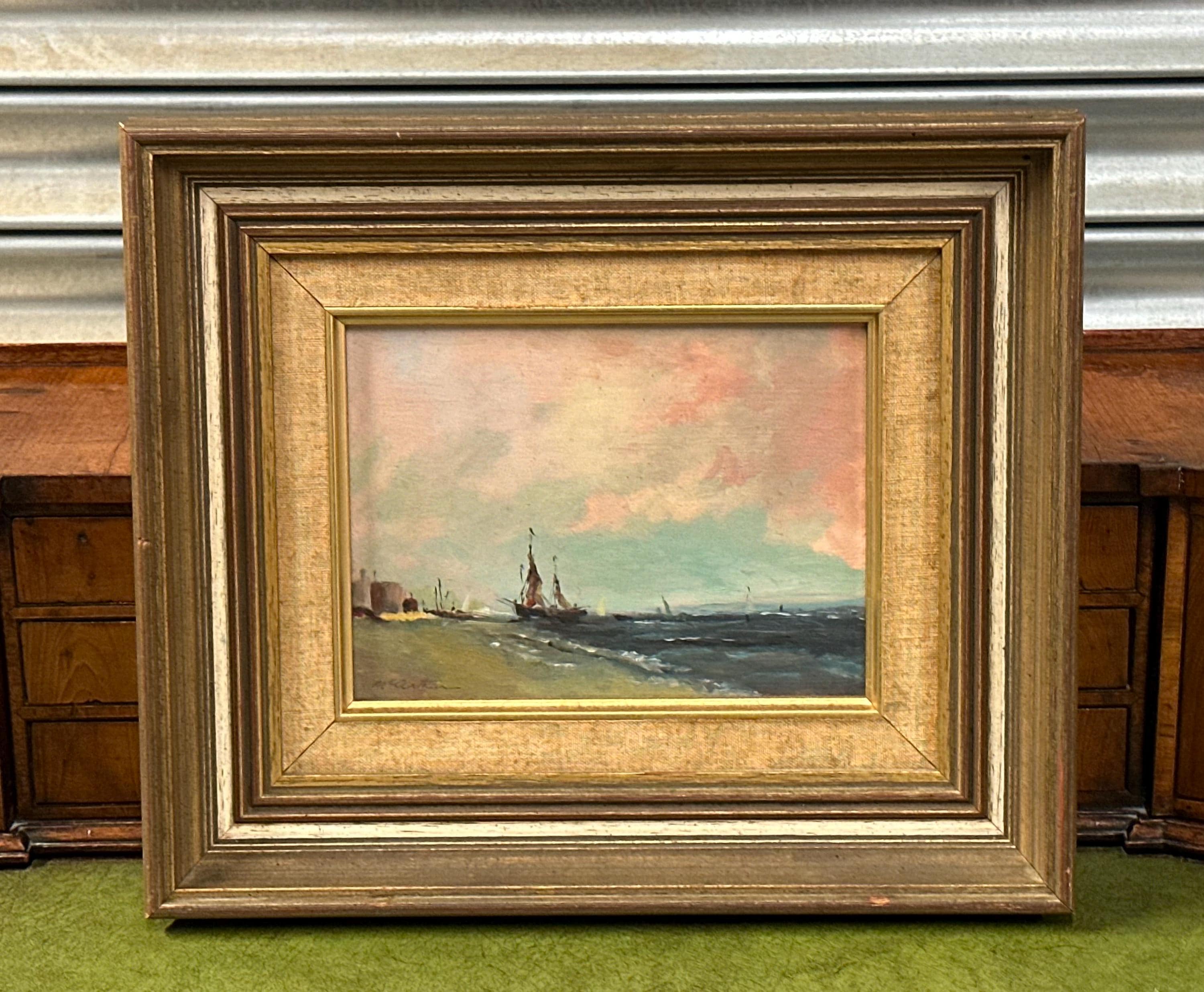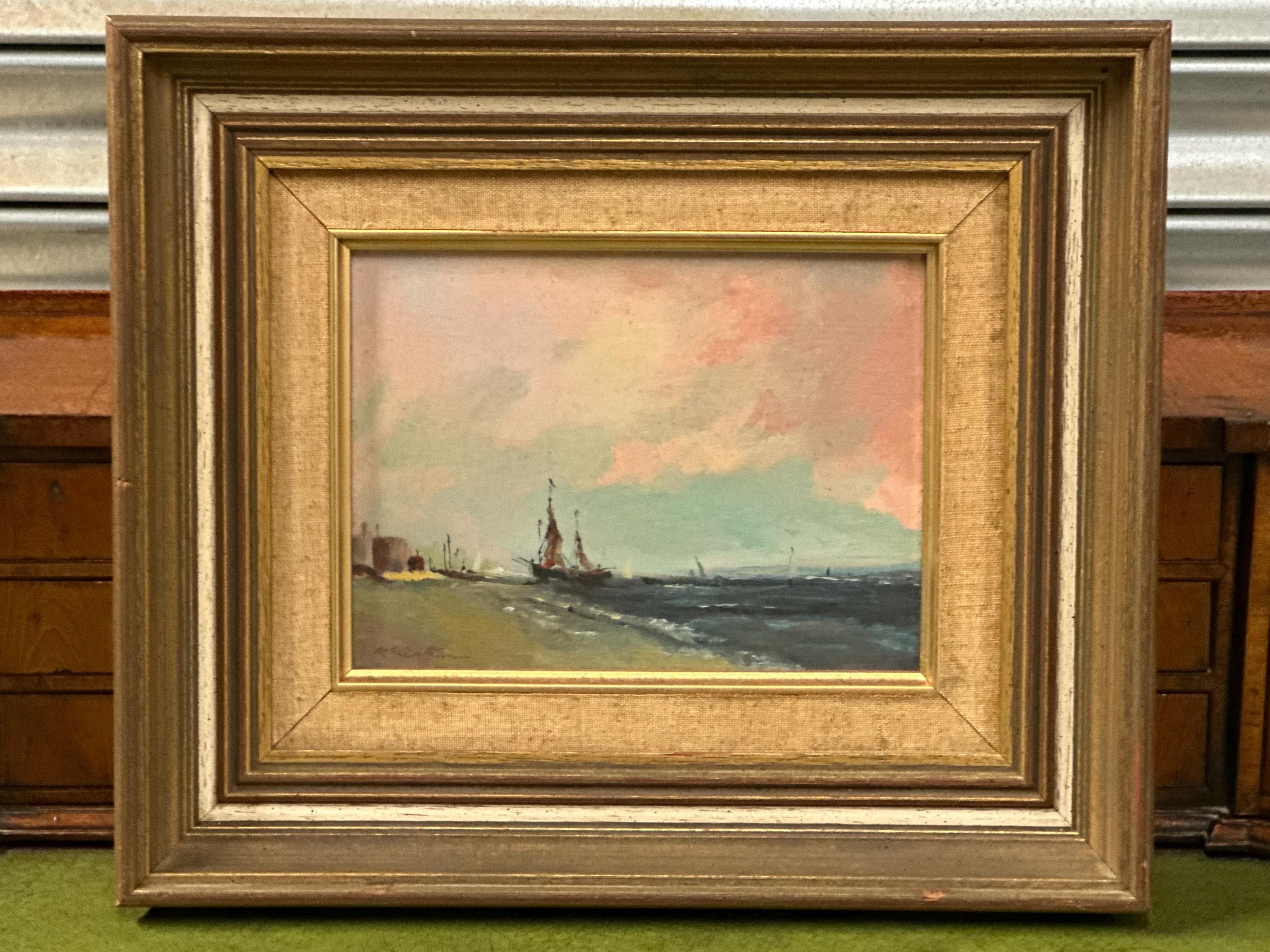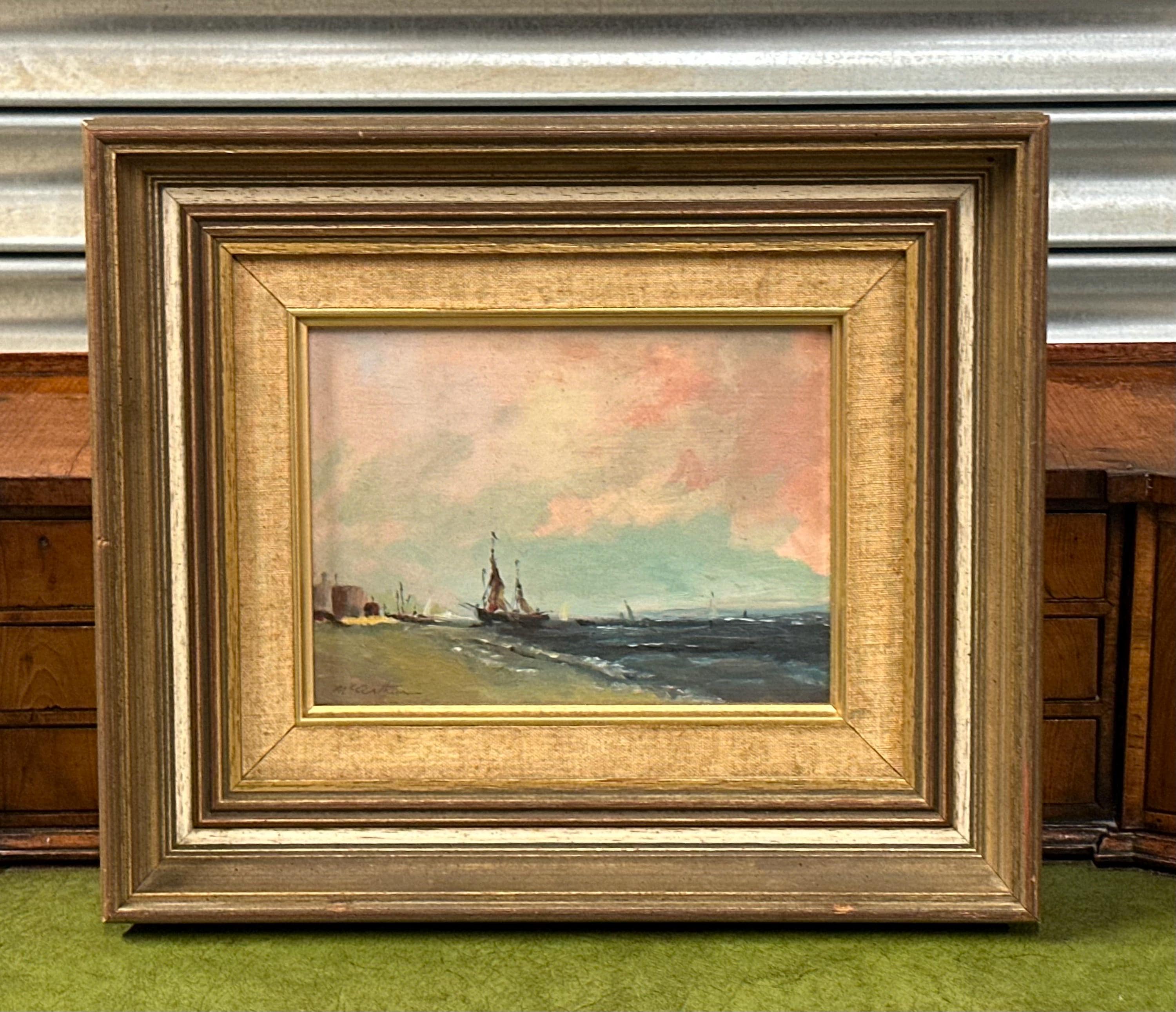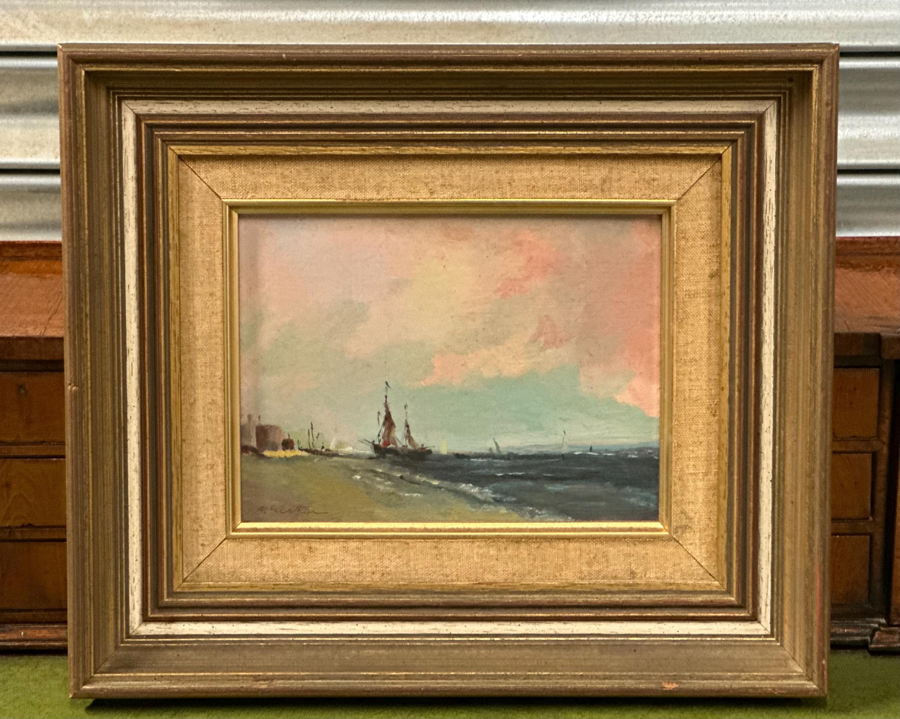 A charming original oil on board coastal seascape by the British artist Thomas McArthur (1915–1993). The painting captures a peaceful shoreline scene with fishing boats resting near the water’s edge, set beneath a soft pastel sky with subtle pink and blue tones. The gentle movement of the sea and the distant harbour structures give the work a wonderfully atmospheric and impressionistic quality.
