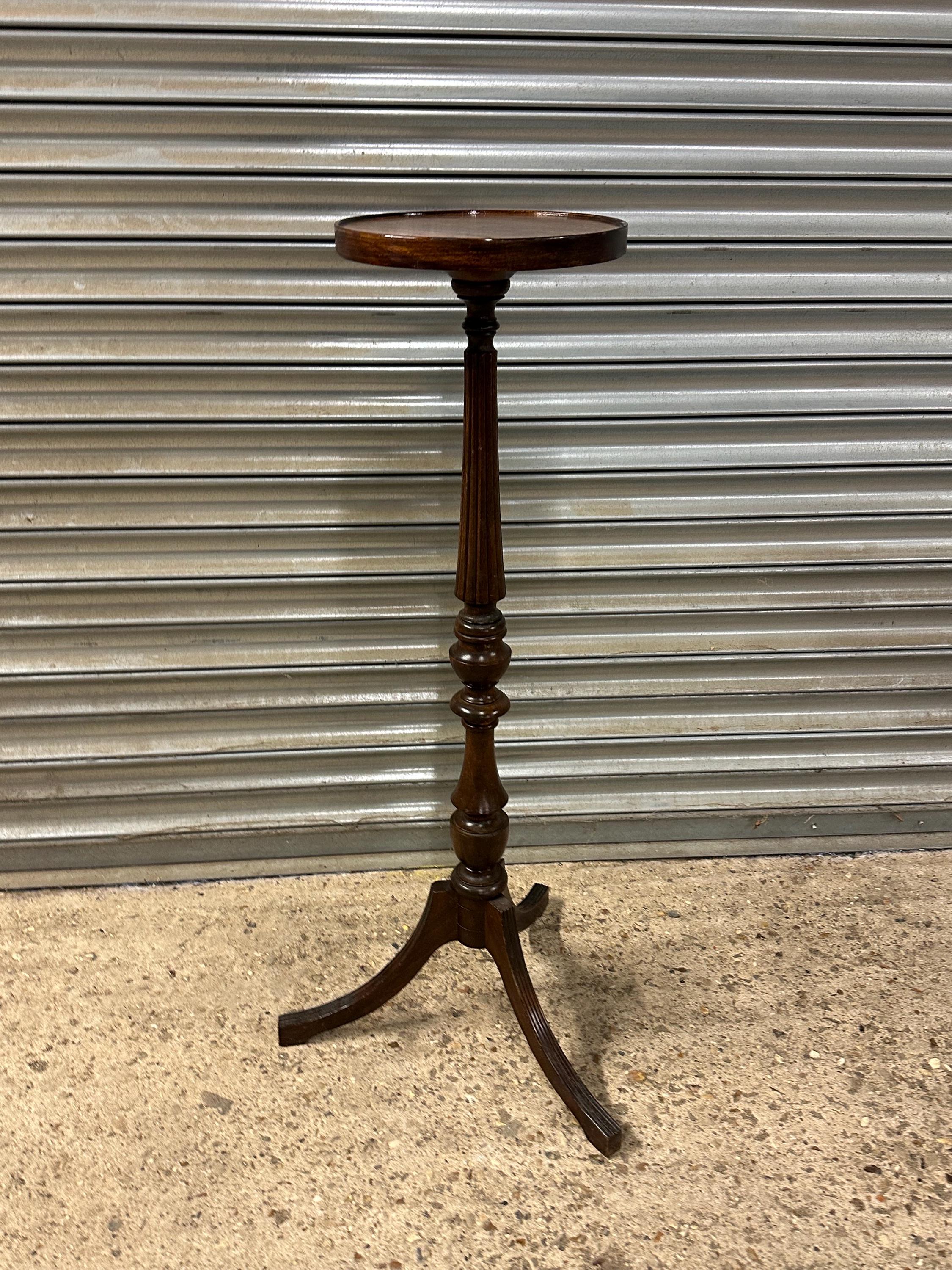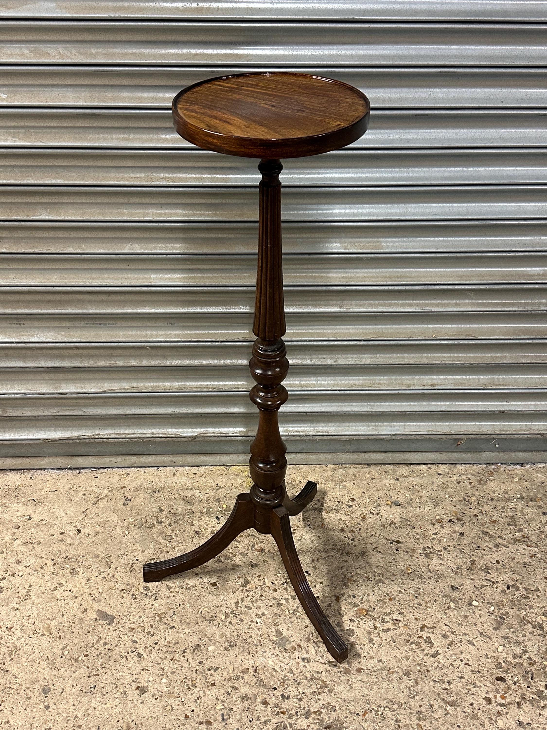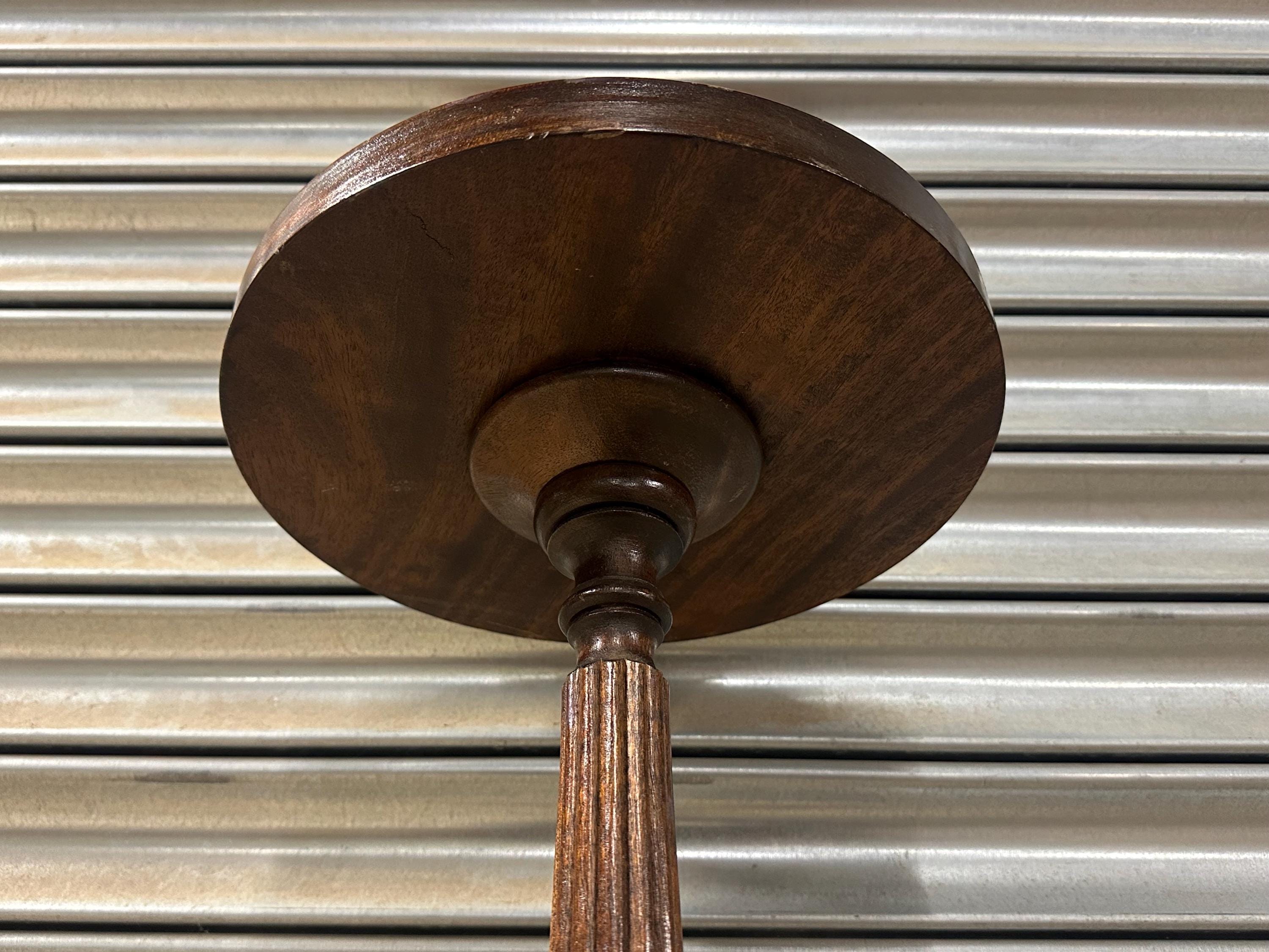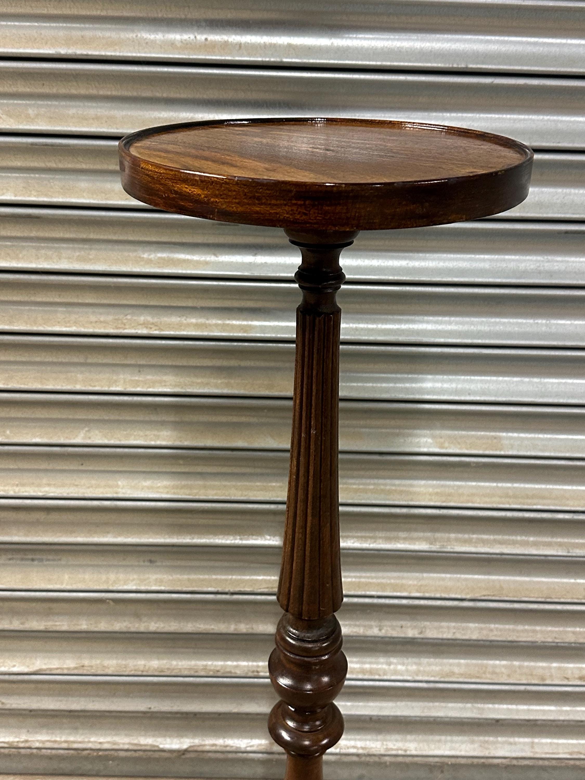 The stand features a circular top with attractive figured mahogany grain, ideal for displaying a plant pot, bust, vase, or decorative object. The top is supported by a slender turned and fluted column, rising from a well-shaped pedestal base.