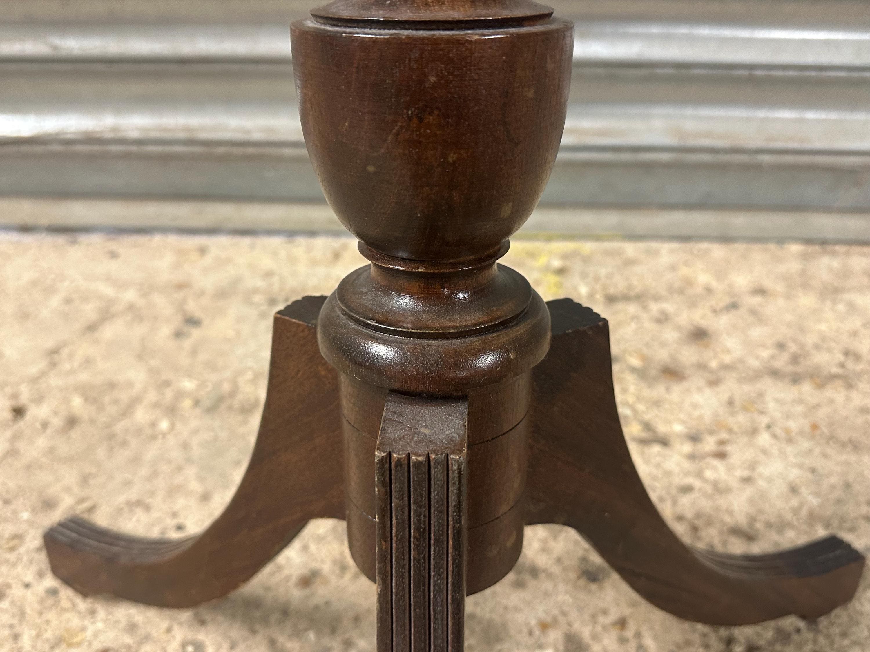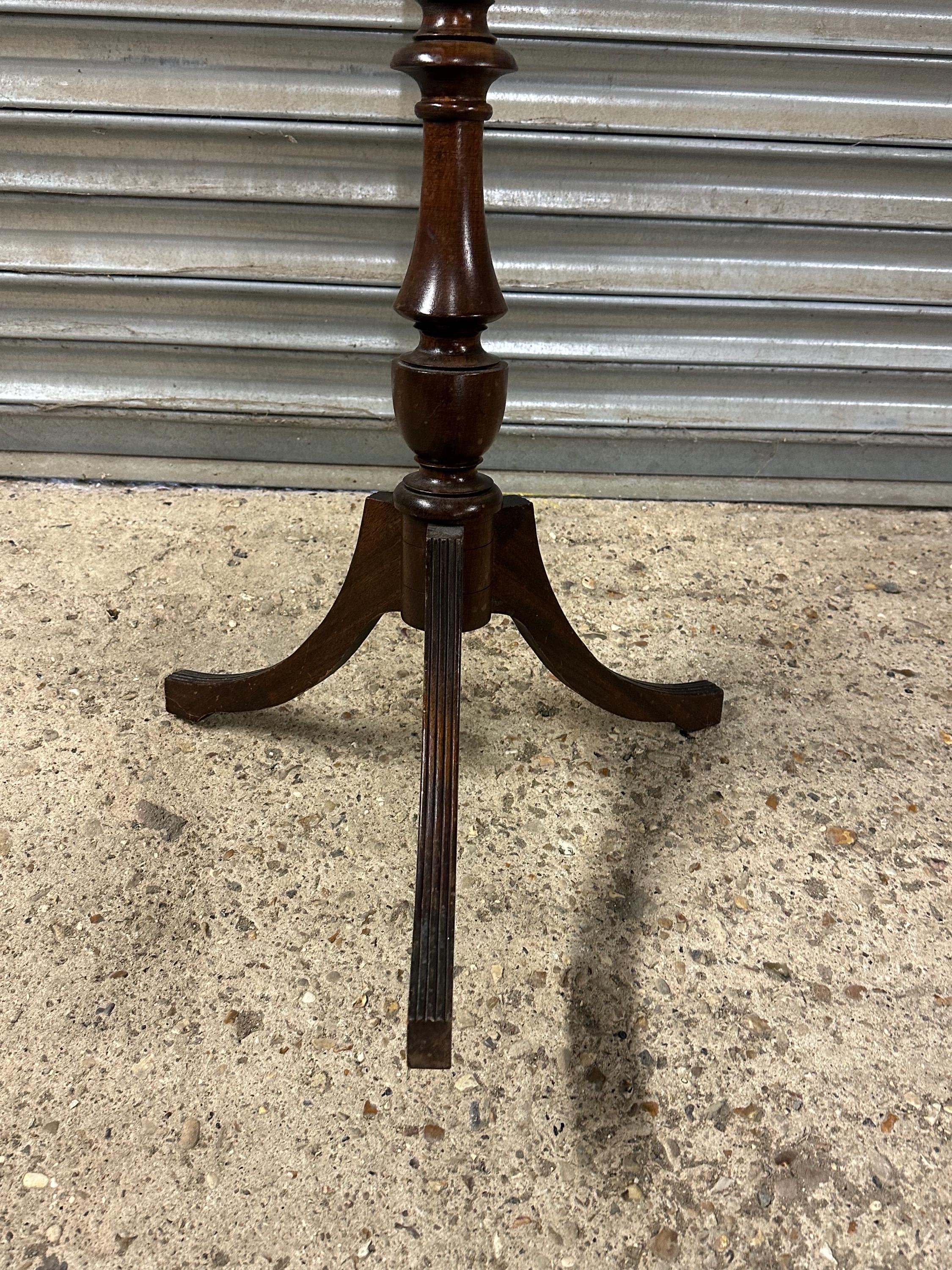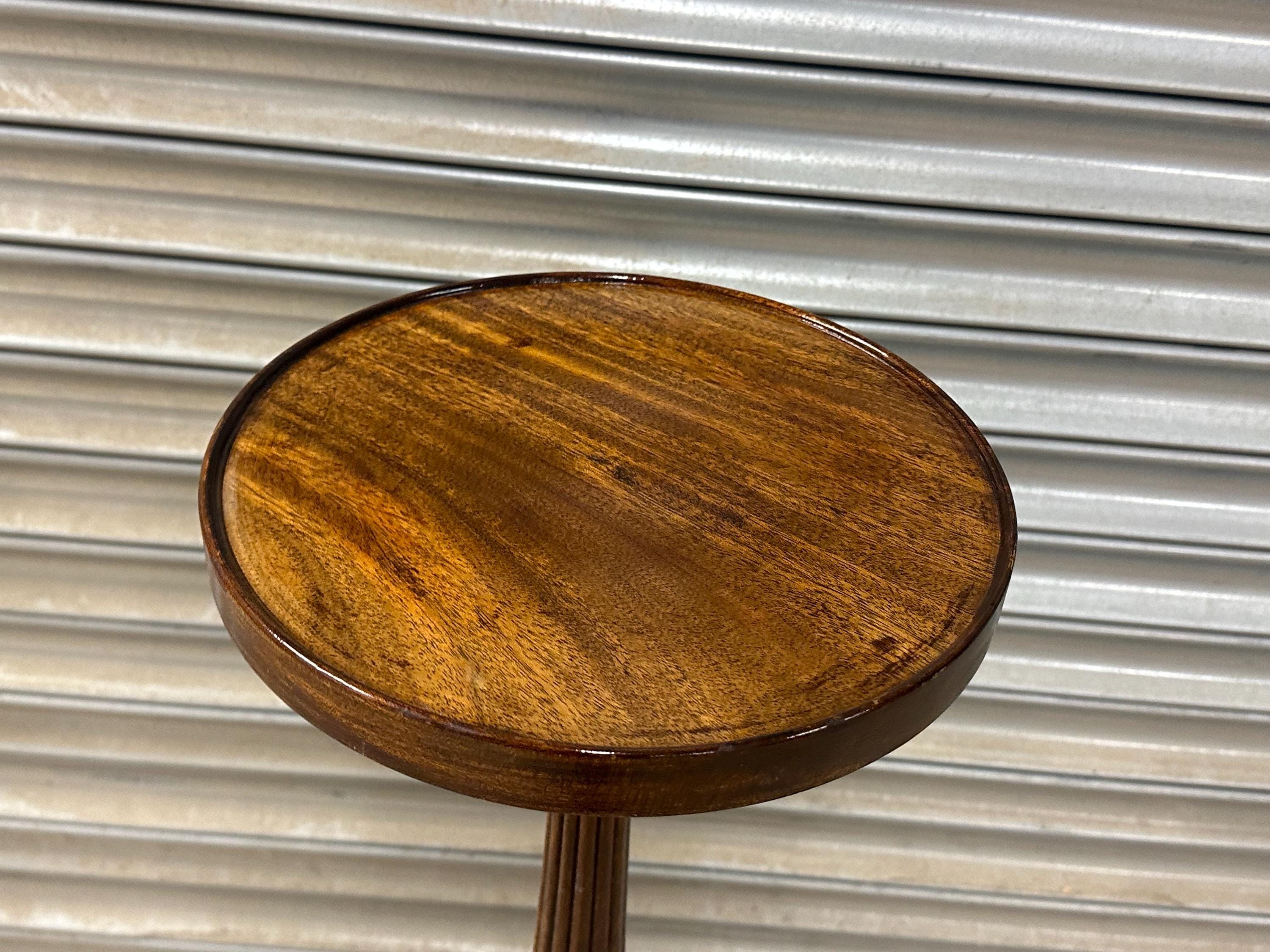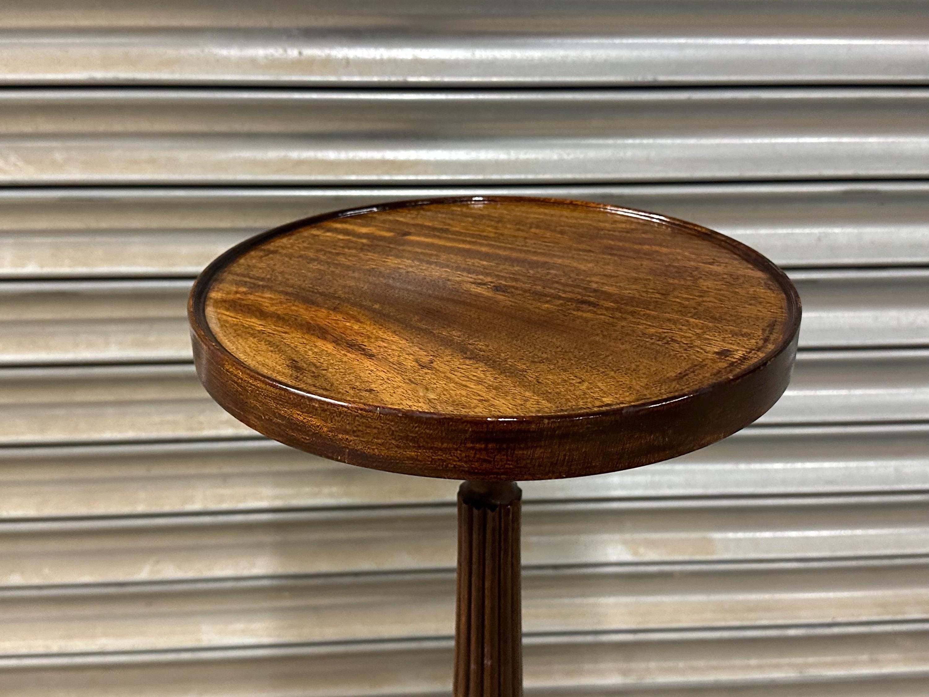 The stand features a circular top with attractive figured mahogany grain, ideal for displaying a plant pot, bust, vase, or decorative object. The top is supported by a slender turned and fluted column, rising from a well-shaped pedestal base.