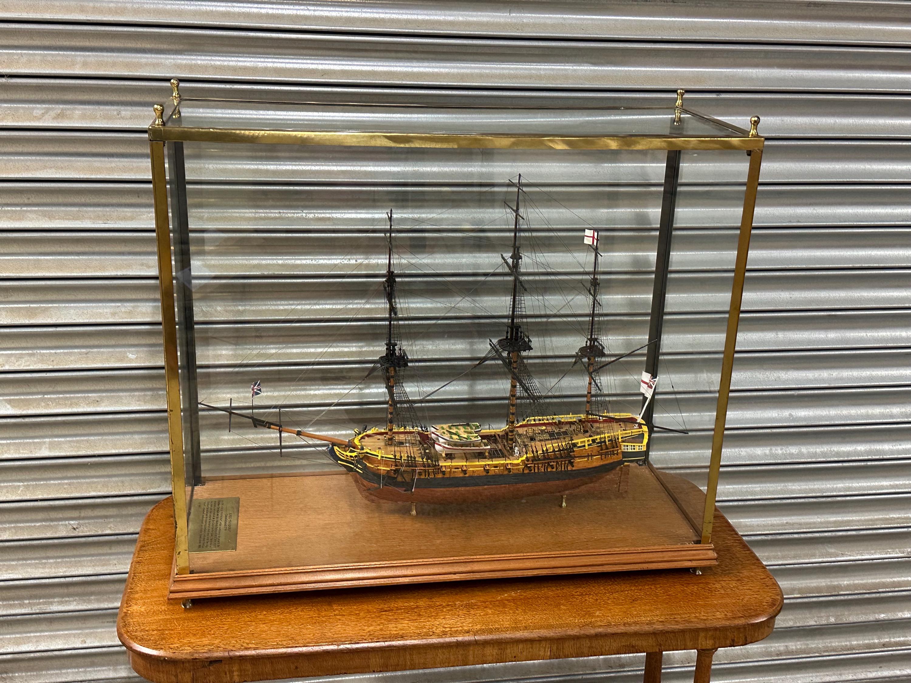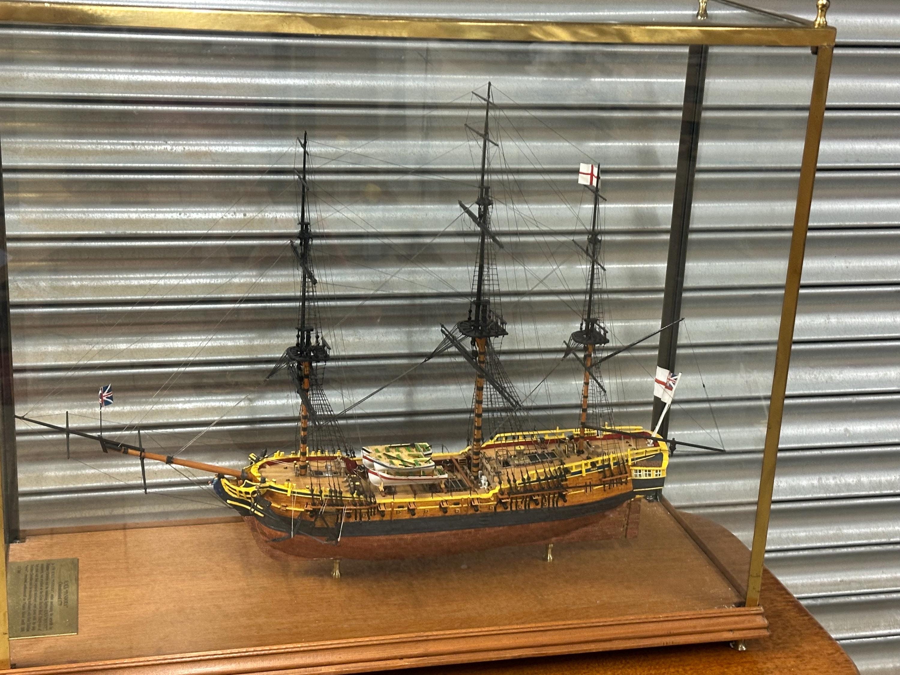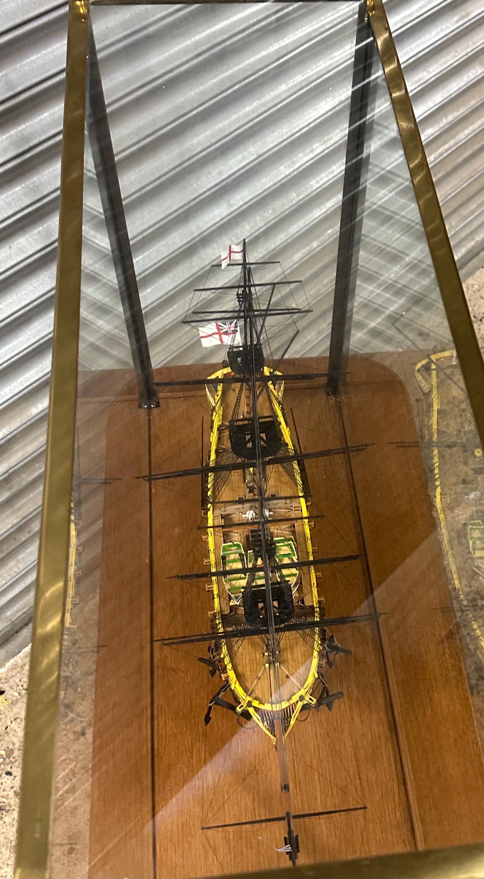 The model sits securely on brass supports within a protective case, helping preserve the delicate rigging and masts while allowing it to be displayed from all angles.