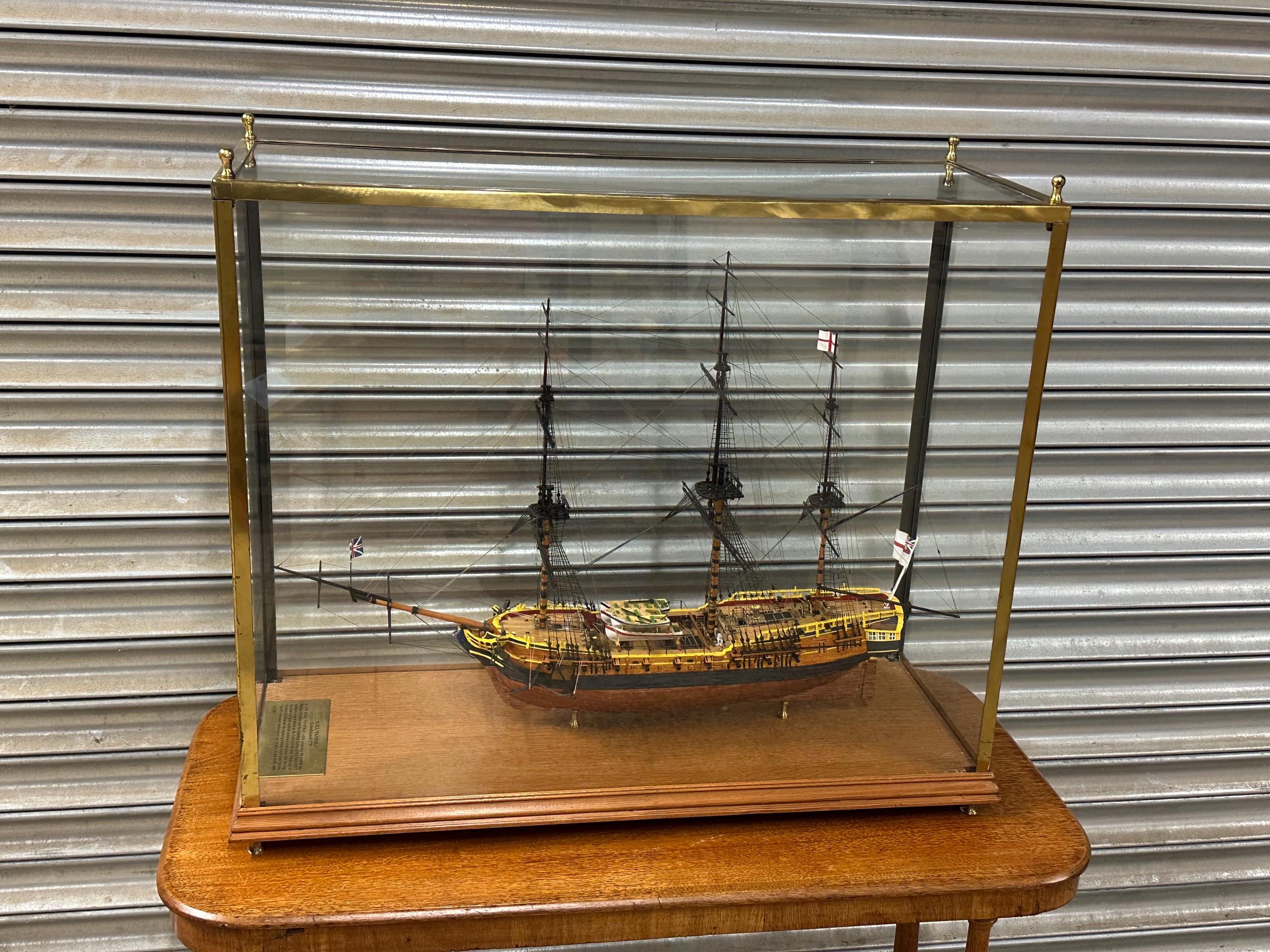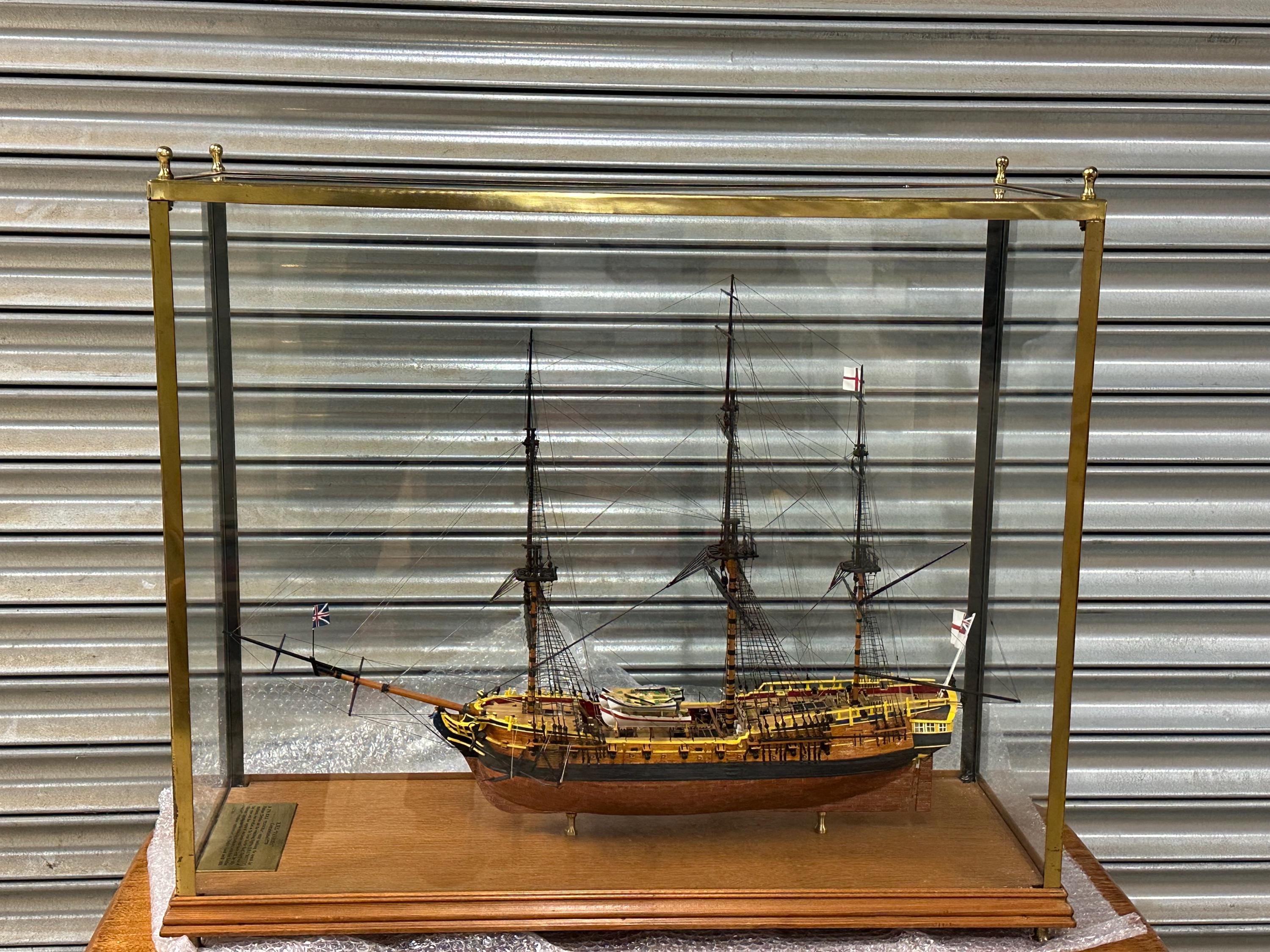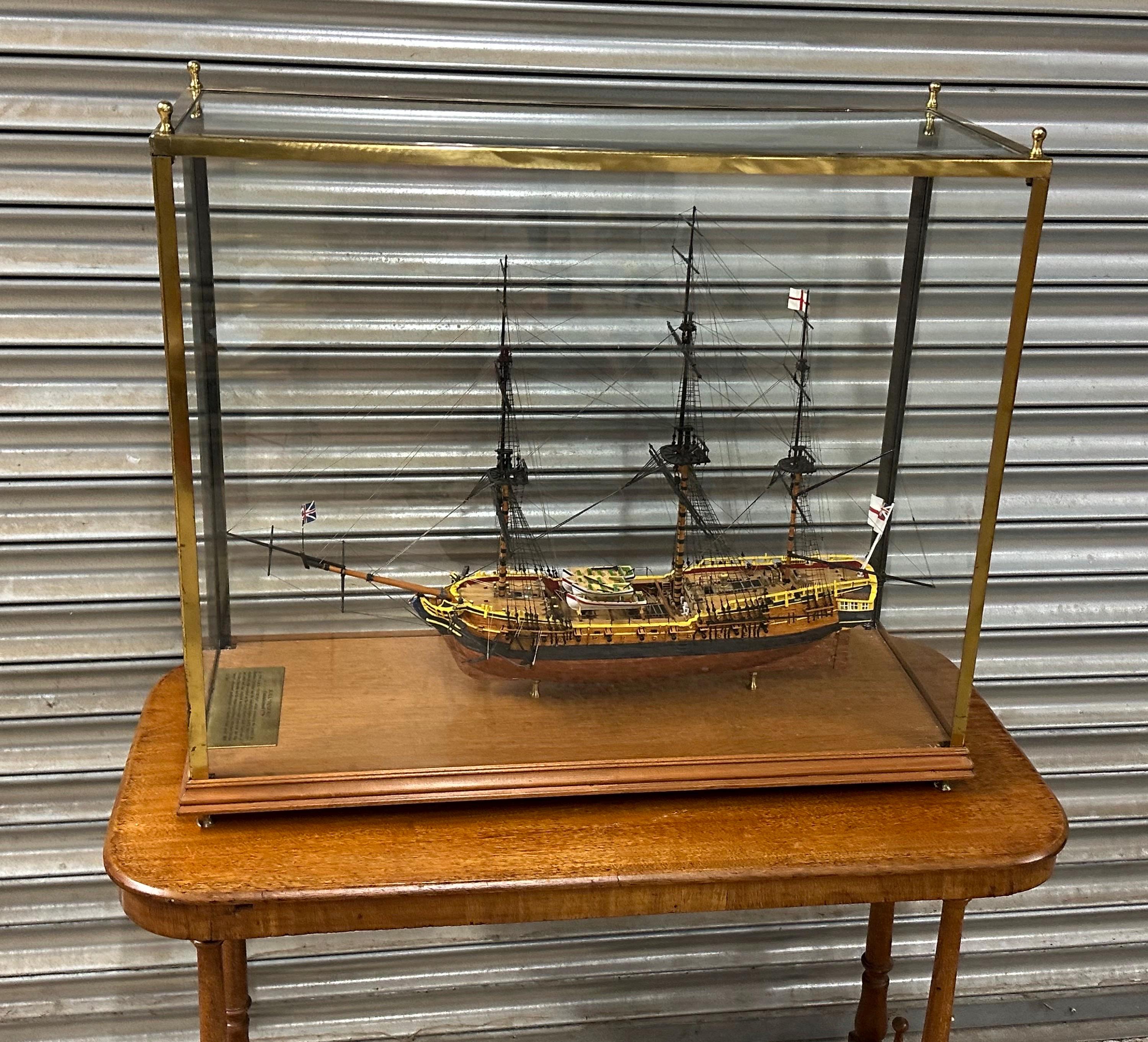 The model sits securely on brass supports within a protective case, helping preserve the delicate rigging and masts while allowing it to be displayed from all angles.