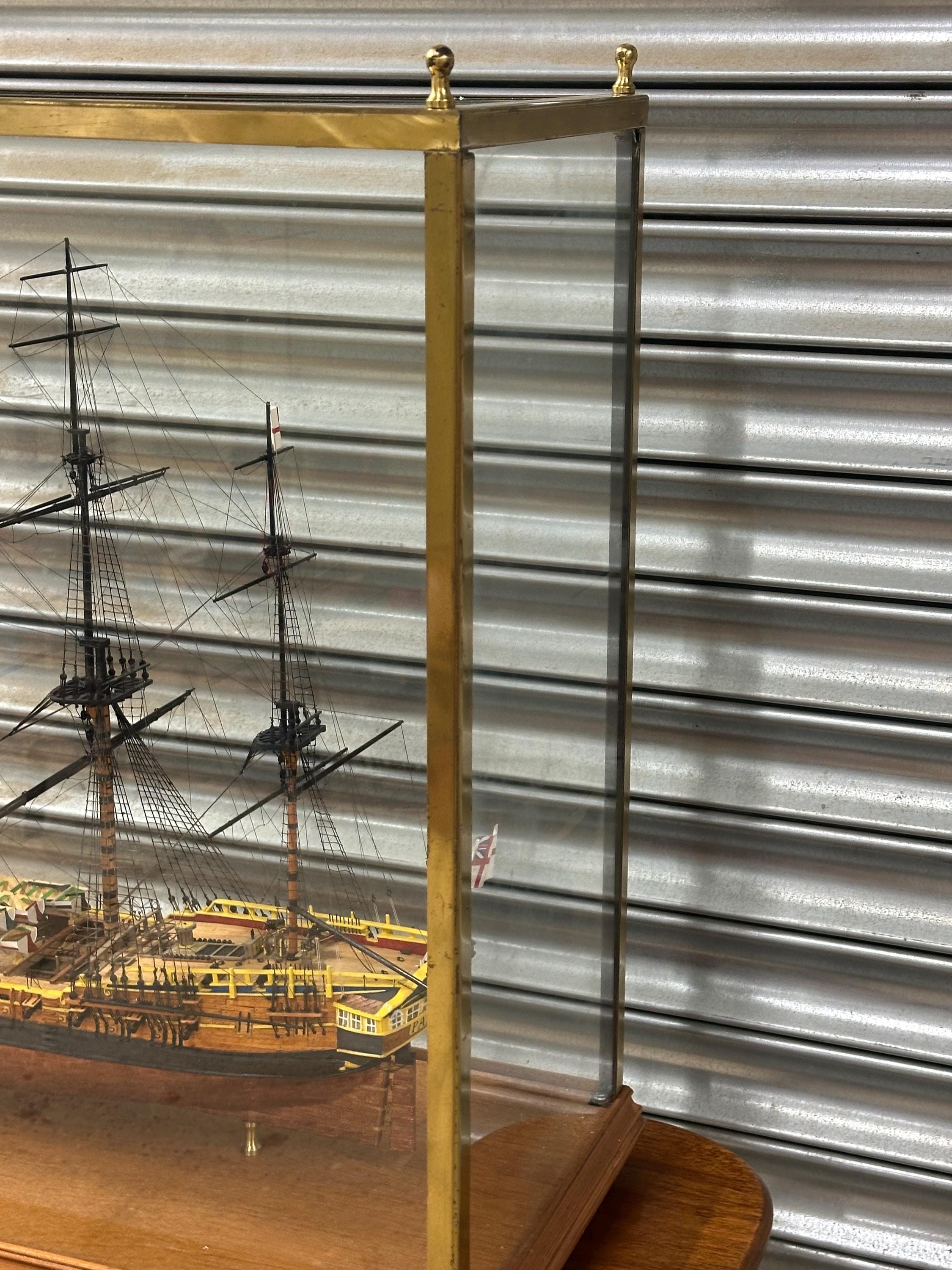 A beautifully detailed scale model of H.M.S. Pandora, presented in an elegant glass display case with brass frame and wooden base. This finely crafted maritime model depicts the historic Royal Navy vessel with intricate rigging, deck fittings, lifeboats and painted hull, making it an attractive decorative piece for collectors of nautical antiques and naval history.