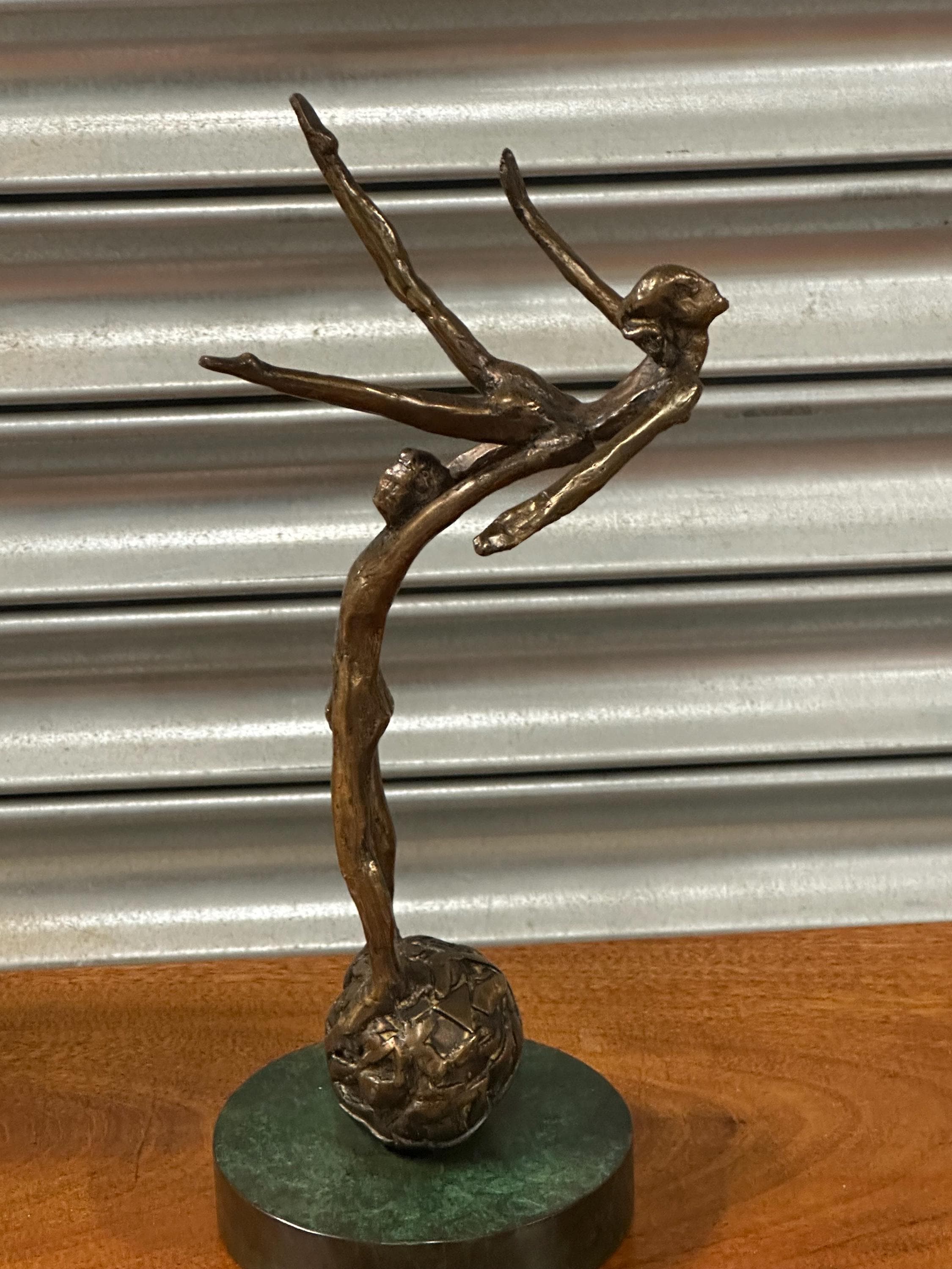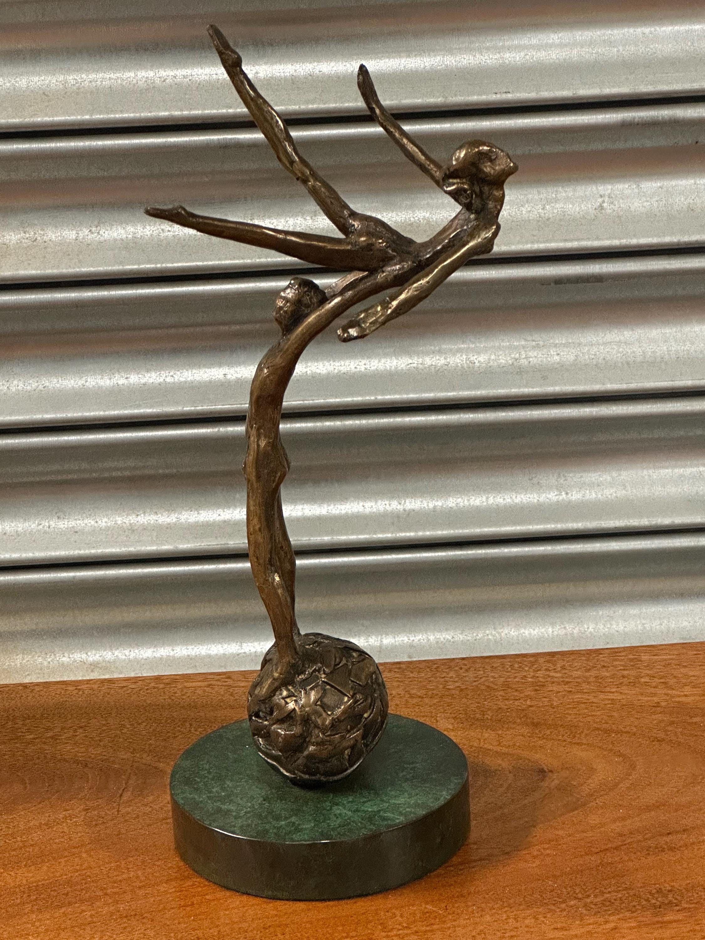 A striking and expressive bronze sculpture depicting a dynamic acrobat or gymnast, captured in a dramatic balancing pose. The elongated figure stretches gracefully upward while balancing on a textured sphere, creating a wonderful sense of movement, balance and tension.
