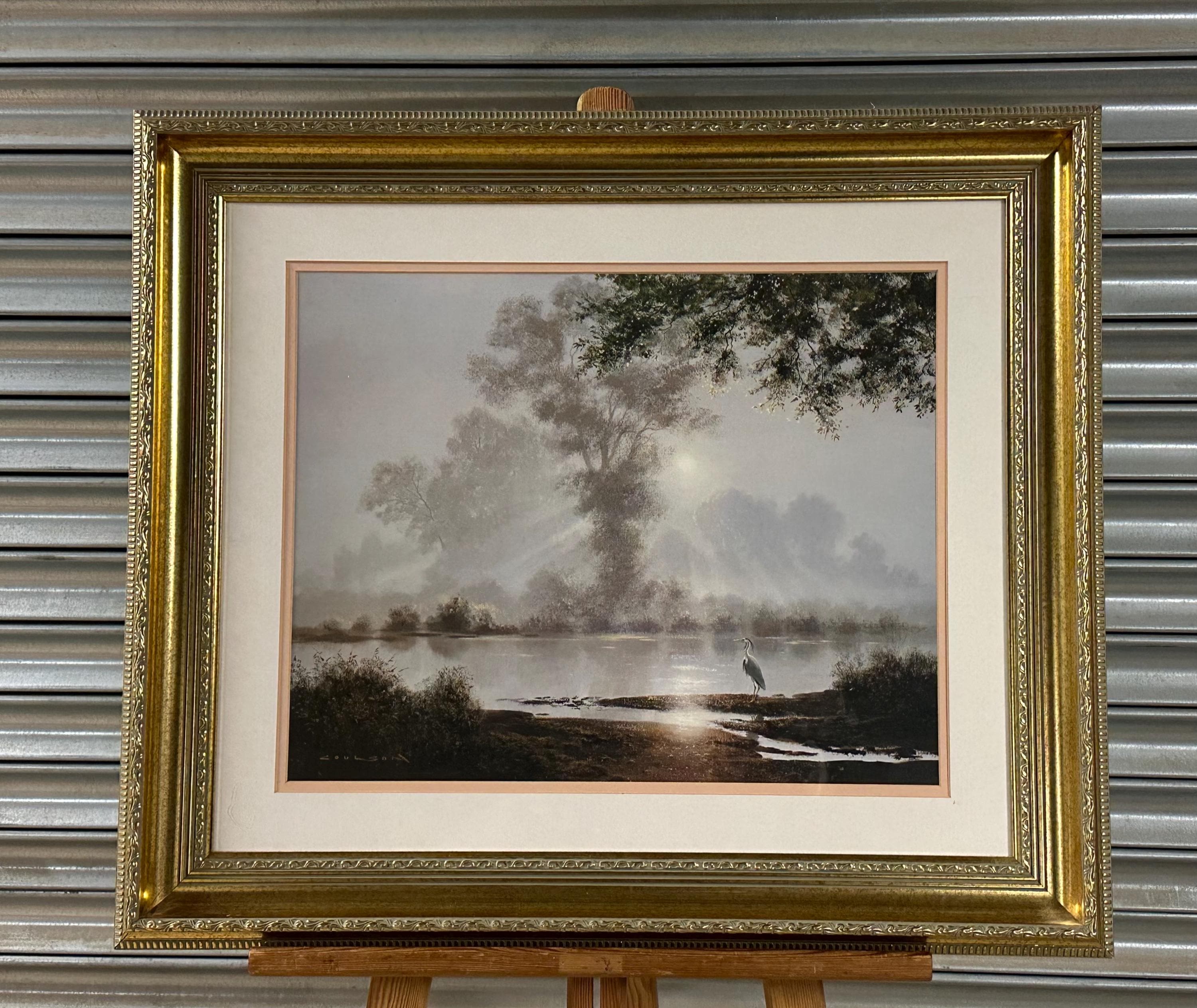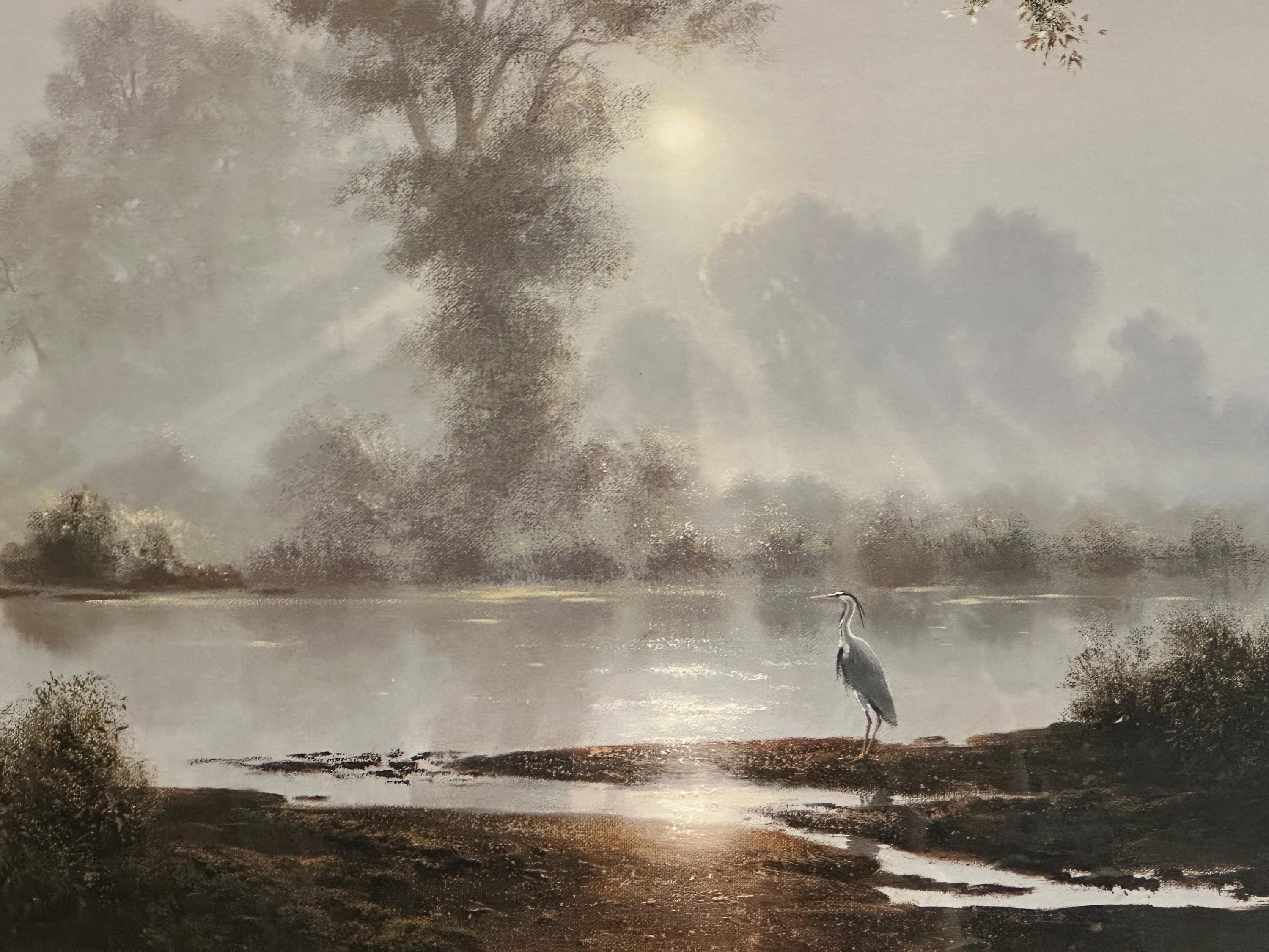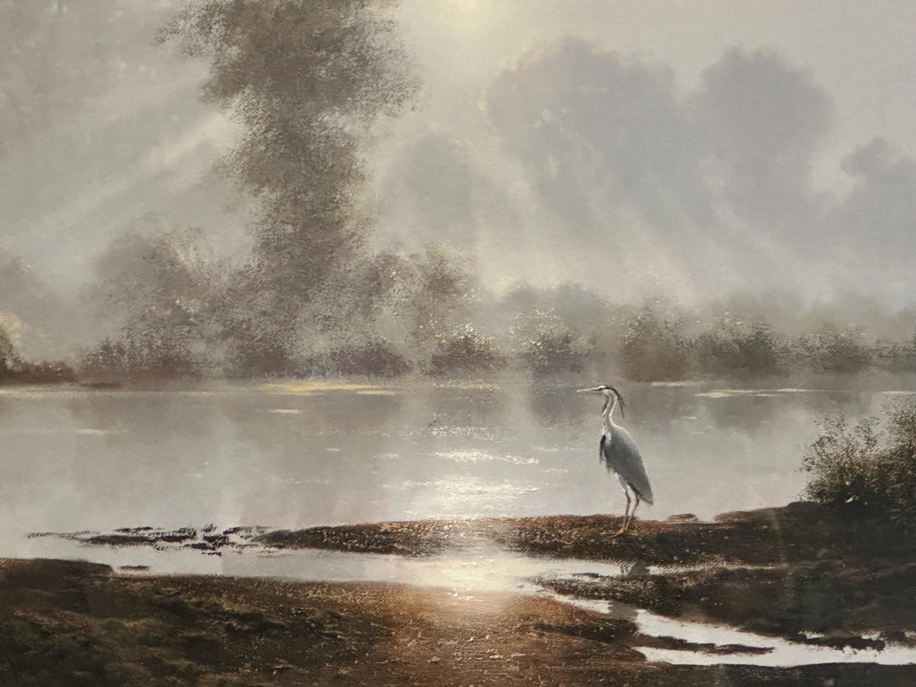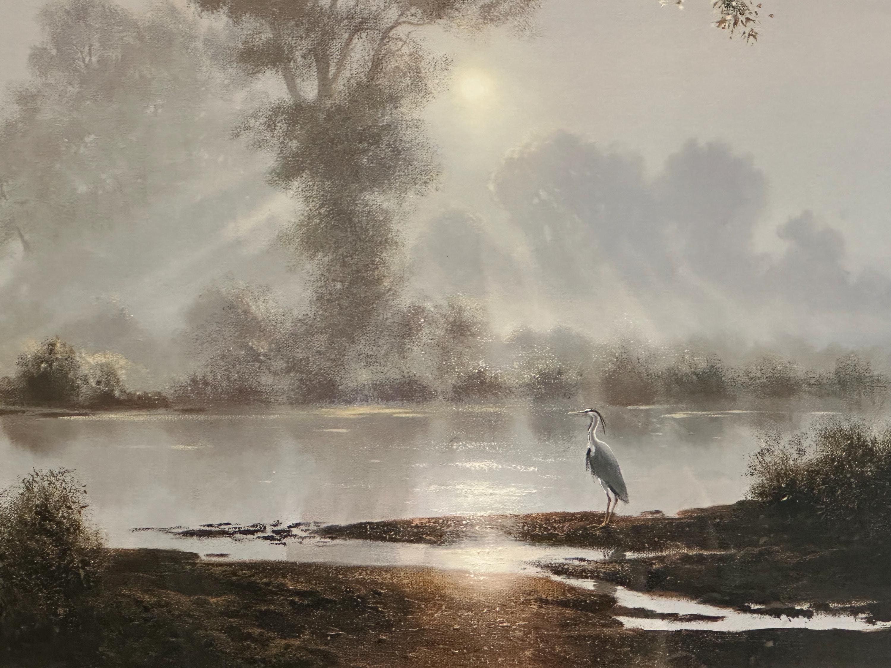This evocative waterscape captures a tranquil early morning scene, with soft mist rising over still water as sunlight filters through the trees. A lone heron stands quietly at the water’s edge, creating a sense of calm and solitude. The composition and lighting are classic Coulson—peaceful, reflective, and highly decorative.