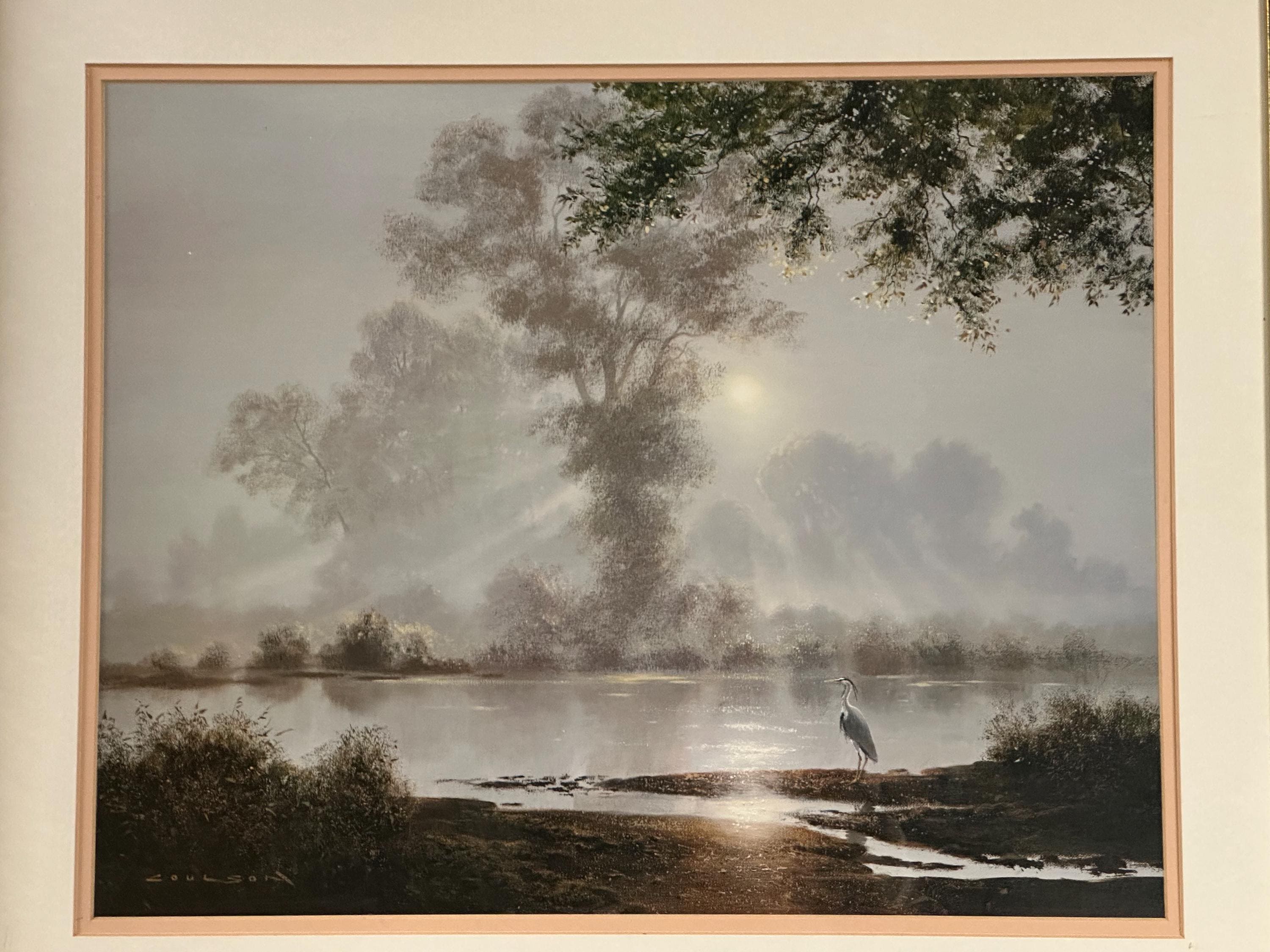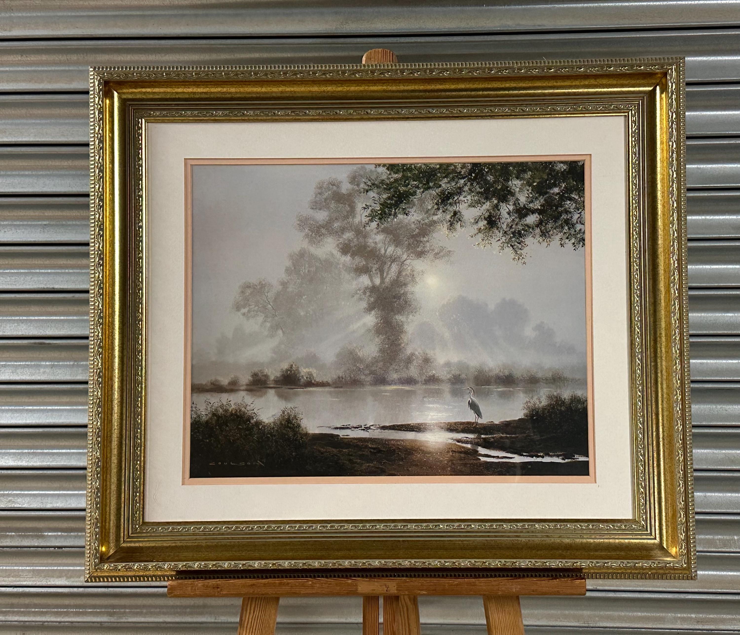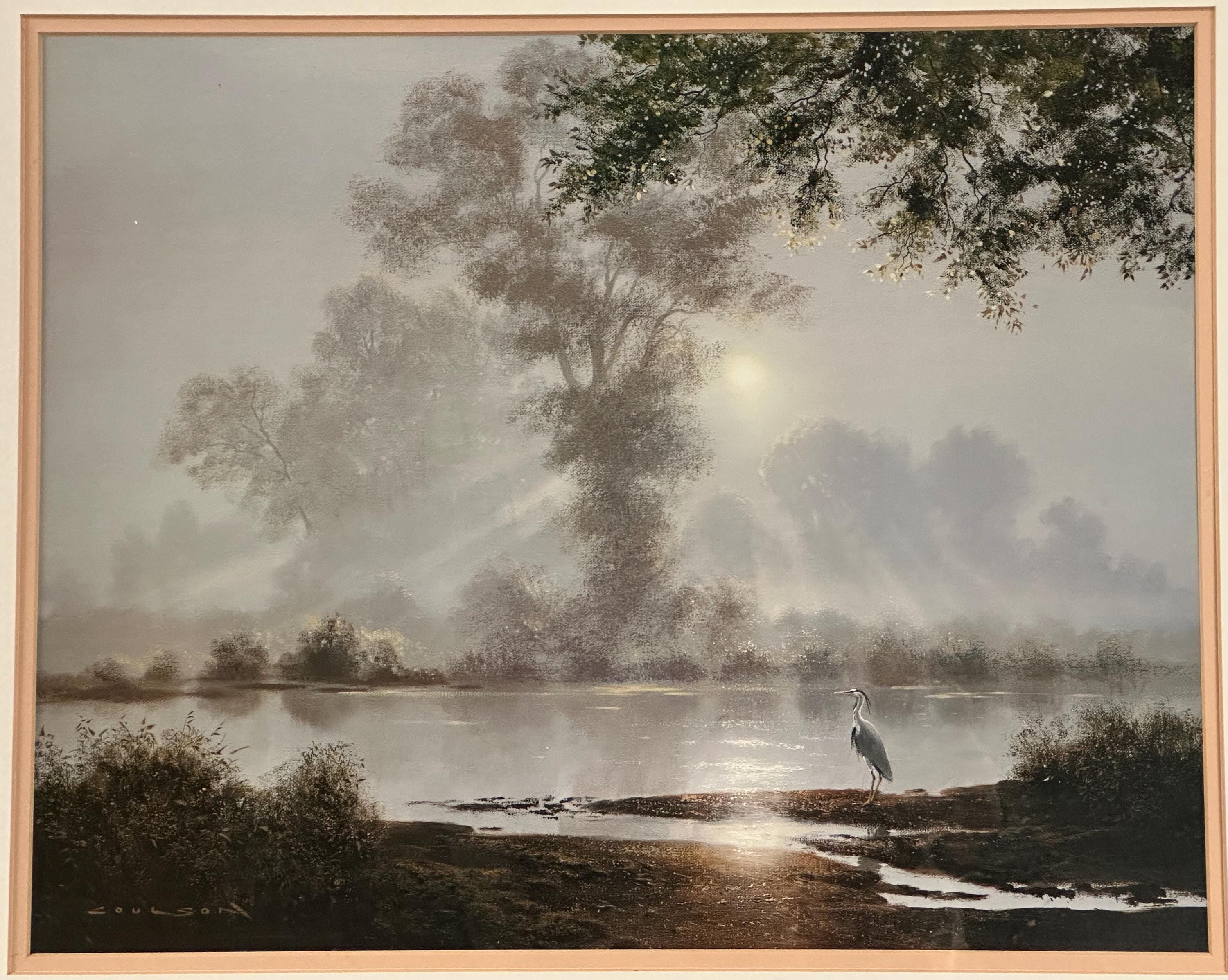 This evocative waterscape captures a tranquil early morning scene, with soft mist rising over still water as sunlight filters through the trees. A lone heron stands quietly at the water’s edge, creating a sense of calm and solitude. The composition and lighting are classic Coulson—peaceful, reflective, and highly decorative.
