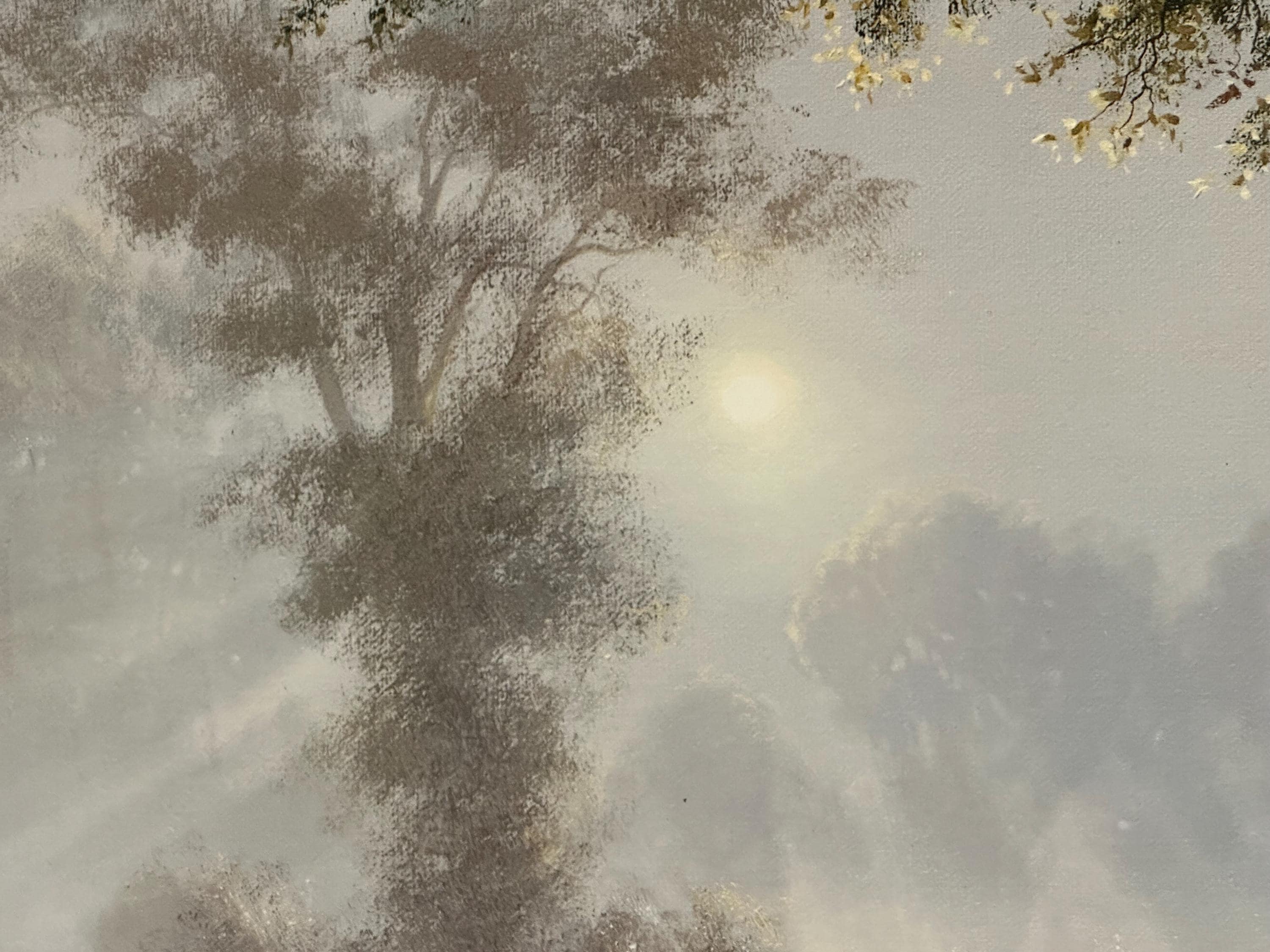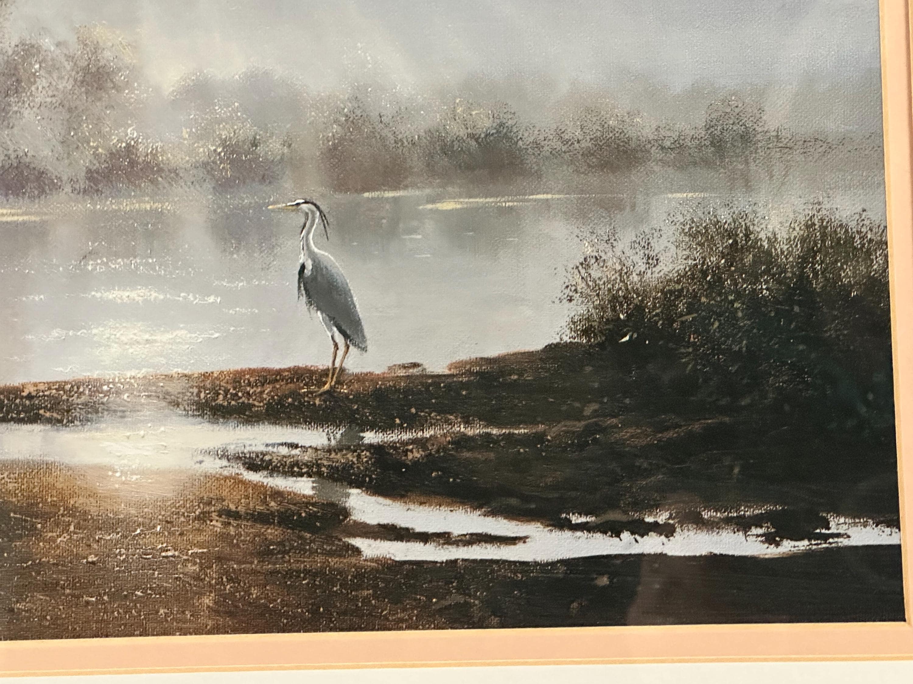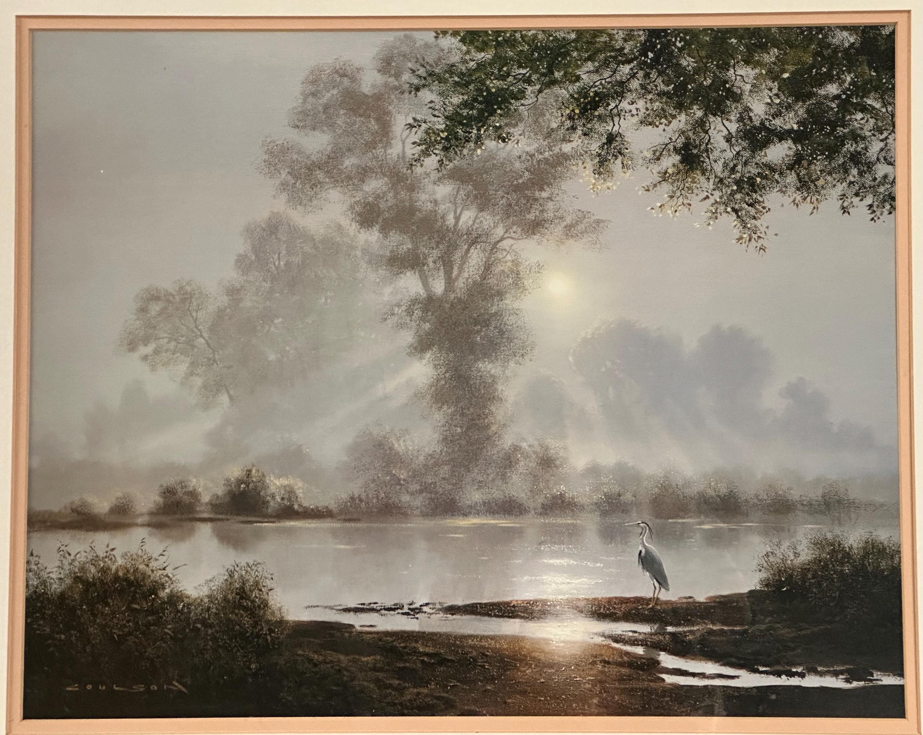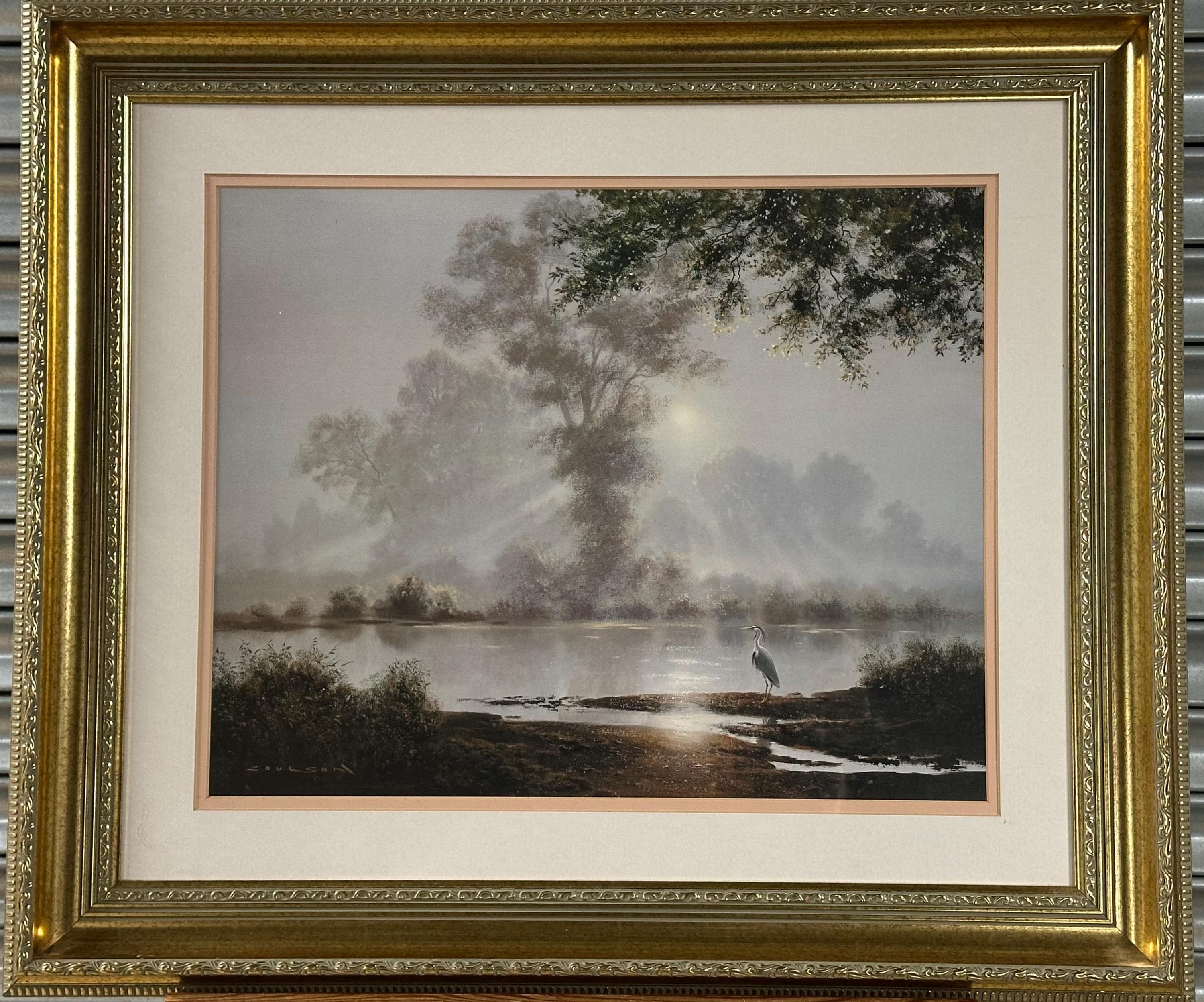 This evocative waterscape captures a tranquil early morning scene, with soft mist rising over still water as sunlight filters through the trees. A lone heron stands quietly at the water’s edge, creating a sense of calm and solitude. The composition and lighting are classic Coulson—peaceful, reflective, and highly decorative.