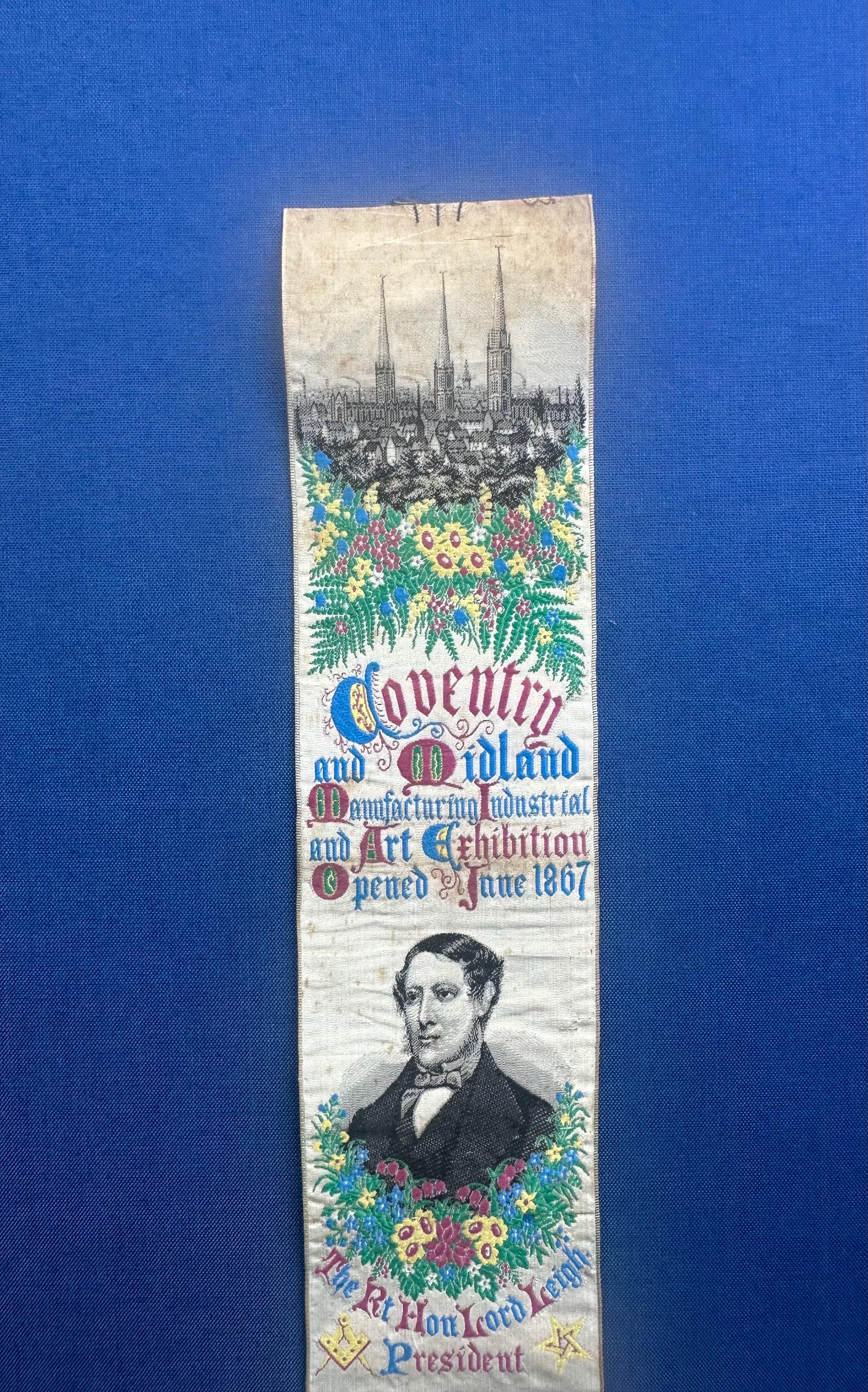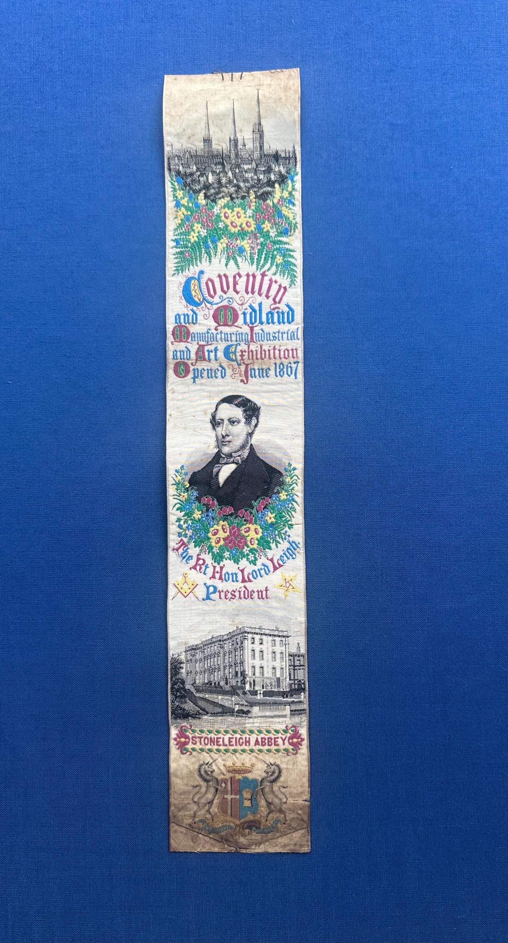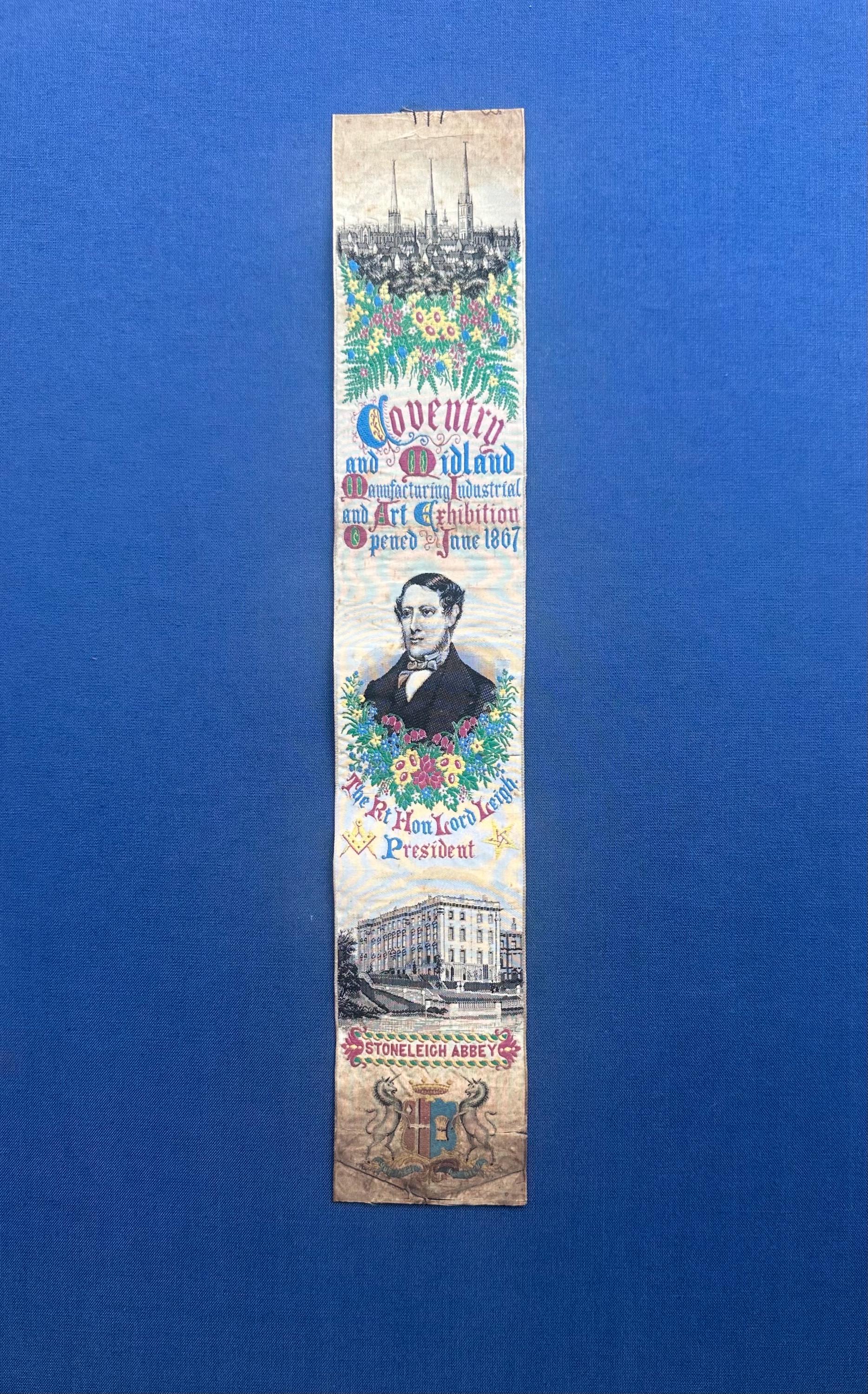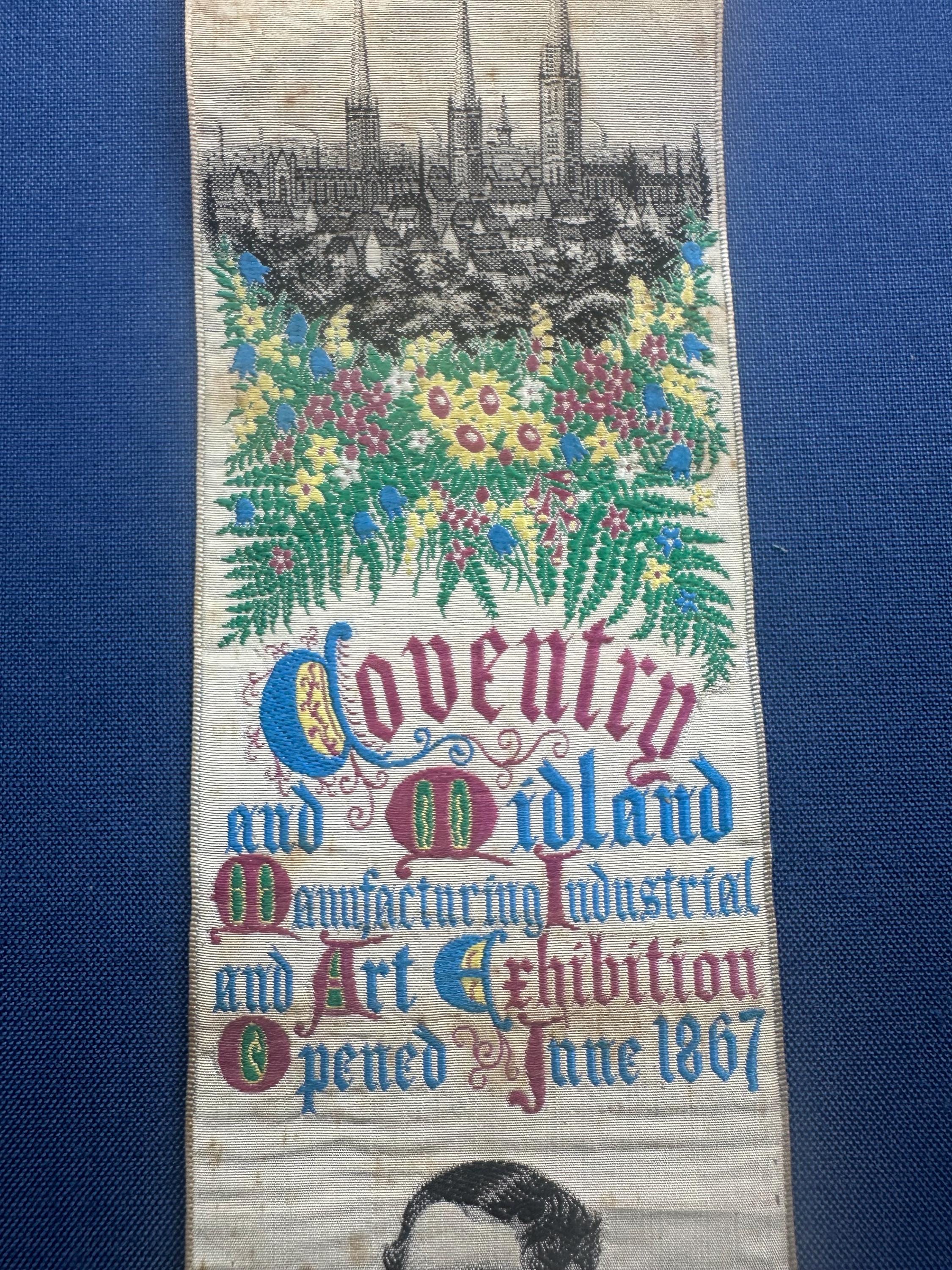A rare and highly collectible Stevens woven silk bookmark, dating to 1867, produced to commemorate the Coventry and Midland Manufacturing, Industrial & Art Exhibition.