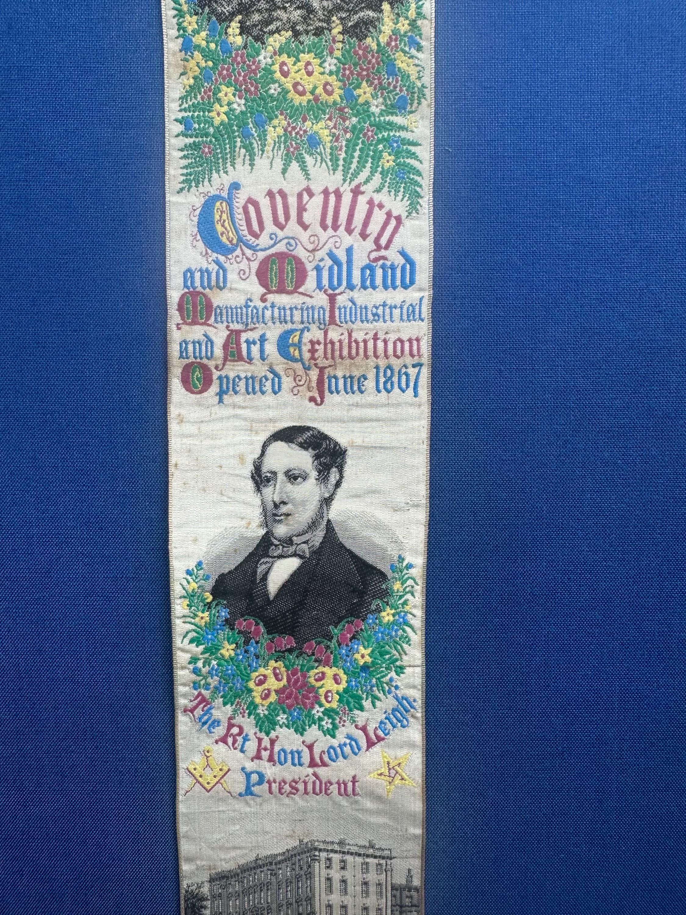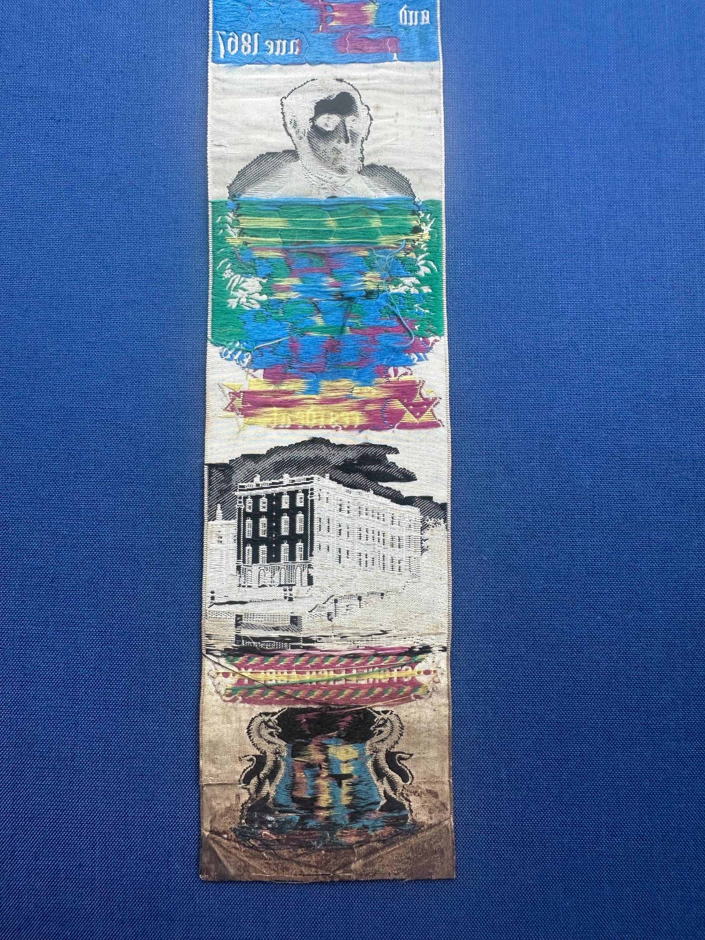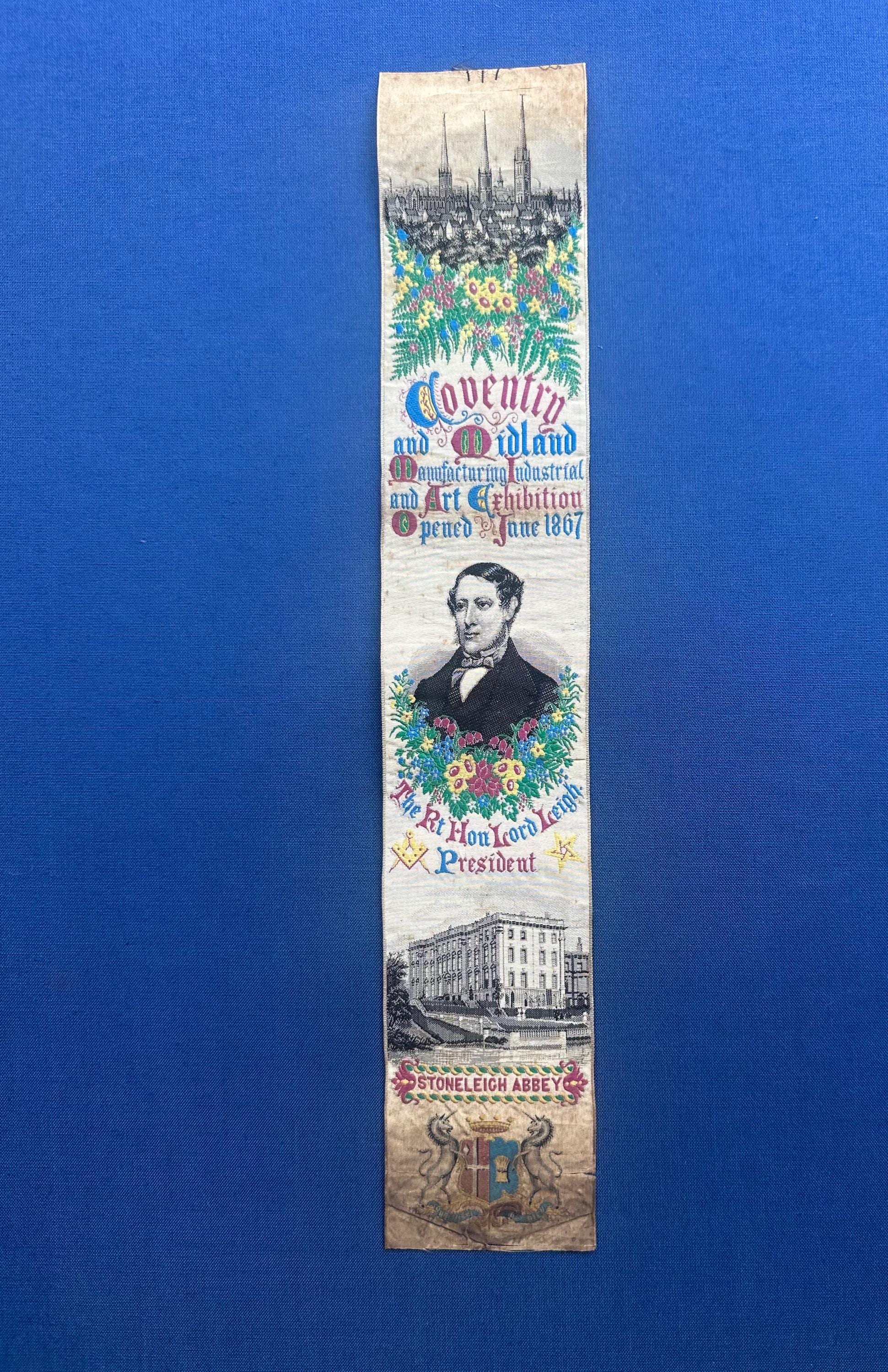 A rare and highly collectible Stevens woven silk bookmark, dating to 1867, produced to commemorate the Coventry and Midland Manufacturing, Industrial & Art Exhibition.