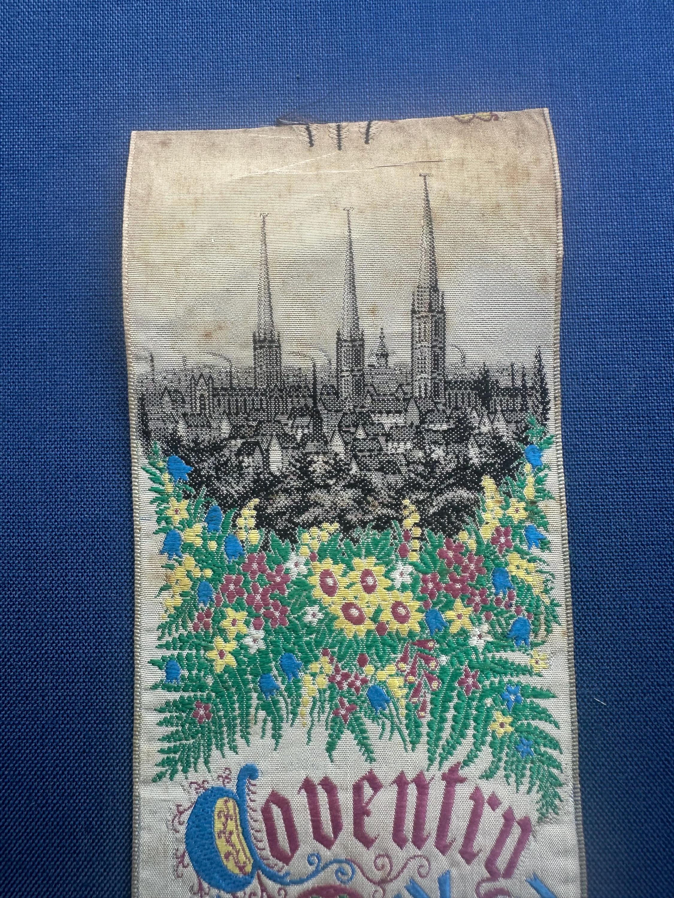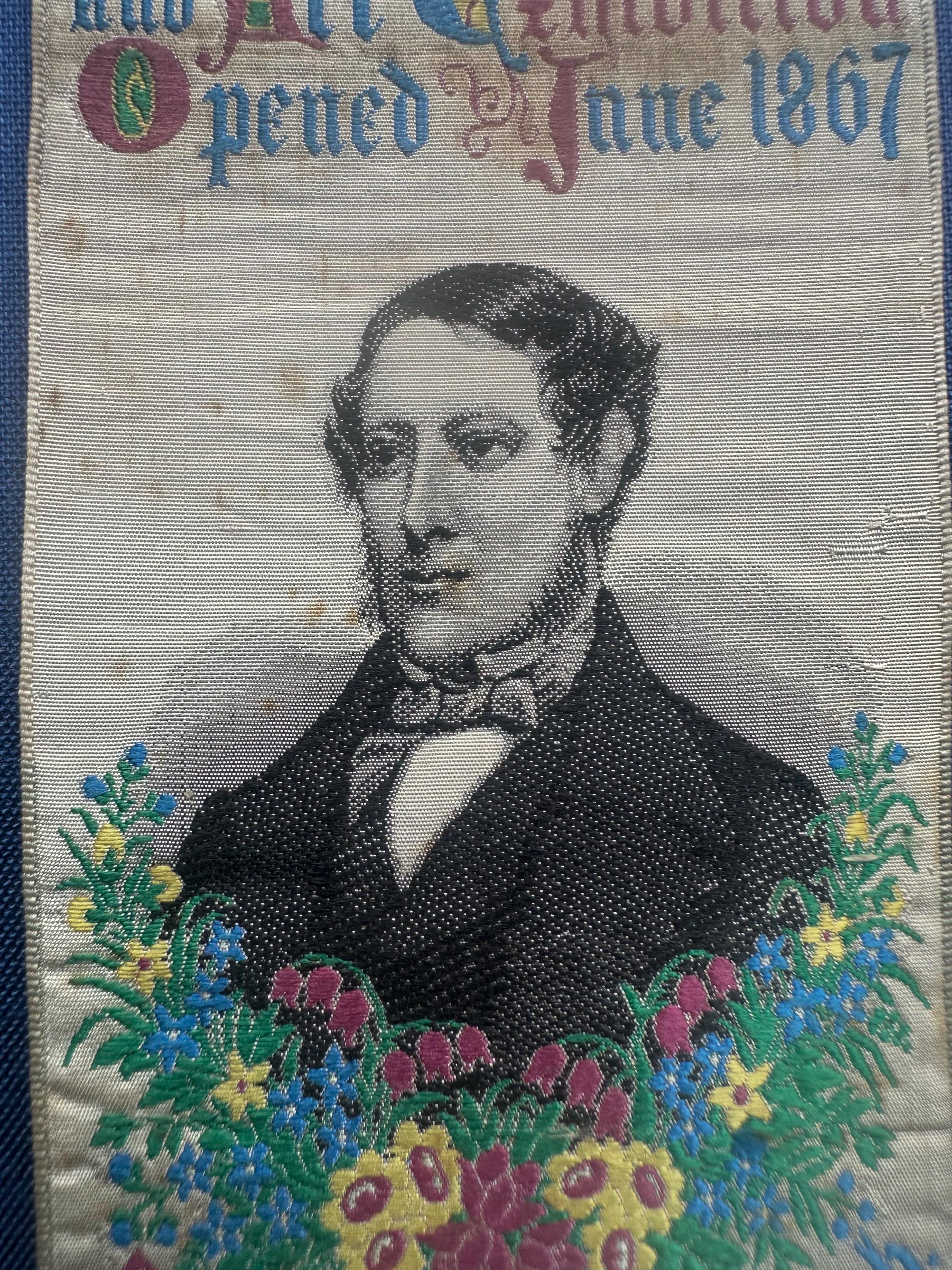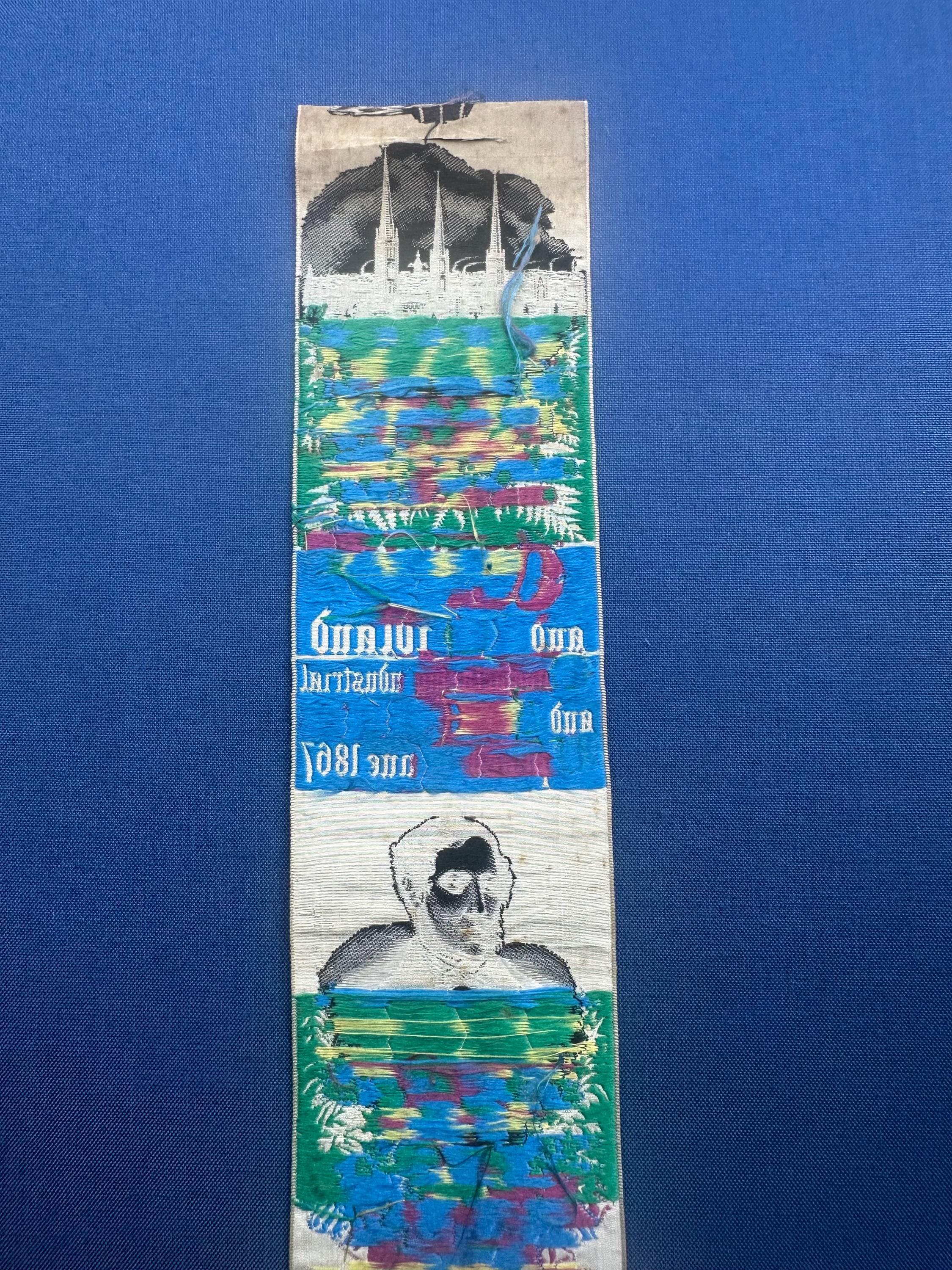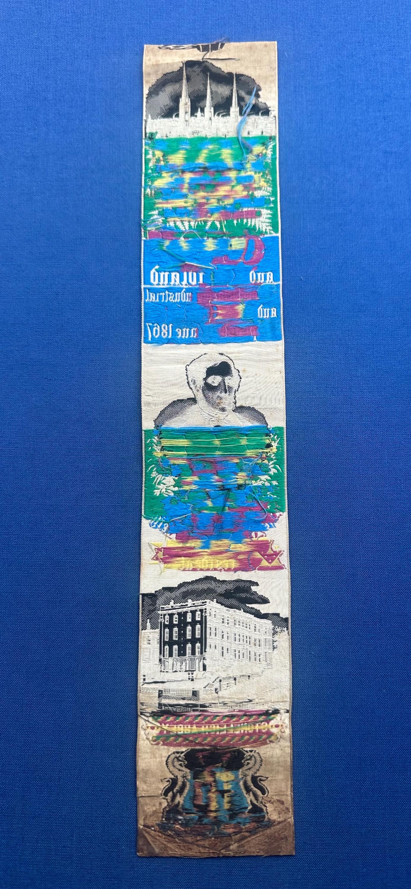 A rare and highly collectible Stevens woven silk bookmark, dating to 1867, produced to commemorate the Coventry and Midland Manufacturing, Industrial & Art Exhibition.