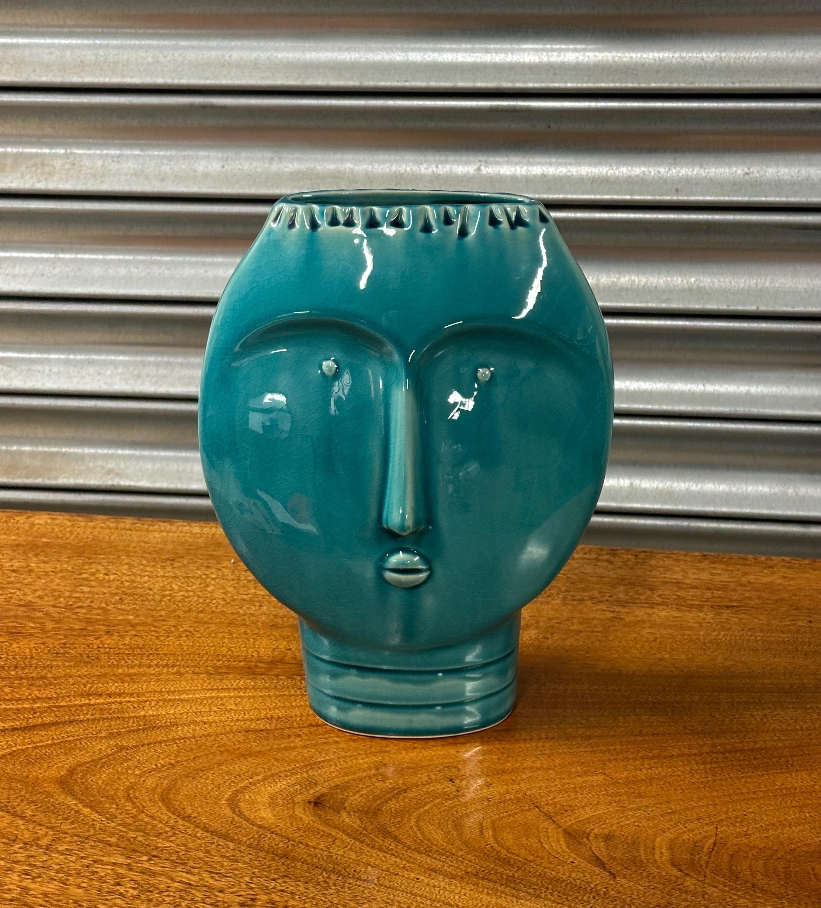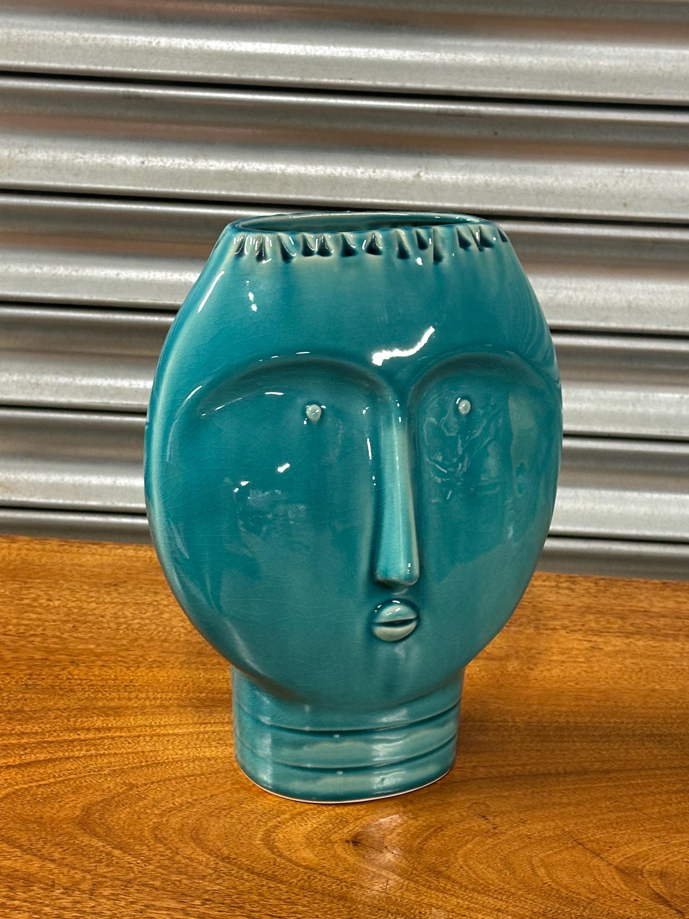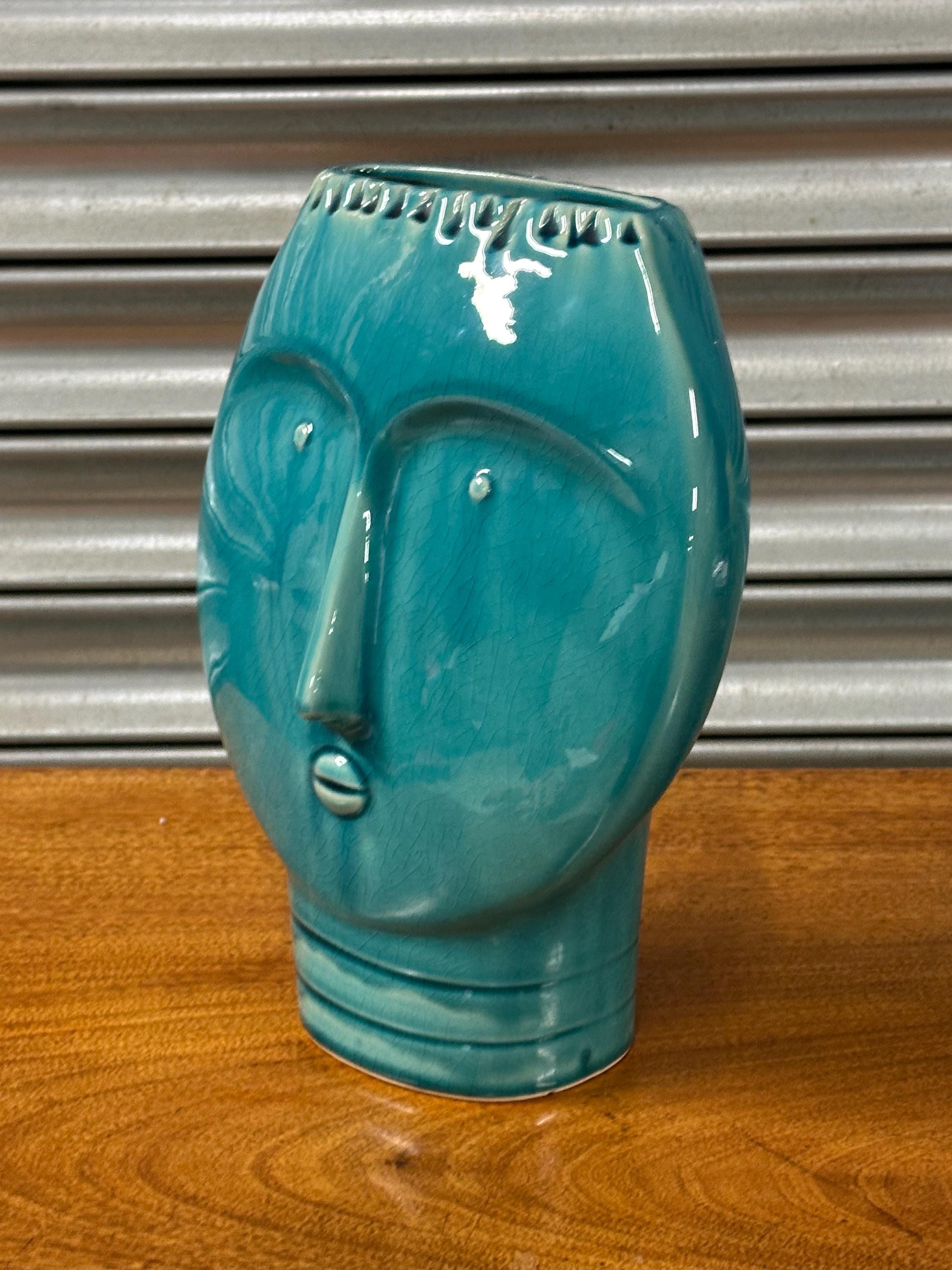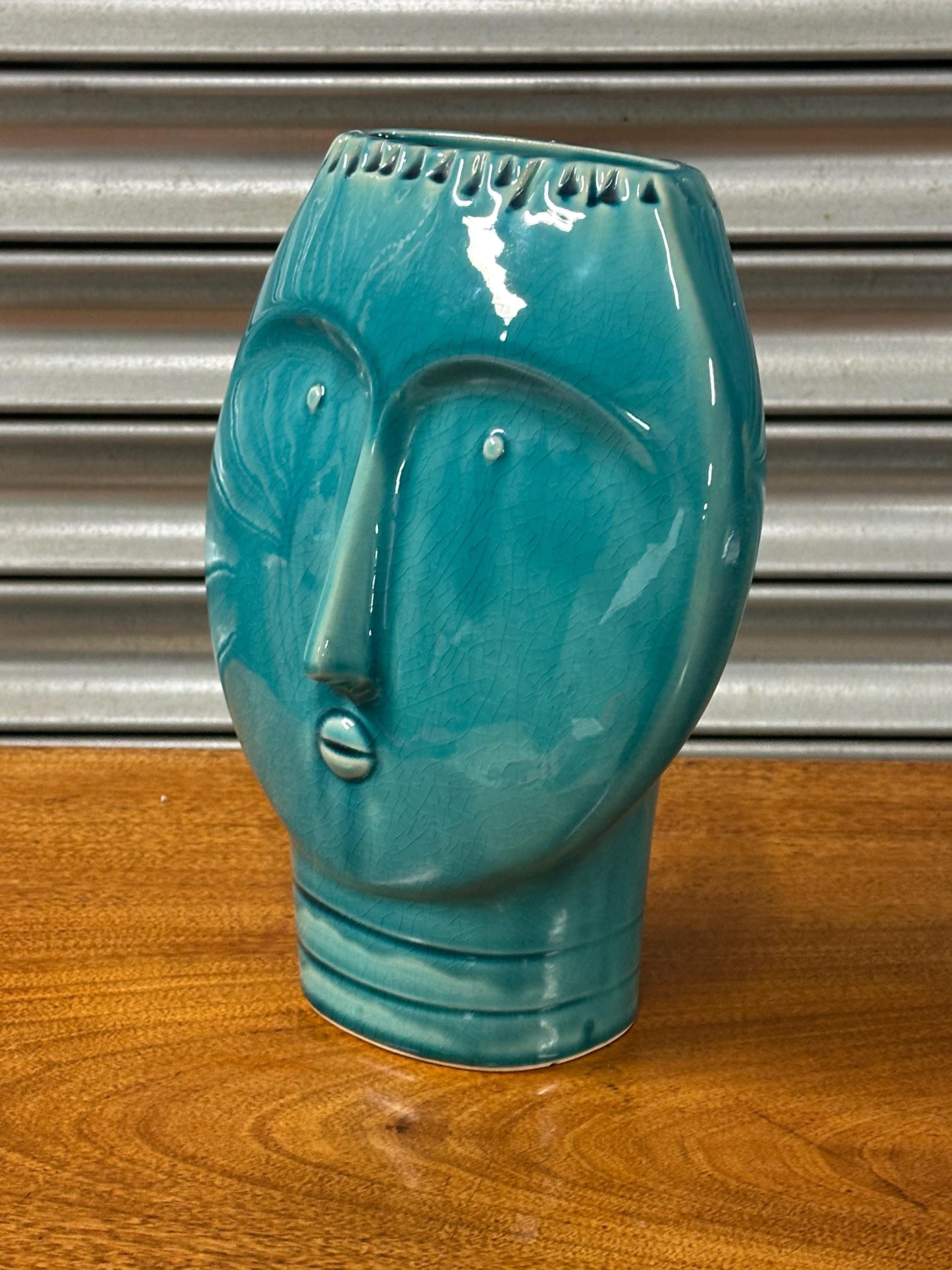 A striking Mid Century Modern art pottery face vase, beautifully modelled with a stylised human form and finished in a rich turquoise glaze. This sculptural piece perfectly captures the bold, minimalist aesthetic of the MCM period, making it an eye-catching decorative item for any interior.