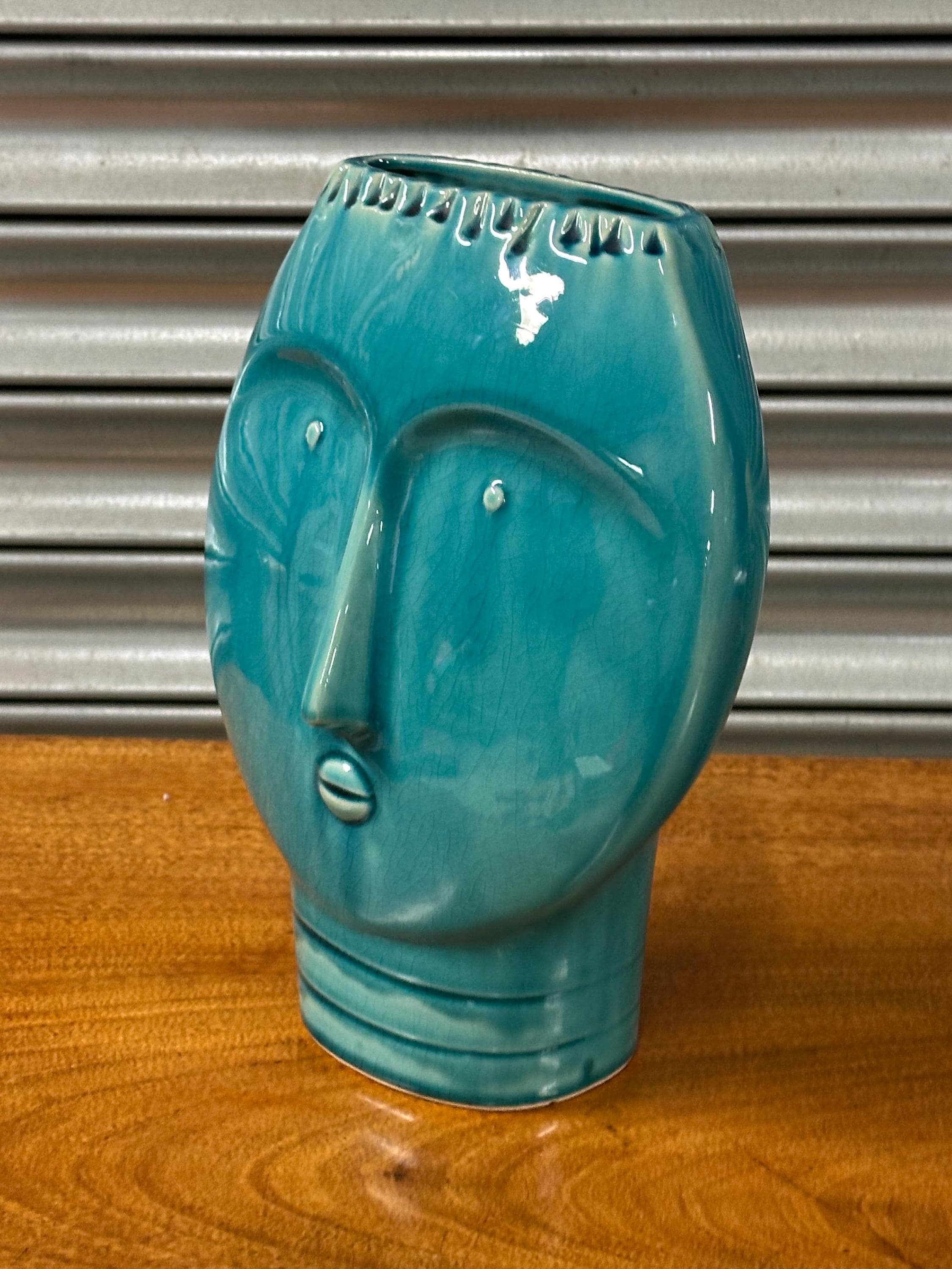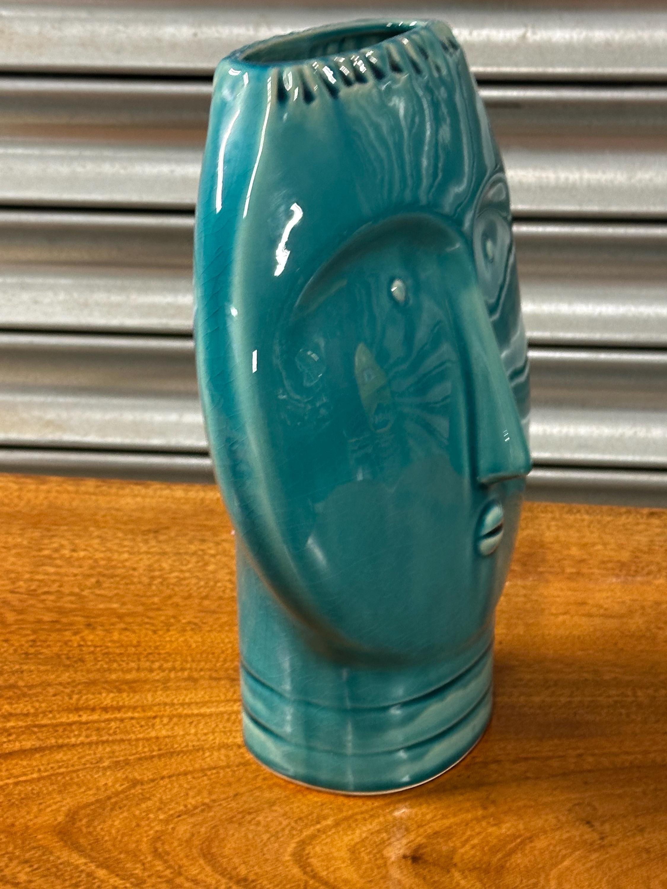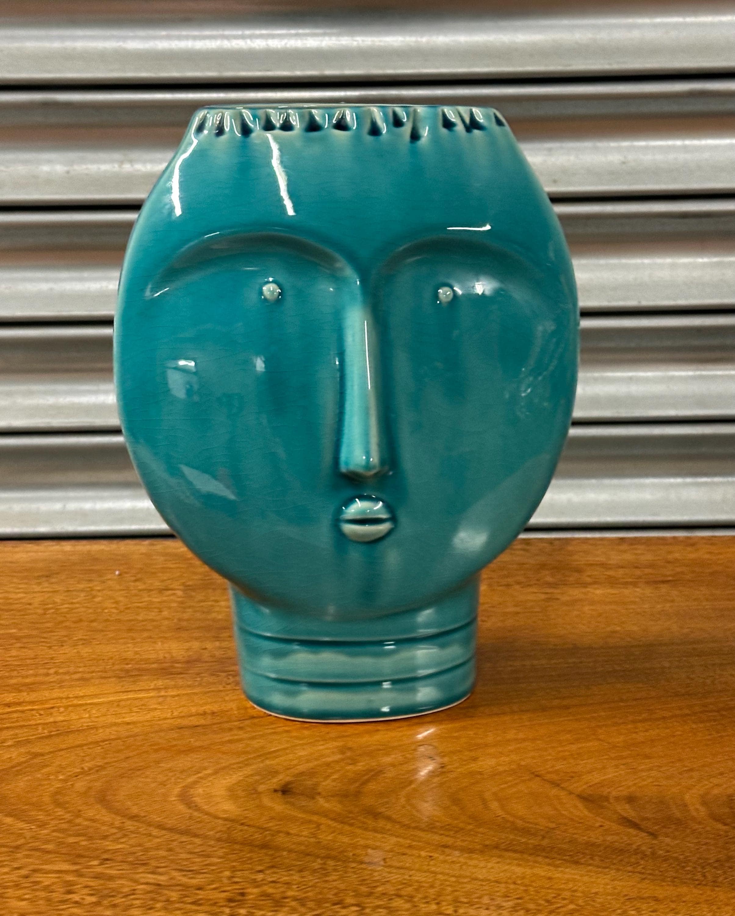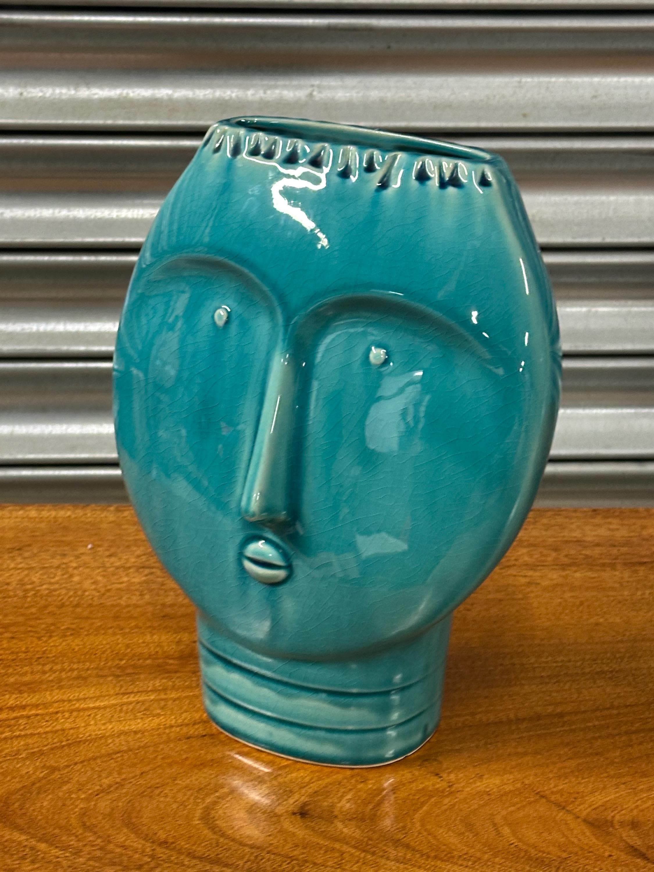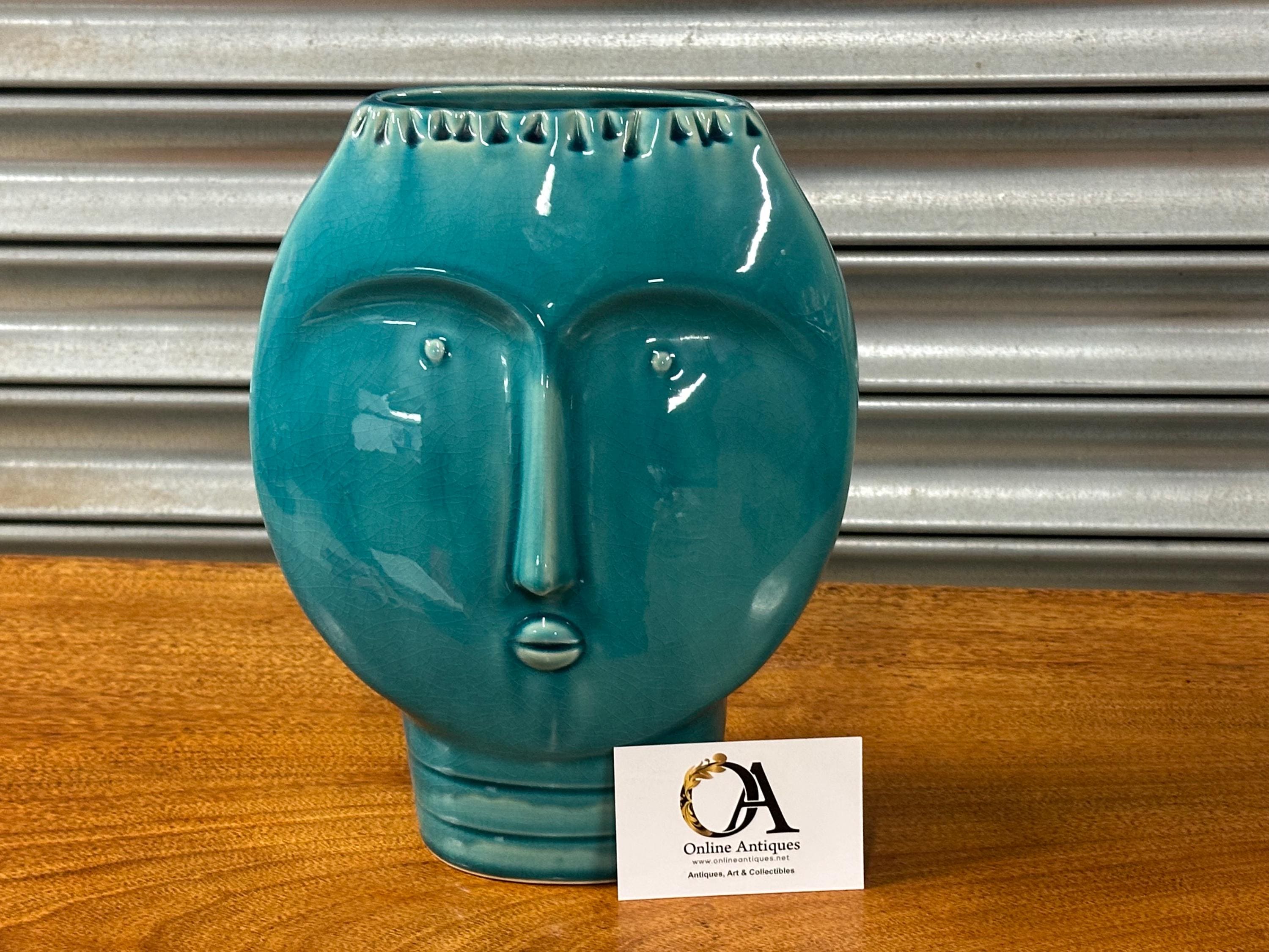 A striking Mid Century Modern art pottery face vase, beautifully modelled with a stylised human form and finished in a rich turquoise glaze. This sculptural piece perfectly captures the bold, minimalist aesthetic of the MCM period, making it an eye-catching decorative item for any interior.