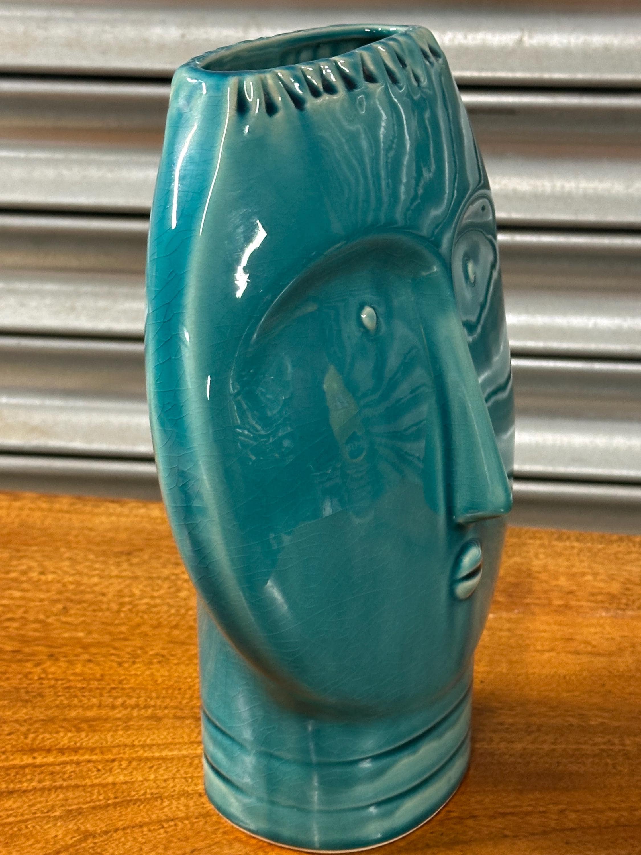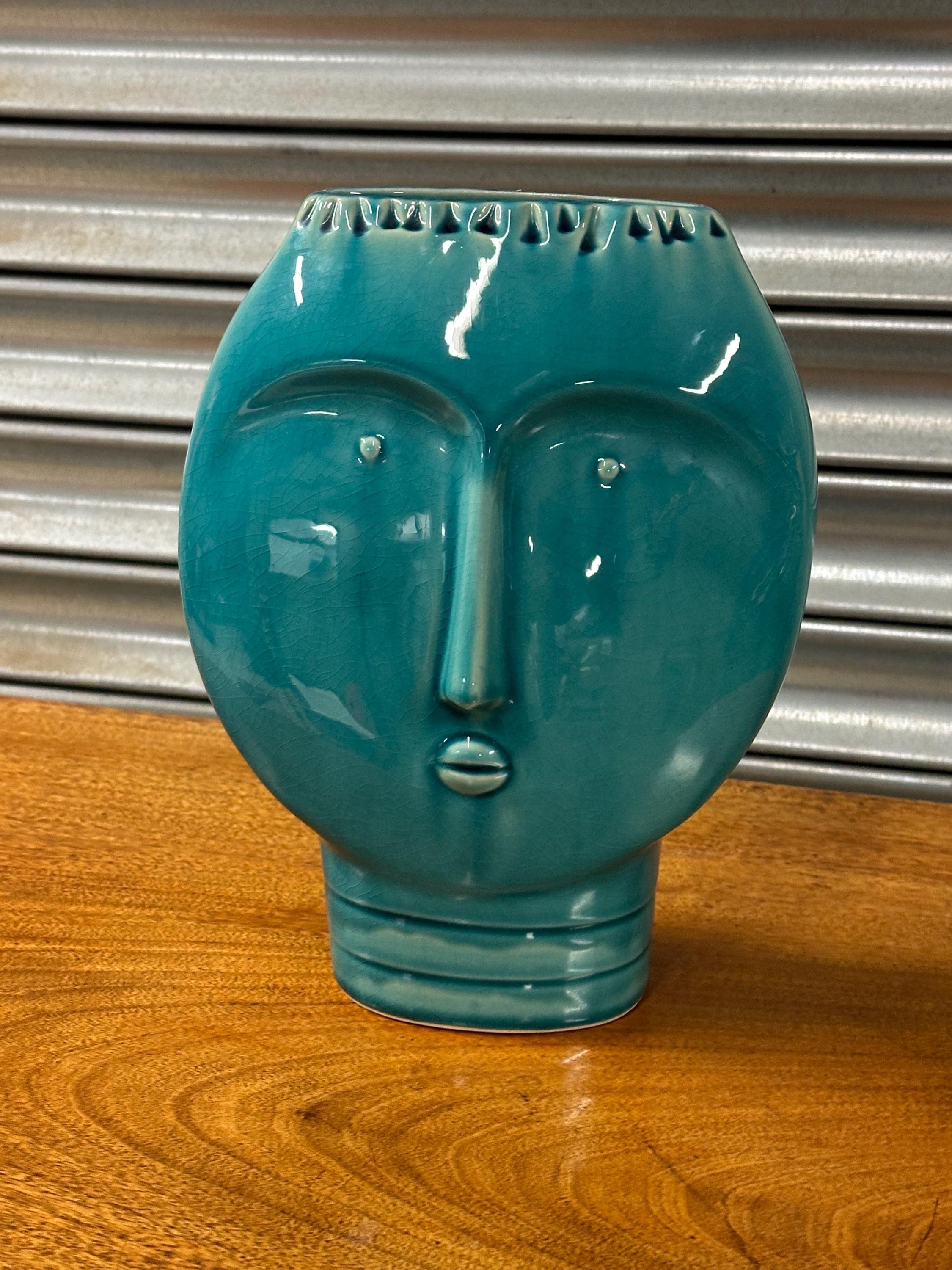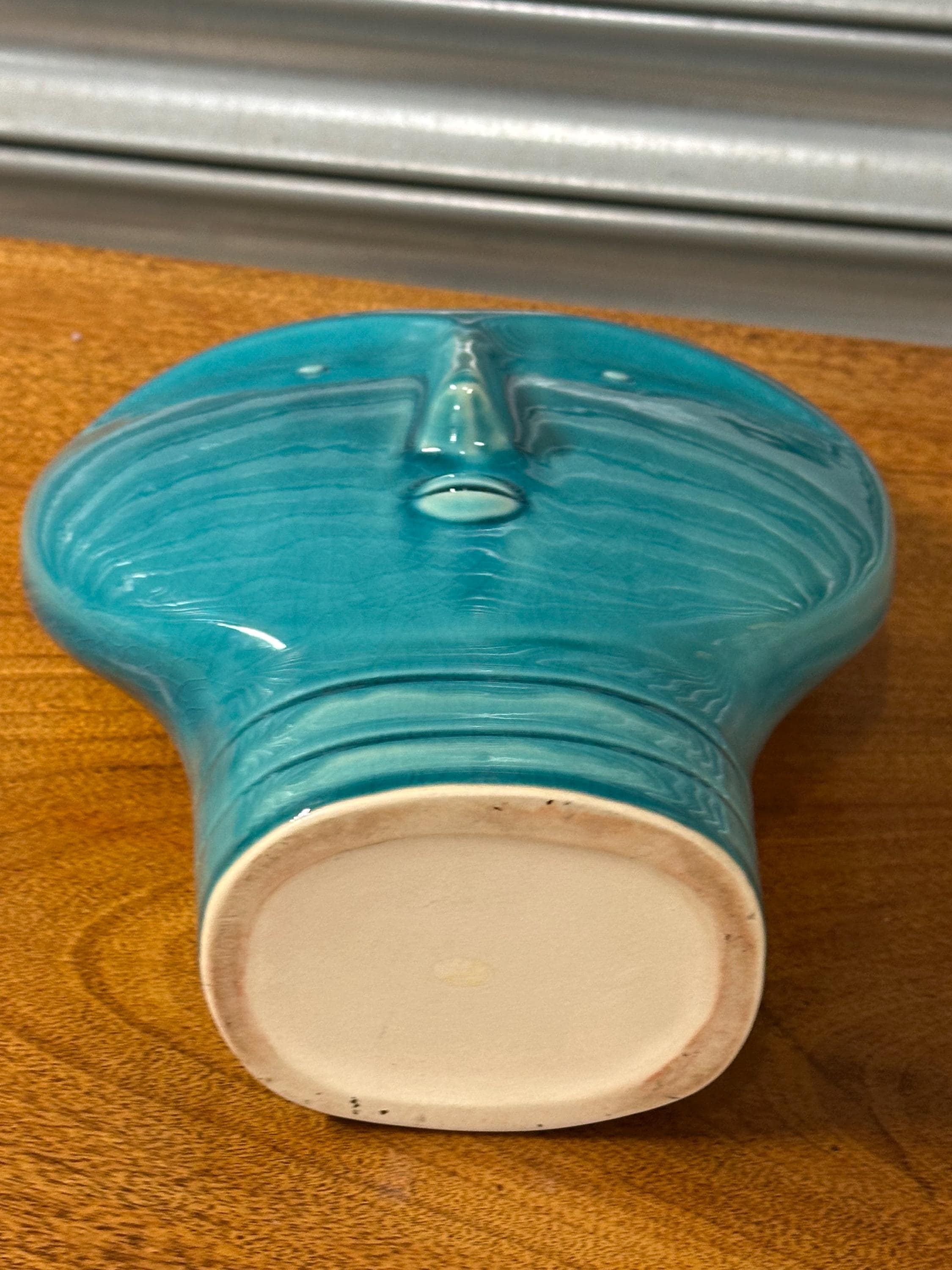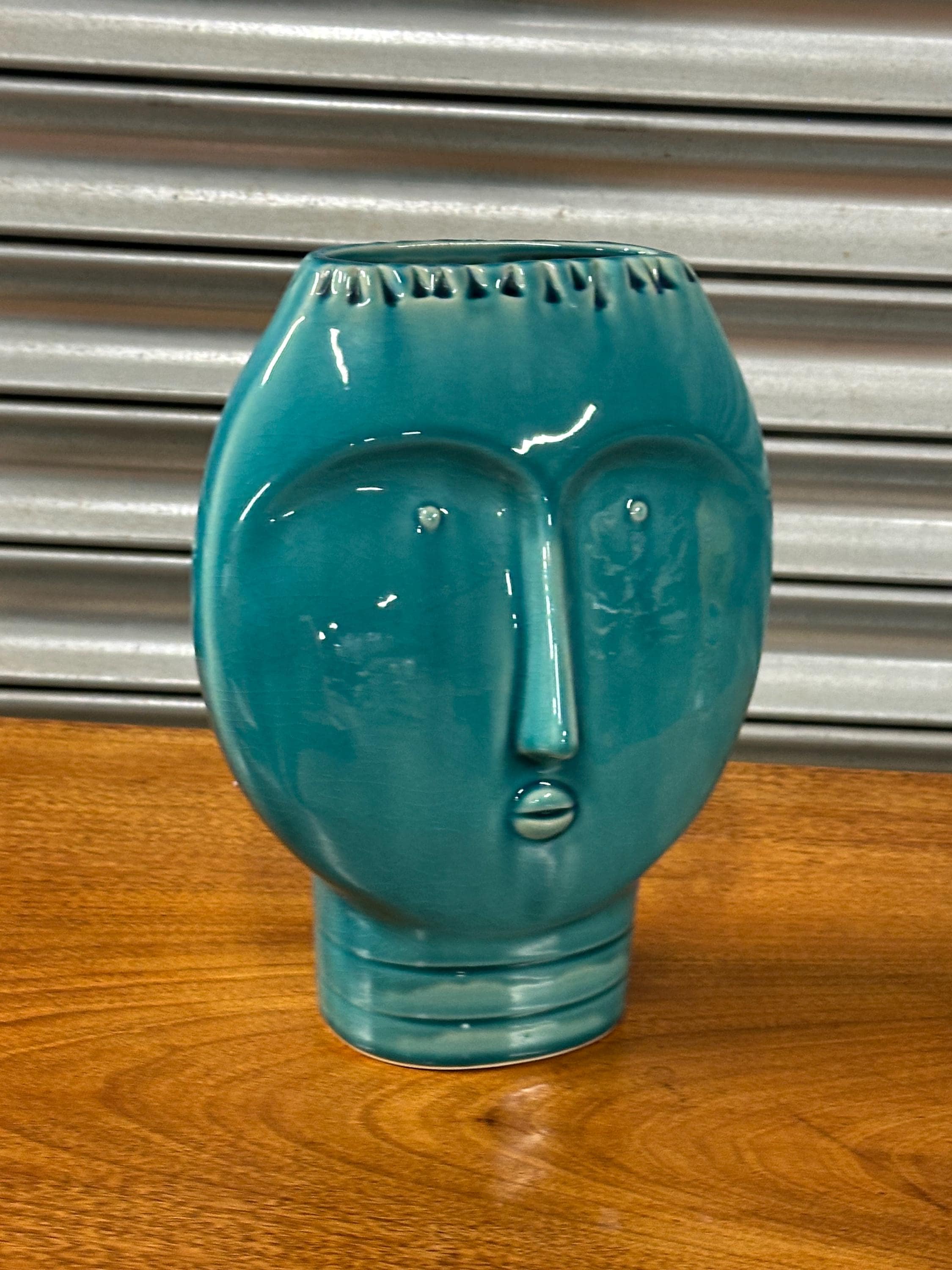 A striking Mid Century Modern art pottery face vase, beautifully modelled with a stylised human form and finished in a rich turquoise glaze. This sculptural piece perfectly captures the bold, minimalist aesthetic of the MCM period, making it an eye-catching decorative item for any interior.