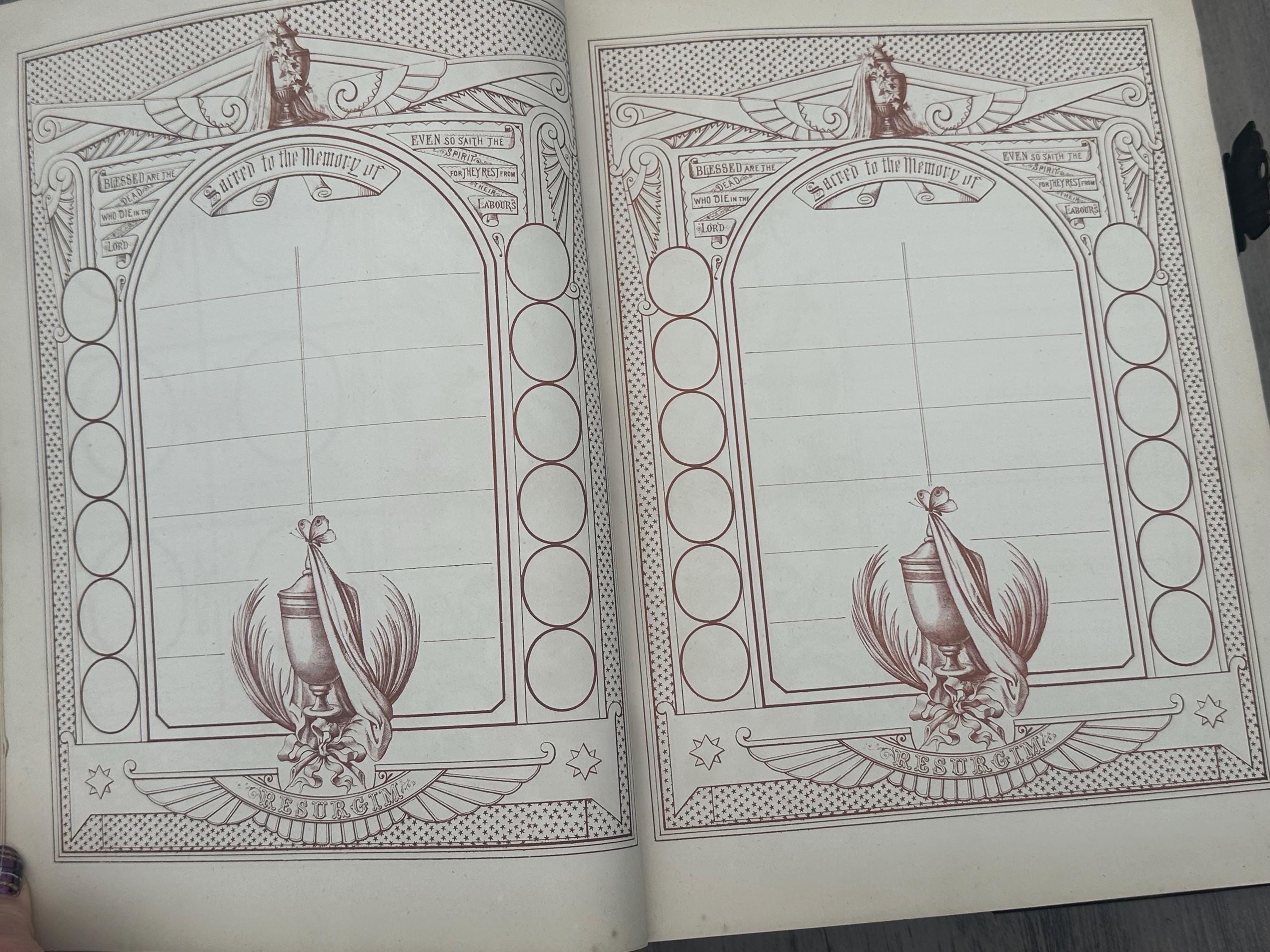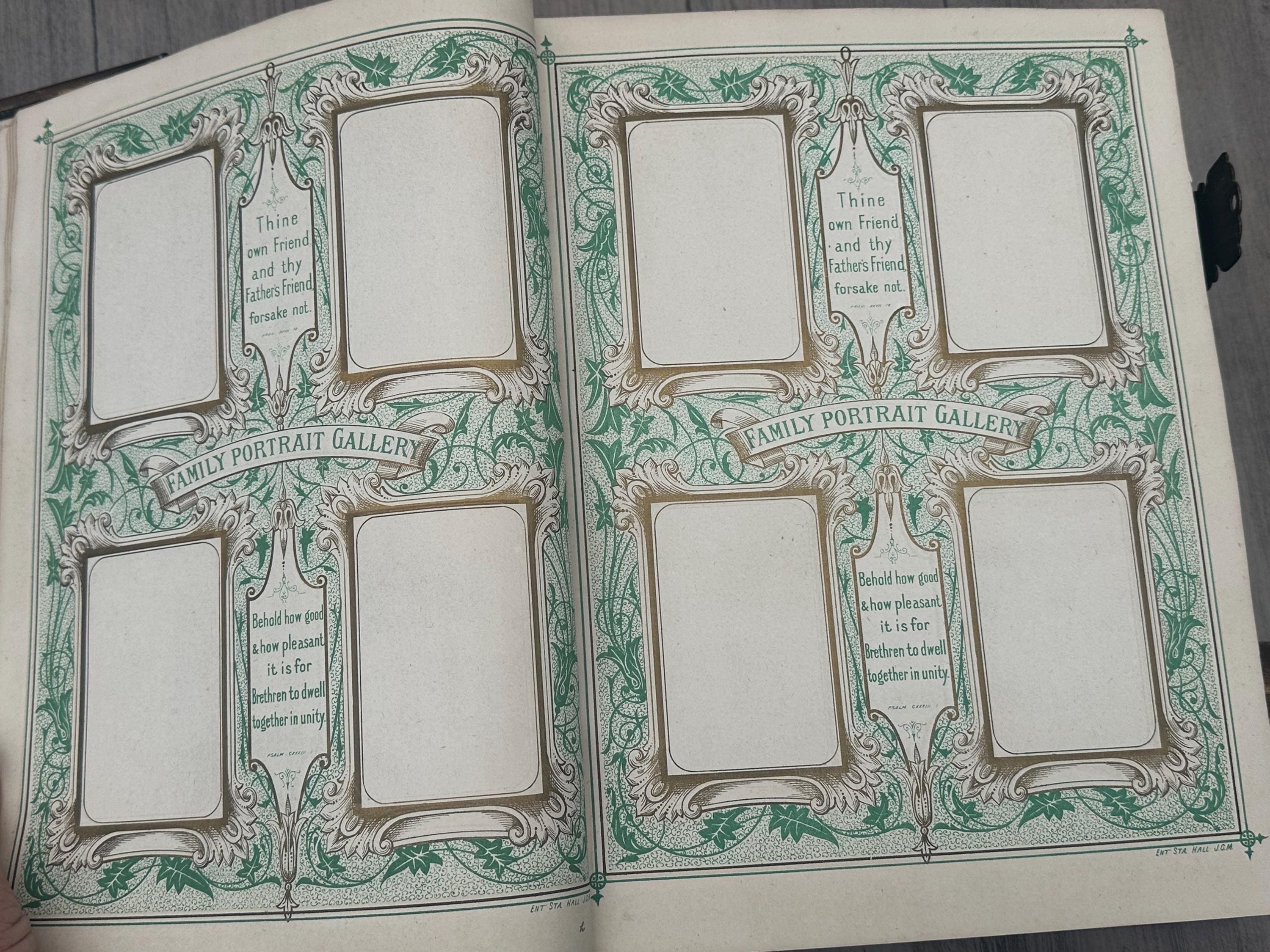 A particularly charming feature is the “Family Register” page, intended for recording births, marriages, and family history – a lovely genealogical element, often missing or completed, but here remaining blank and ready for use or display. Very Rare !!!