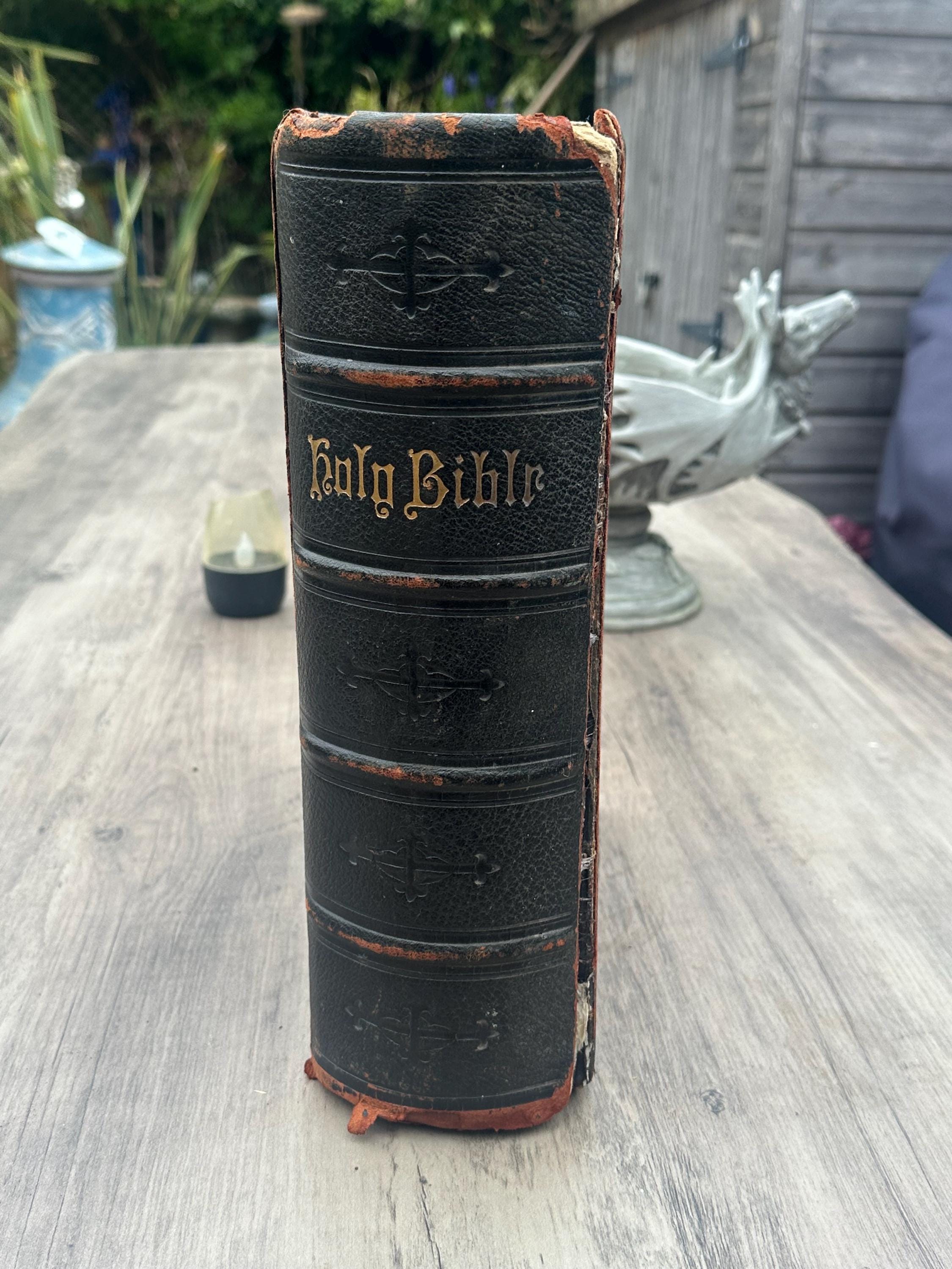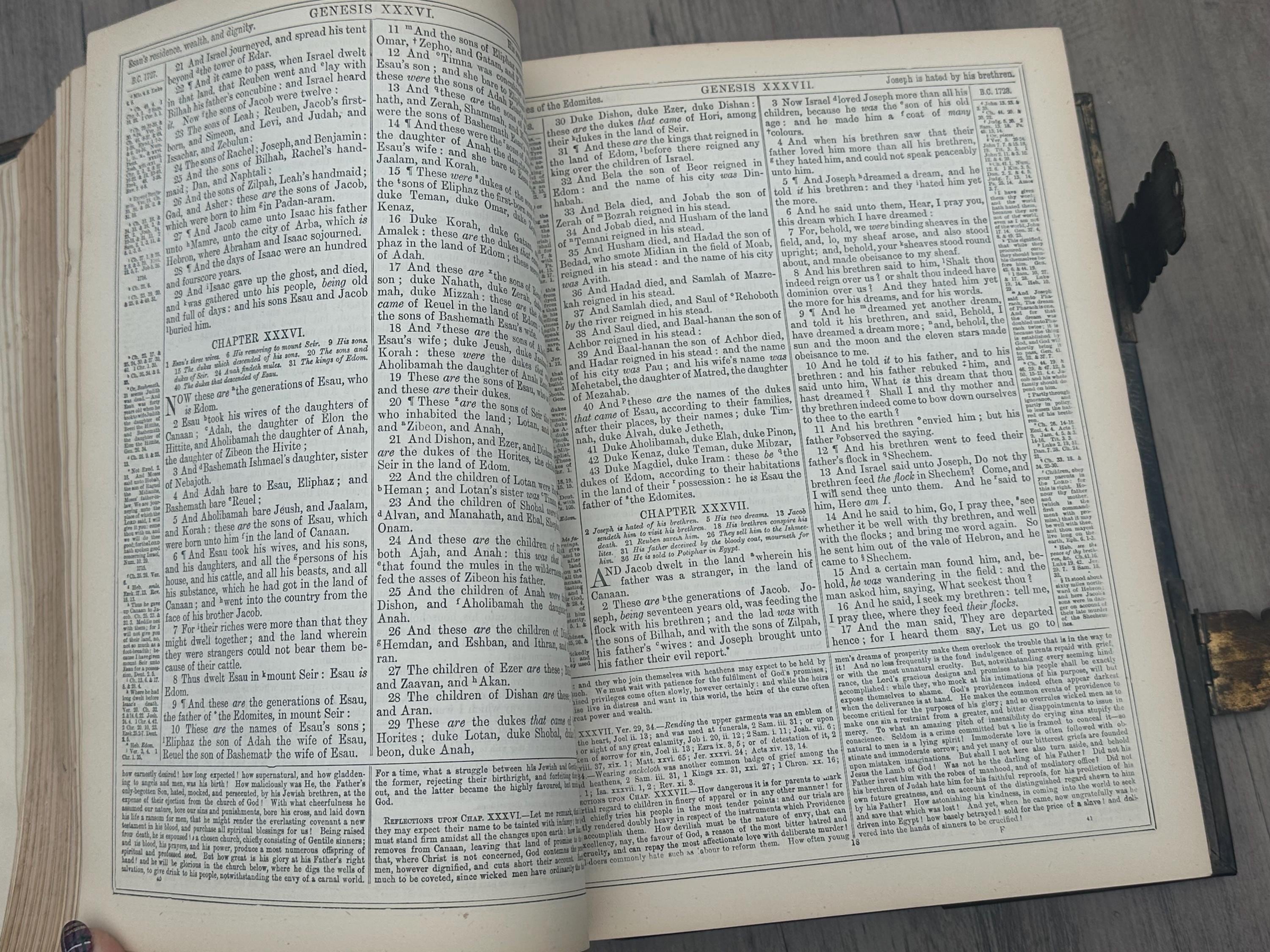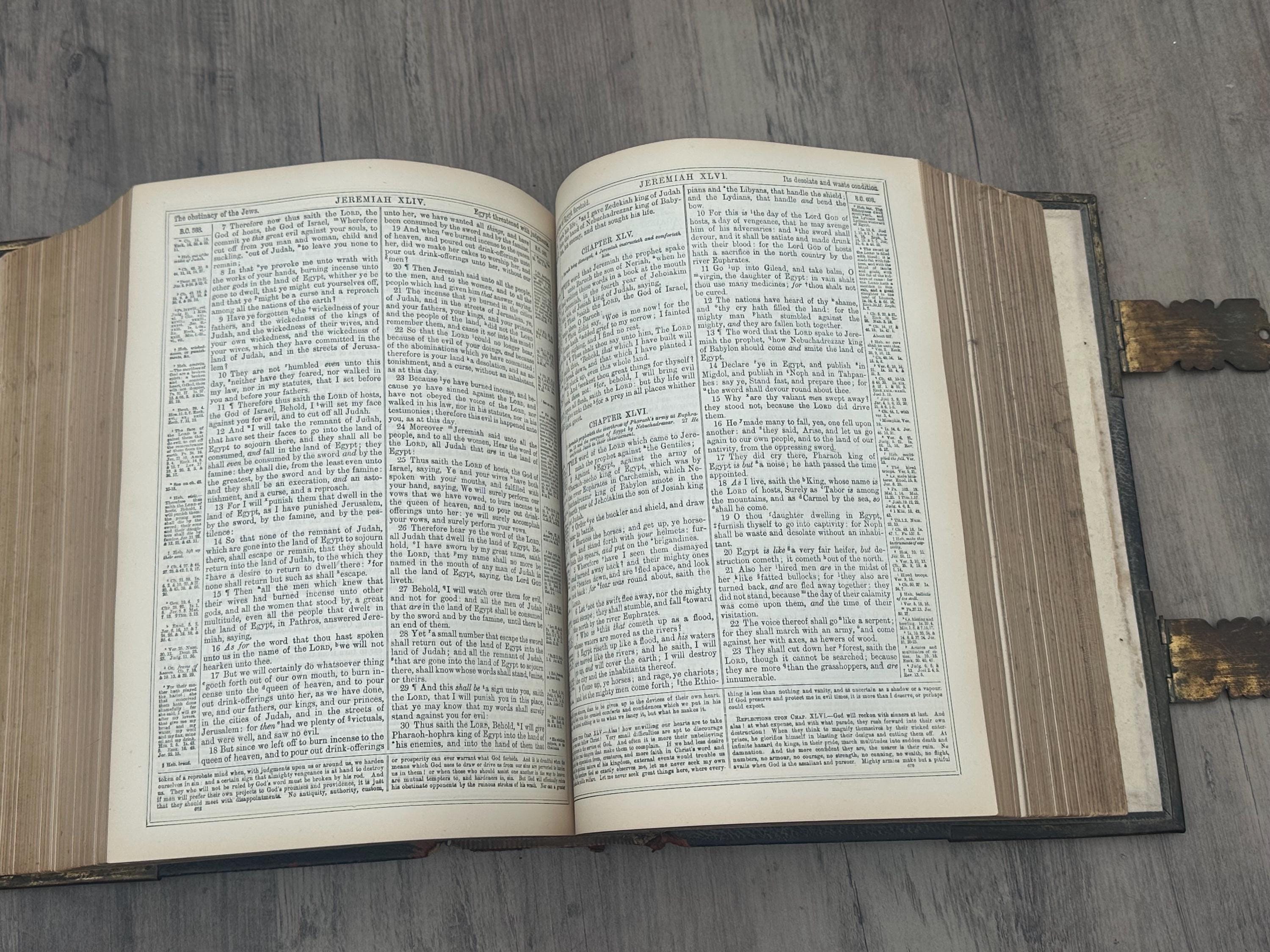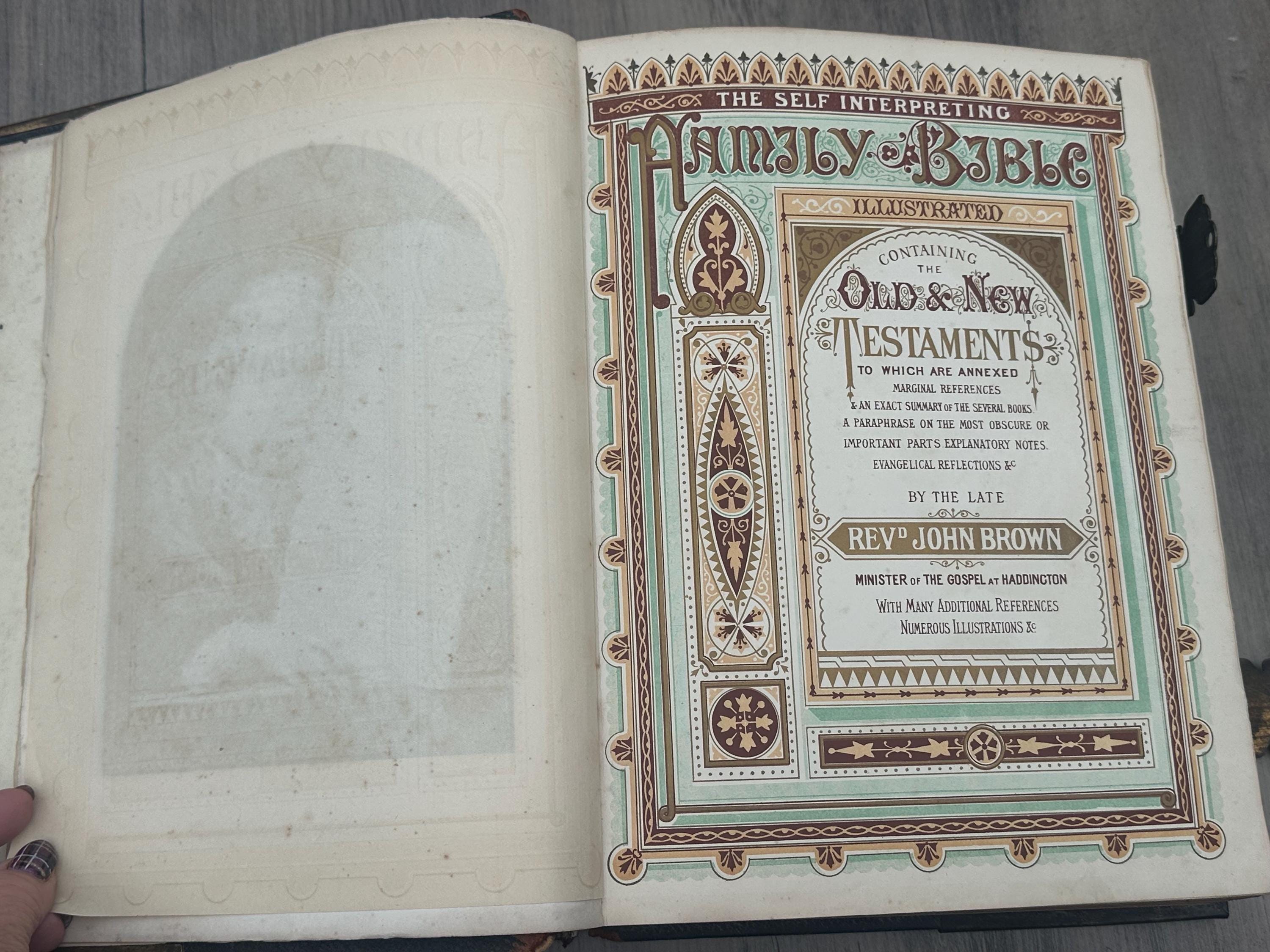 This substantial Victorian family Bible contains both the Old and New Testaments, along with extensive commentary, references, and explanatory notes by Rev. John Brown, making it both a religious and historical piece.