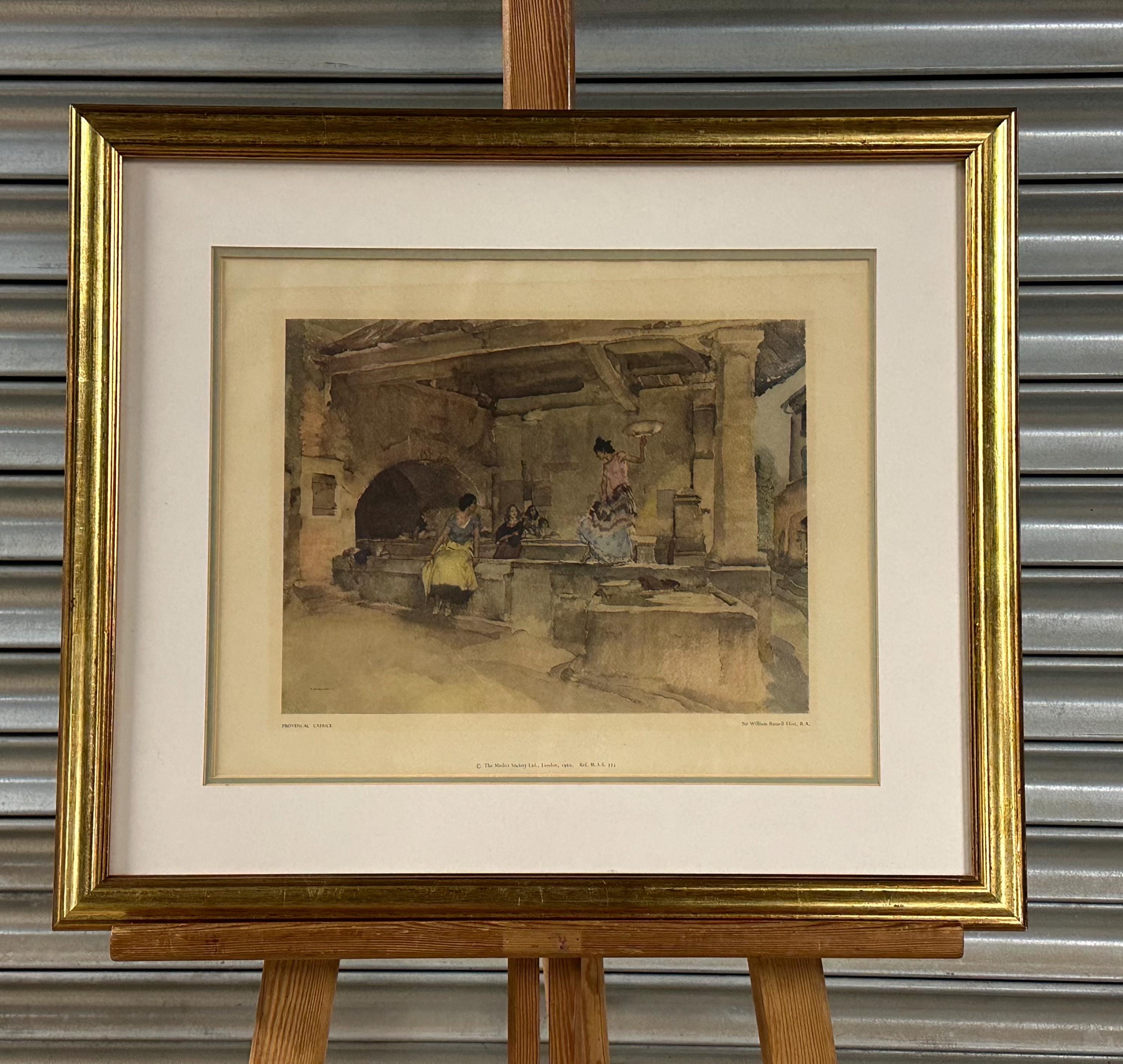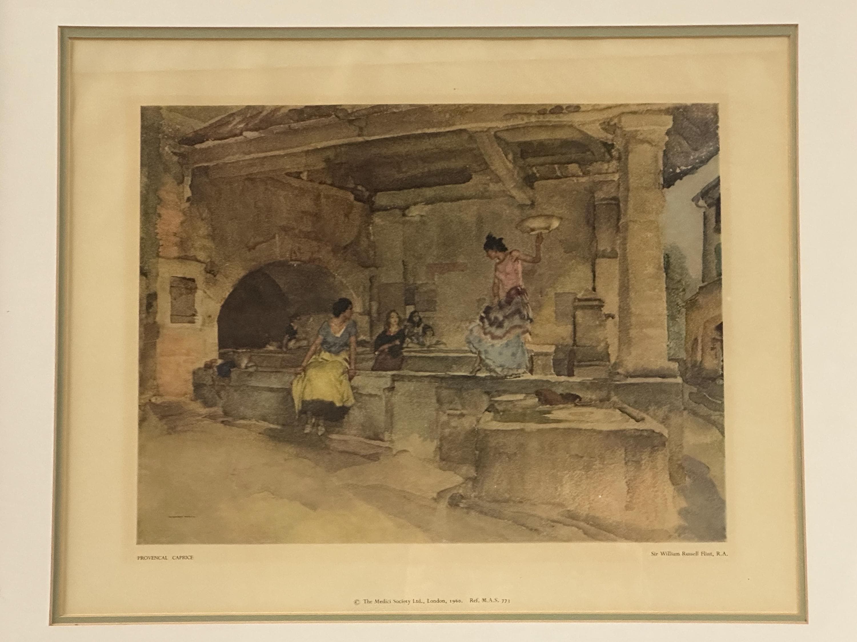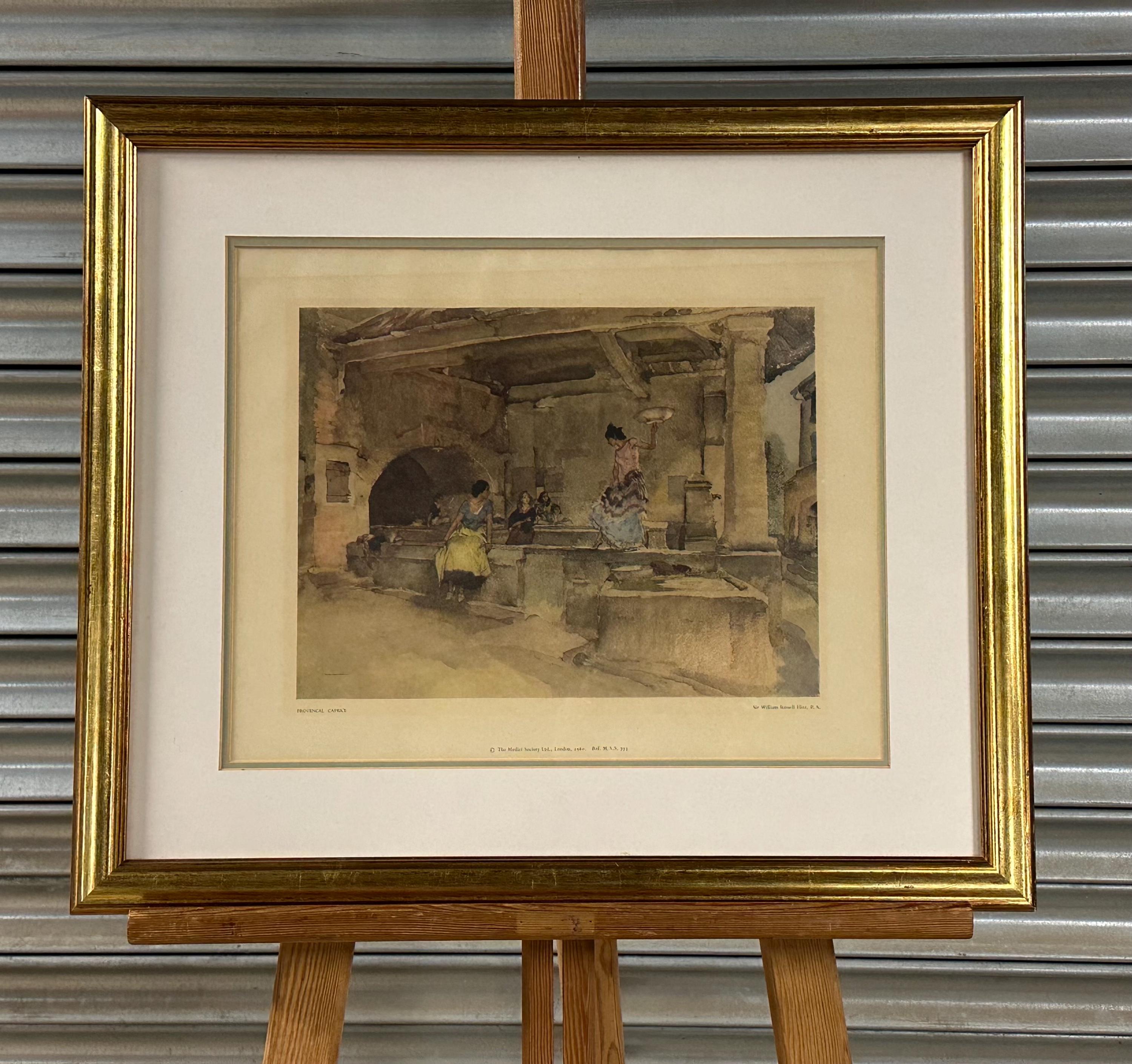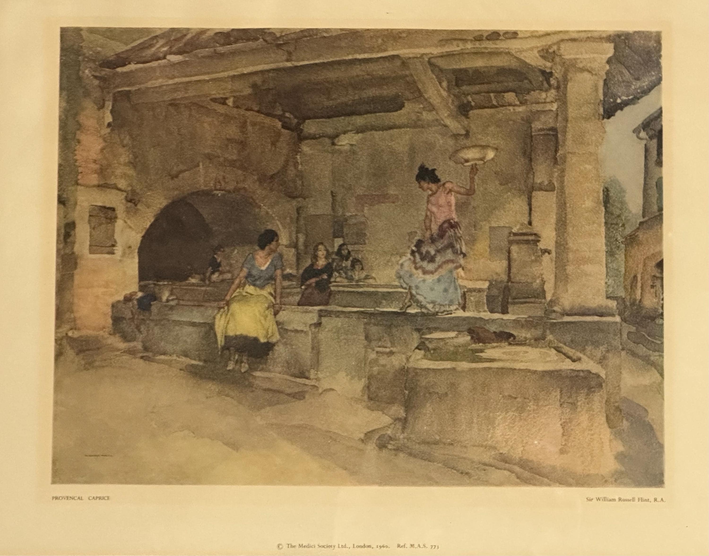 A charming framed vintage print after Sir William Russell Flint, R.A., titled “Provençal Caprice”, published by The Medici Society Ltd, London in 1960.