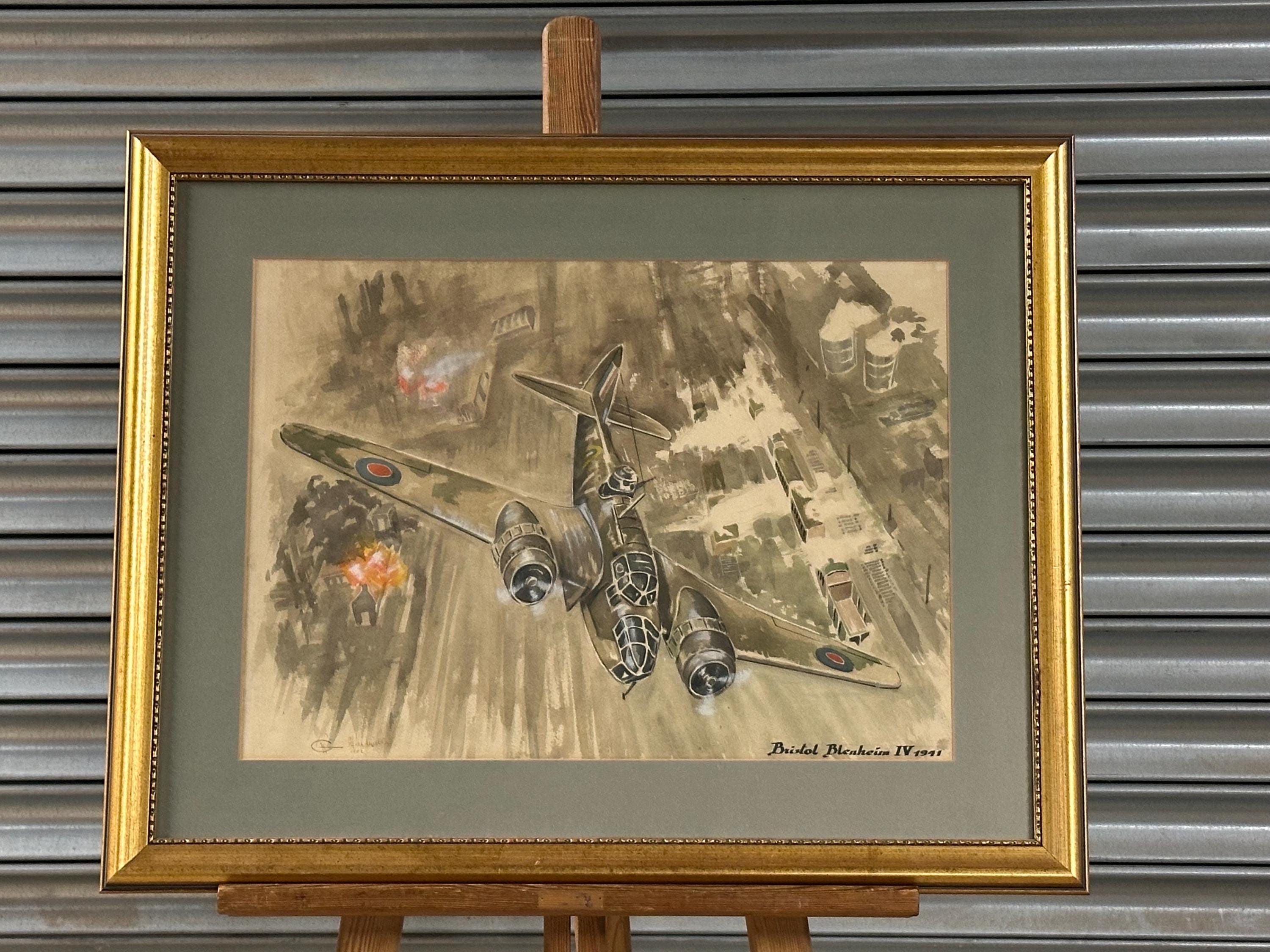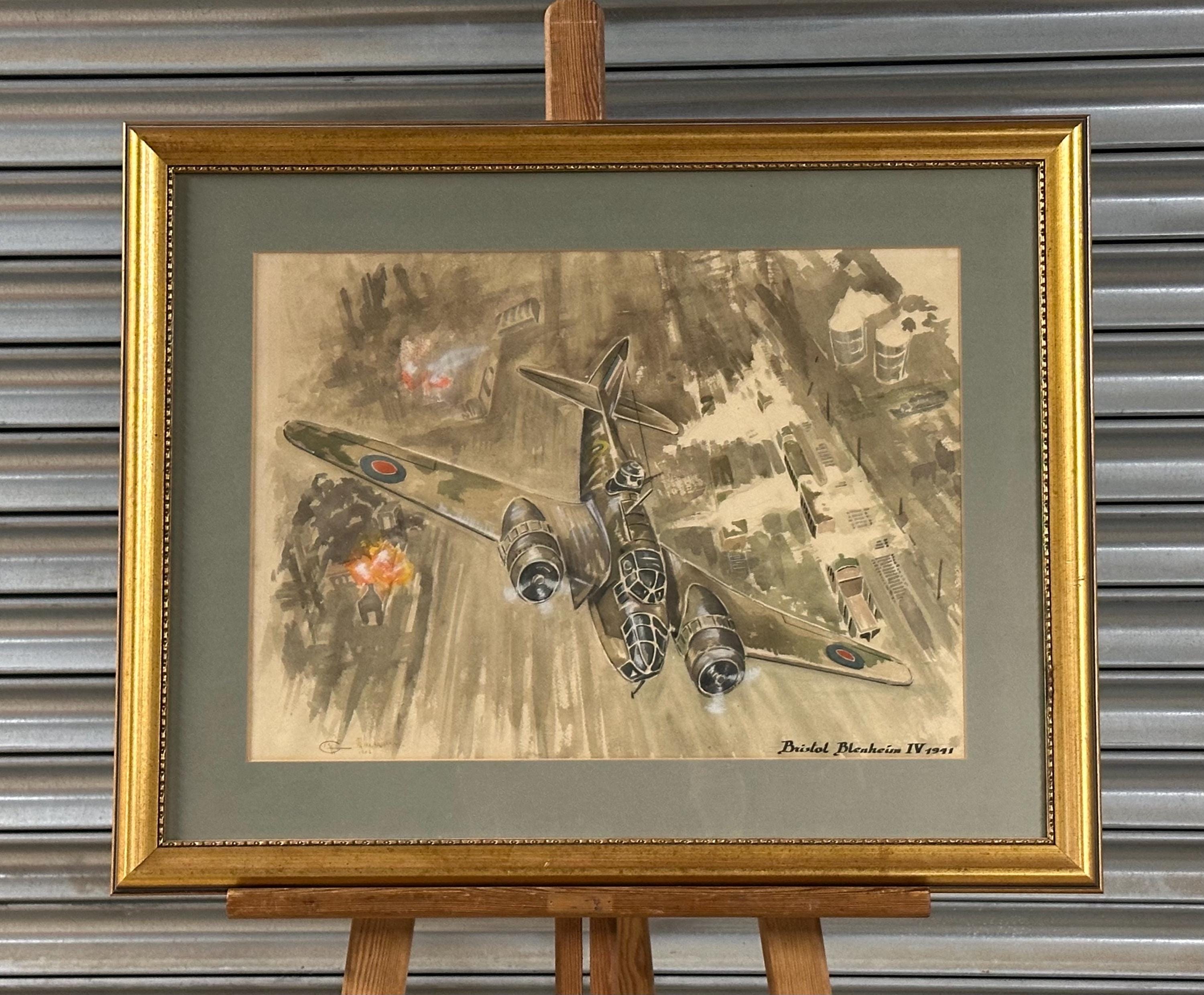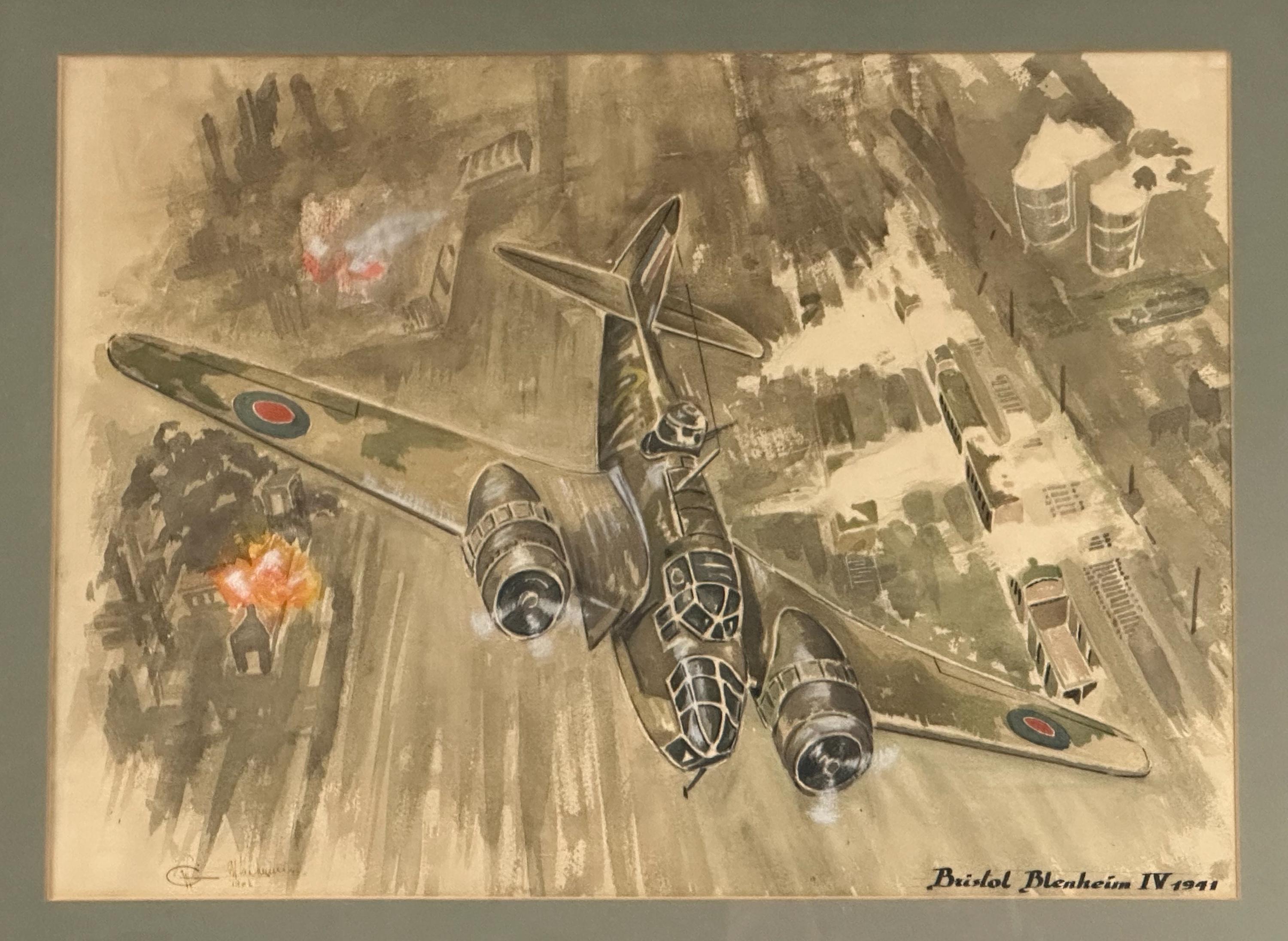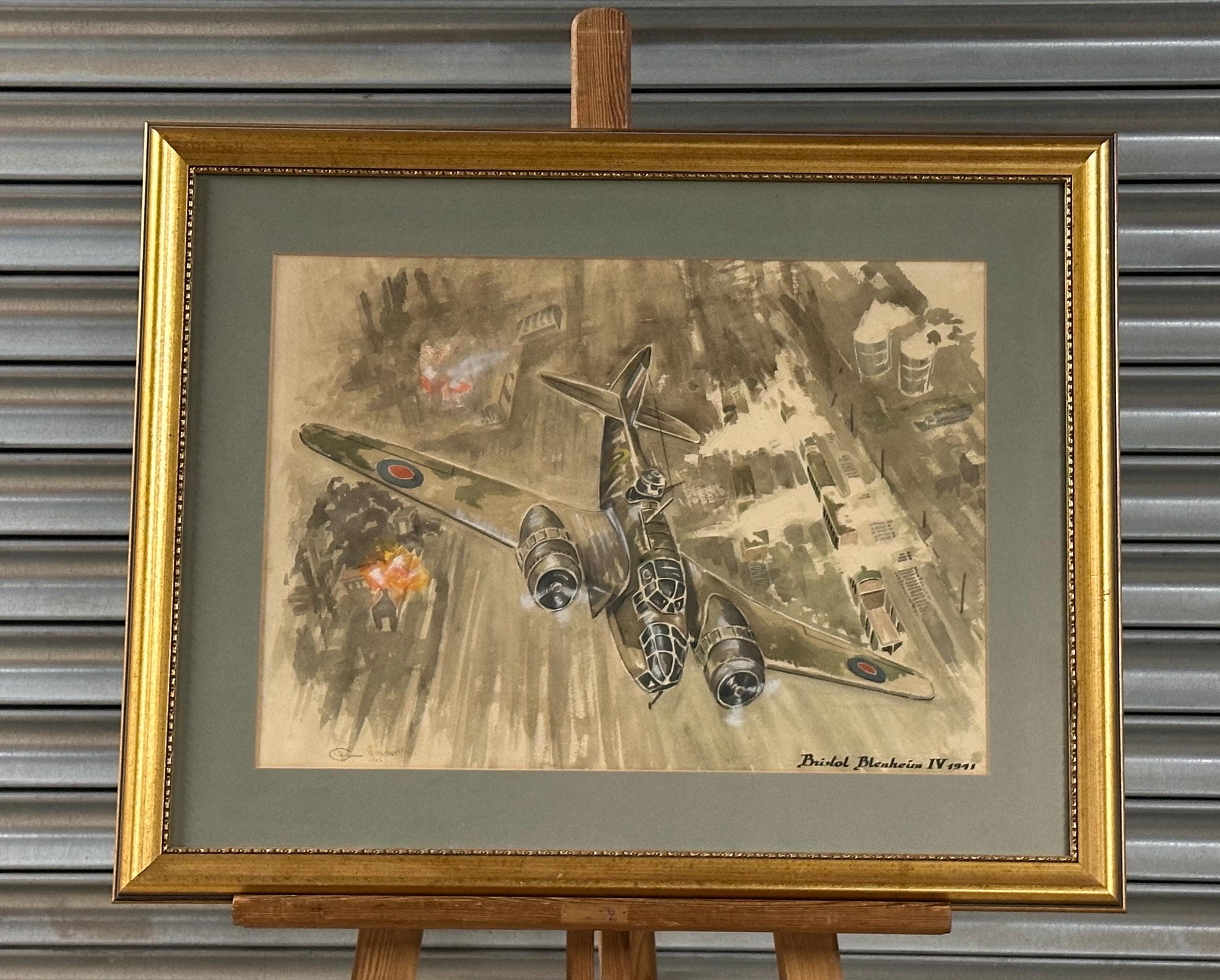 A striking vintage watercolour depicting the iconic RAF Bristol Blenheim IV, of 1941, shown in dramatic low-level flight over a wartime industrial landscape under attack.