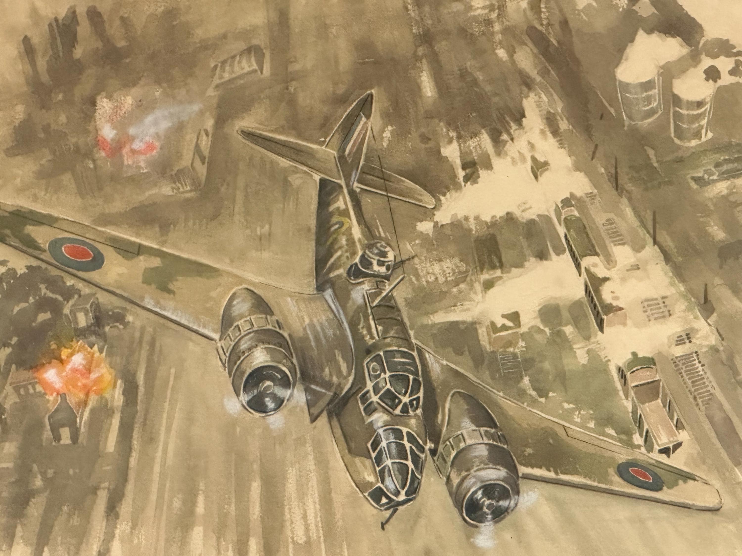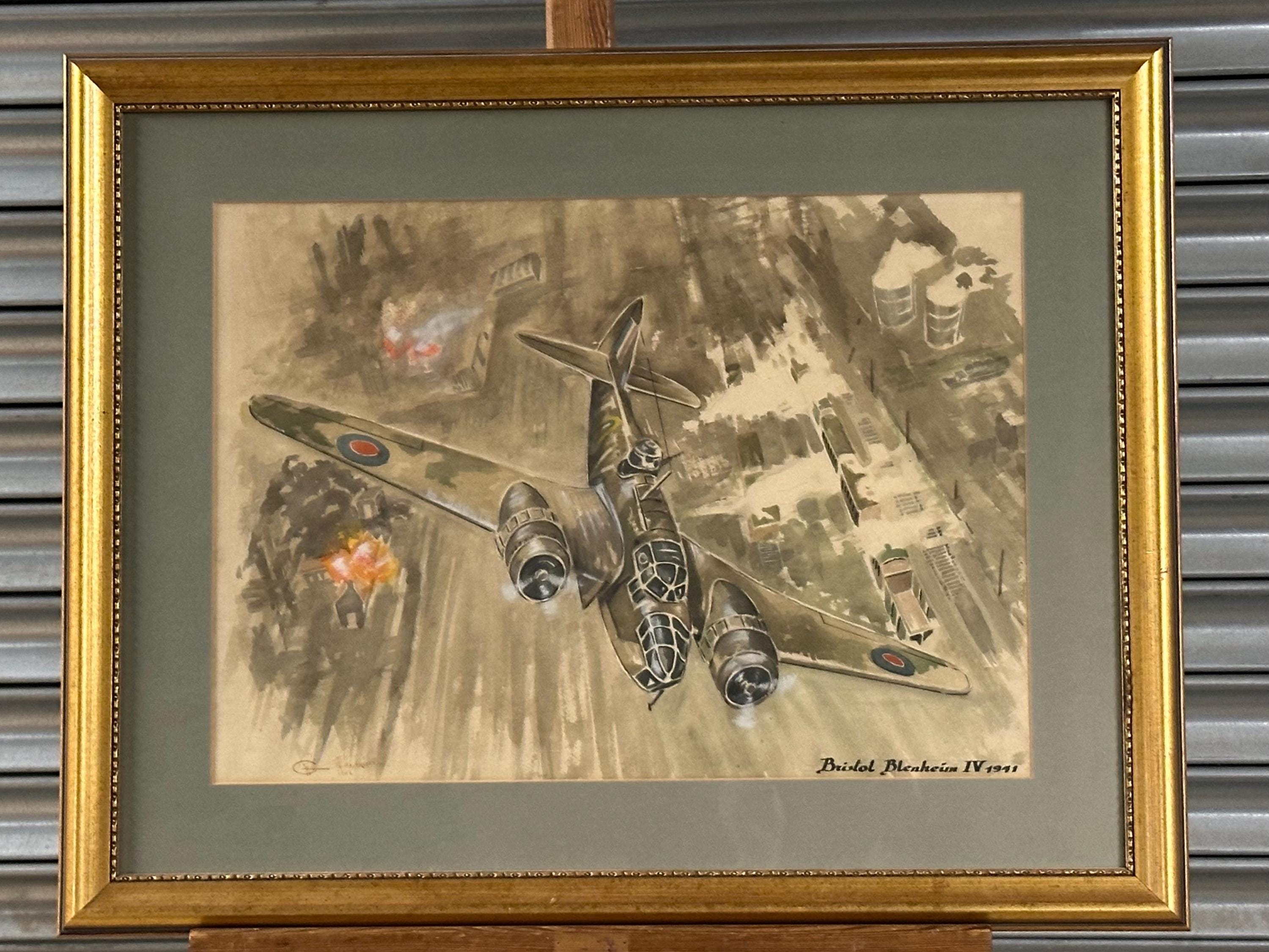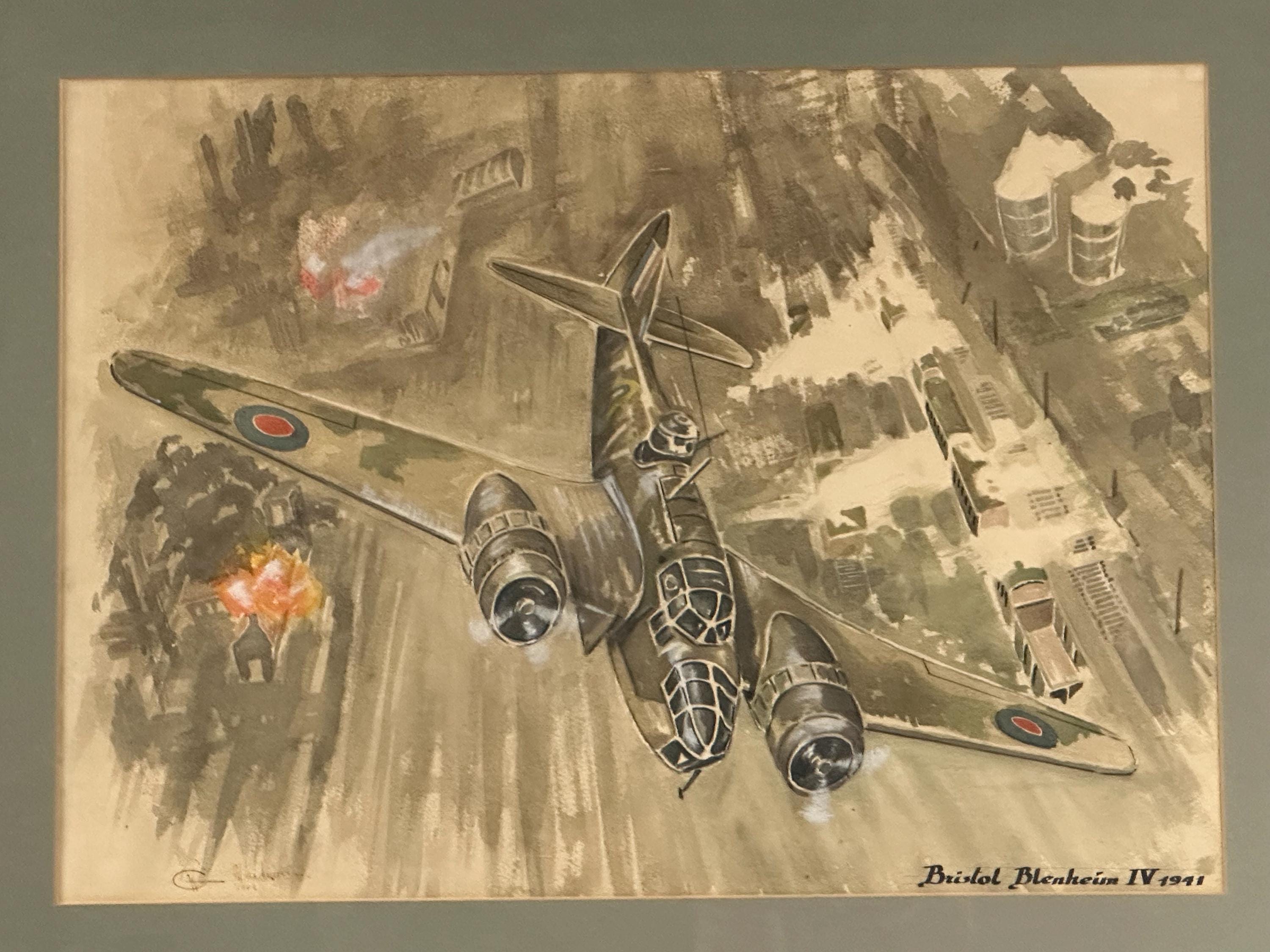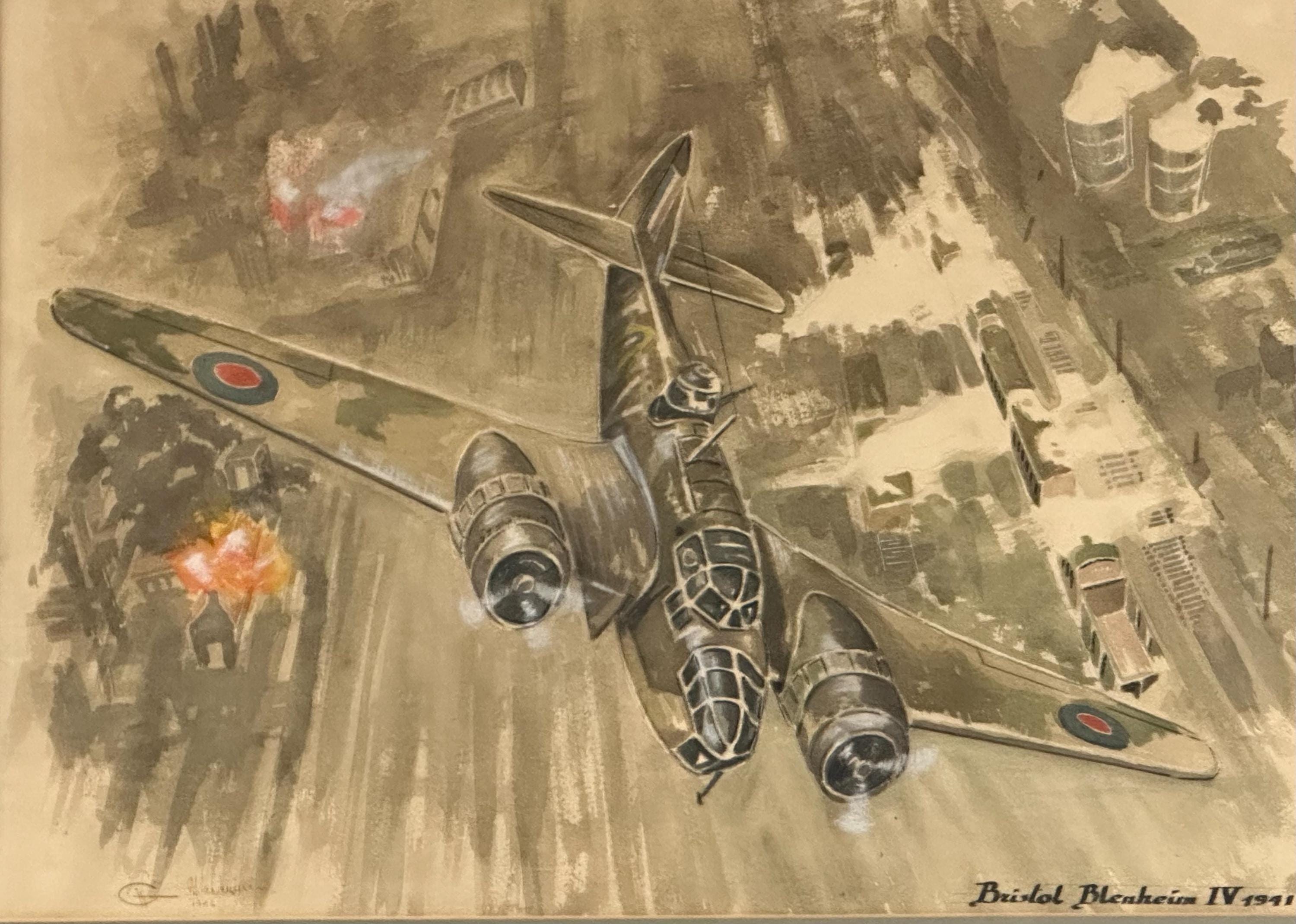 A striking vintage watercolour depicting the iconic RAF Bristol Blenheim IV, of 1941, shown in dramatic low-level flight over a wartime industrial landscape under attack.