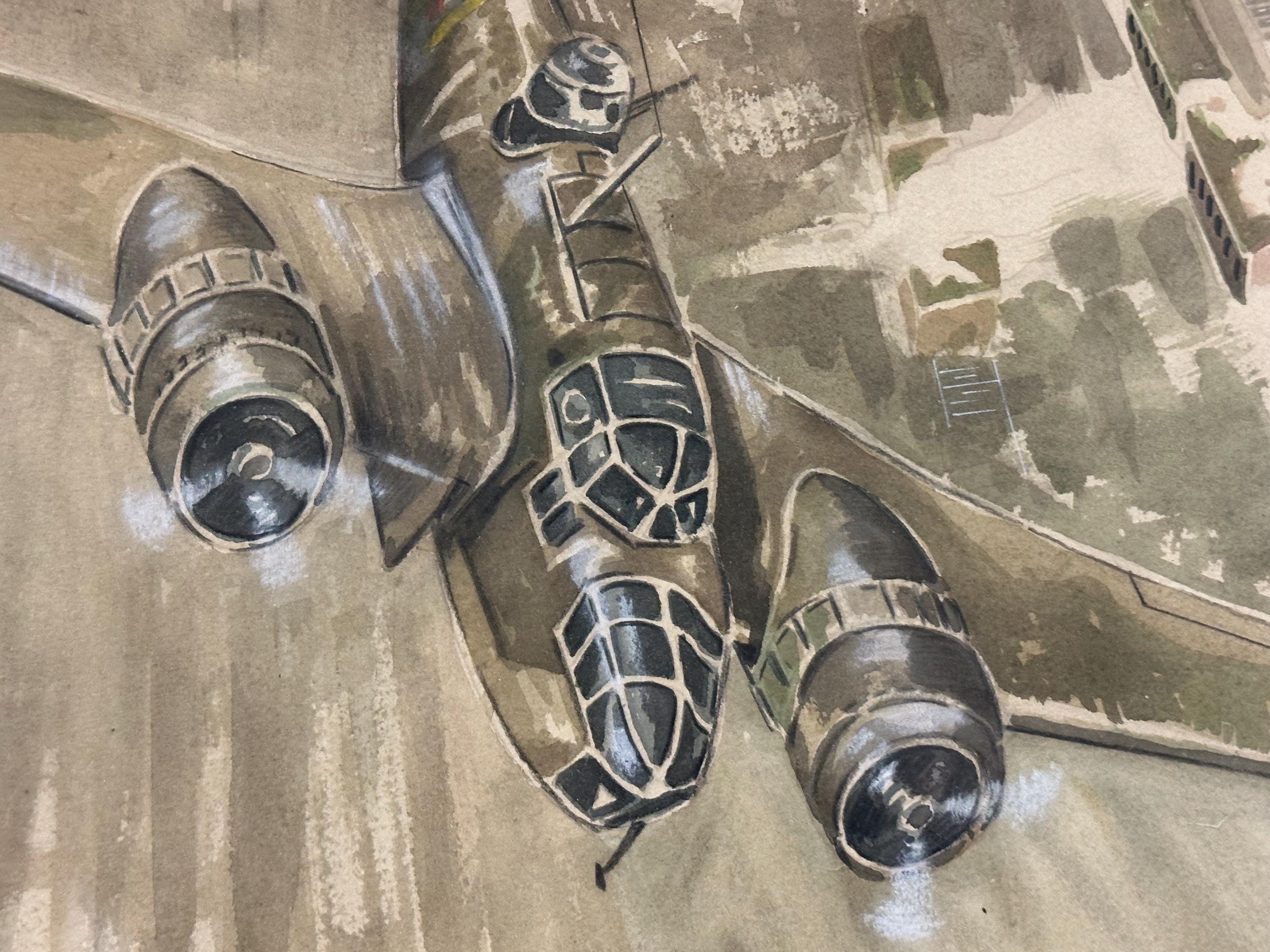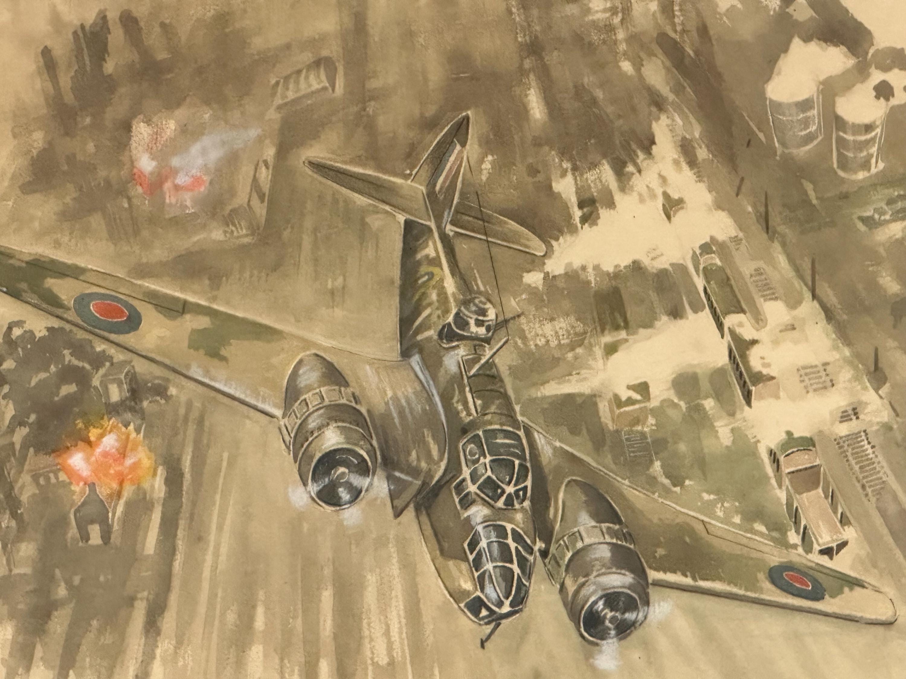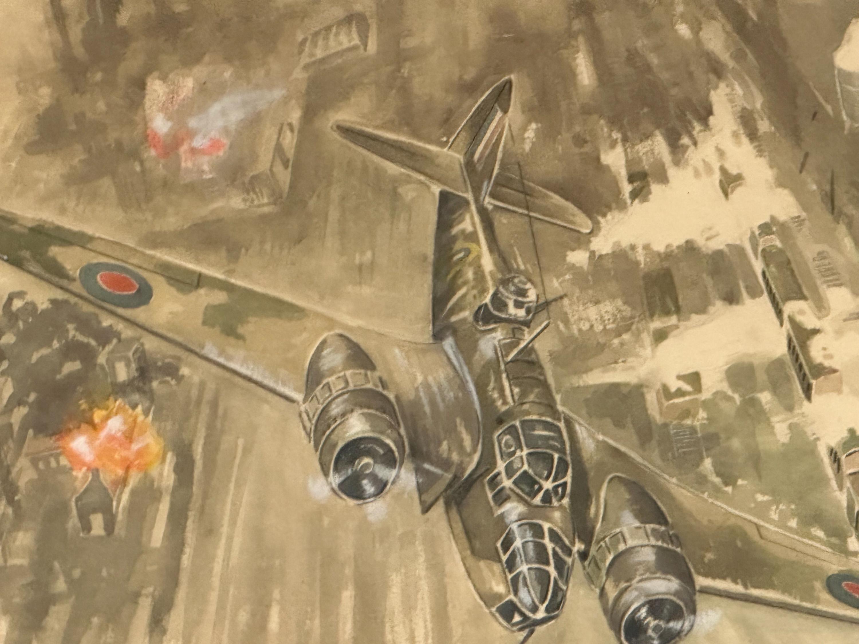 The composition captures the intensity of WWII aerial operations, with explosions and smoke rising below, while the aircraft is rendered with impressive accuracy and detail — from RAF roundels to cockpit glazing. The muted tones and fluid brushwork give the piece a classic mid-20th century illustrative style, typical of wartime or post-war commemorative artwork.