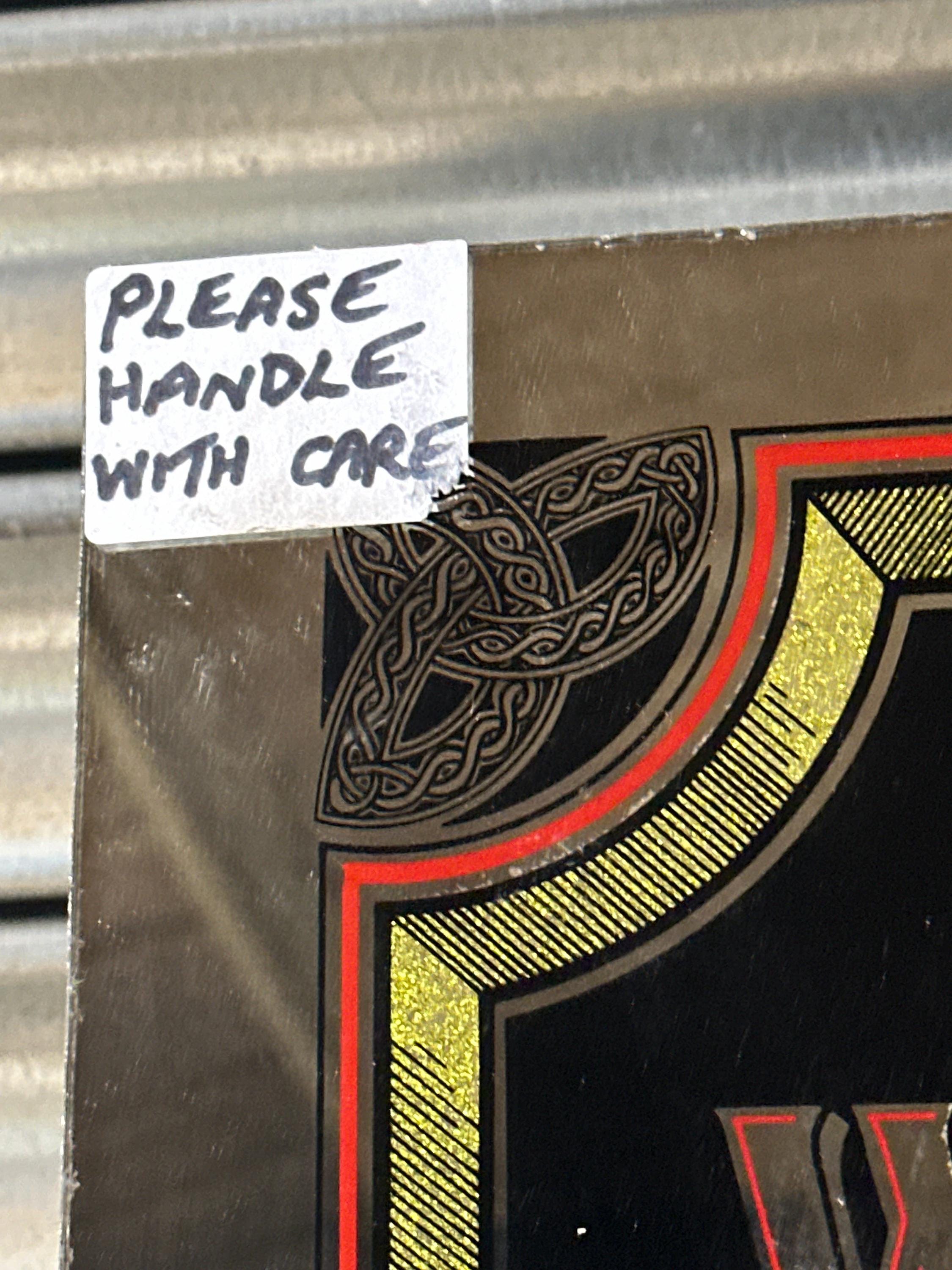This eye-catching piece showcases bold gilt lettering on a deep black background, framed with ornate gold detailing and barley motifs, with the distinctive red twin lions at the centre. A superb example of traditional whisky advertising, ideal for a home bar, pub décor, or collector of breweriana.