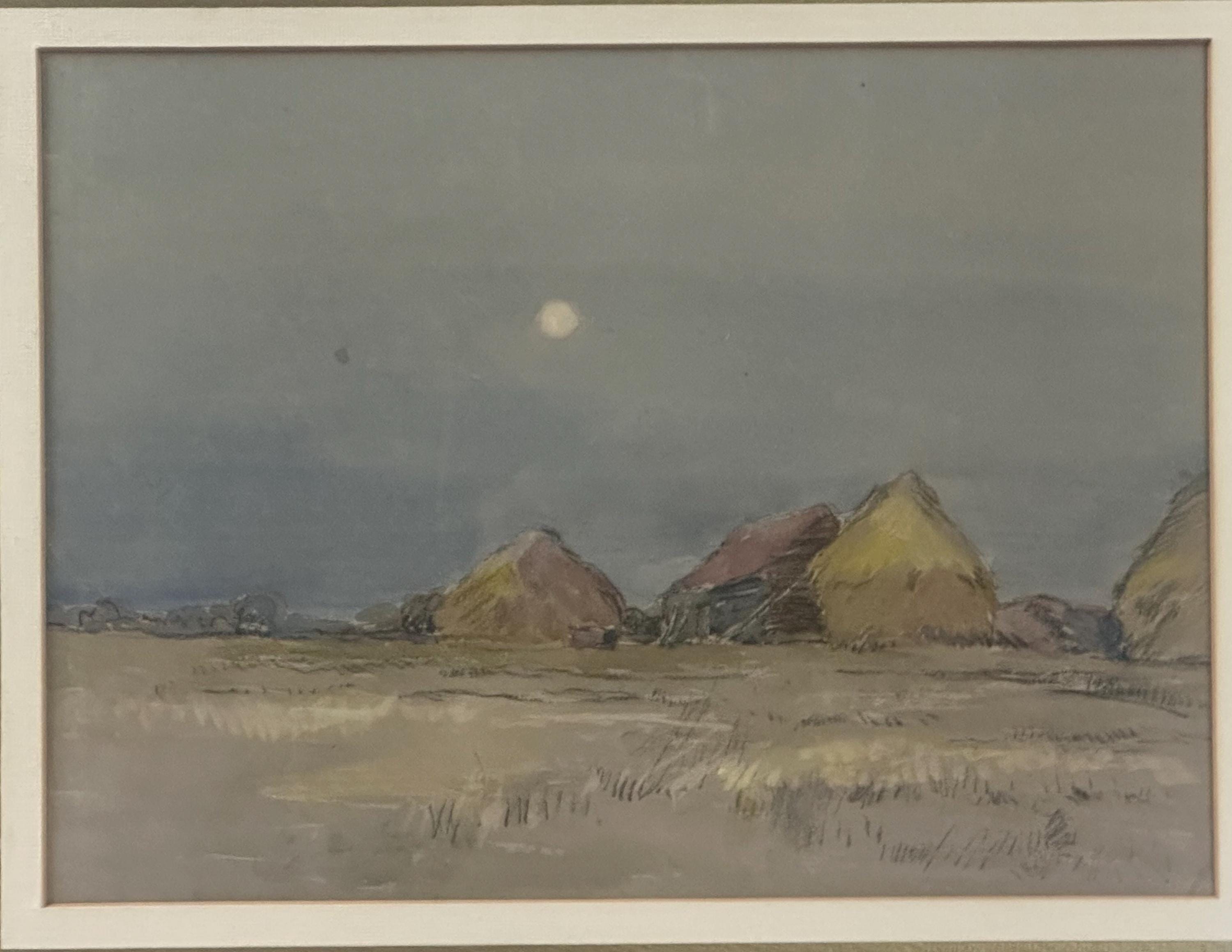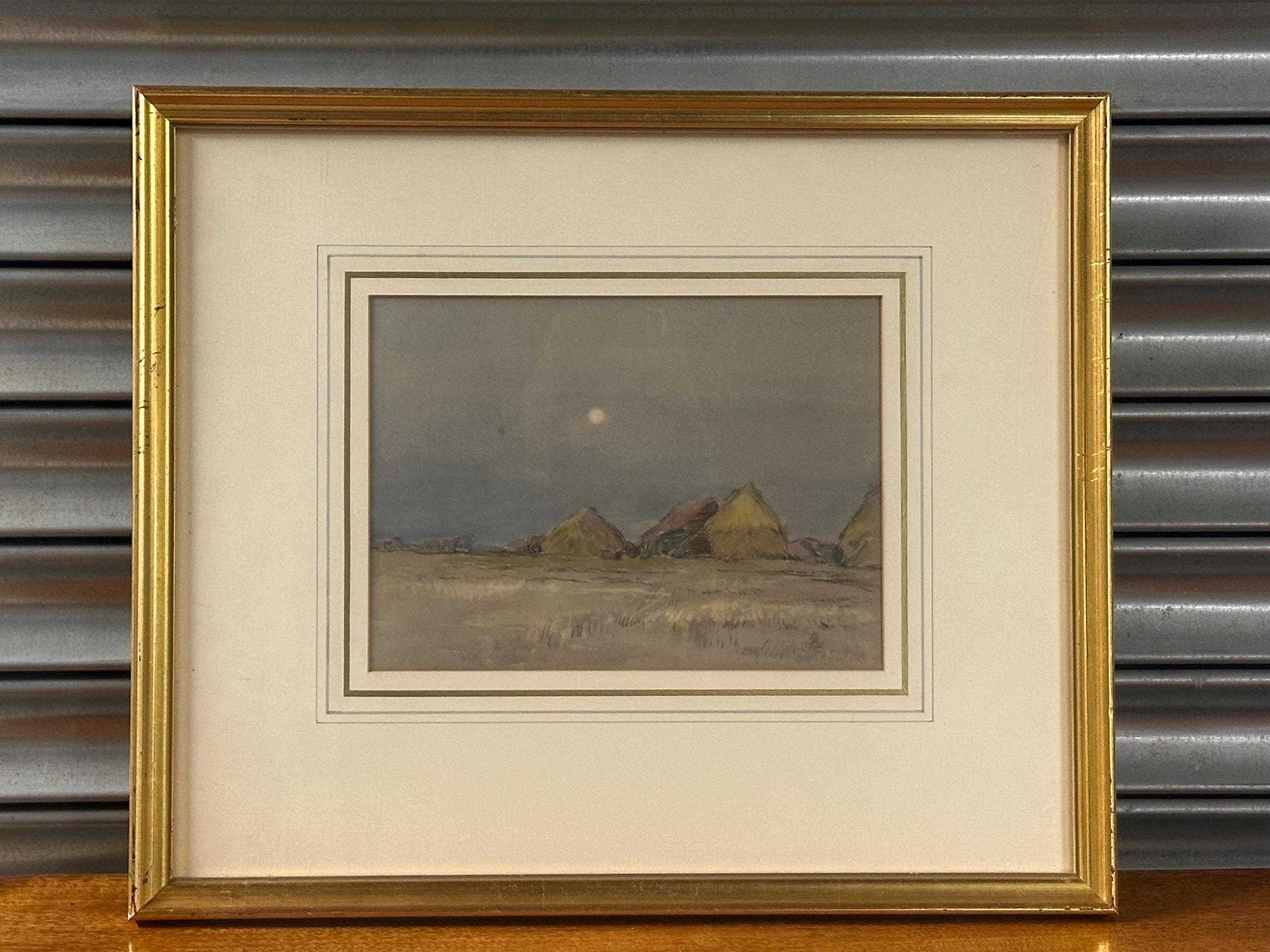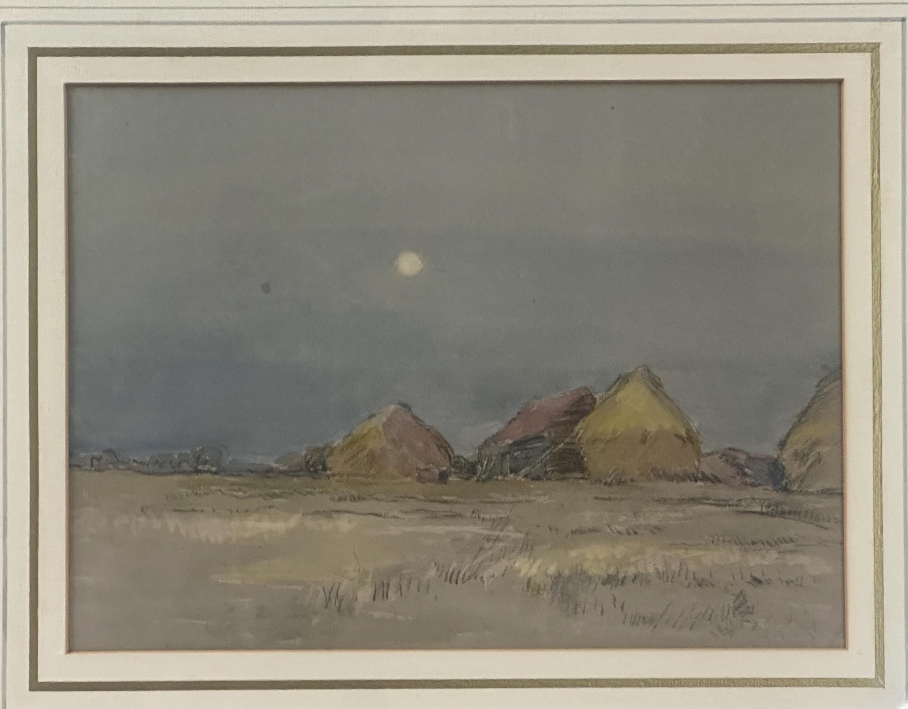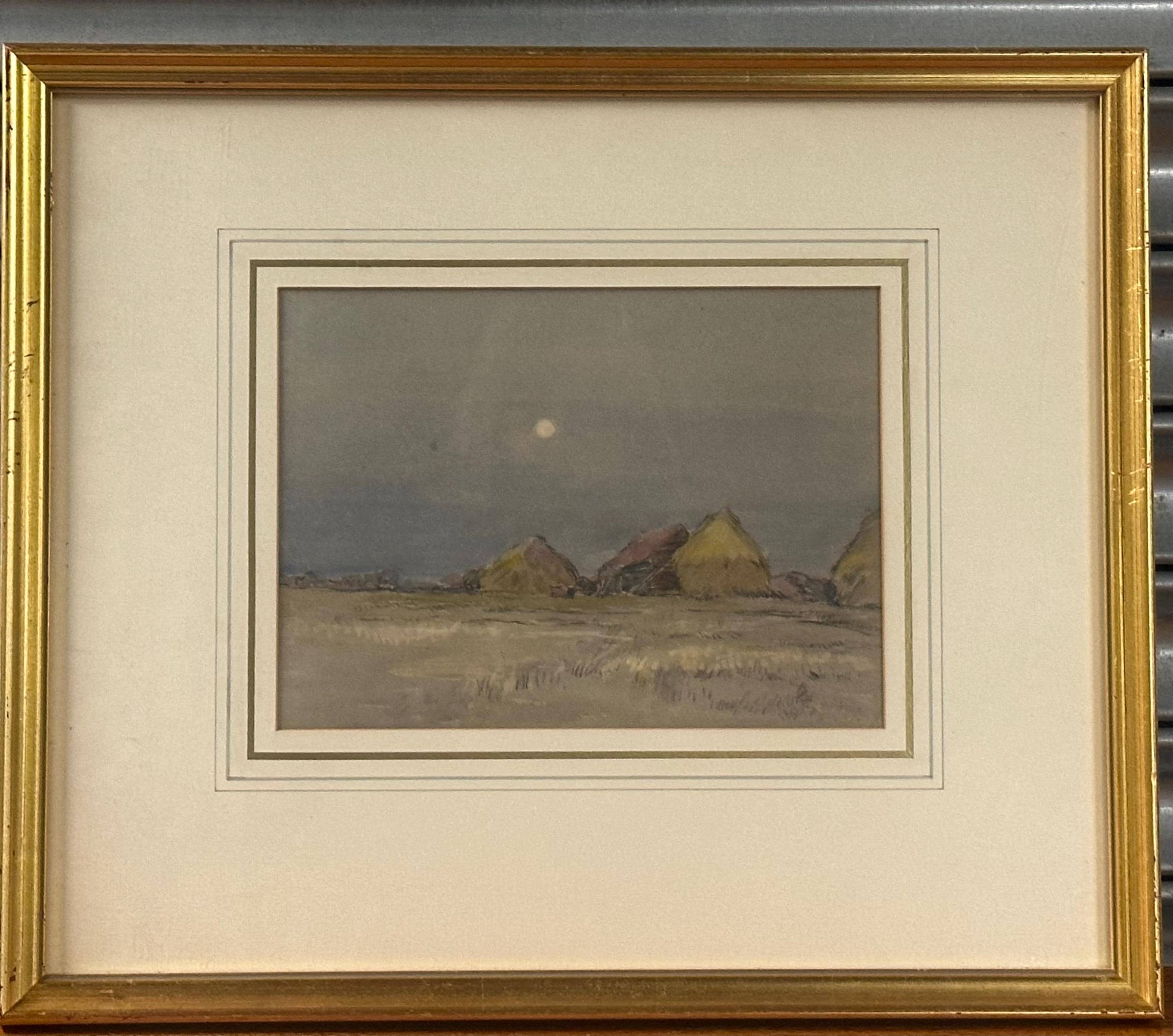 This beautiful original by Robert G. D. Alexander (1875–1945) shows Eagles Farm near Walton-on-the-Naze, with soft moonlight over the fields and farm buildings.